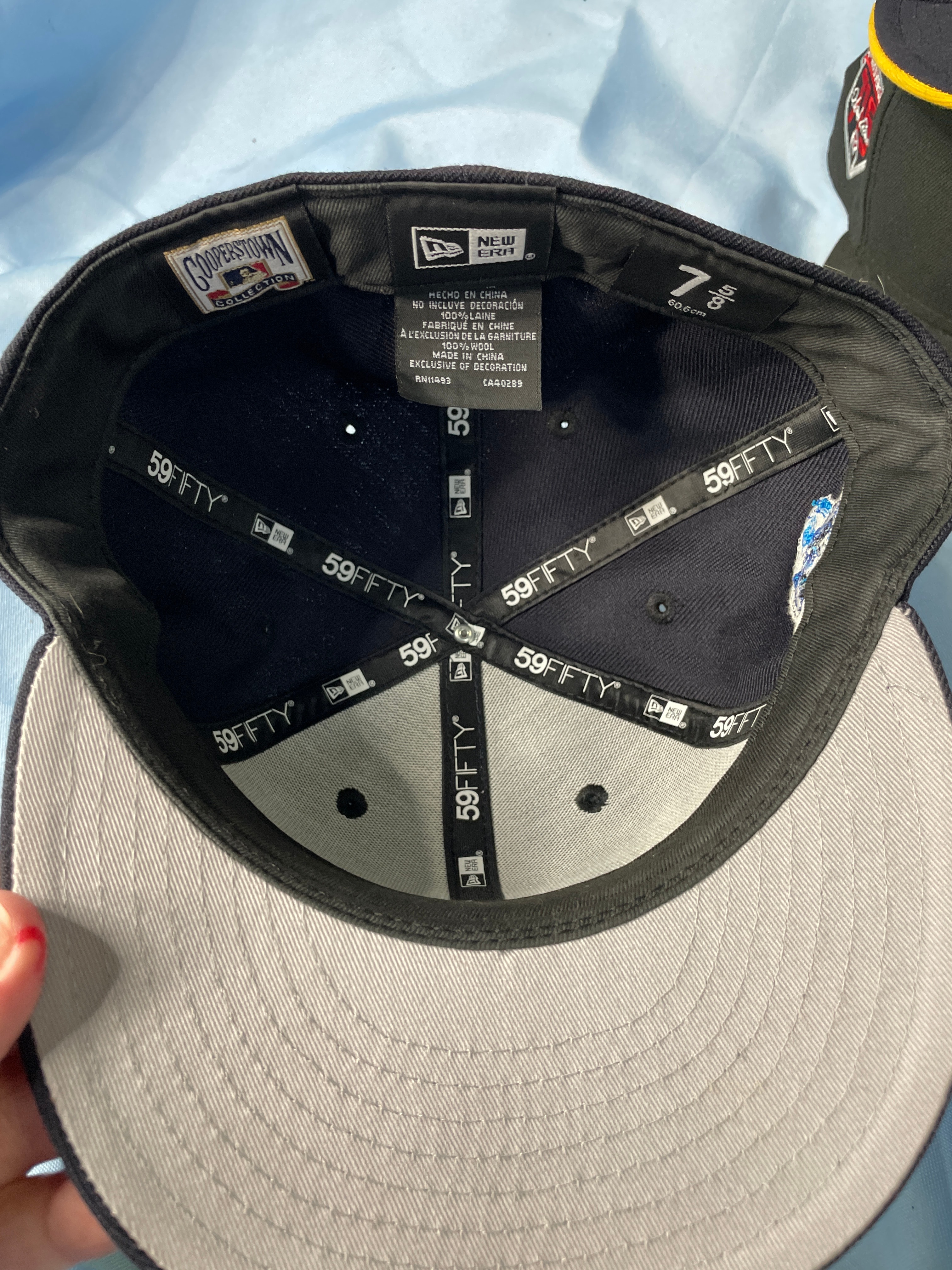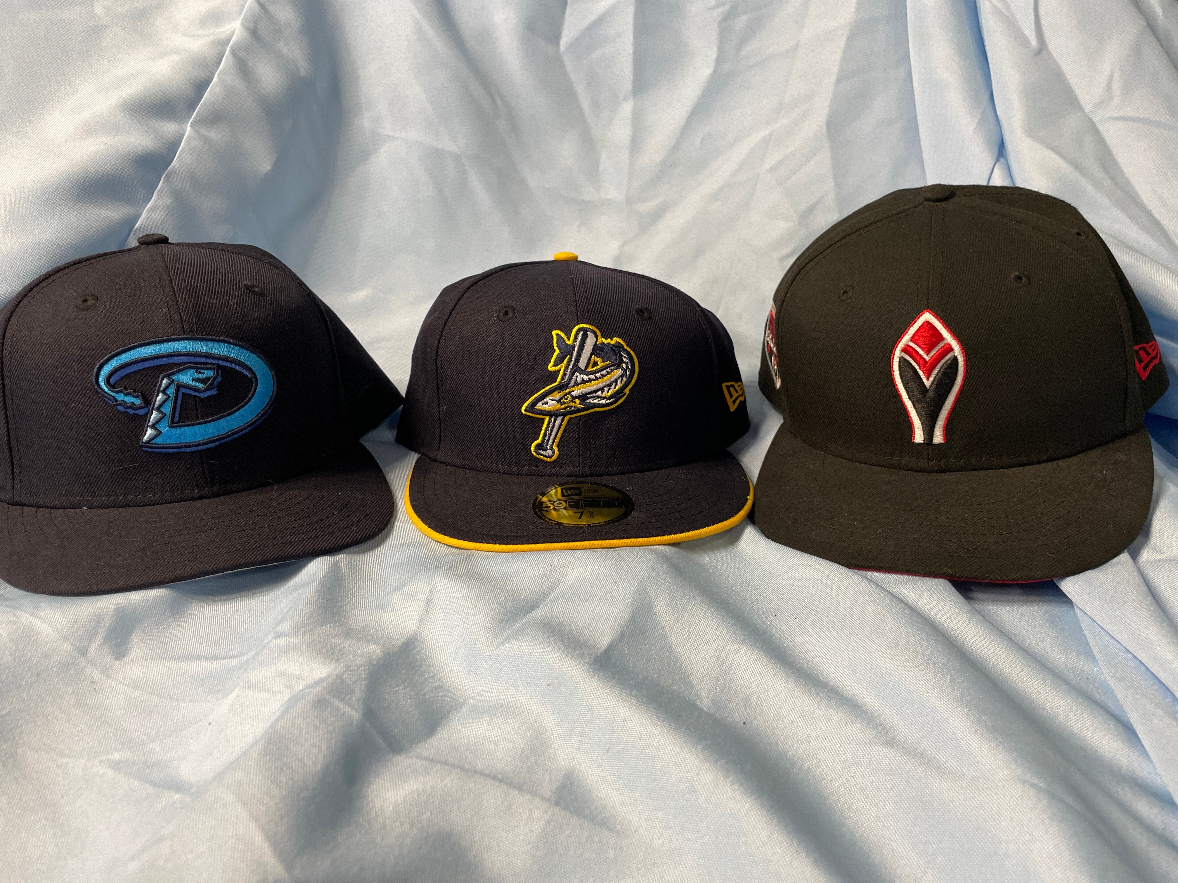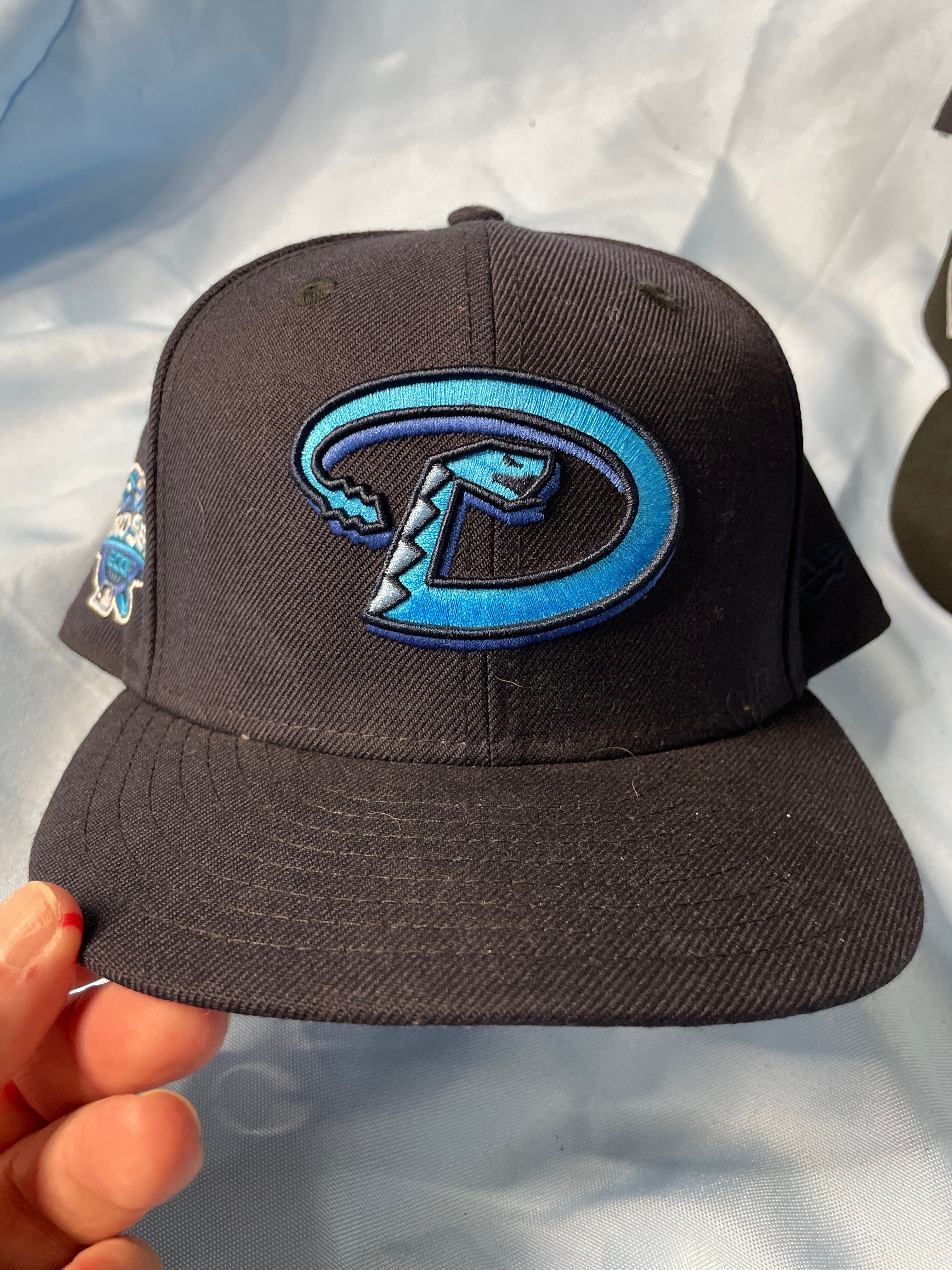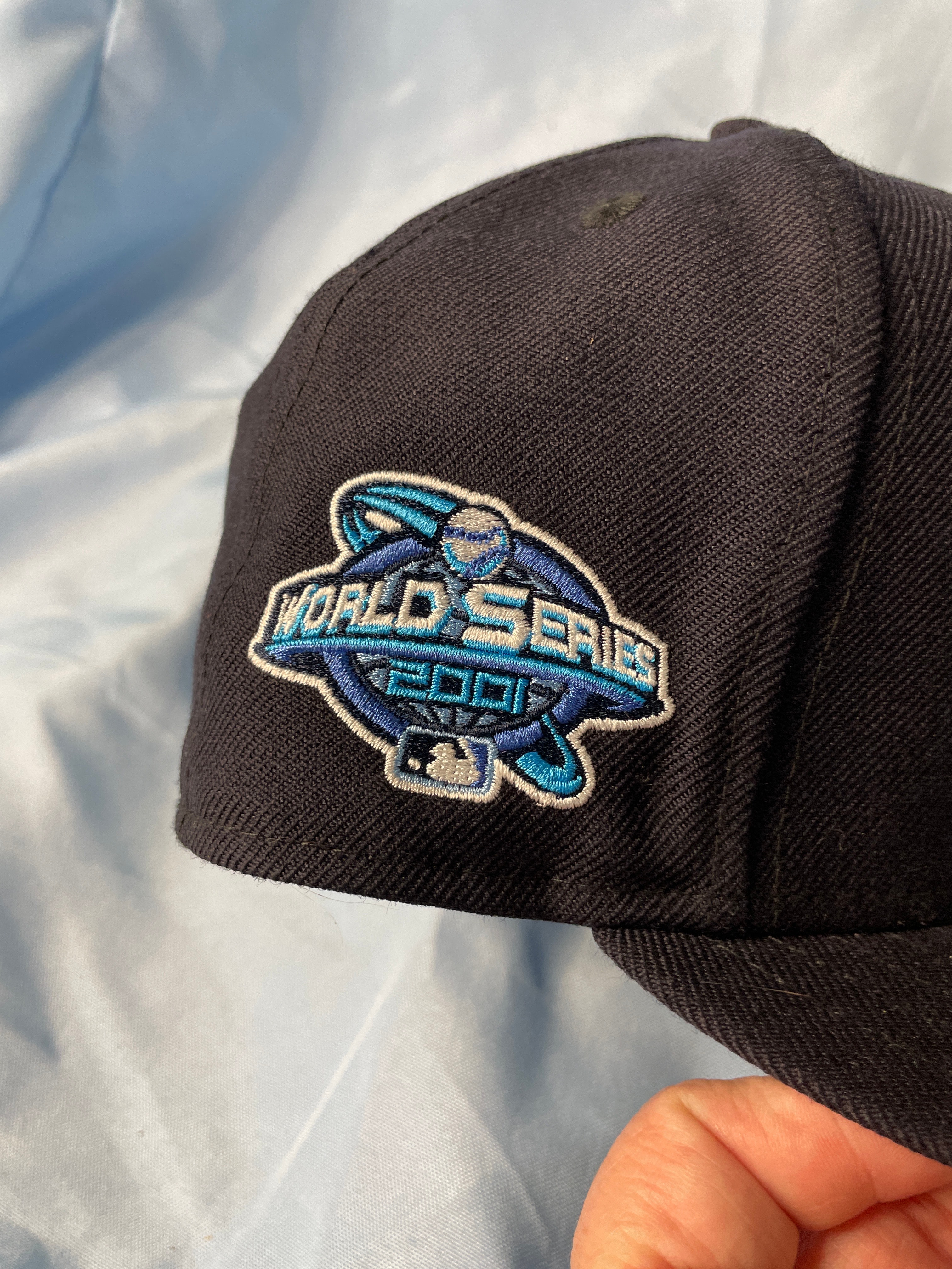 A dark navy New Era 59FIFTY fitted baseball cap, size 7 1/2, with a light blue and teal embroidered Arizona Diamondbacks “D” logo, a “World Series 2001” patch, and “COOPERSTOWN COLLECTION” and “100% WOOL” labels.