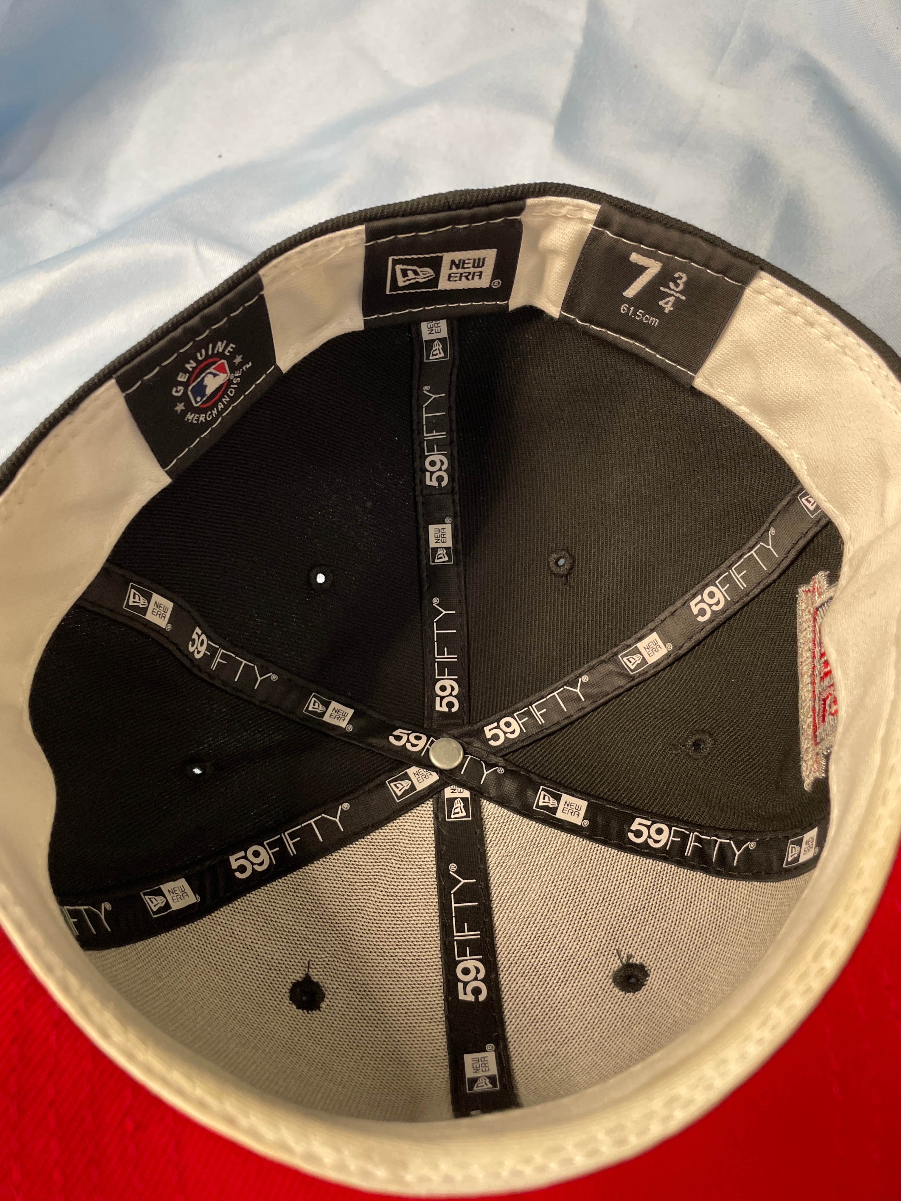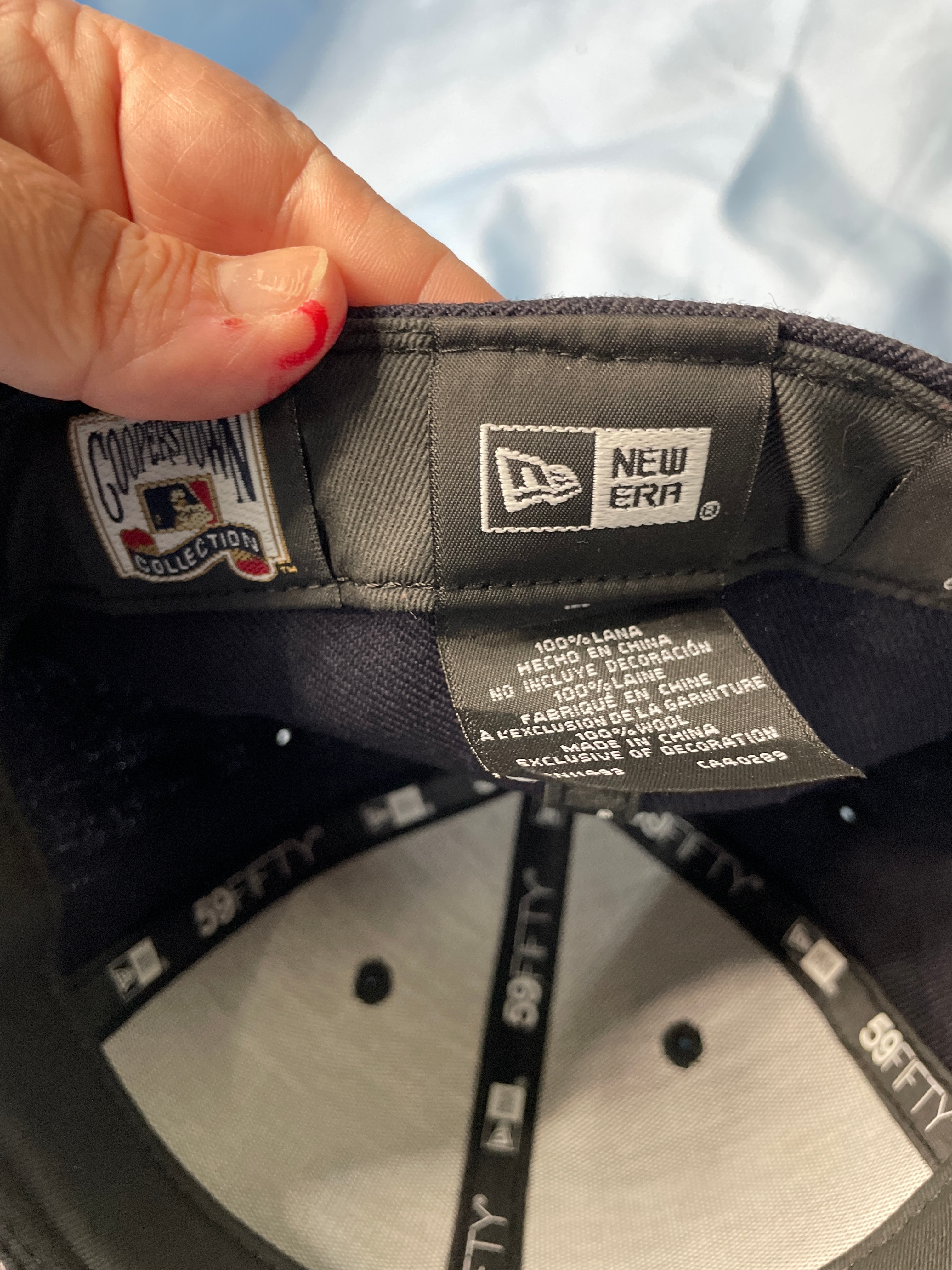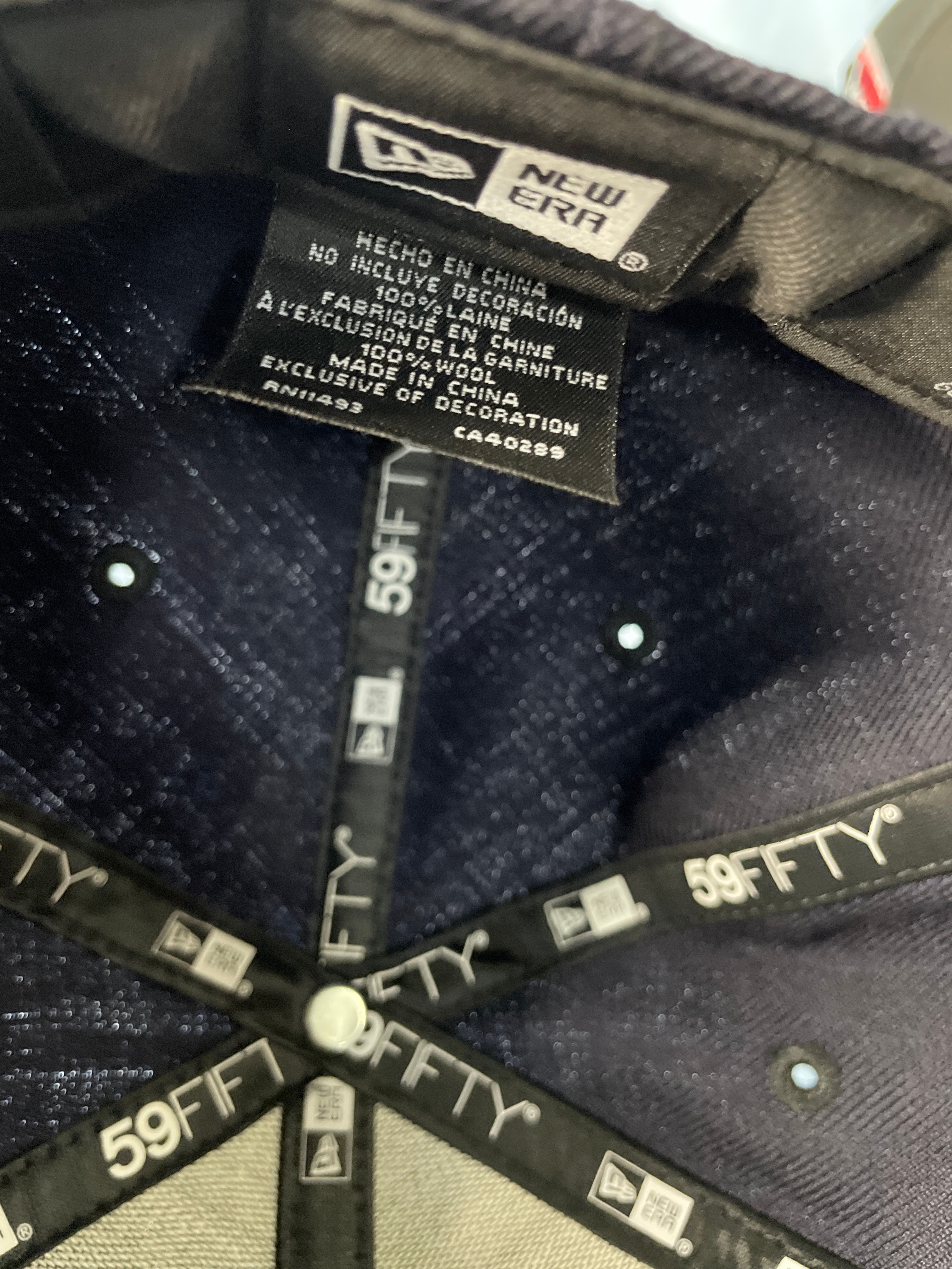 A dark navy New Era 59FIFTY fitted baseball cap, size 7 1/2, with a light blue and teal embroidered Arizona Diamondbacks “D” logo, a “World Series 2001” patch, and “COOPERSTOWN COLLECTION” and “100% WOOL” labels.