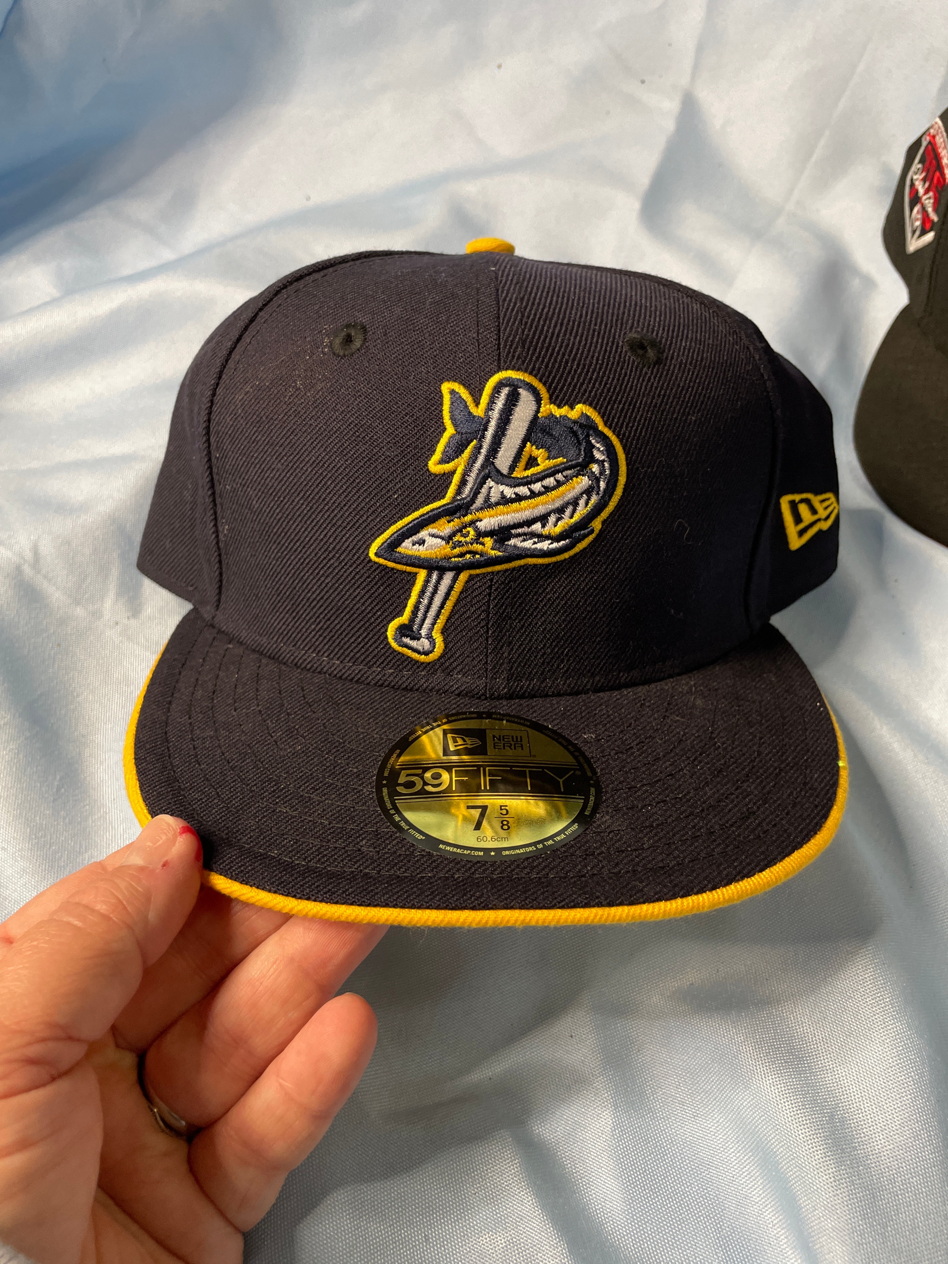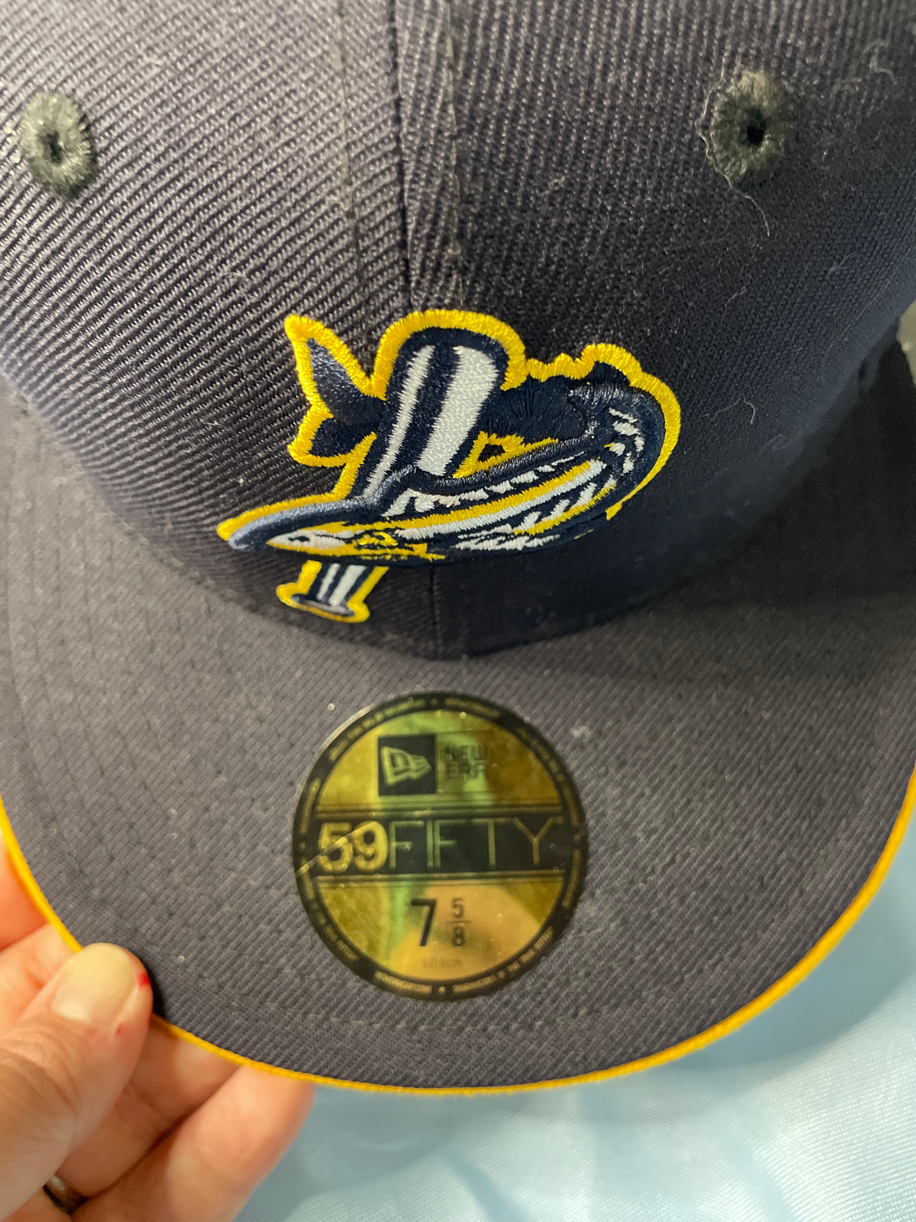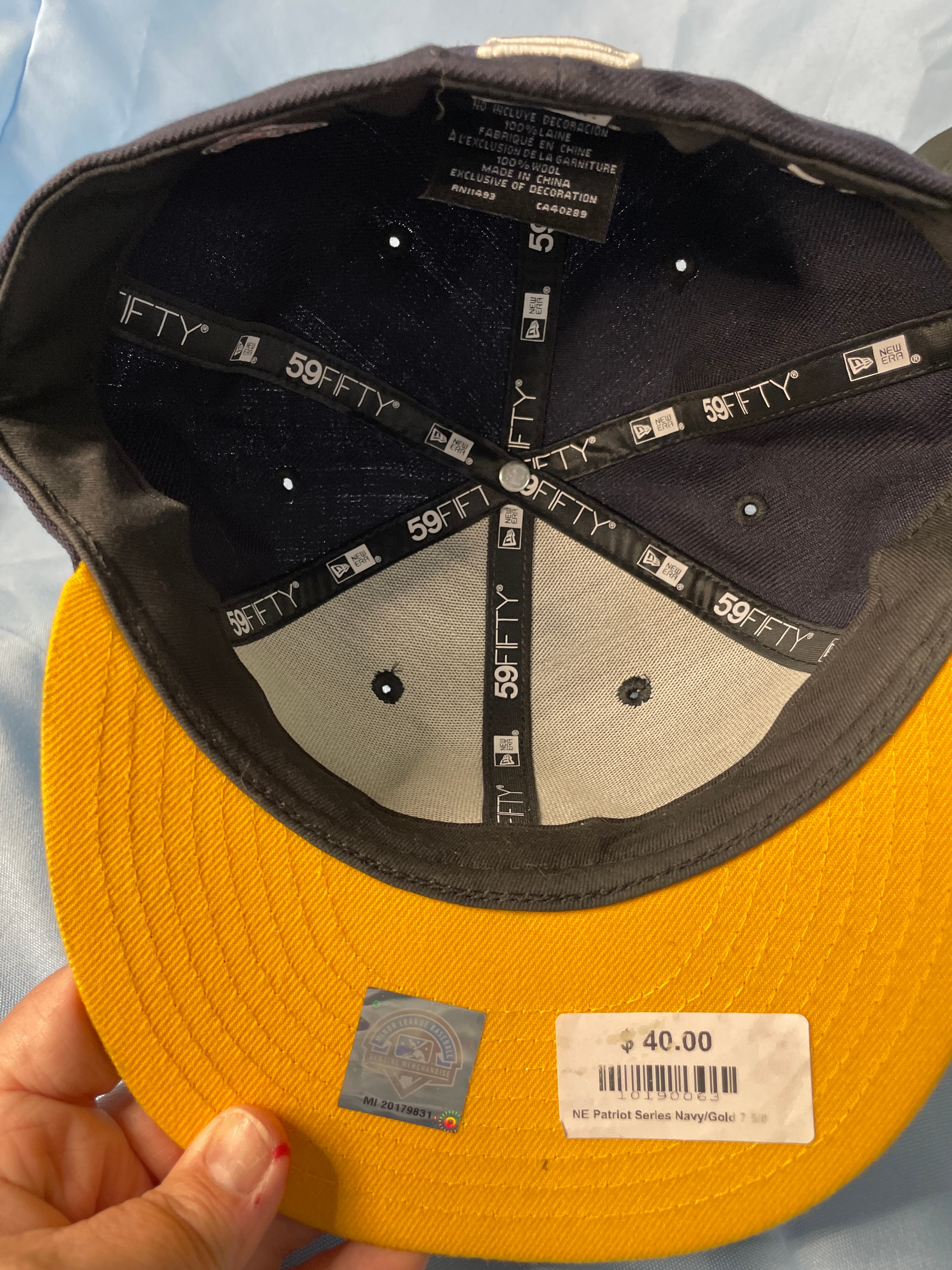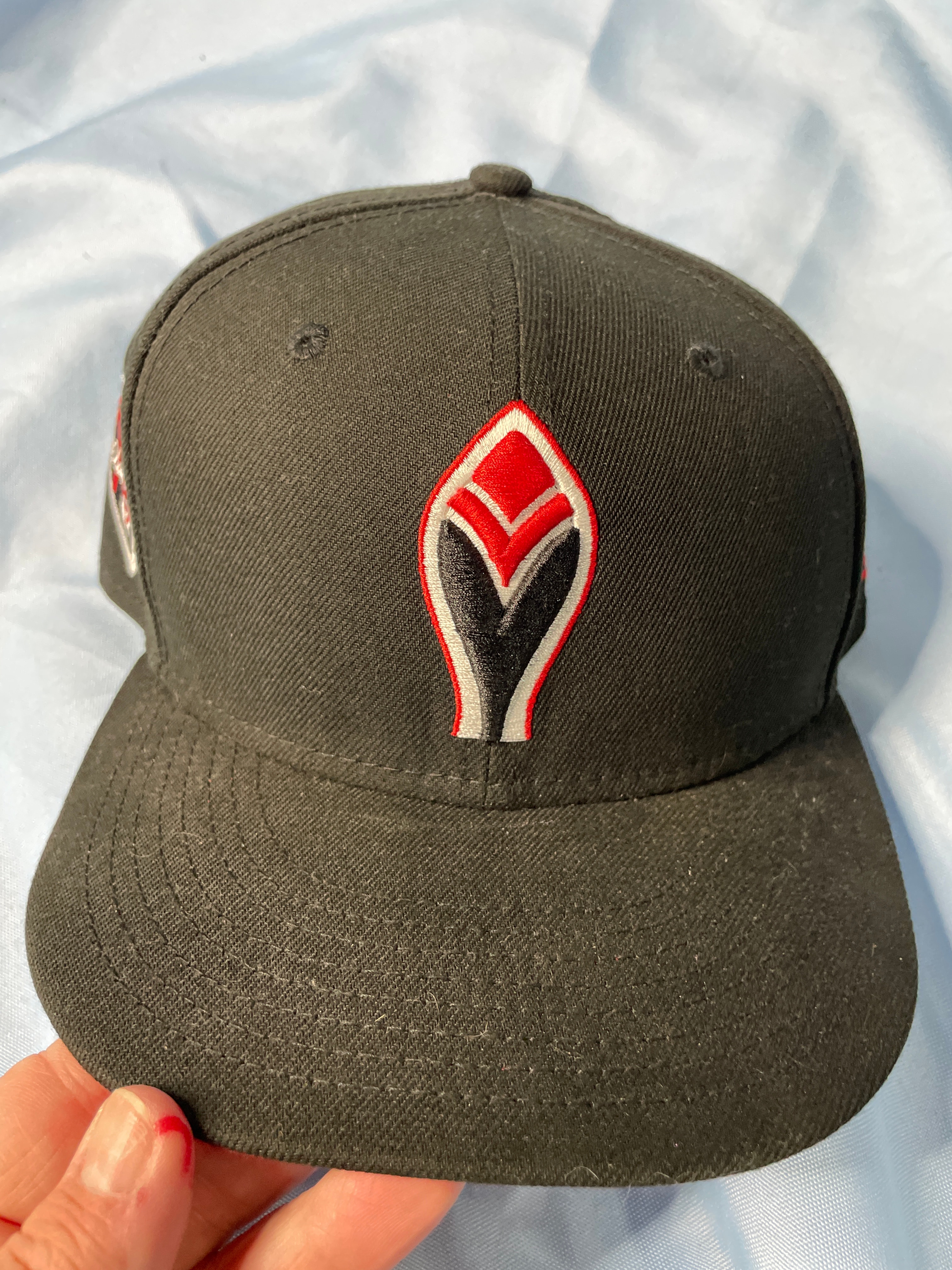 A dark navy New Era 59FIFTY fitted baseball cap, size 7 1/2, with a light blue and teal embroidered Arizona Diamondbacks “D” logo, a “World Series 2001” patch, and “COOPERSTOWN COLLECTION” and “100% WOOL” labels.
