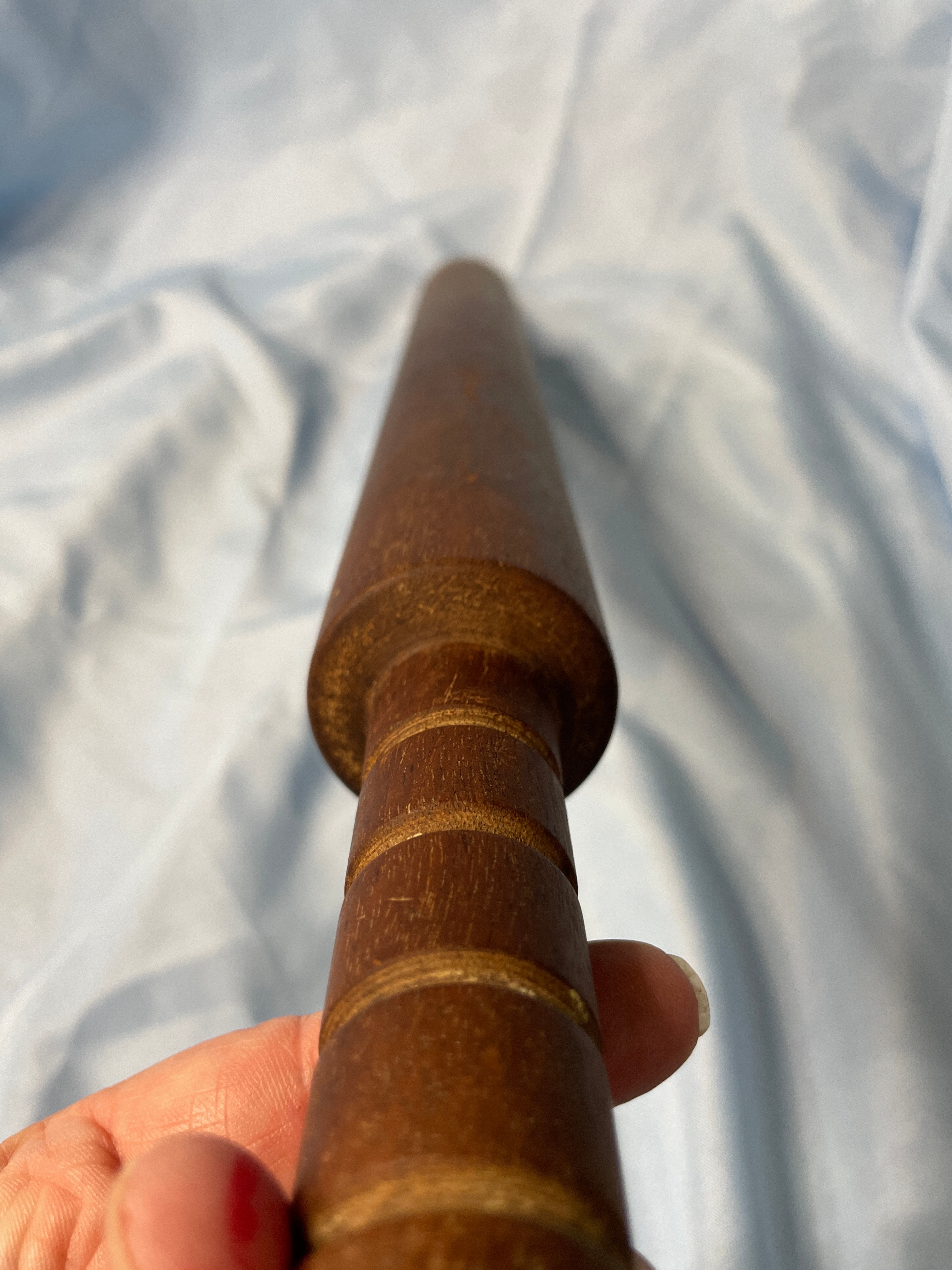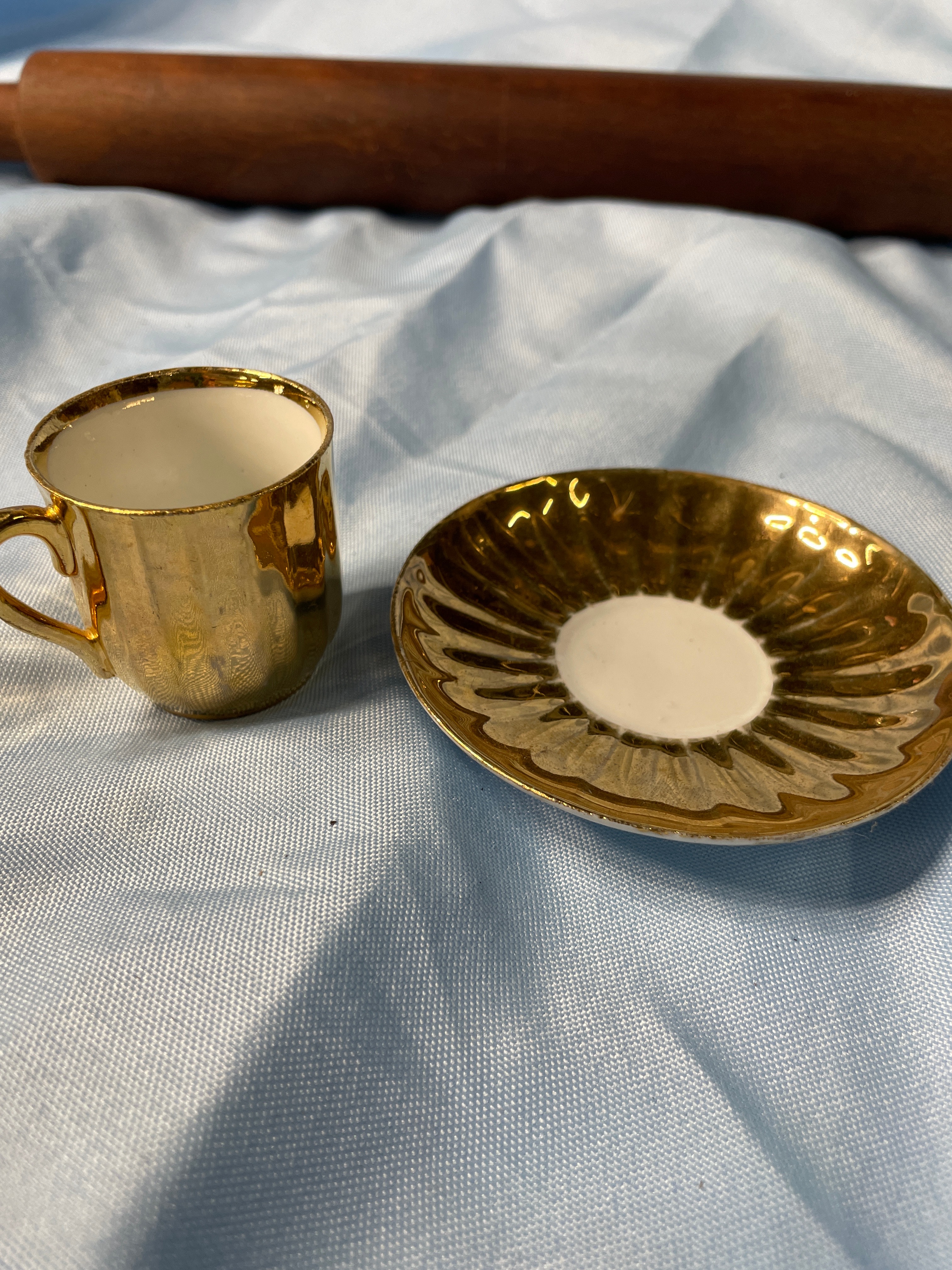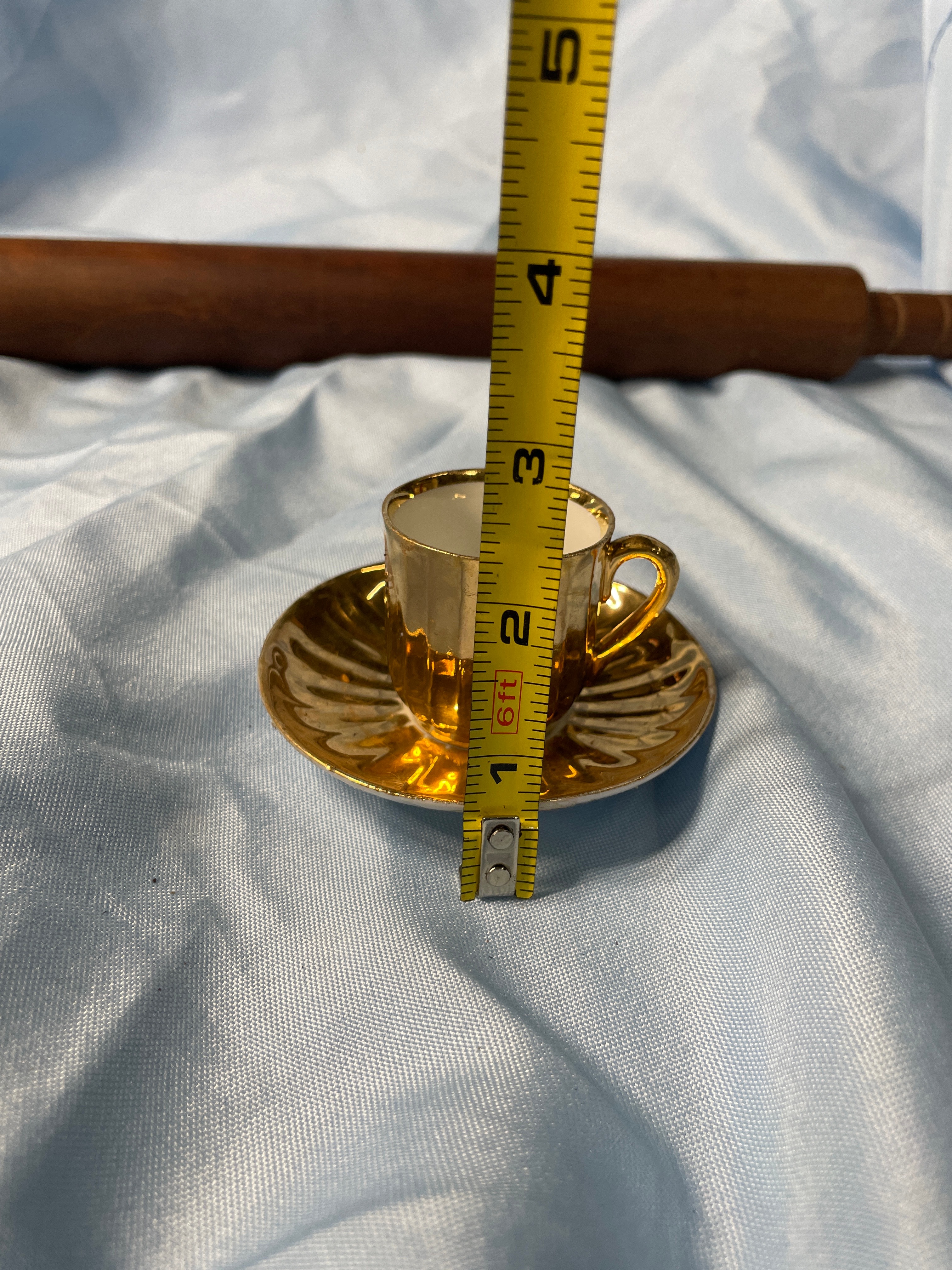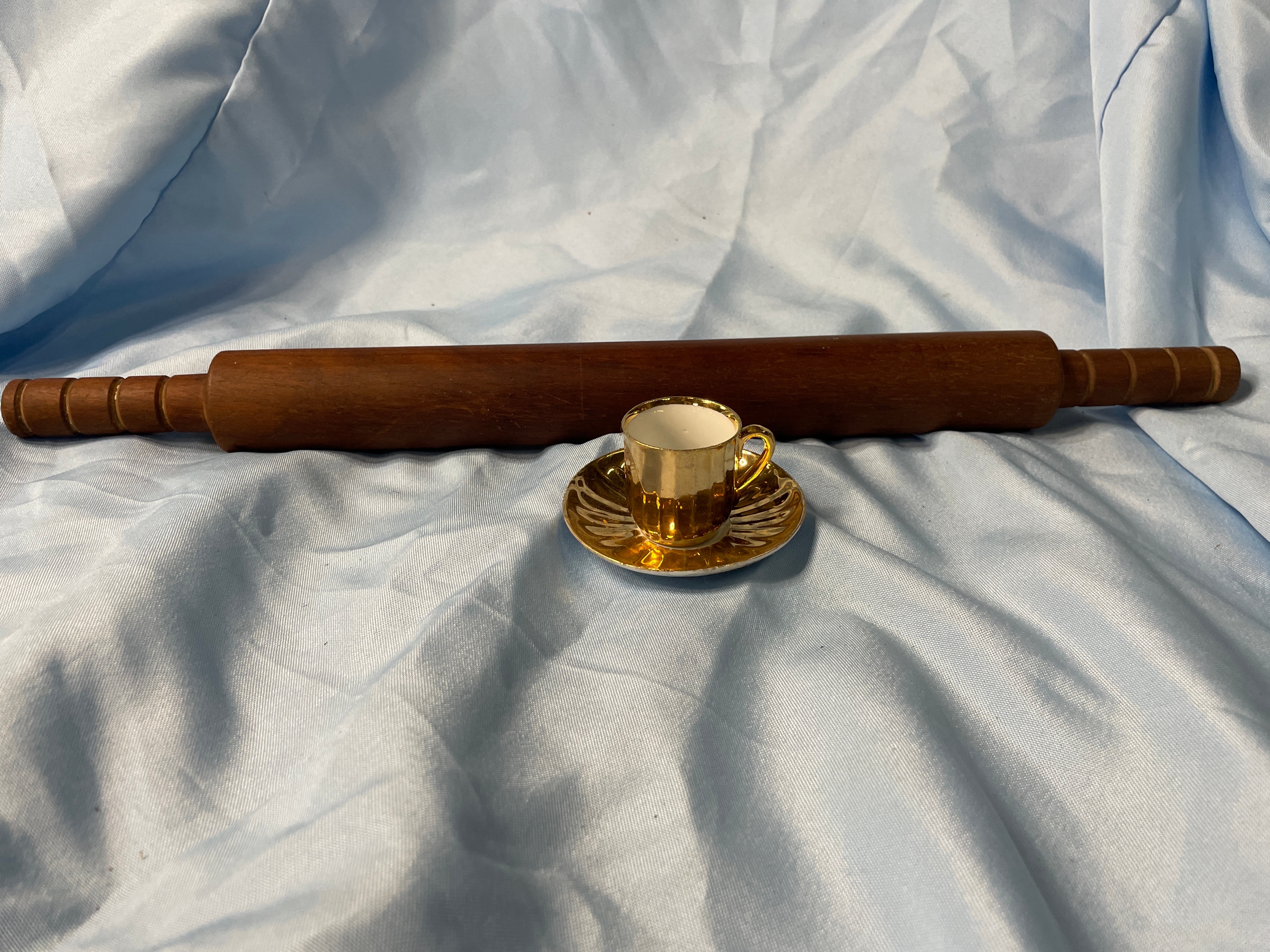 A dark brown wooden rolling pin, approximately 22 inches long, and a gold and white miniature cup and saucer set, with the cup approximately 1.5 inches tall and featuring an impressed mark ’57’ on its base.
