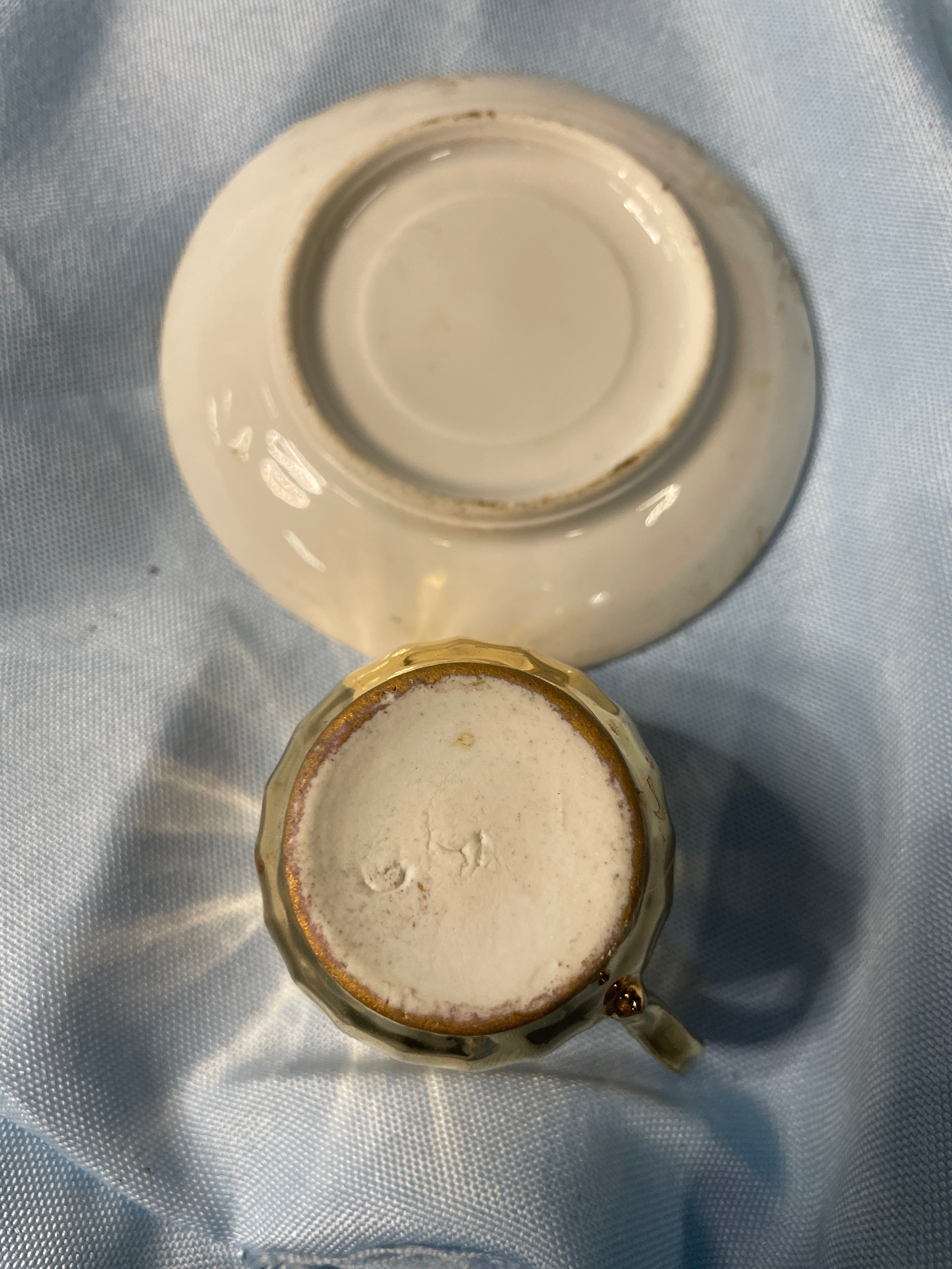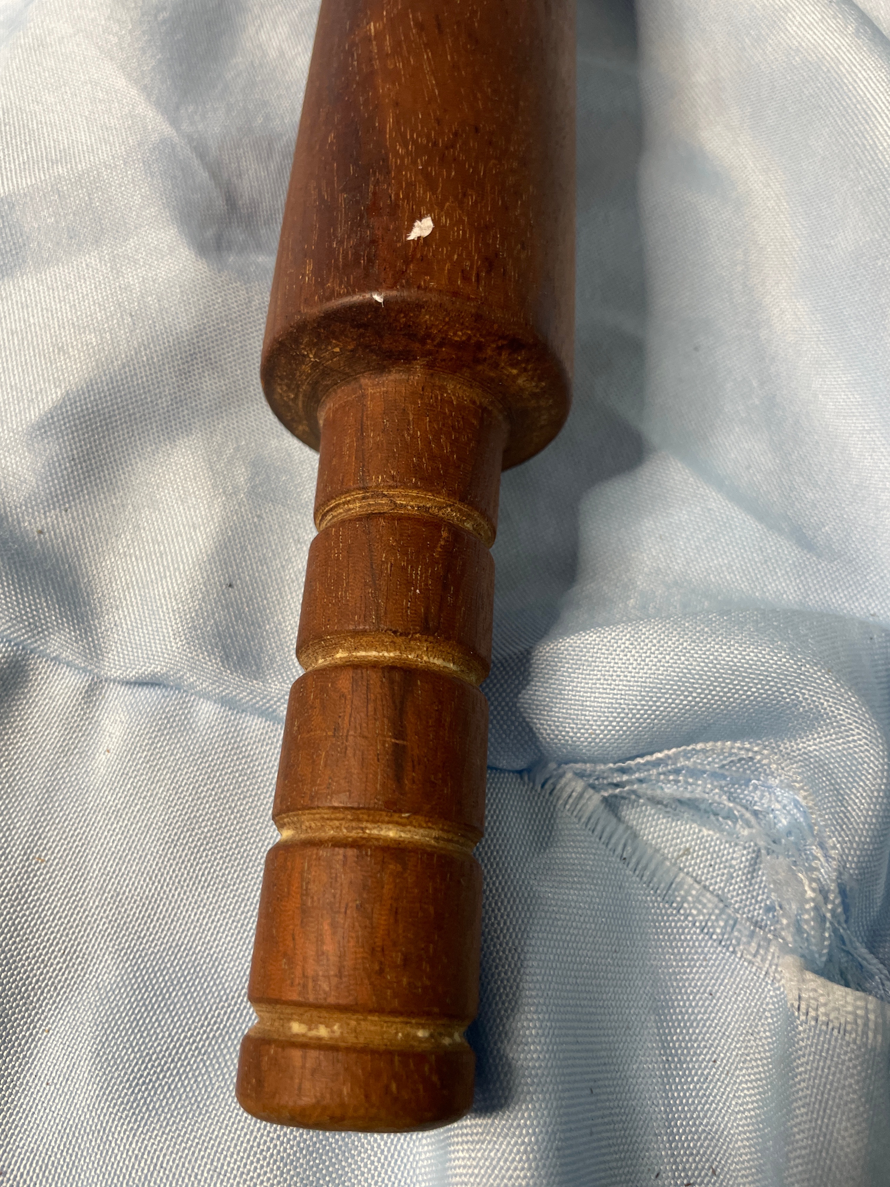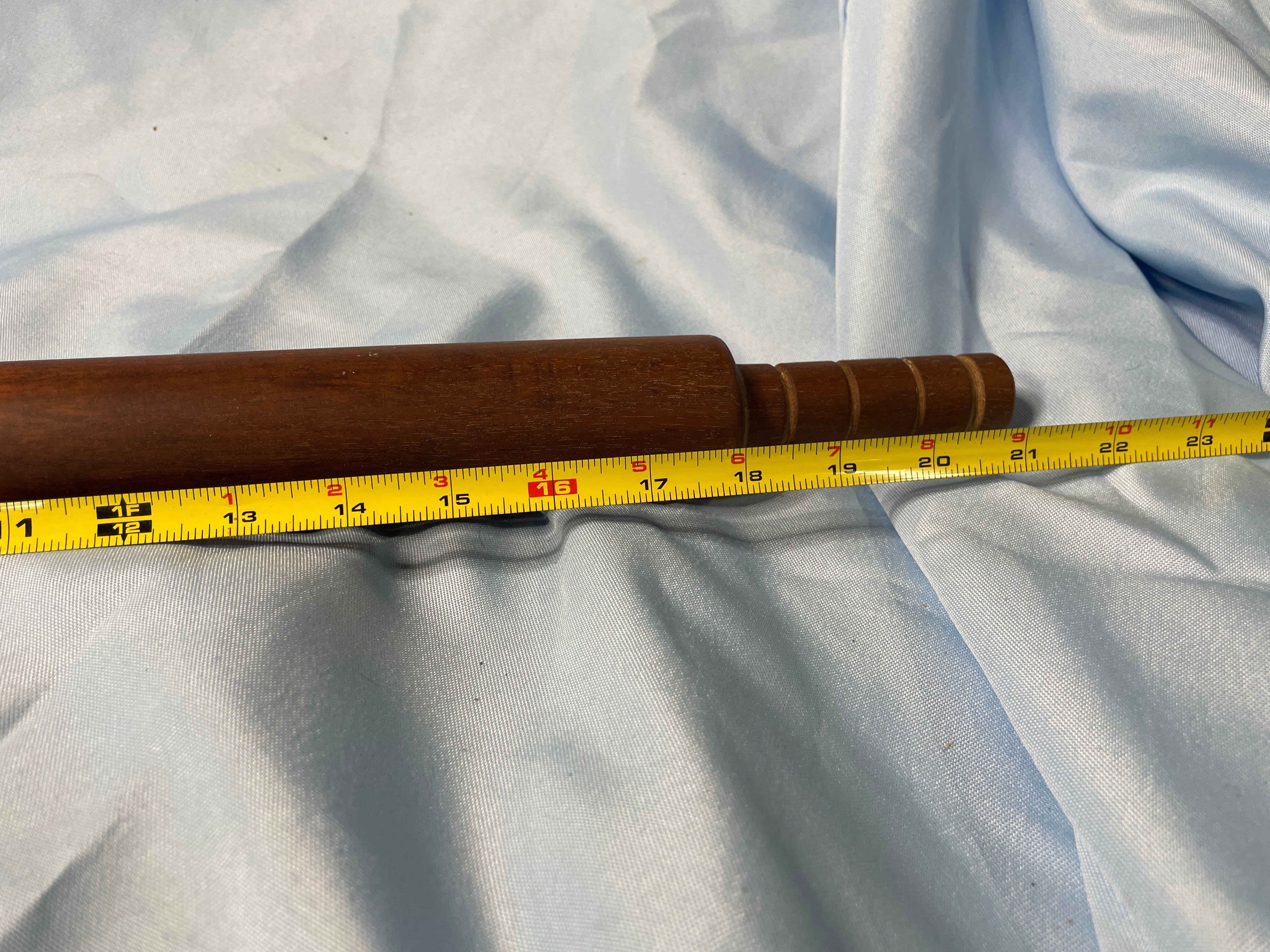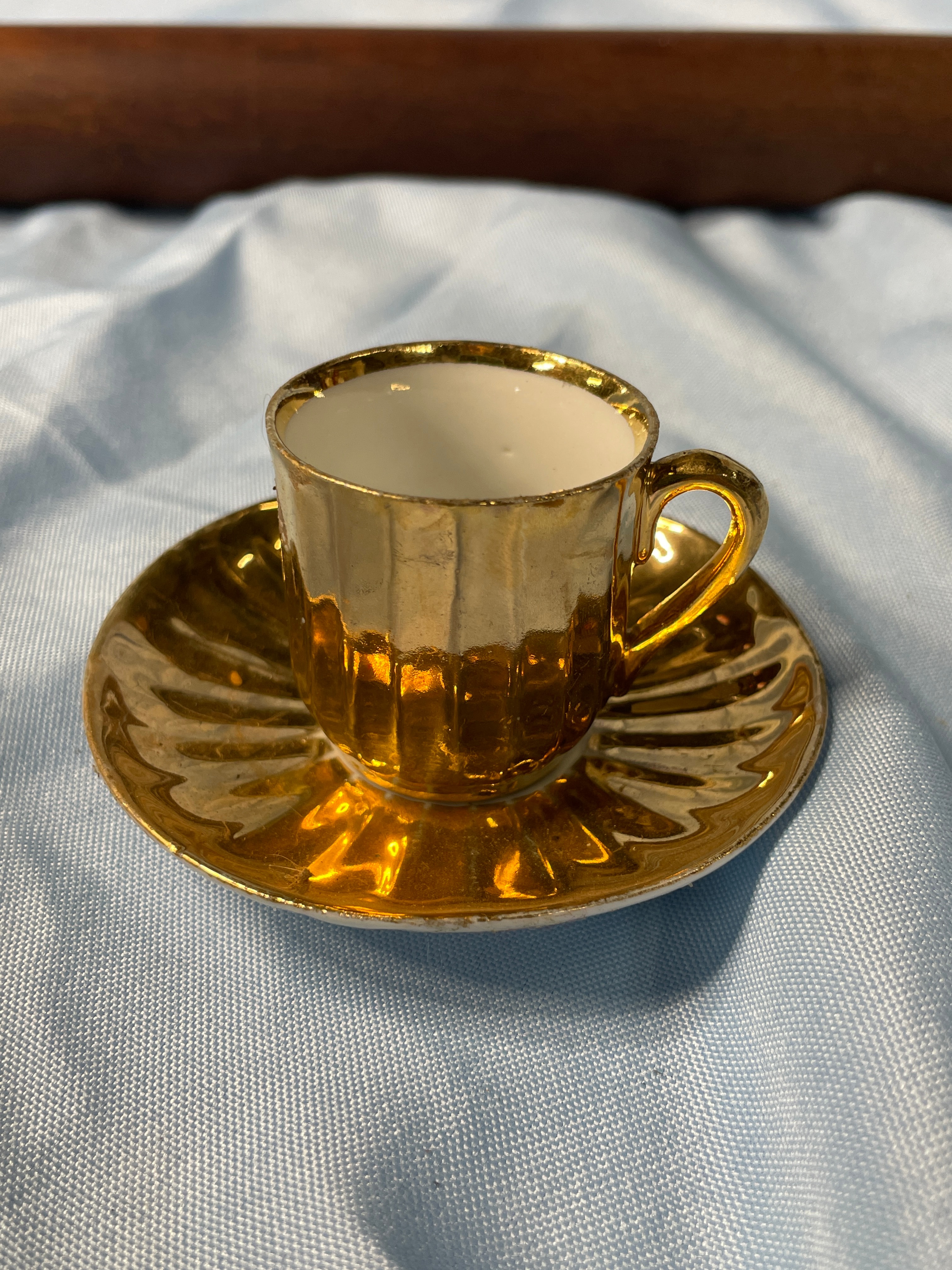 A dark brown wooden rolling pin, approximately 22 inches long, and a gold and white miniature cup and saucer set, with the cup approximately 1.5 inches tall and featuring an impressed mark ’57’ on its base.