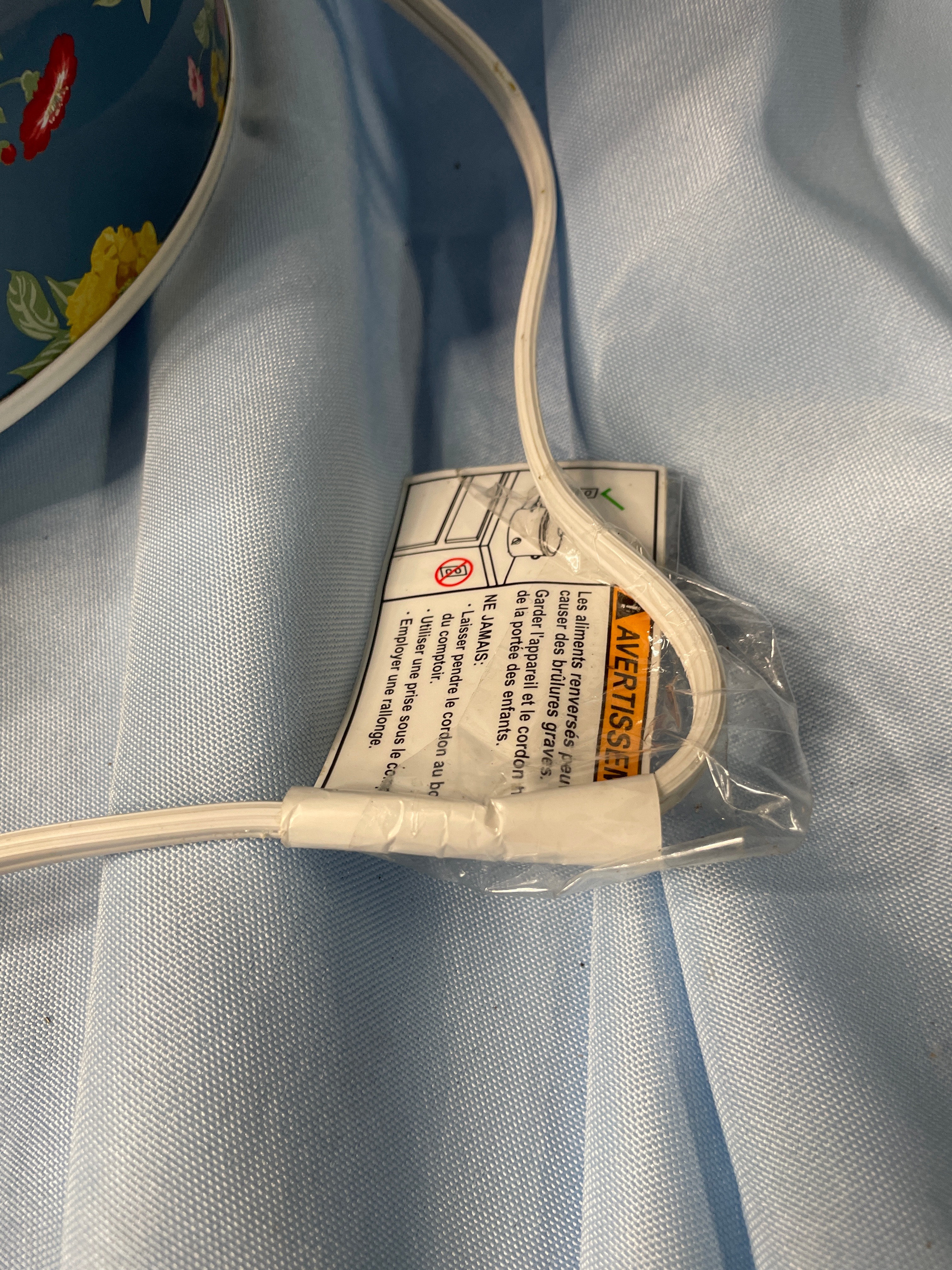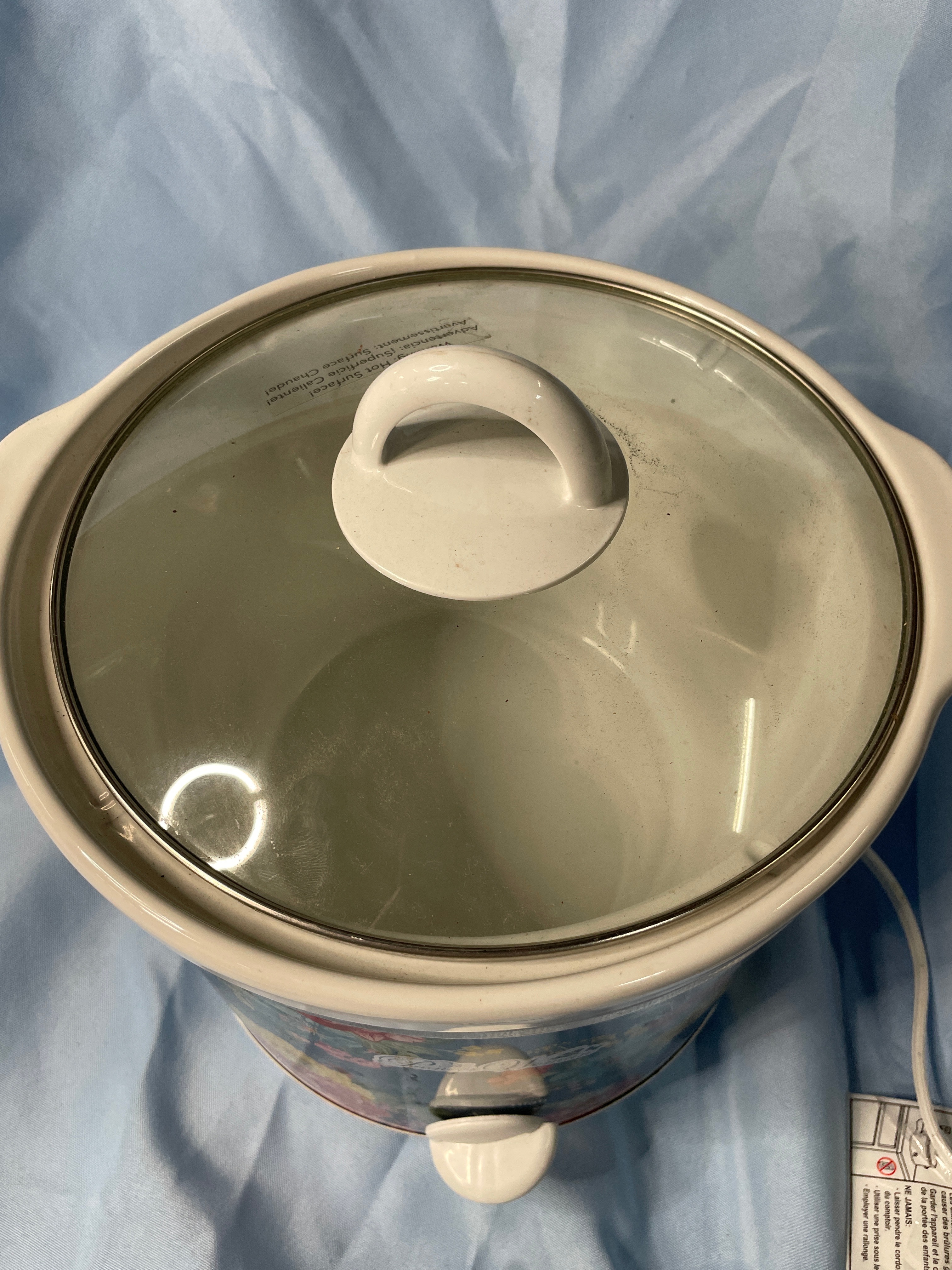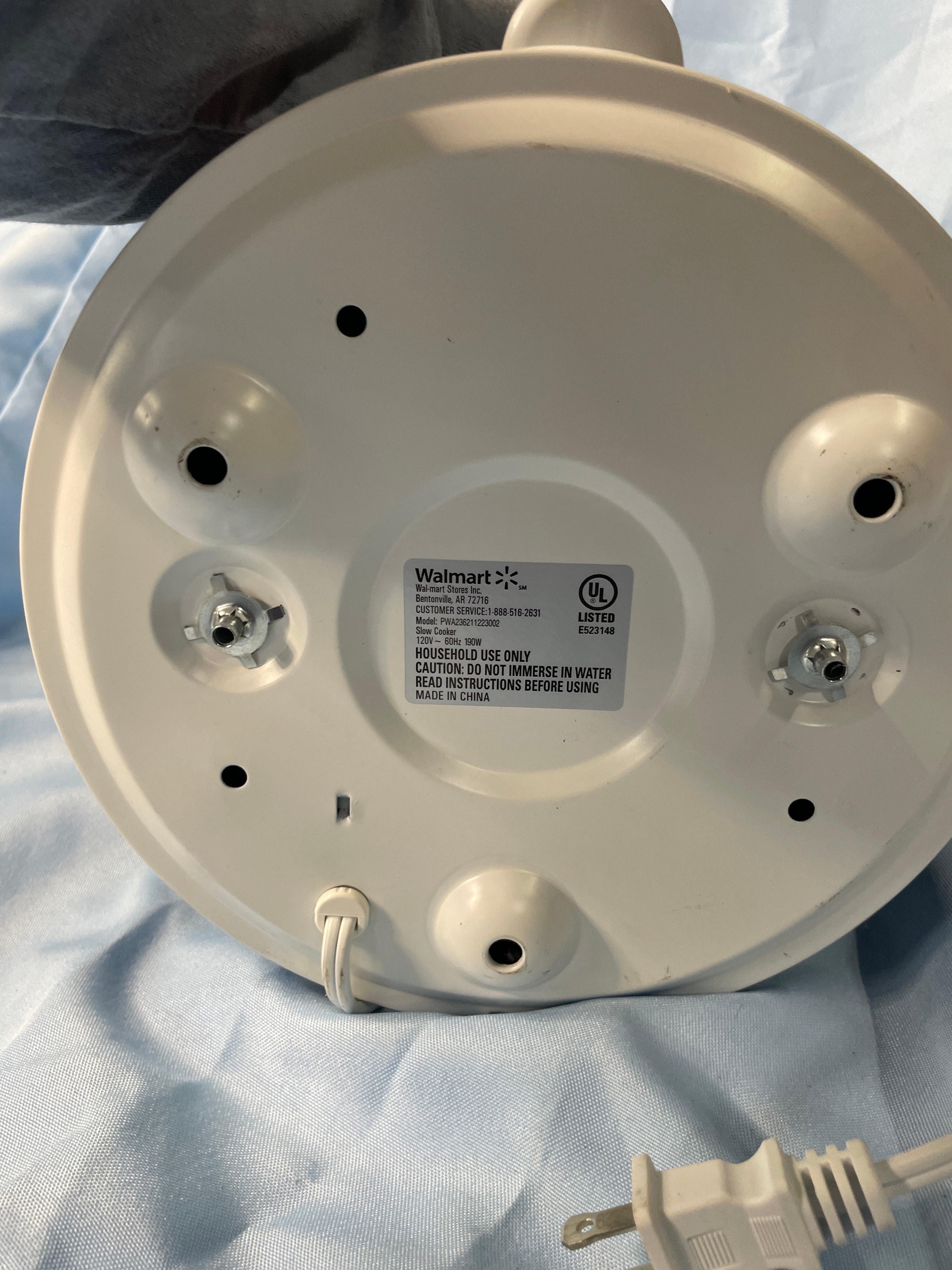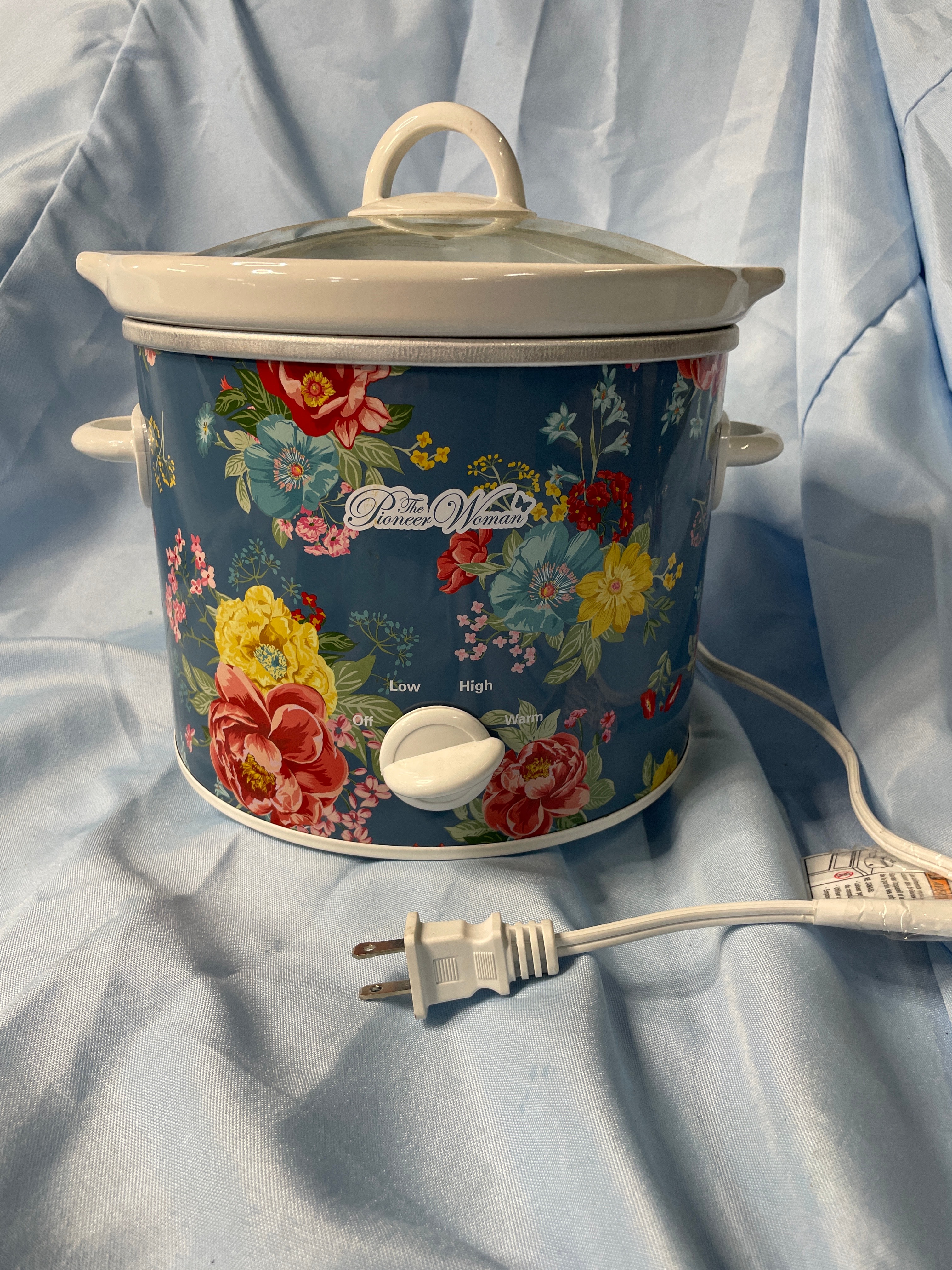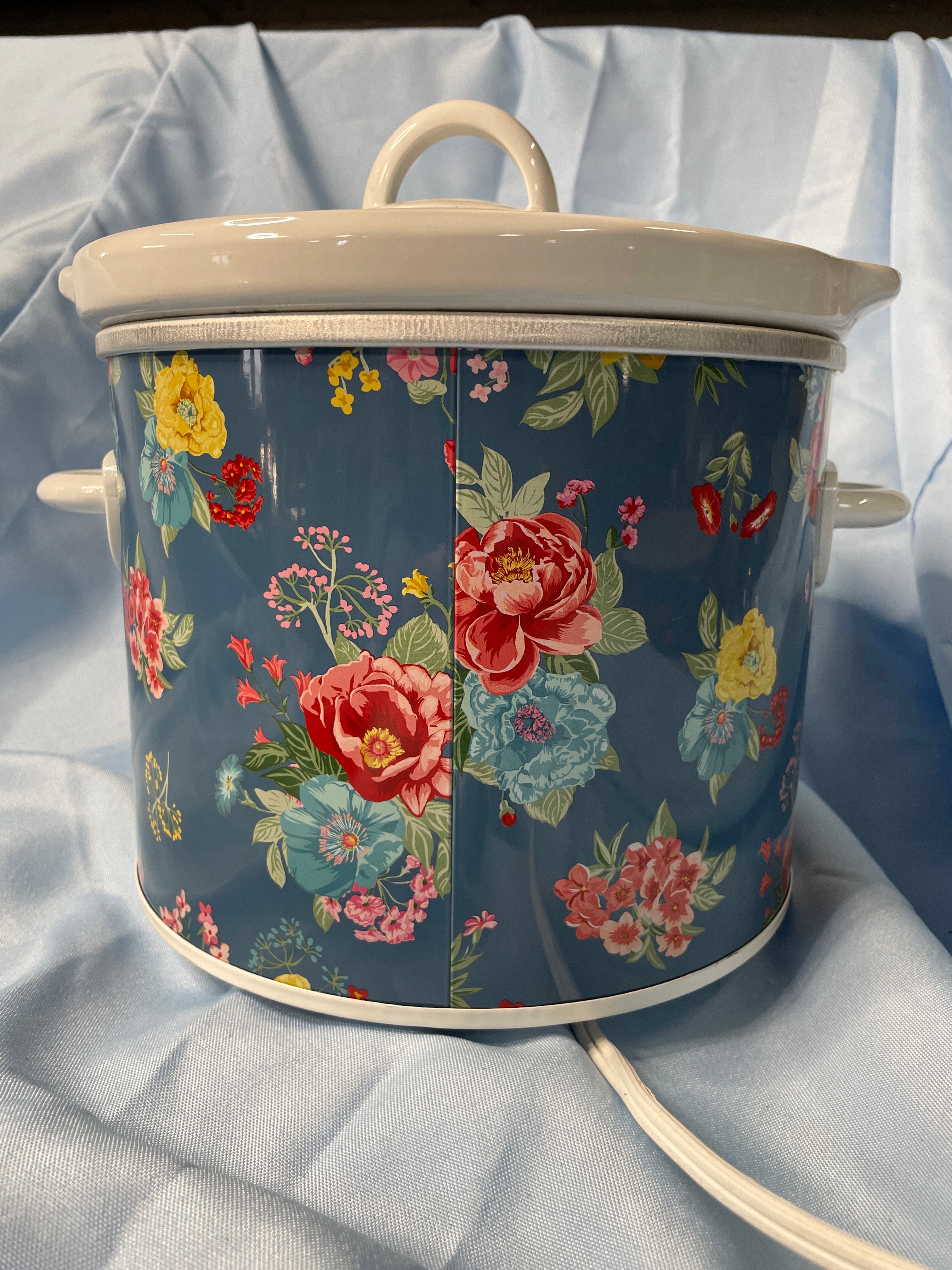 A dark teal ‘The Pioneer Woman’ slow cooker with a colorful floral pattern, white accents, sold by Walmart, model PW43021102000.