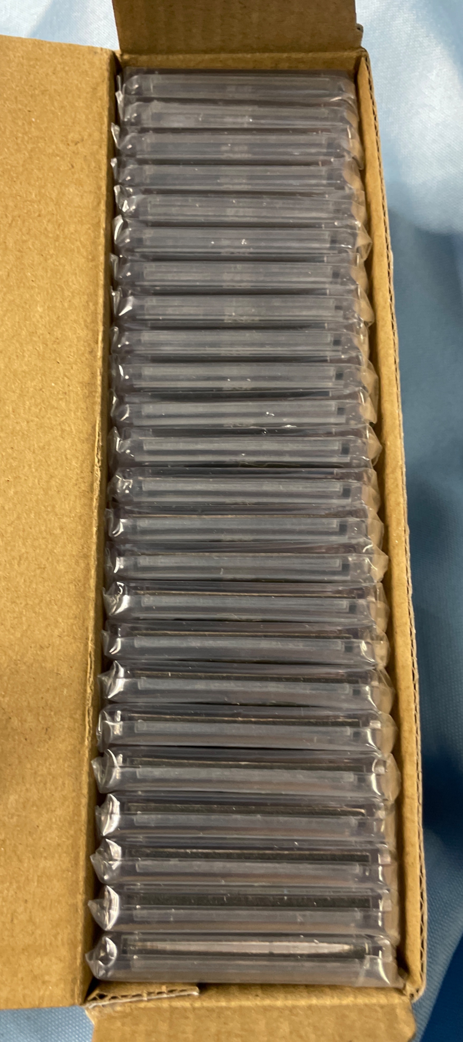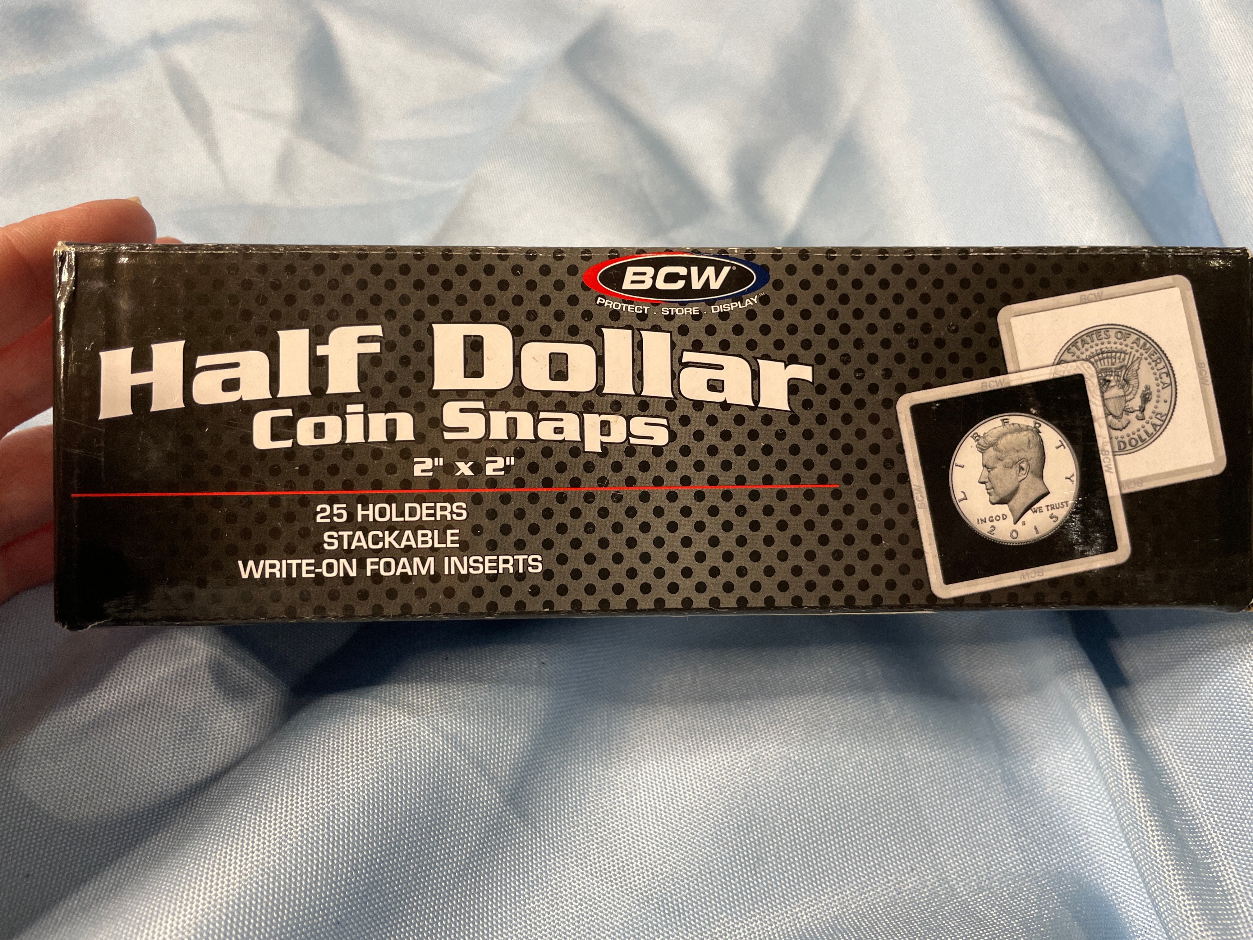 A black and white box containing 24 clear plastic BCW Half Dollar Coin Snaps, 2″ x 2″, stackable with write-on foam inserts.