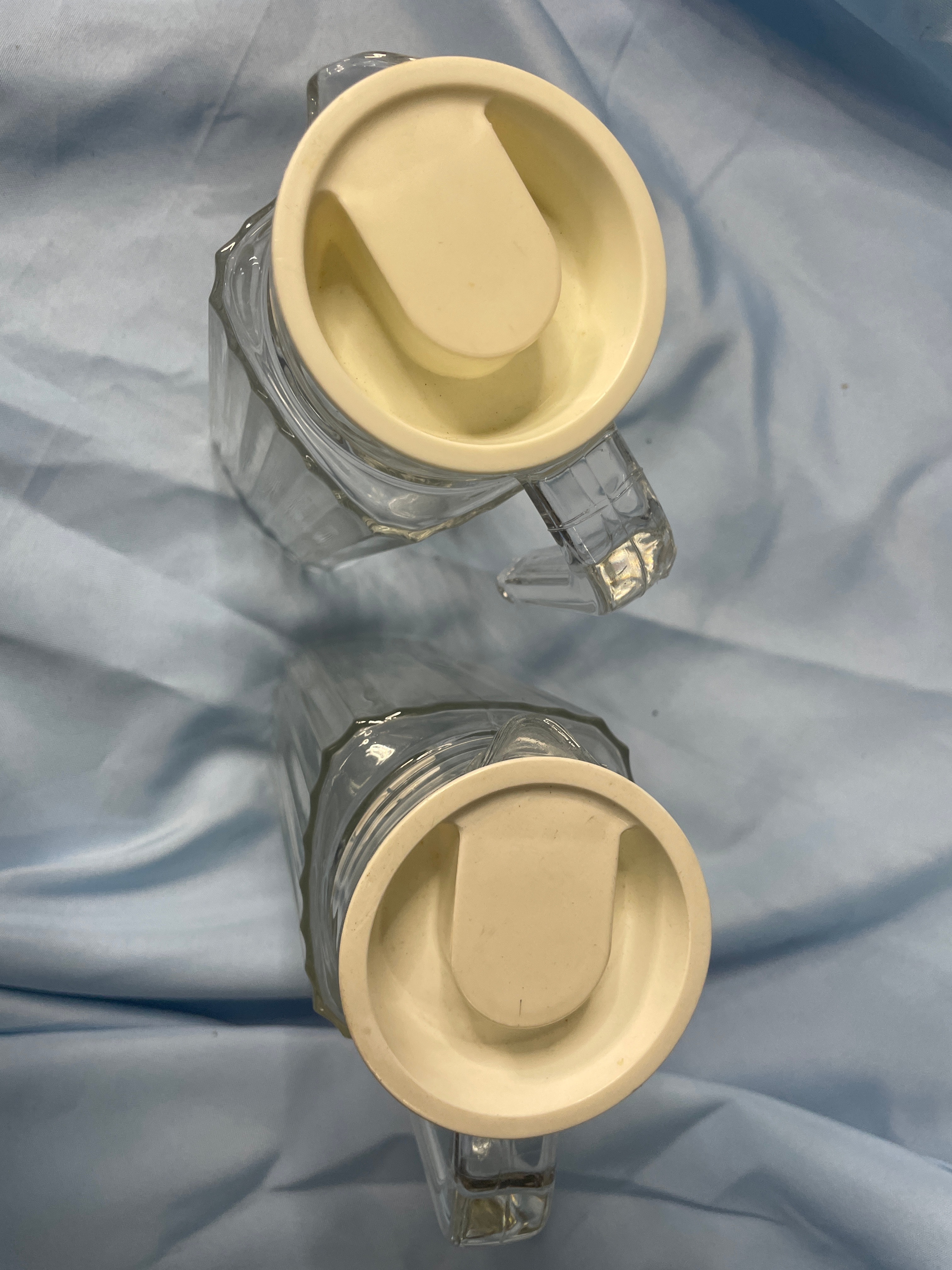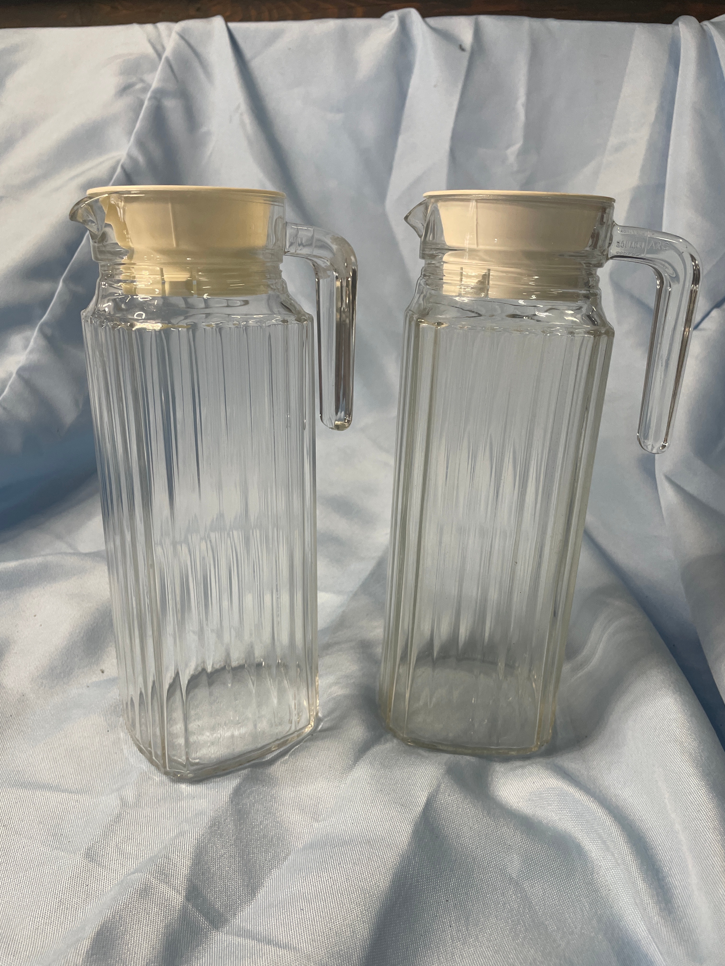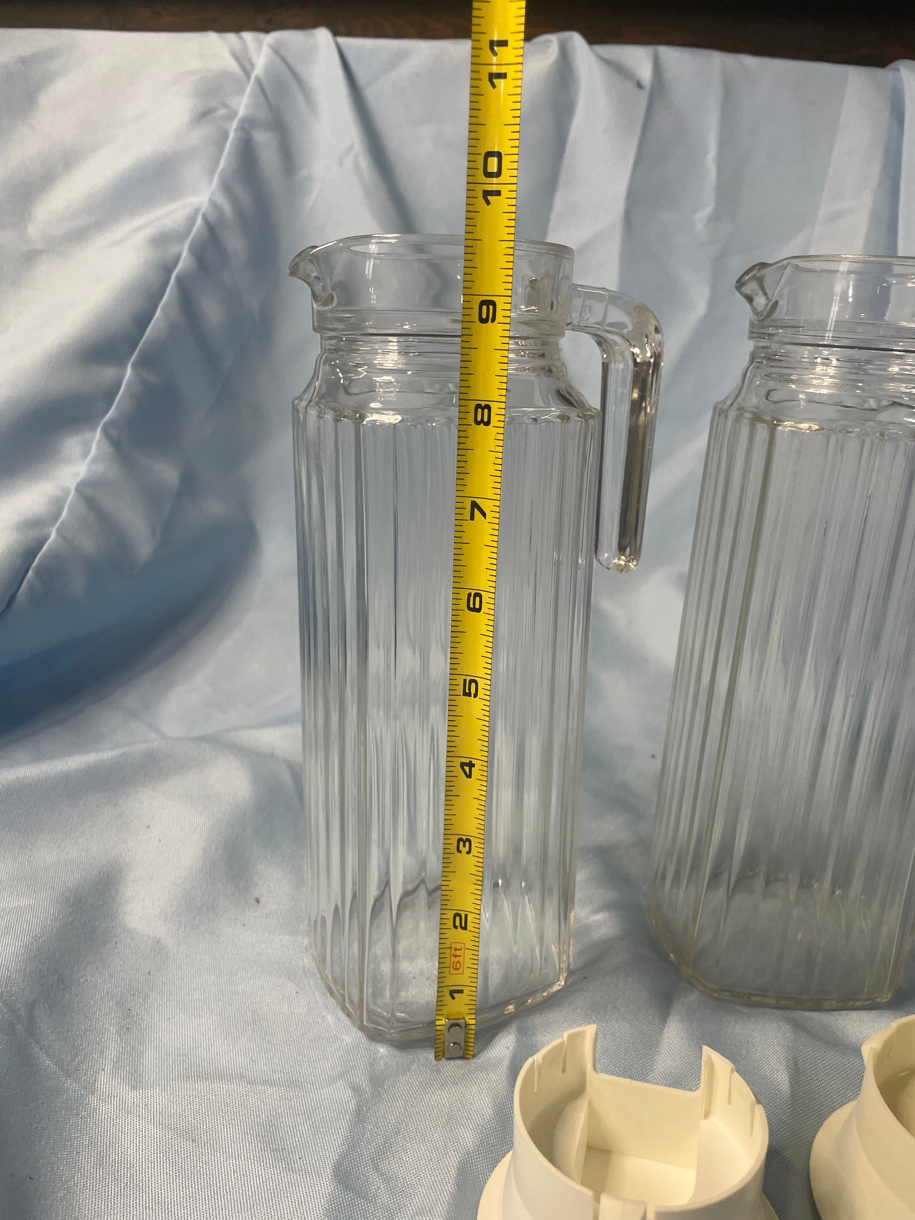 Two clear fluted glass pitchers with off-white plastic lids, marked “MADE IN U.S.A.” on the lids, each measuring approximately 9.5 inches tall.
