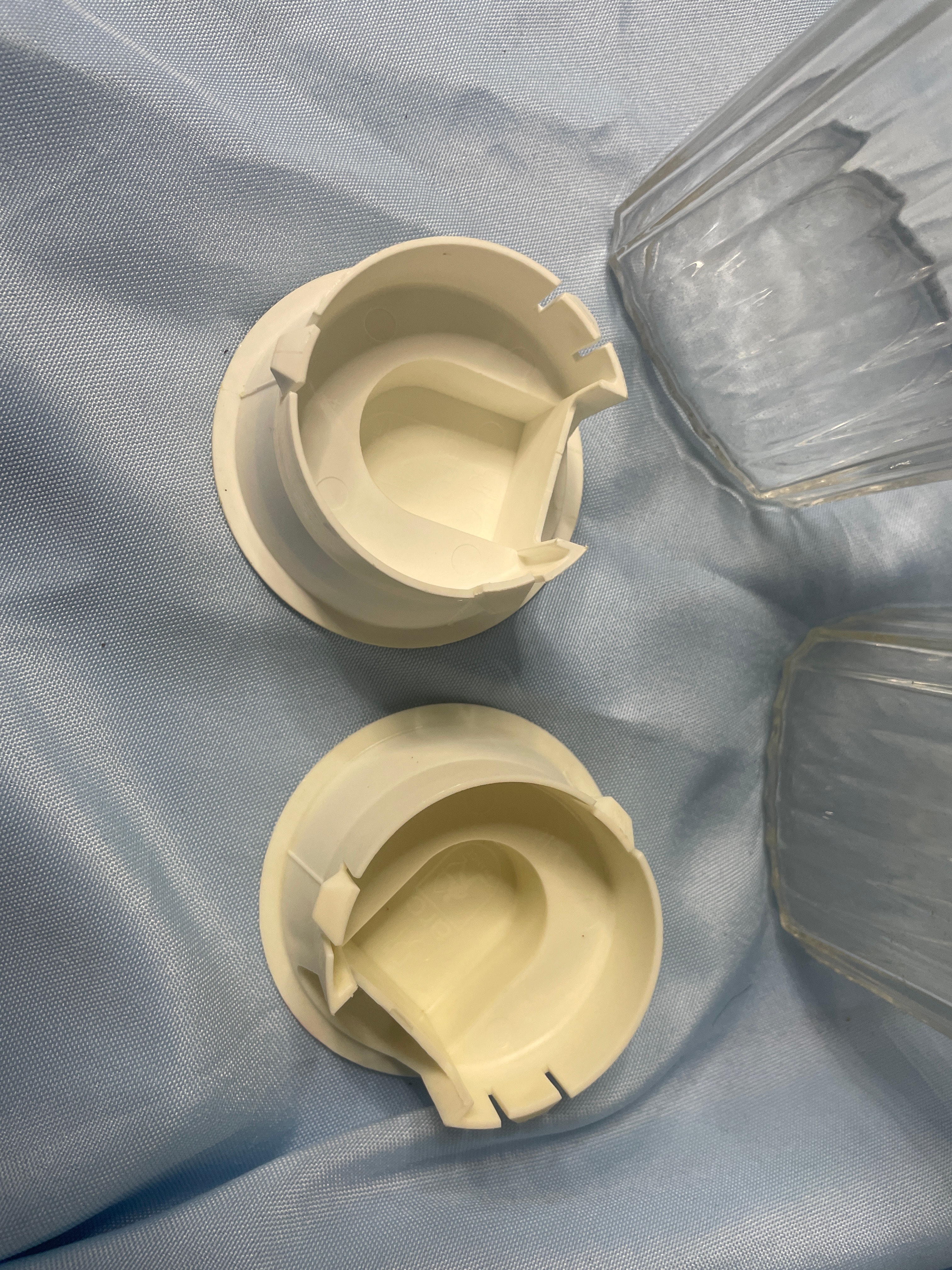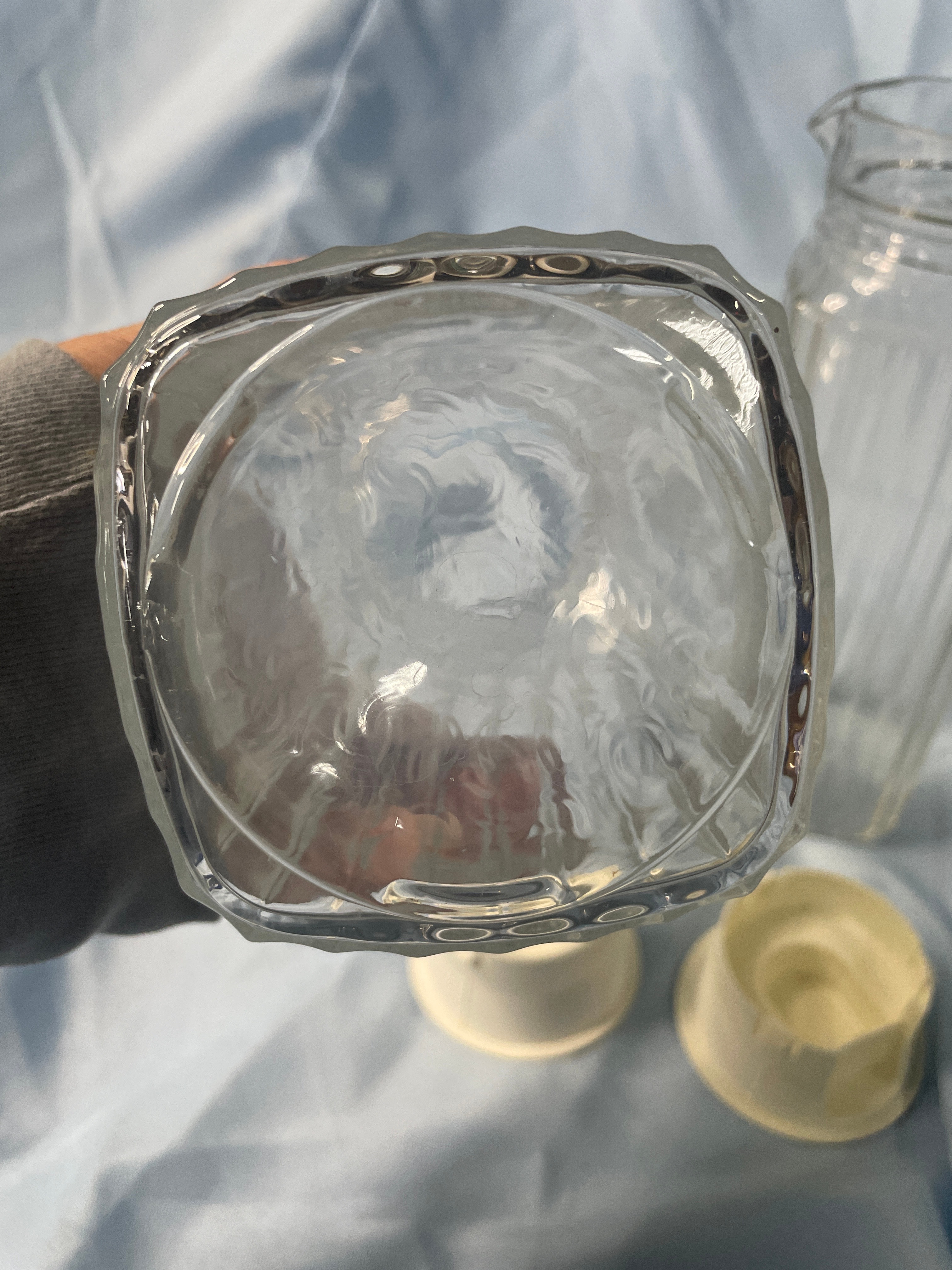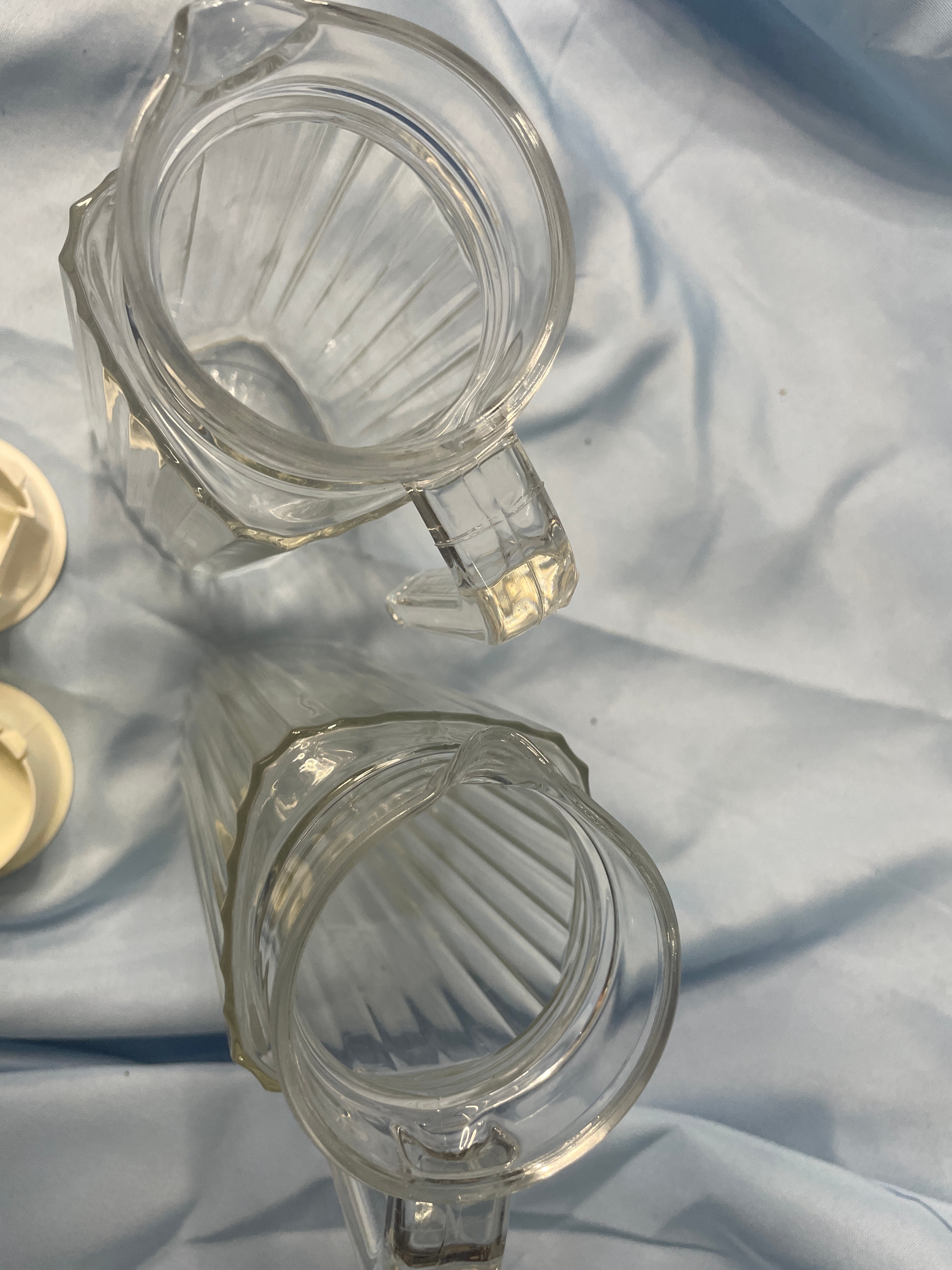 Two clear fluted glass pitchers with off-white plastic lids, marked “MADE IN U.S.A.” on the lids, each measuring approximately 9.5 inches tall.