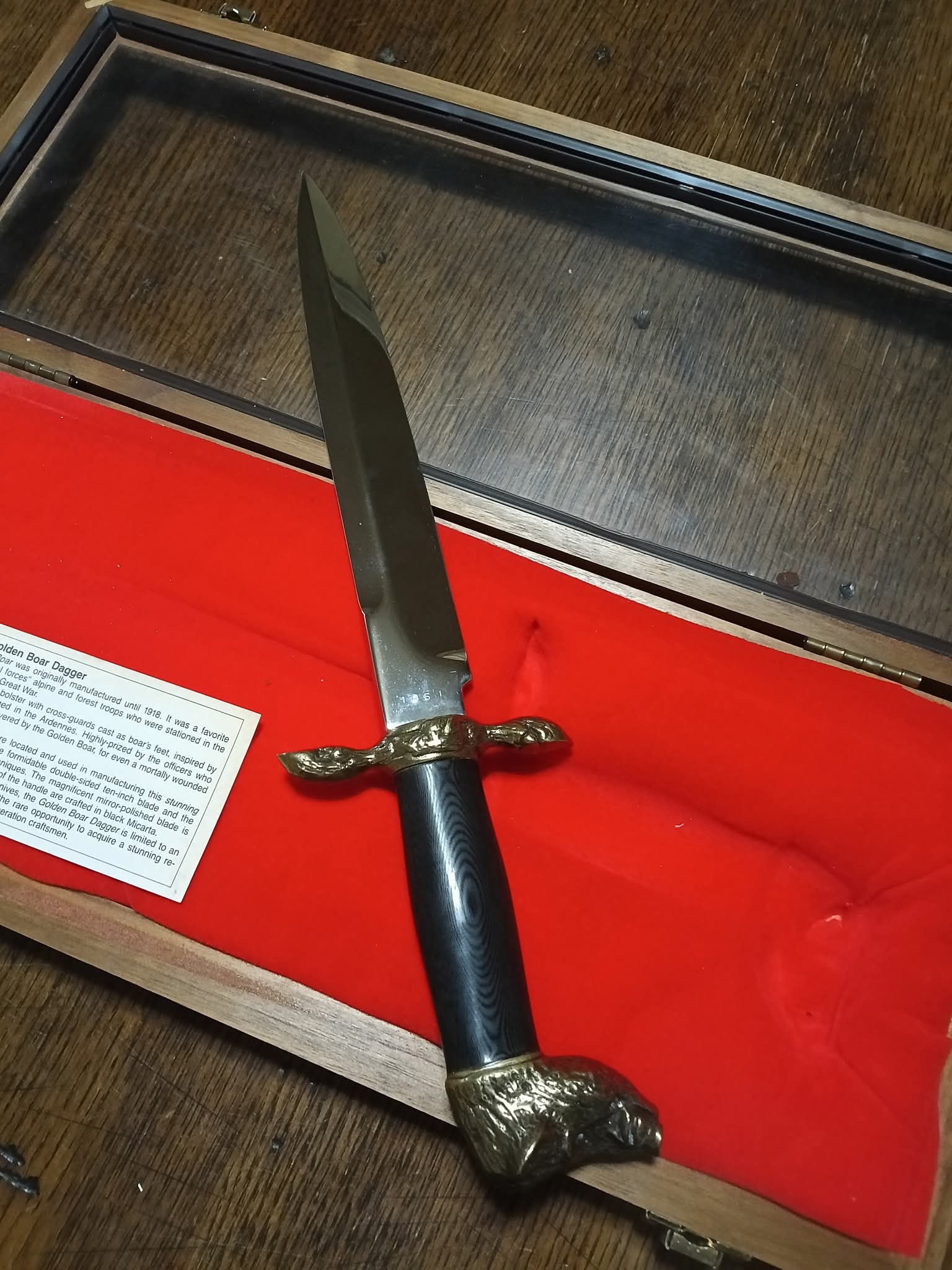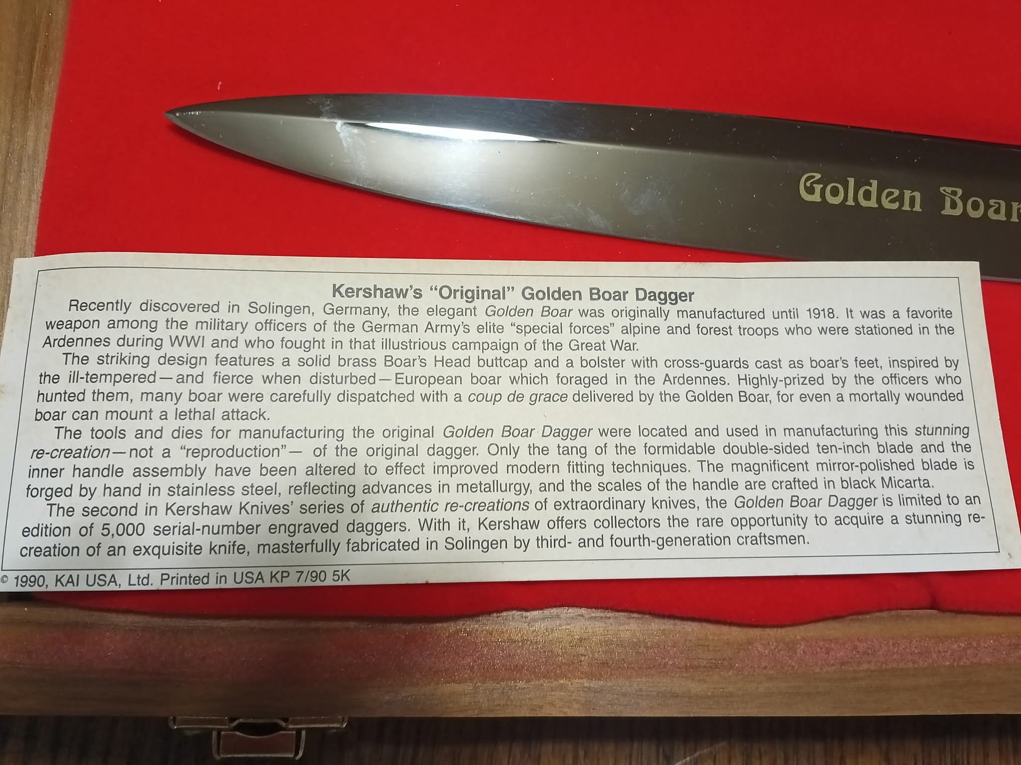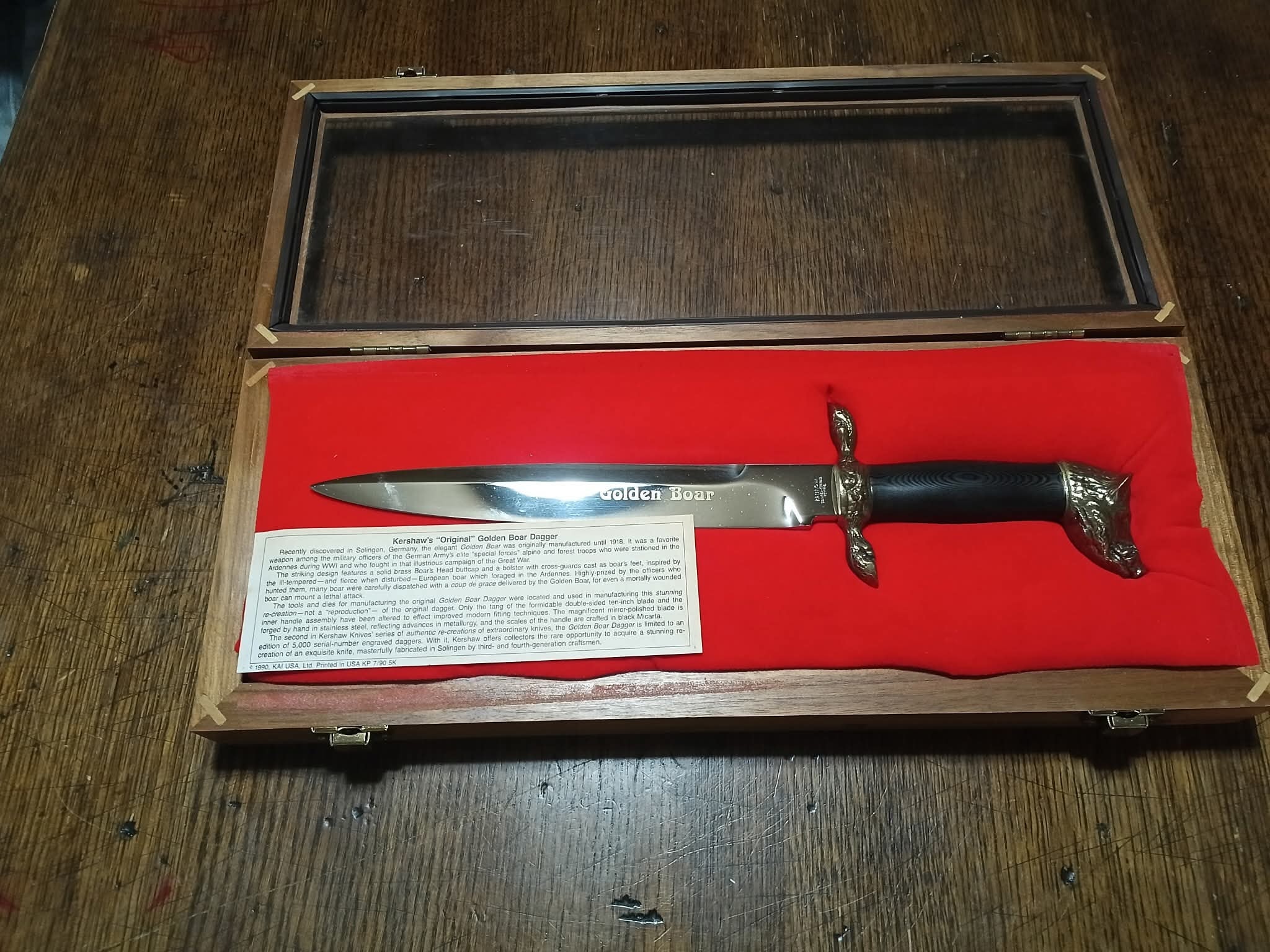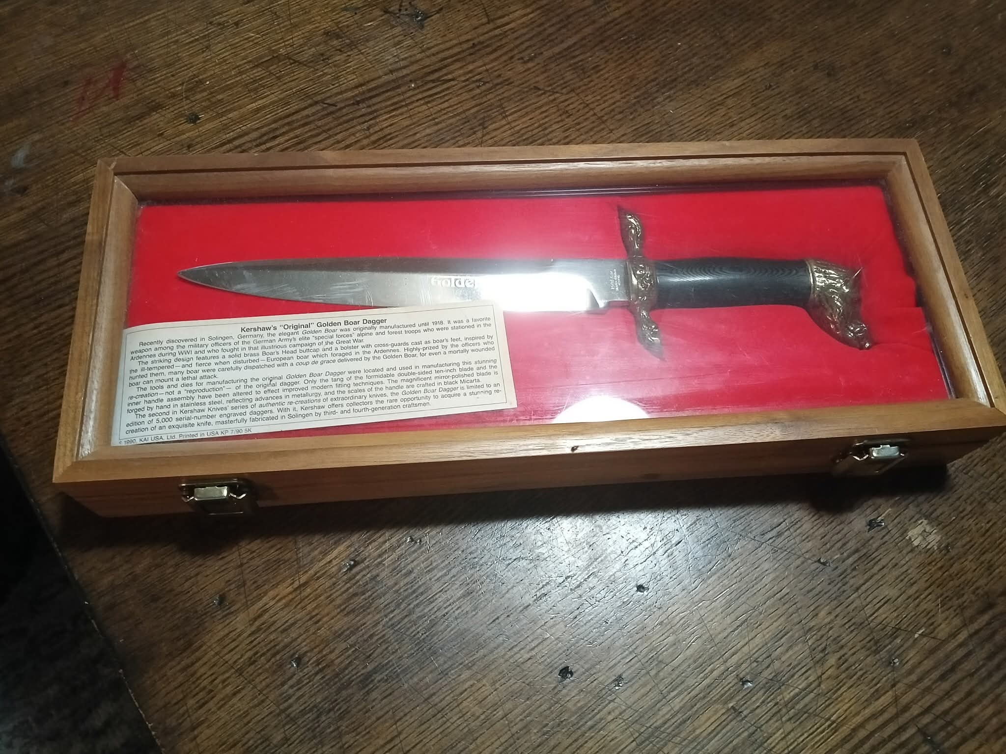 A Kershaw “Golden Boar” dagger with a silver blade featuring gold “Golden Boar” text, engraved “kershaw SOLINGEN-GERMANY ROSTFREI” and serial number “1951”, a black handle, and bronze boar head pommel and crossguard, presented in a wooden display case with red velvet lining and a 1990 KAI USA Ltd. label noting it is a limited edition of 5,000.