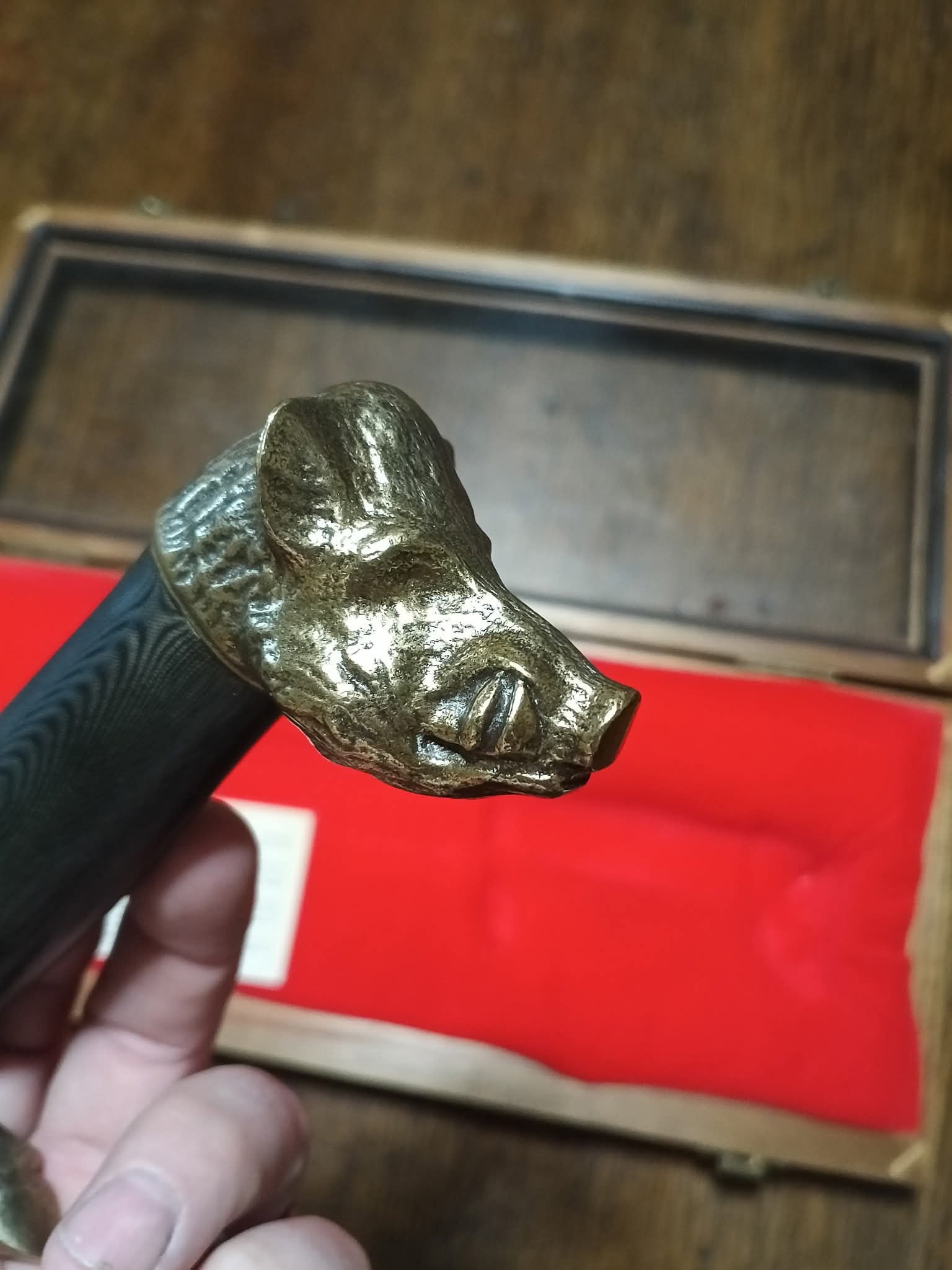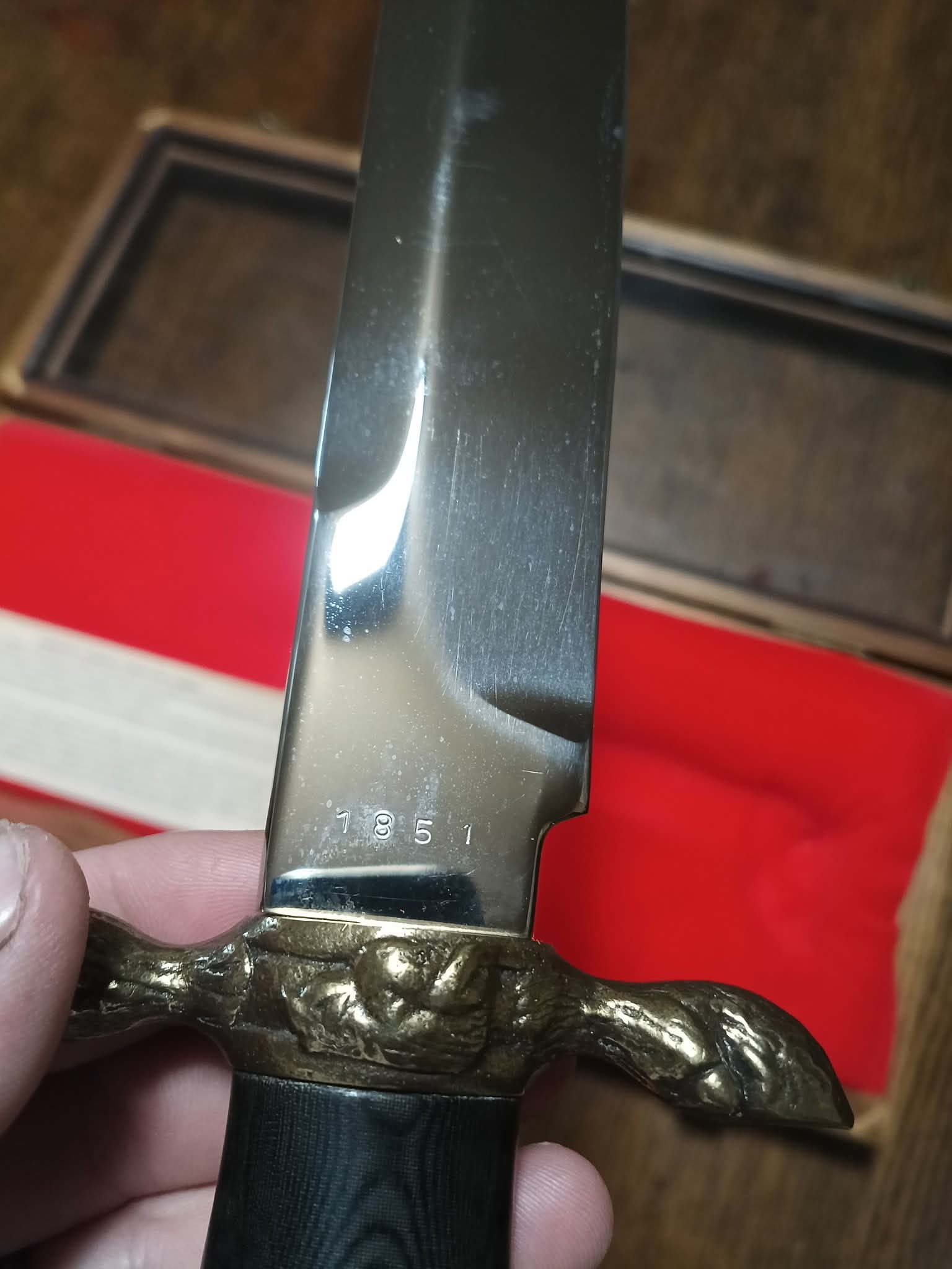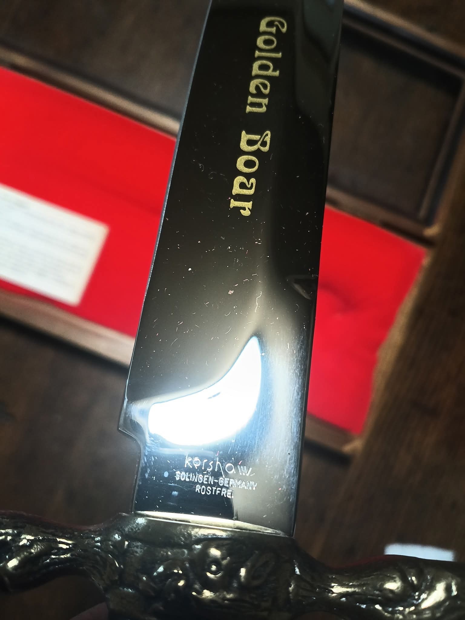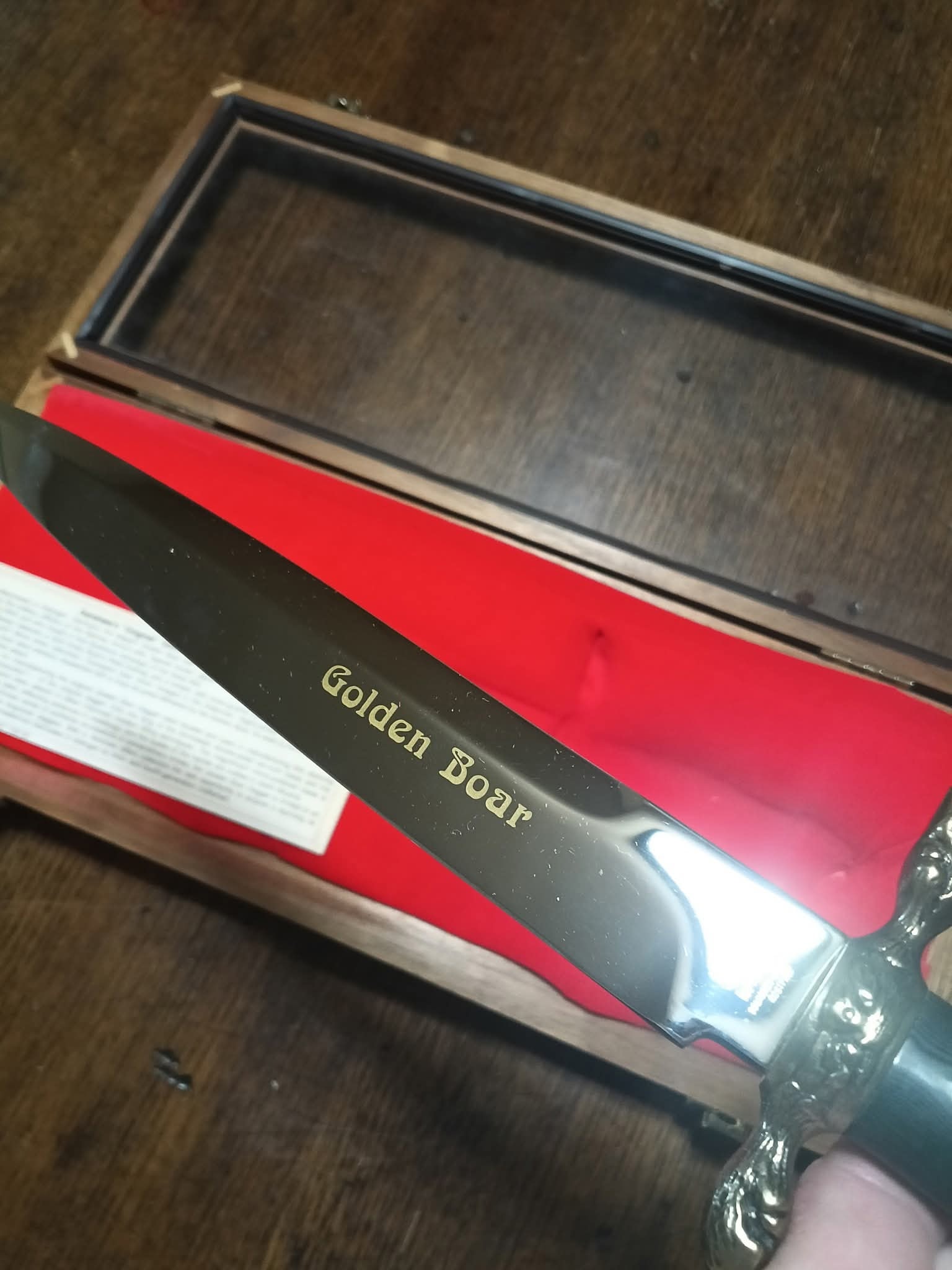 A Kershaw “Golden Boar” dagger with a silver blade featuring gold “Golden Boar” text, engraved “kershaw SOLINGEN-GERMANY ROSTFREI” and serial number “1951”, a black handle, and bronze boar head pommel and crossguard, presented in a wooden display case with red velvet lining and a 1990 KAI USA Ltd. label noting it is a limited edition of 5,000.