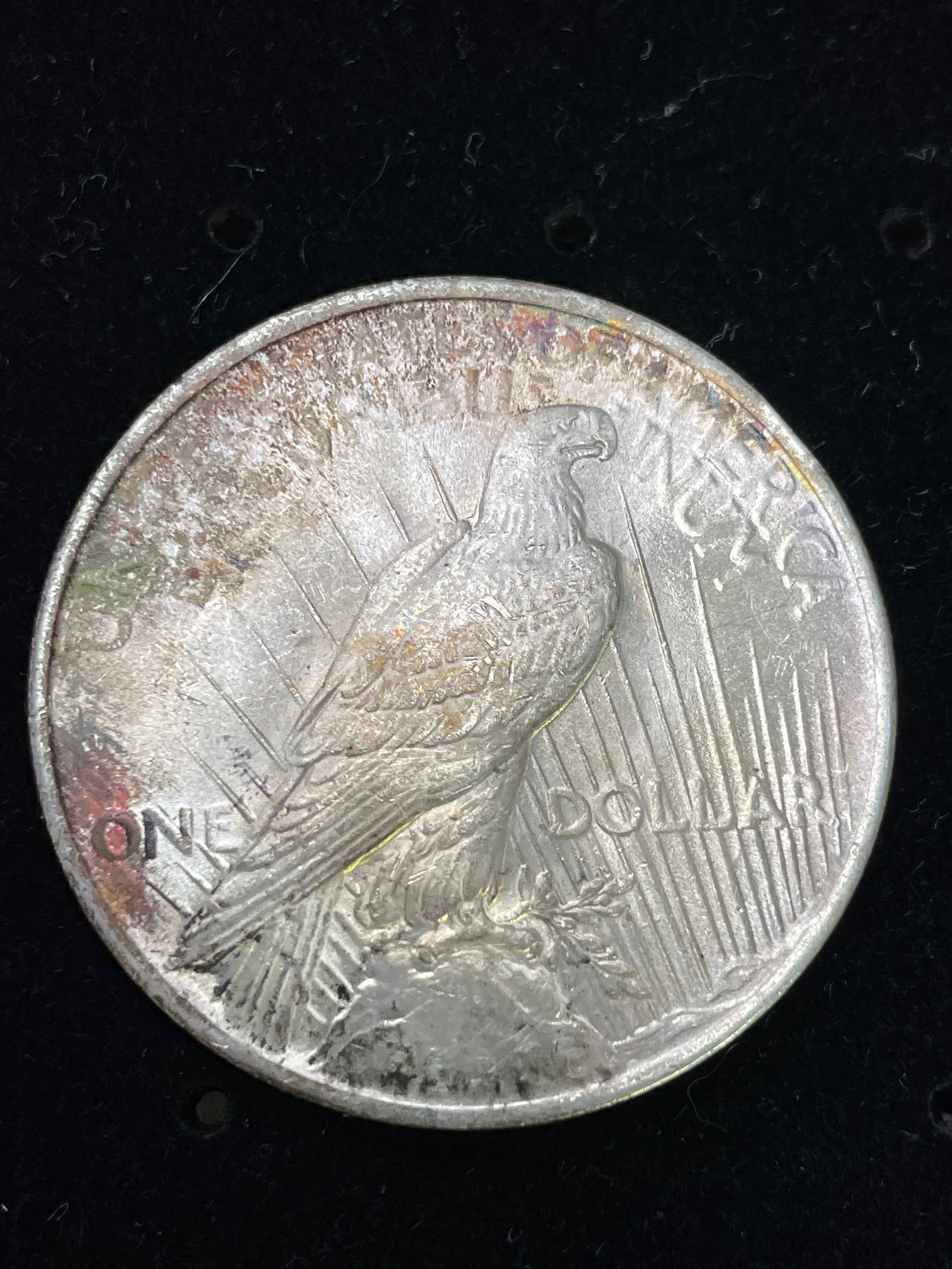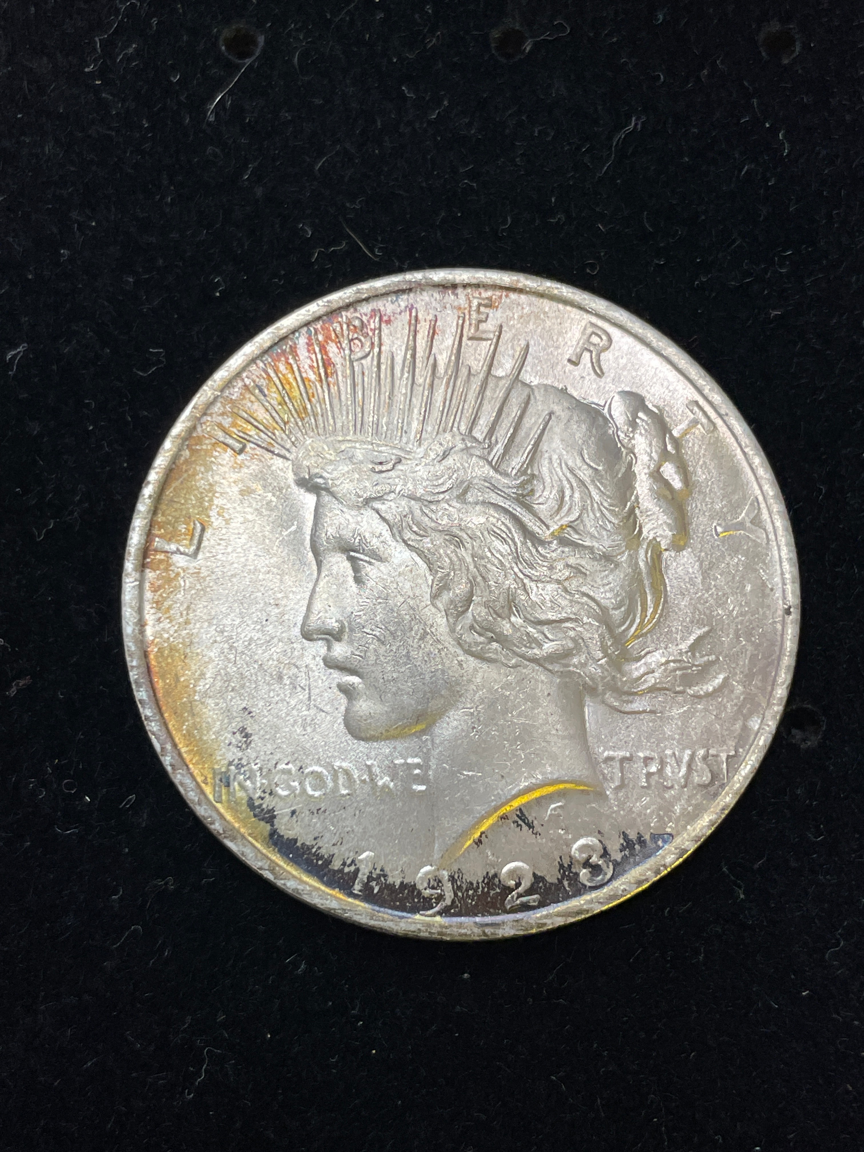 A United States Peace Silver Dollar, dated 1923. The obverse features a profile bust of Lady Liberty wearing a radiate crown, with the inscriptions “LIBERTY” above and “IN GOD WE TRUST” below, alongside the date “1923”. The reverse displays an eagle perched on a rock, facing right, with “UNITED STATES OF AMERICA” and the Latin phrase “E PLURIBUS UNUM” (Out of many, one) encircling the upper half, and “ONE DOLLAR” at the bottom. The coin is composed of silver.