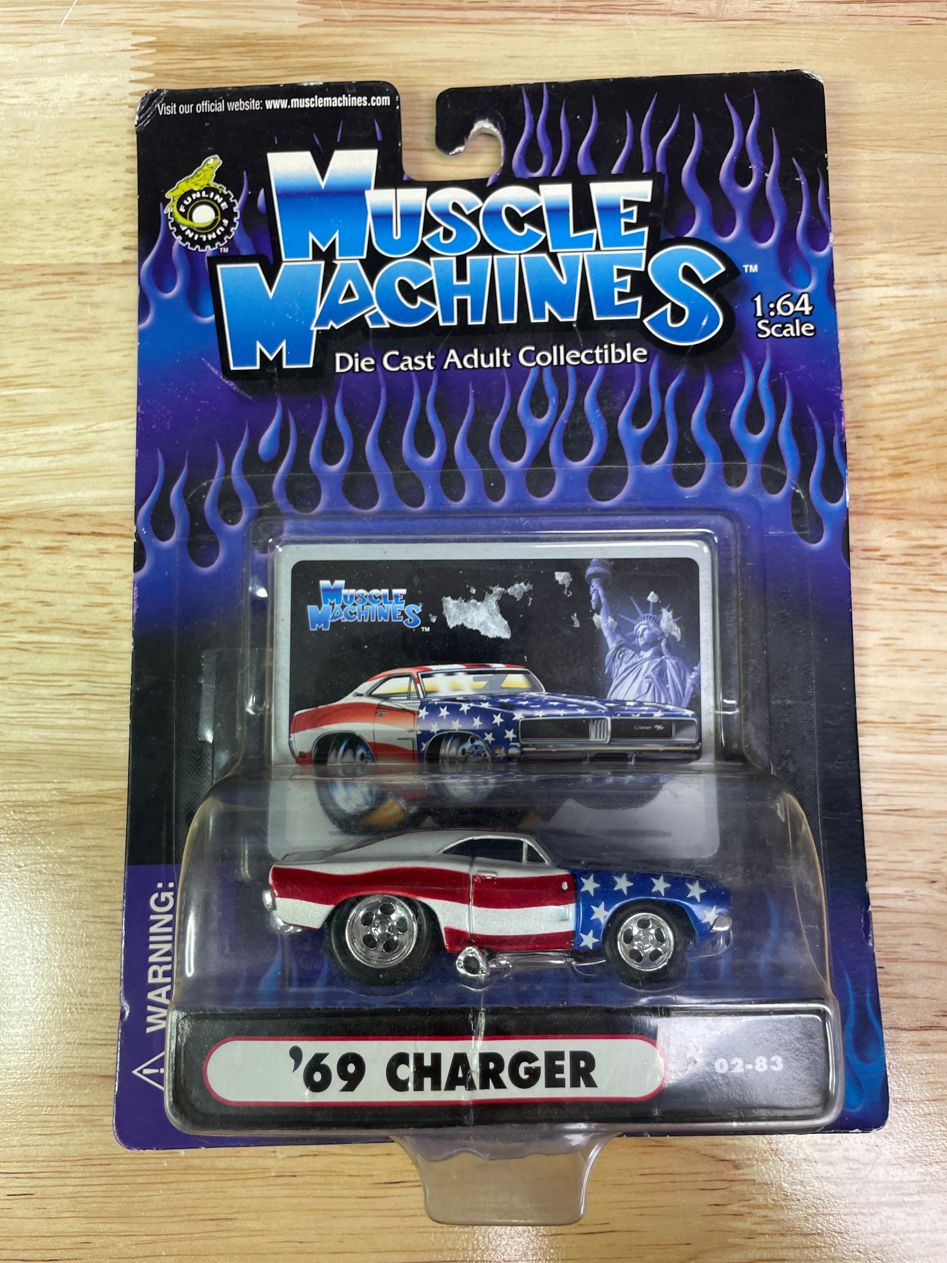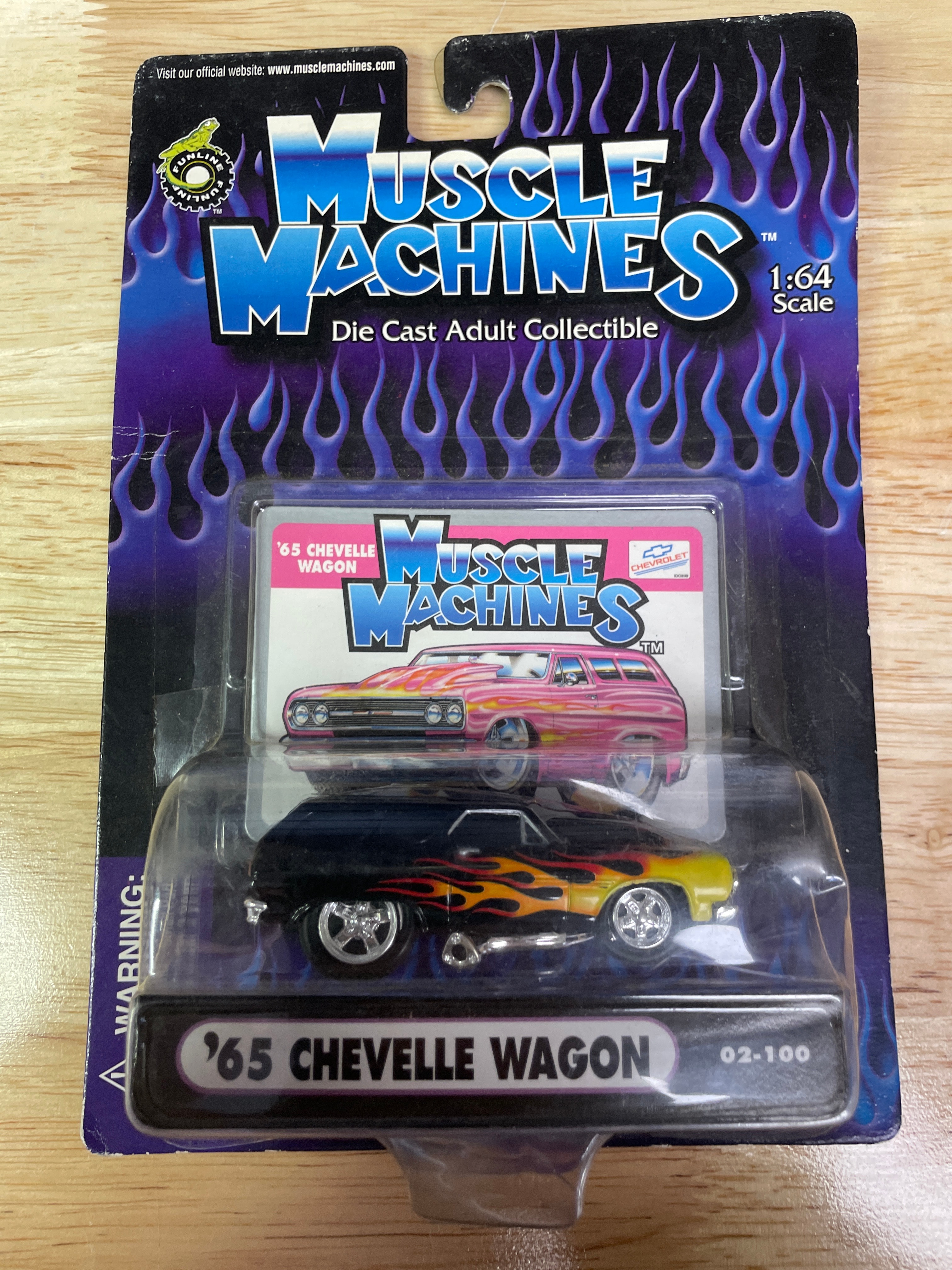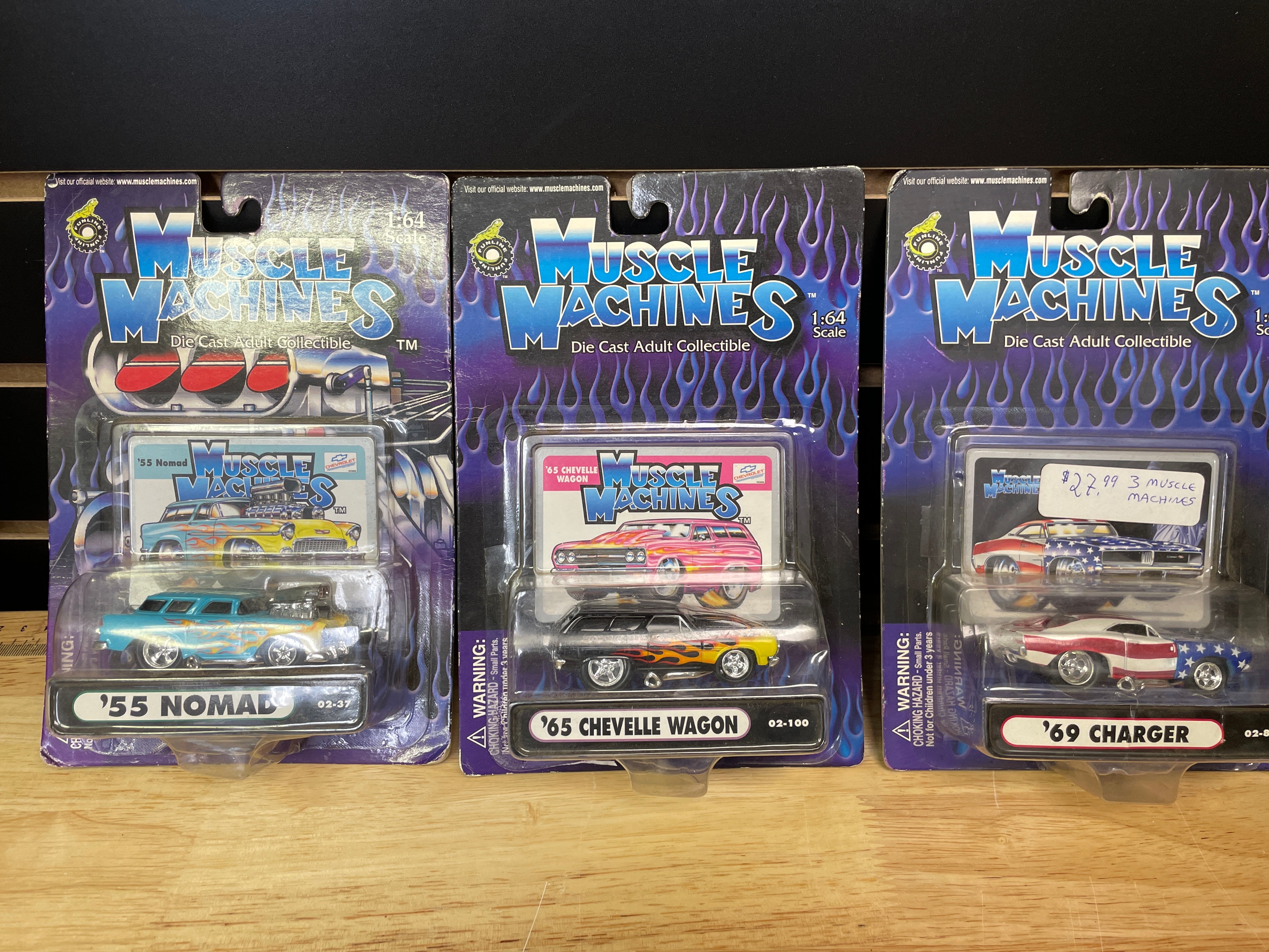 Three Muscle Machines 1:64 scale die-cast adult collectible cars, produced by Funline Merchandise Co., Inc. in 2002. Each car is new and unopened in its original blister packaging, featuring stylized flames and “Muscle Machines” branding. The individual vehicles include a light blue and yellow ’55 NOMAD (item 02-37), a black and yellow ’65 CHEVELLE WAGON (item 02-100), and a red, white, and blue American flag-themed ’69 CHARGER (item 02-83). The ’65 CHEVELLE WAGON model is notably associated with the ‘Grocery Getters’ sub-series in collector circles. A retail sticker on the ’69 CHARGER packaging indicates “$22.99 3 muscle machines.”