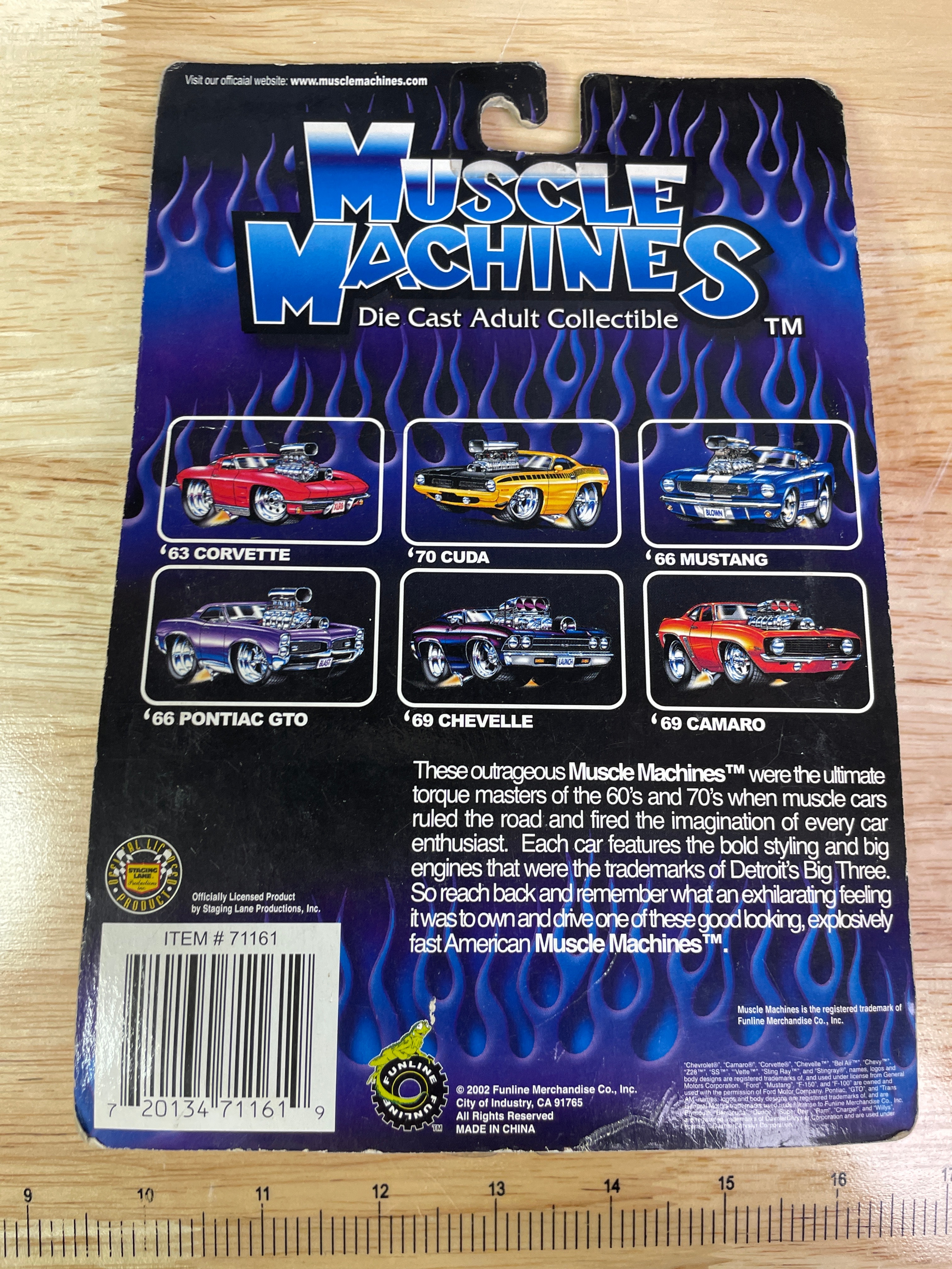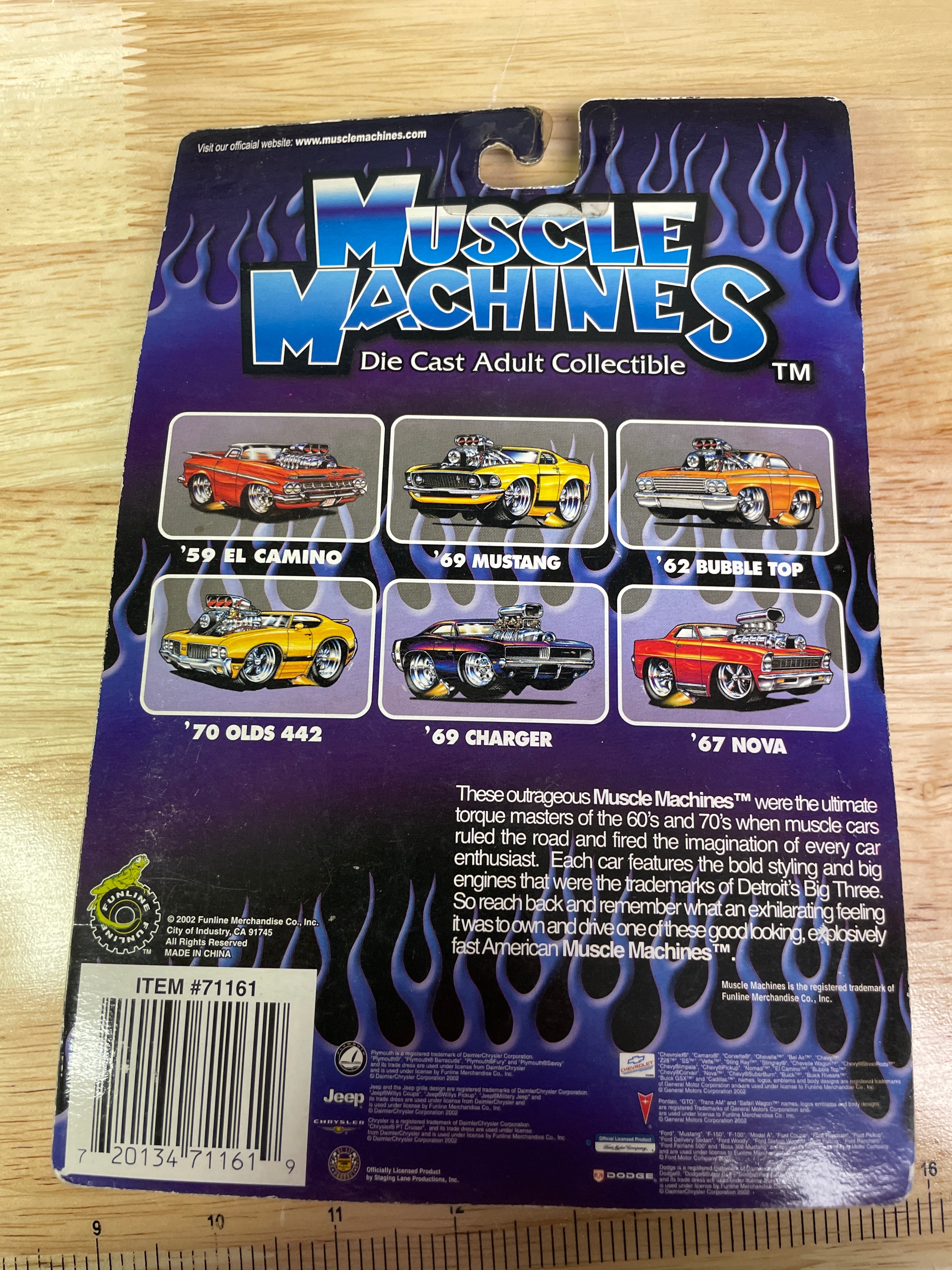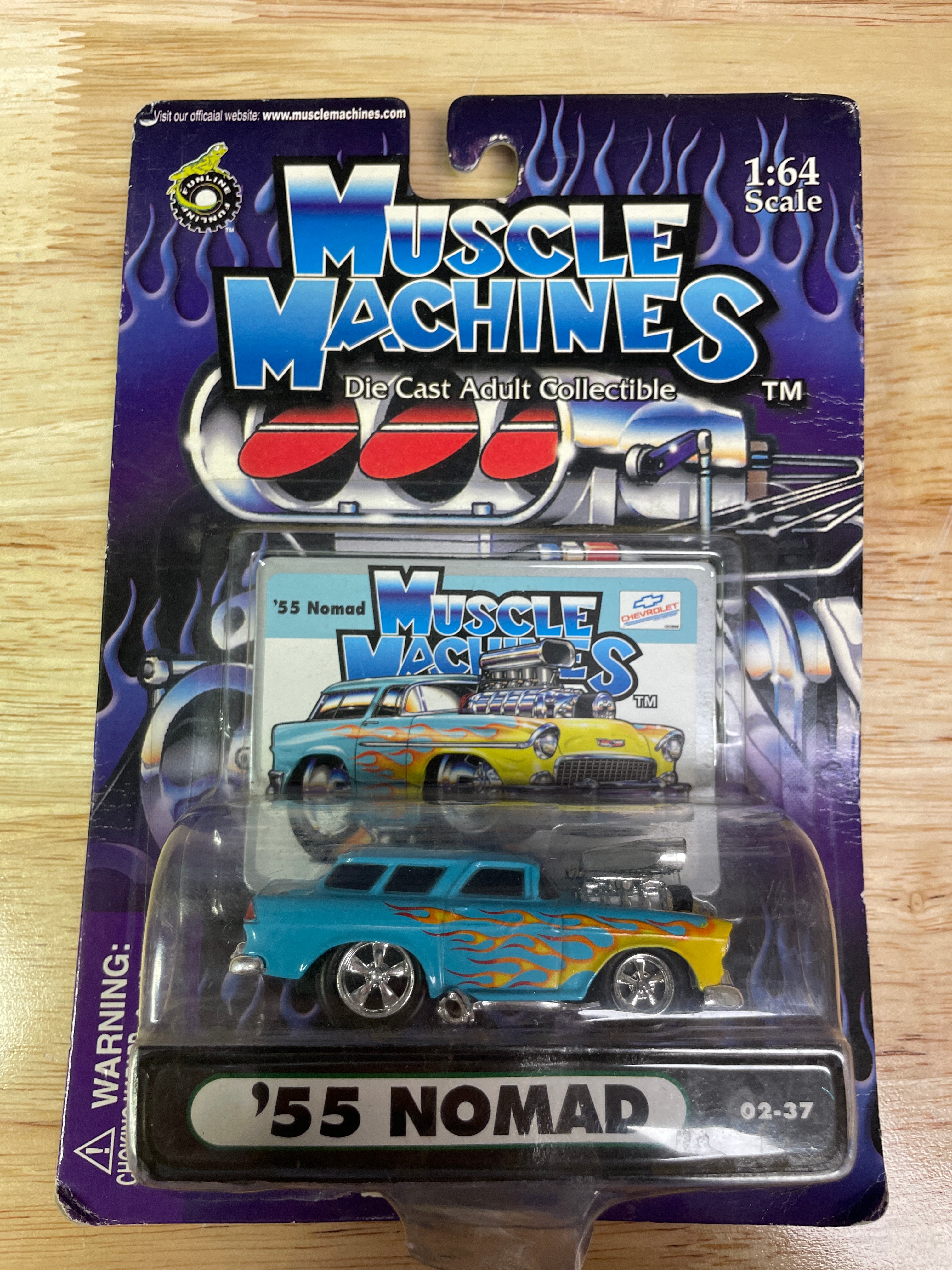 Three Muscle Machines 1:64 scale die-cast adult collectible cars, produced by Funline Merchandise Co., Inc. in 2002. Each car is new and unopened in its original blister packaging, featuring stylized flames and “Muscle Machines” branding. The individual vehicles include a light blue and yellow ’55 NOMAD (item 02-37), a black and yellow ’65 CHEVELLE WAGON (item 02-100), and a red, white, and blue American flag-themed ’69 CHARGER (item 02-83). The ’65 CHEVELLE WAGON model is notably associated with the ‘Grocery Getters’ sub-series in collector circles. A retail sticker on the ’69 CHARGER packaging indicates “$22.99 3 muscle machines.”
