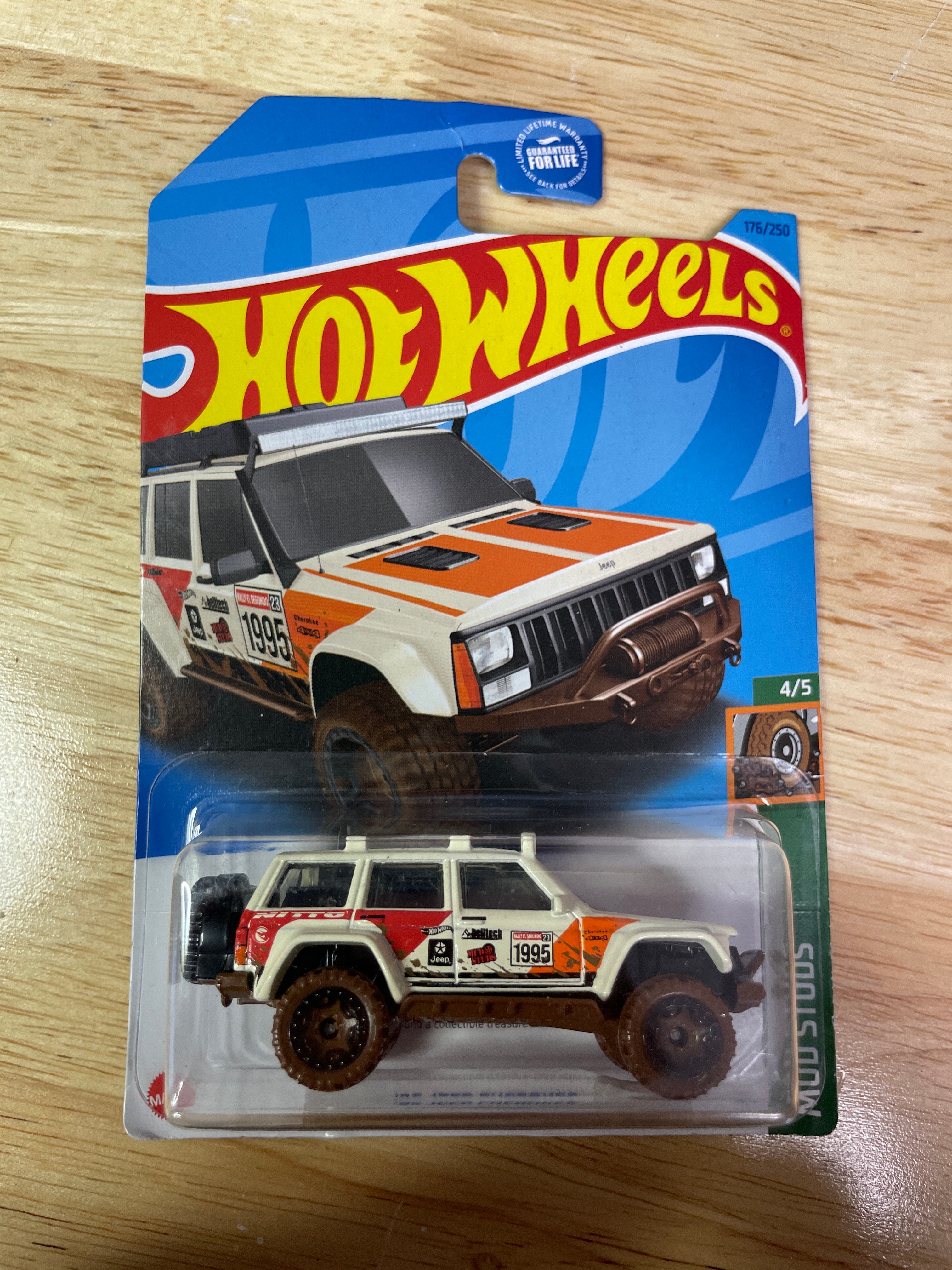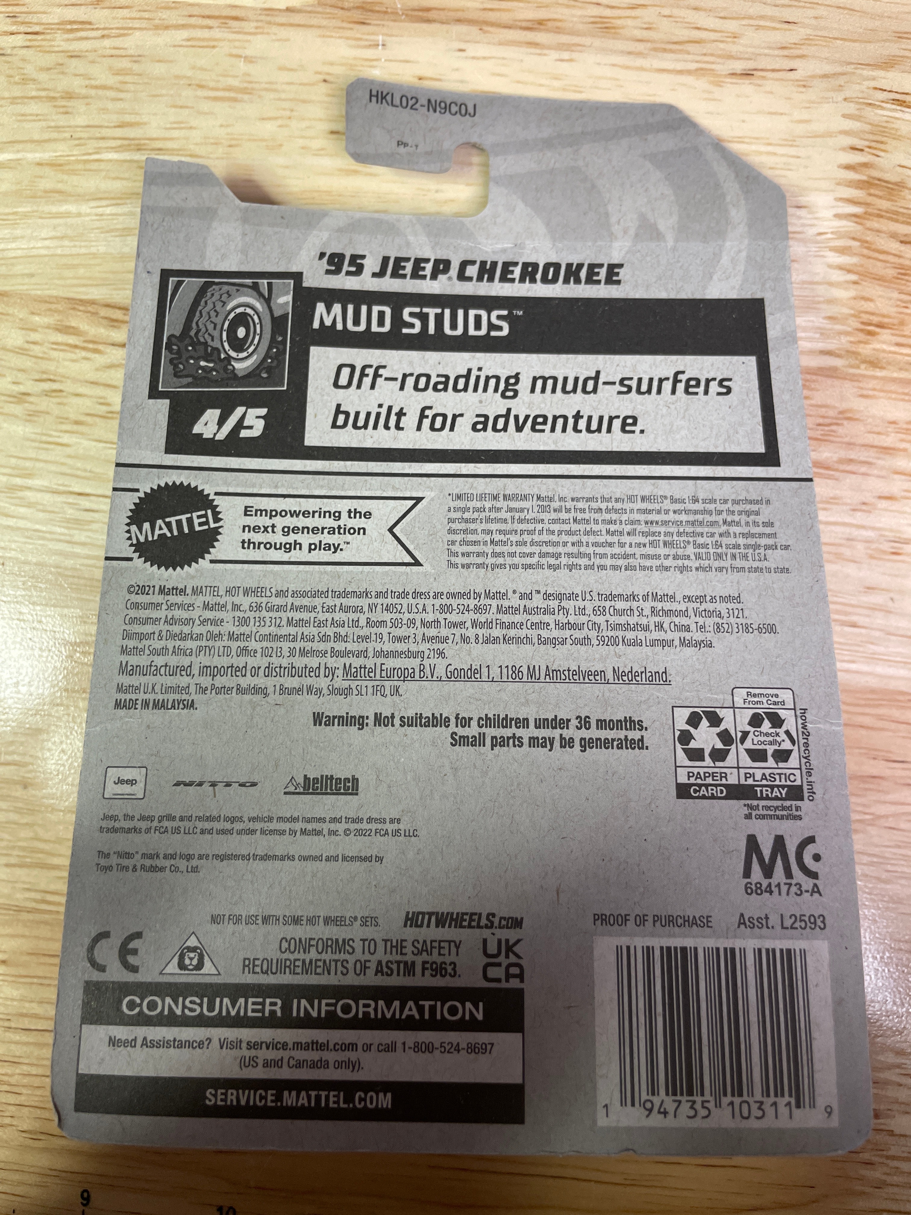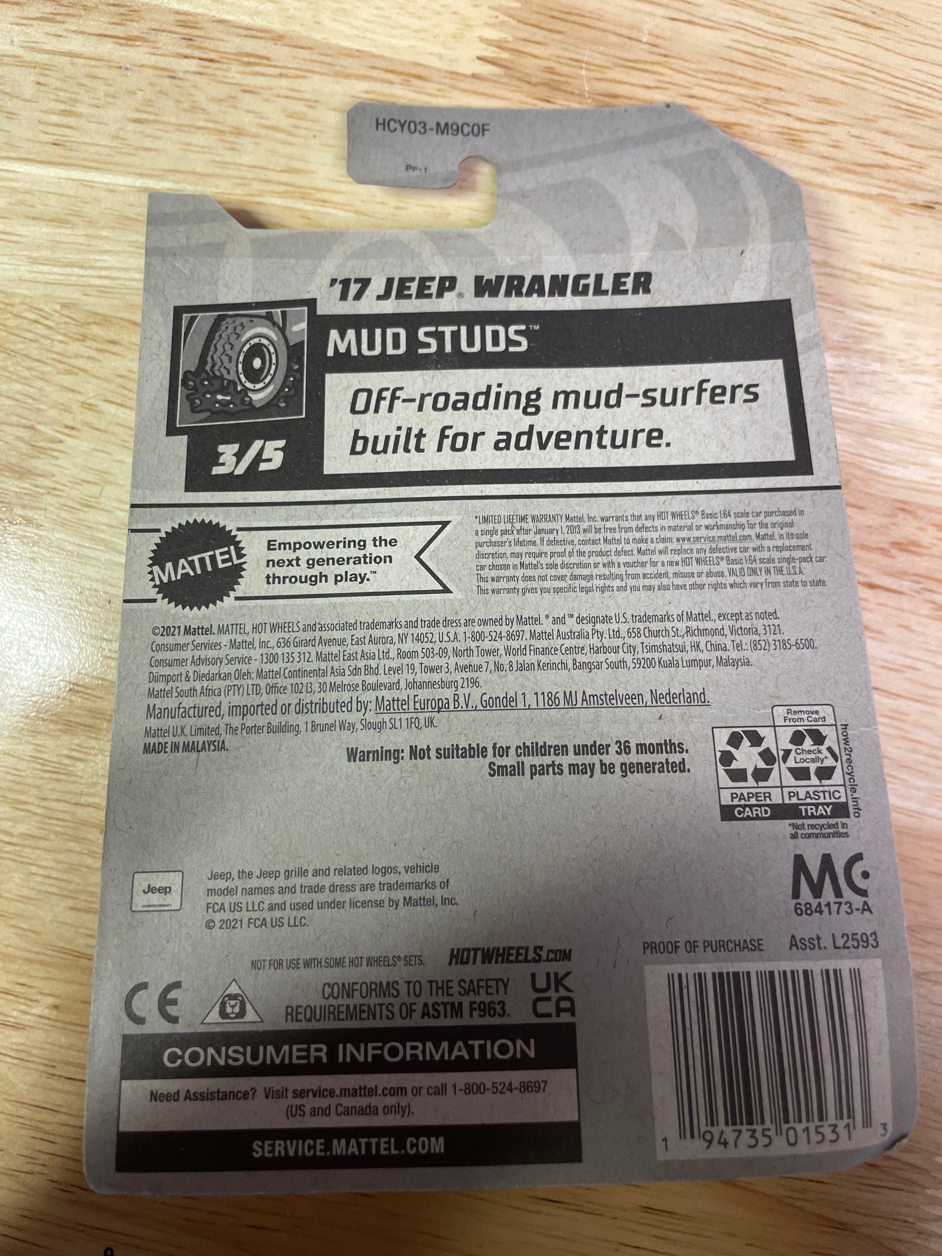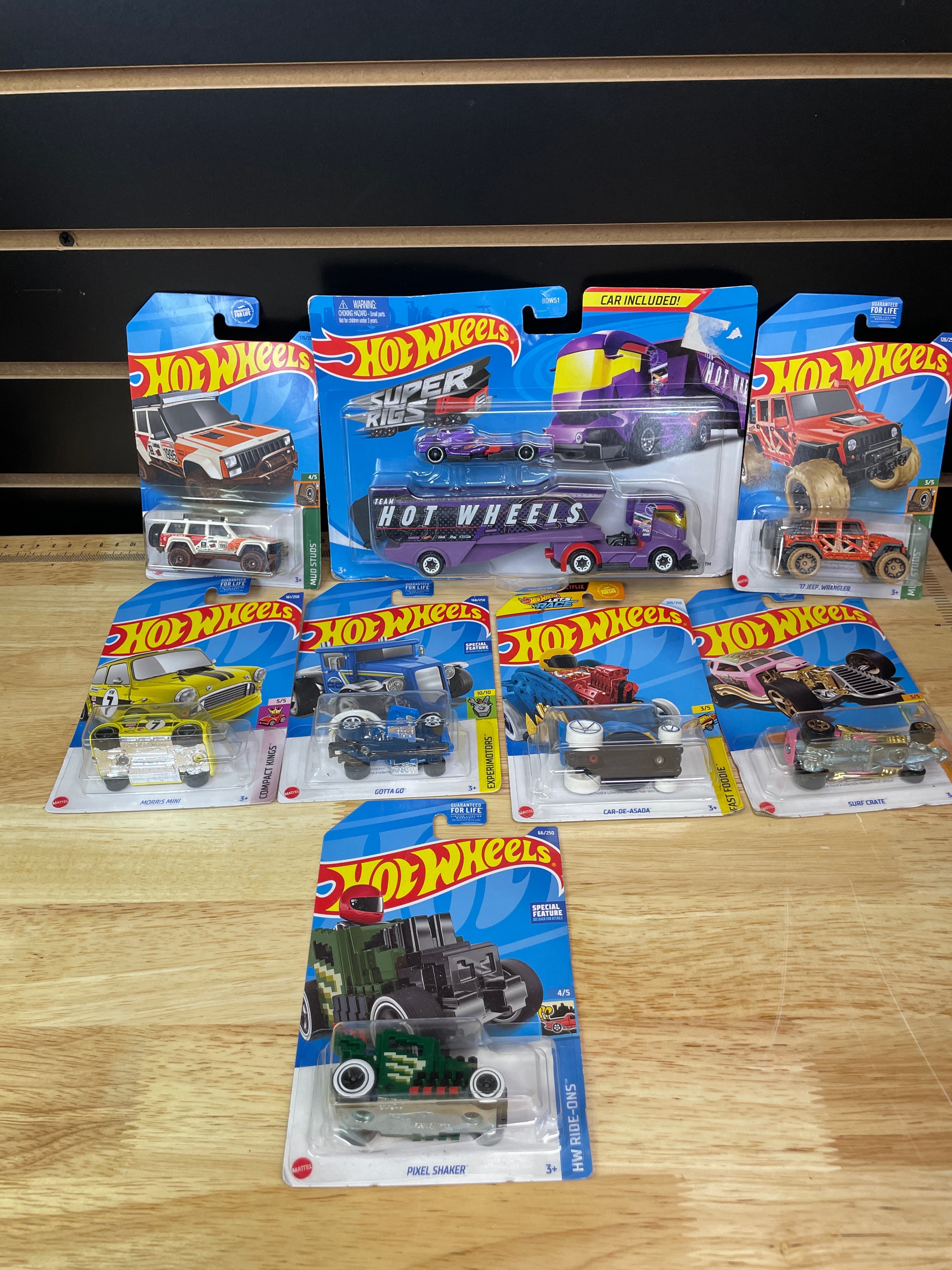 A collection comprising nine modern Hot Wheels die-cast toy vehicles and one Hot Wheels “Super Rigs” truck and trailer set, all produced by Mattel. Each item is presented in its original, factory-sealed blister packaging. The vehicles and set consist of die-cast metal and plastic components. Visible branding includes “Hot Wheels” and “Mattel, ” alongside various series names such as “Mud Studs, ” “Compact Kings, ” “Experimotors, ” “Fast Foodie, ” and “HW Ride-Ons.” Specific model names identified include “Pixel Shaker, ” “Surf Crate, ” “Morris Mini, ” “’95 Jeep Cherokee, ” “’17 Jeep Wrangler, ” “Big Rig Heat, ” “Car-De-Asada, ” and “Gotta Go.” Packaging details include production numbers (e.g., “66/250,” “161/250”) and series position (e.g., “3/5,” “4/5”). Additional text on the packaging notes “Guaranteed For Life, ” “Special Feature, ” and “Car Included!” on the Super Rigs set, with one card also stating “Available on Netflix.” Manufacturing locations are indicated as “Made in Malaysia” or “Made in Thailand” for the Super Rigs set. All items carry a “3+” age rating and a warning regarding small parts.