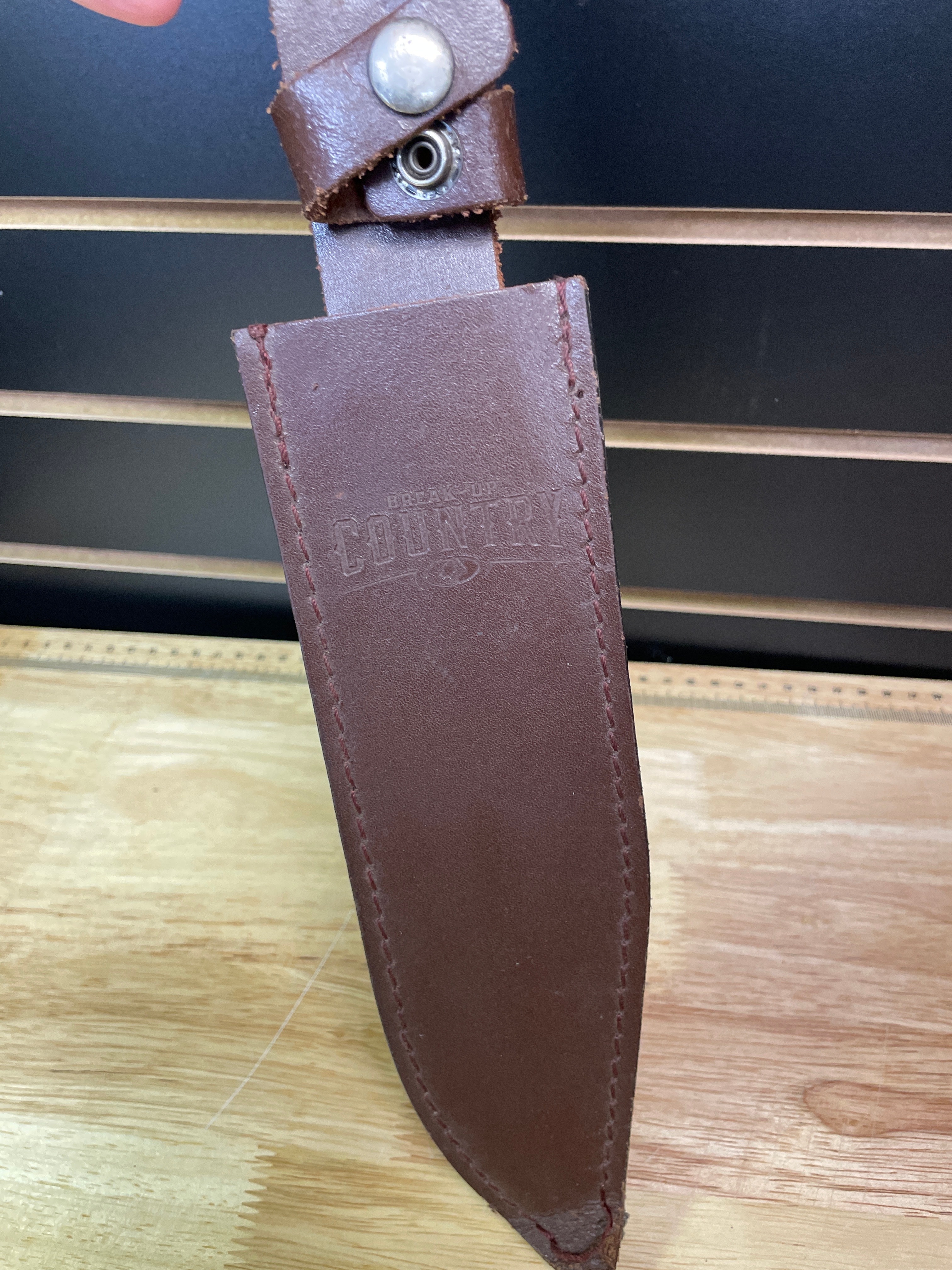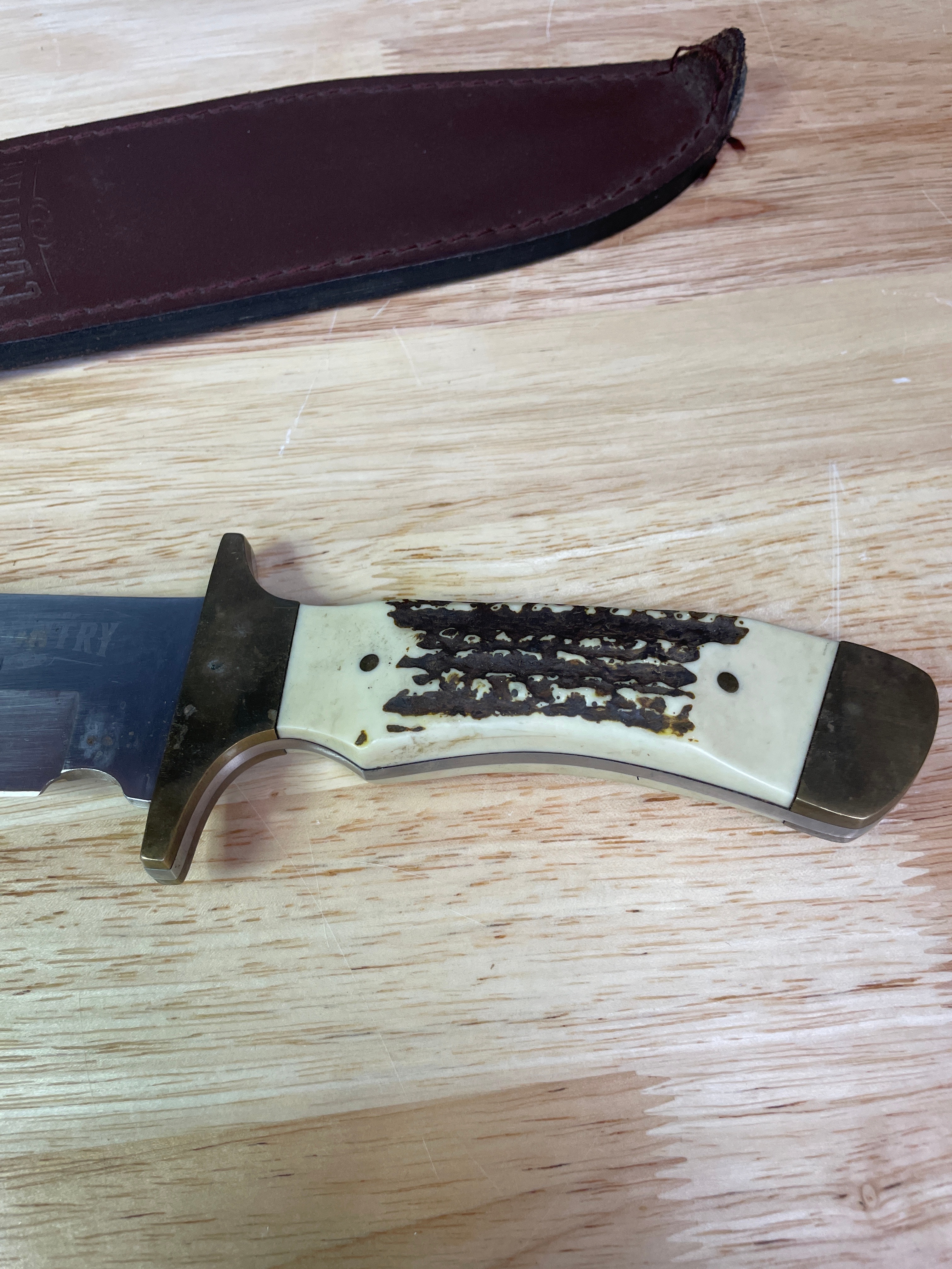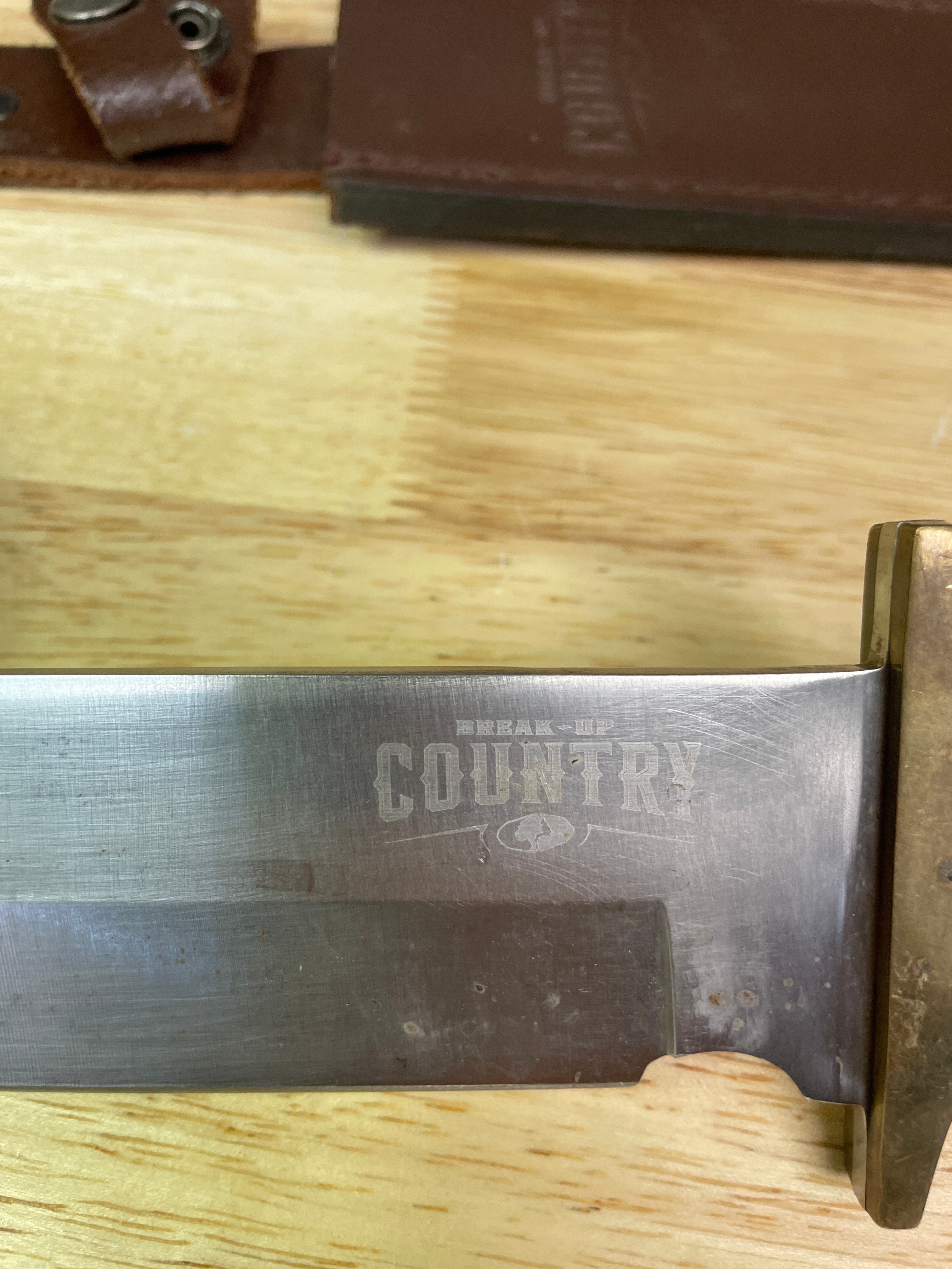 A Mossy Oak ‘Break Up Country’ Bowie Knife with Sheath. This modern fixed-blade hunting knife features a clip-point stainless steel blade with a satin finish. The handle is constructed with off-white synthetic scales designed to mimic stag antler, displaying textured brown areas and secured by two pins. It is flanked by brass-tone metal finger guard and pommel elements. The blade is etched with the text "BREAK-UP COUNTRY" directly above a logo resembling the Mossy Oak brand’s tree/leaf silhouette. The knife is housed in a dark brown leather or leatherette sheath, constructed with visible stitching, a belt loop, and two snap-button straps for retention, also embossed with "BREAK-UP COUNTRY."
