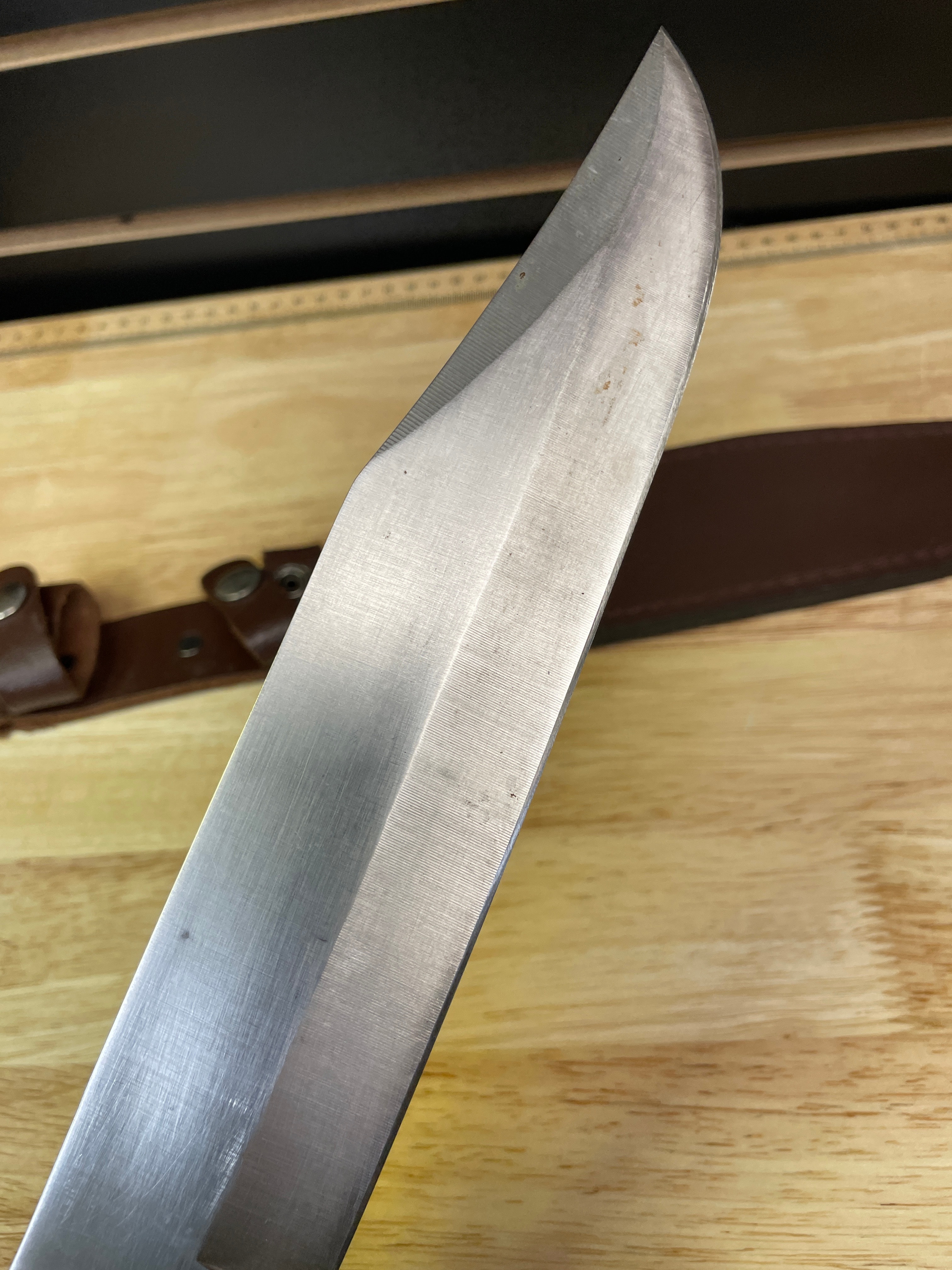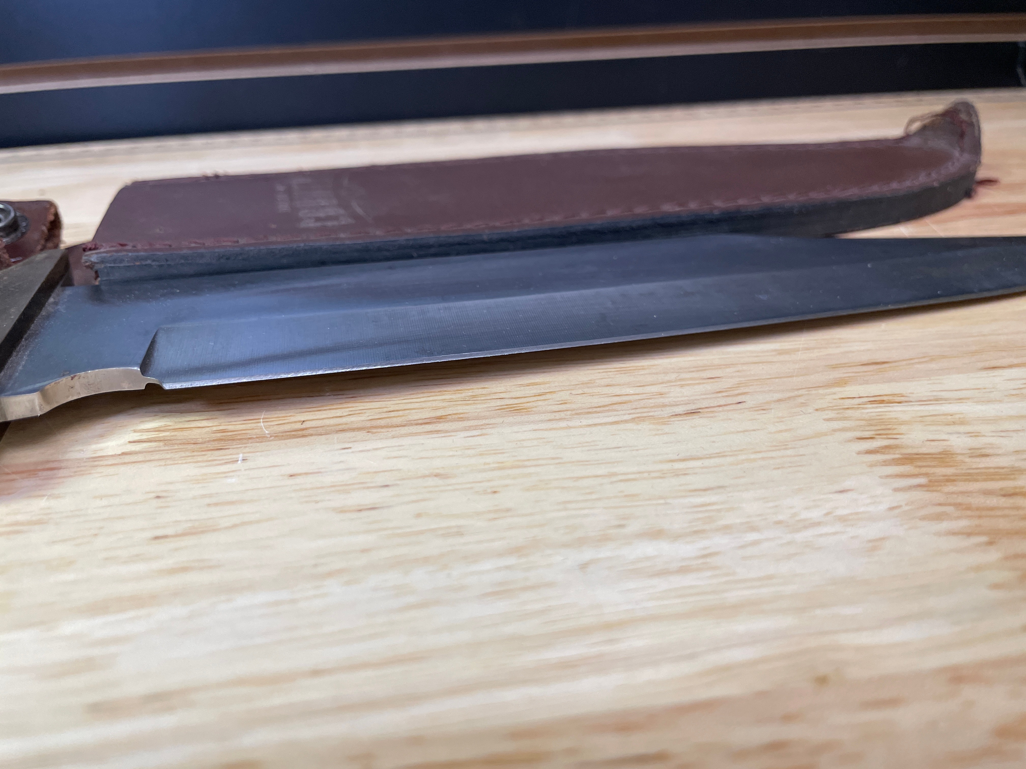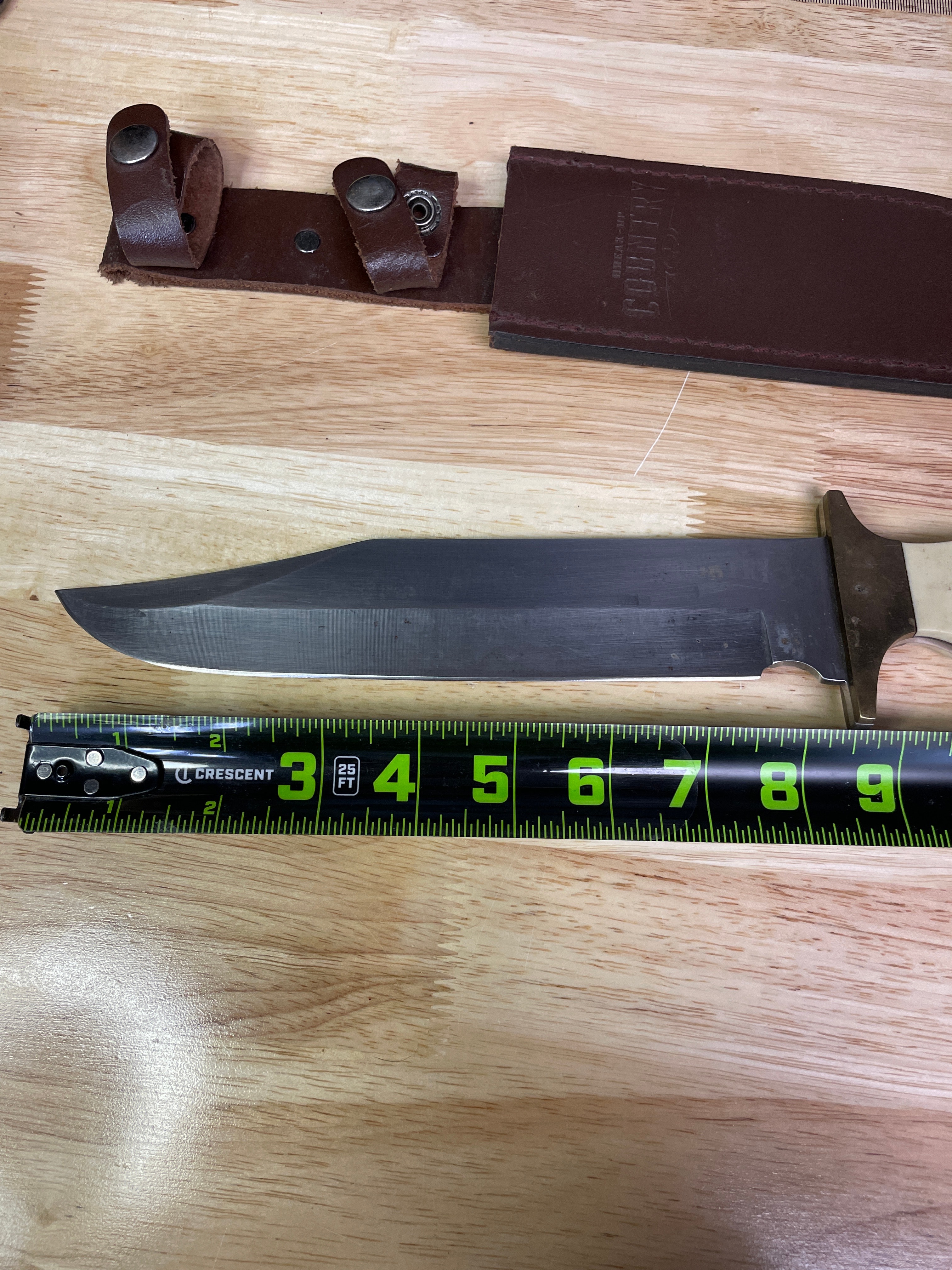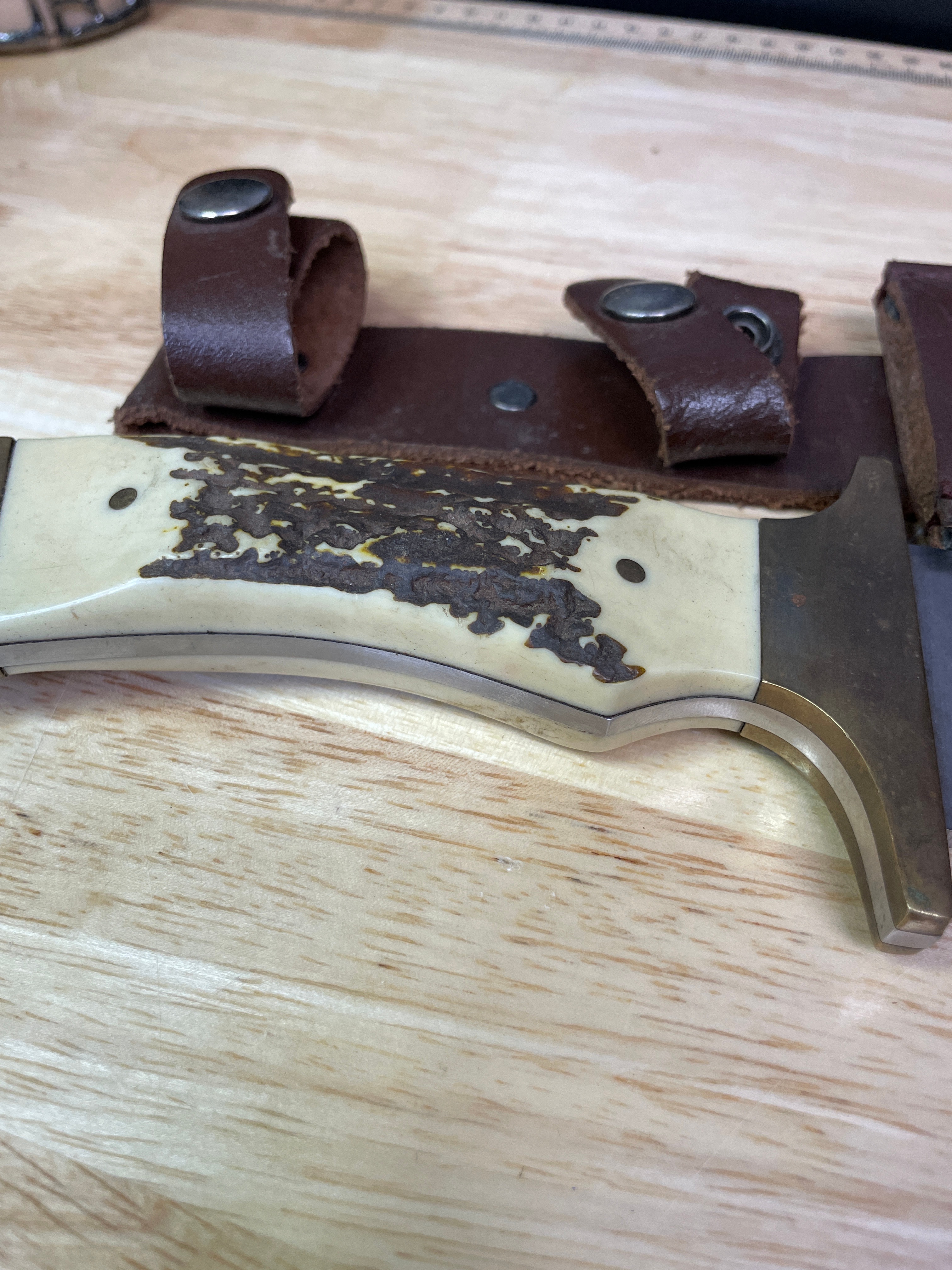 A Mossy Oak ‘Break Up Country’ Bowie Knife with Sheath. This modern fixed-blade hunting knife features a clip-point stainless steel blade with a satin finish. The handle is constructed with off-white synthetic scales designed to mimic stag antler, displaying textured brown areas and secured by two pins. It is flanked by brass-tone metal finger guard and pommel elements. The blade is etched with the text "BREAK-UP COUNTRY" directly above a logo resembling the Mossy Oak brand’s tree/leaf silhouette. The knife is housed in a dark brown leather or leatherette sheath, constructed with visible stitching, a belt loop, and two snap-button straps for retention, also embossed with "BREAK-UP COUNTRY."