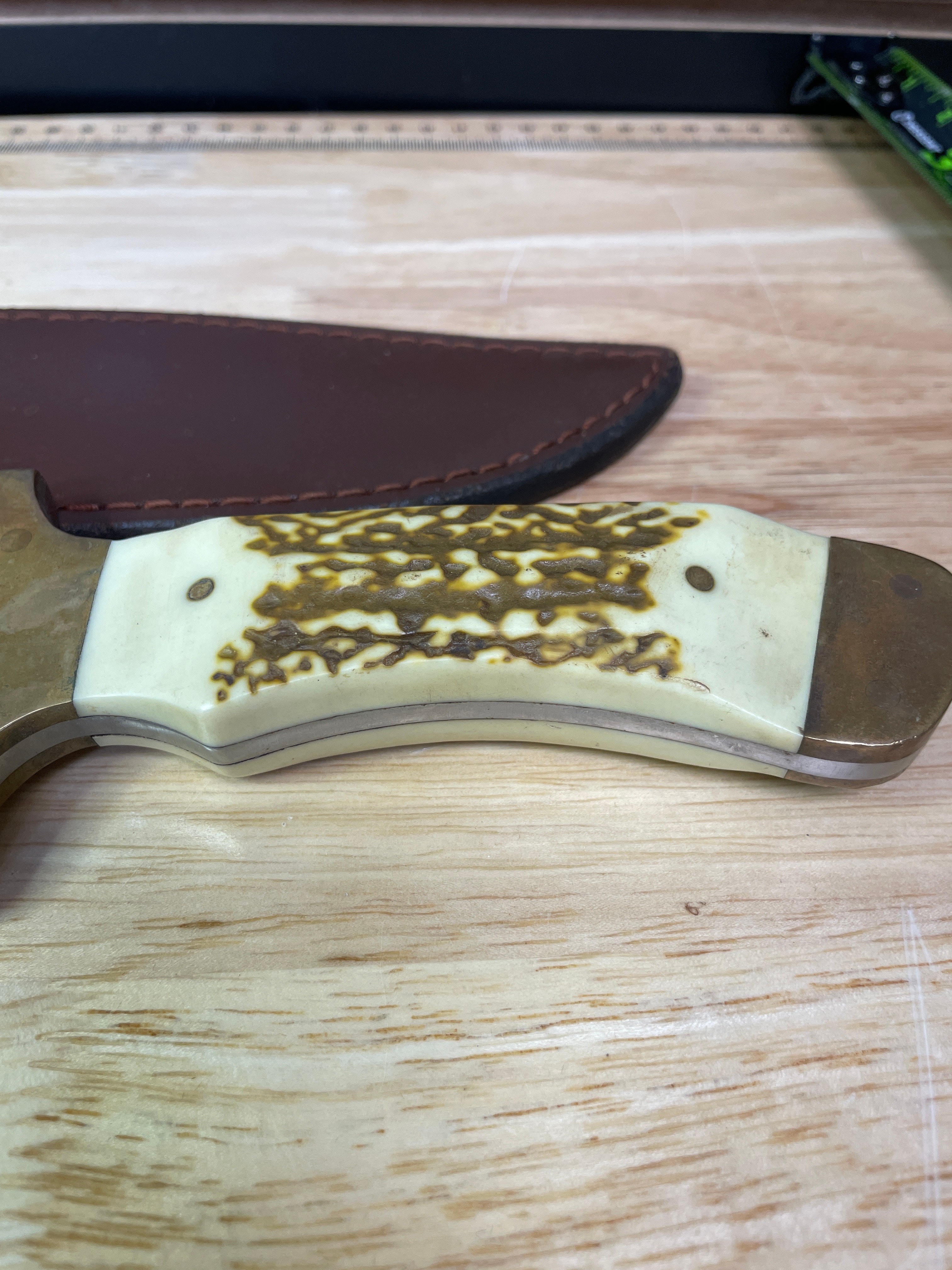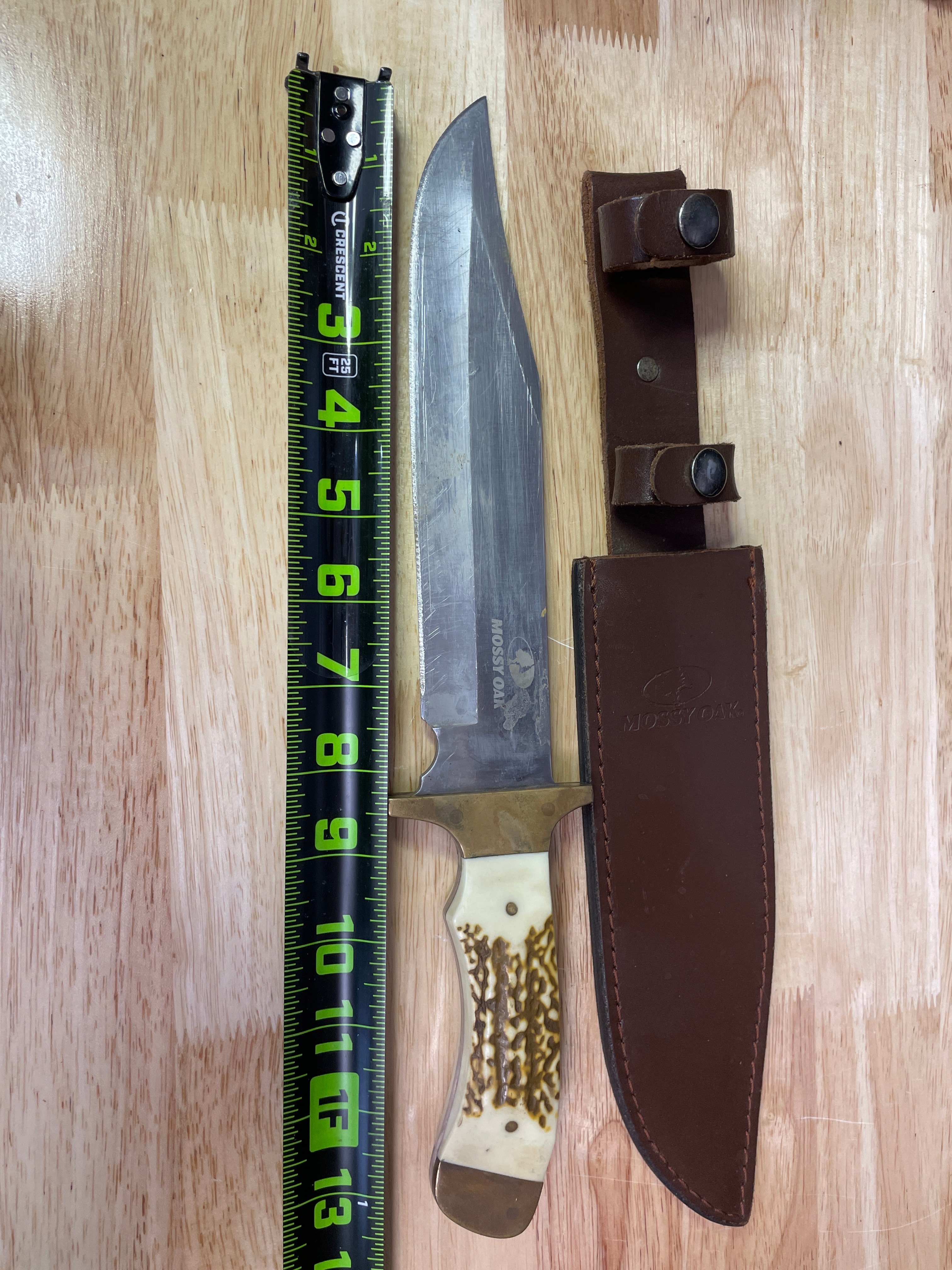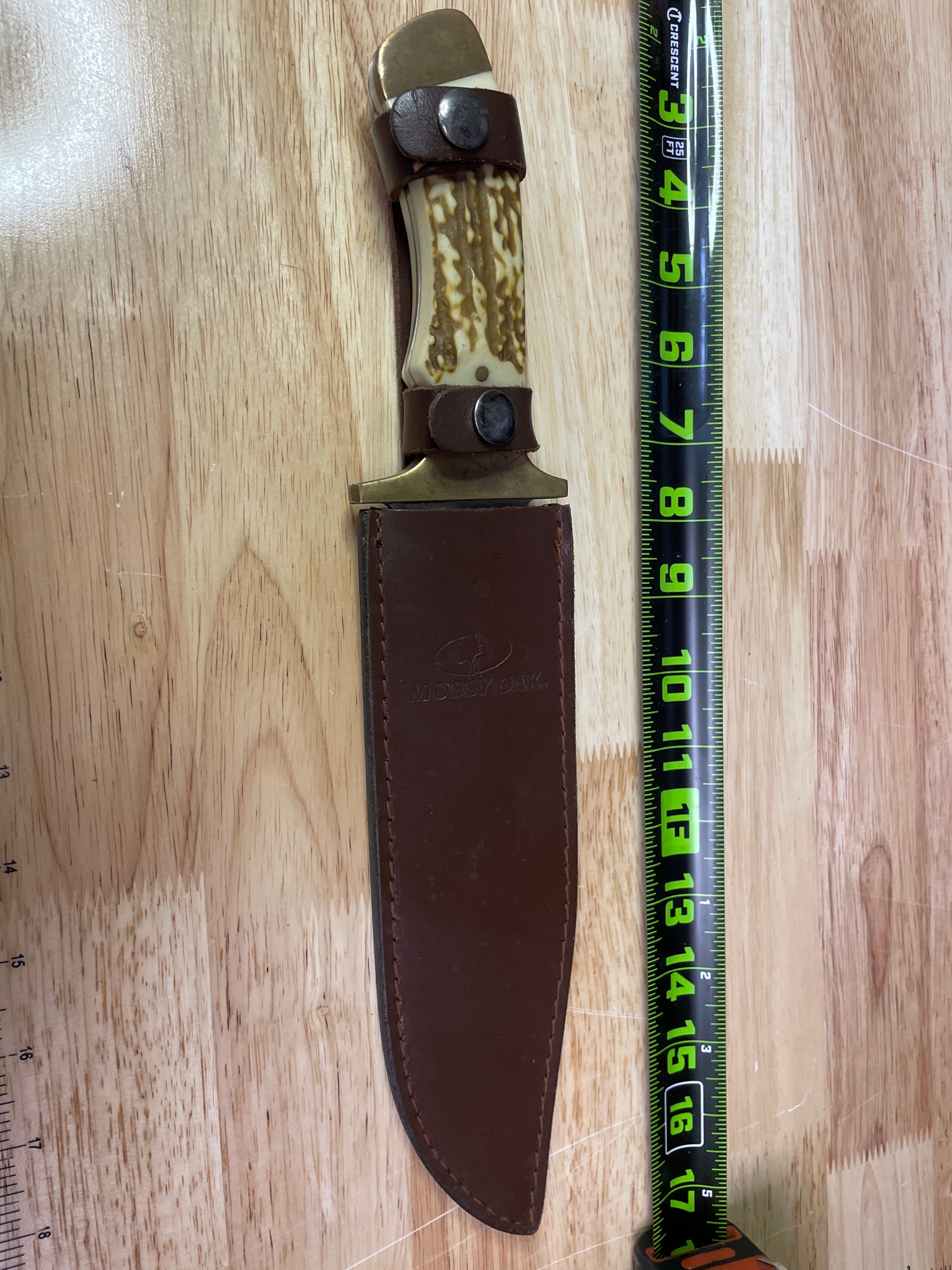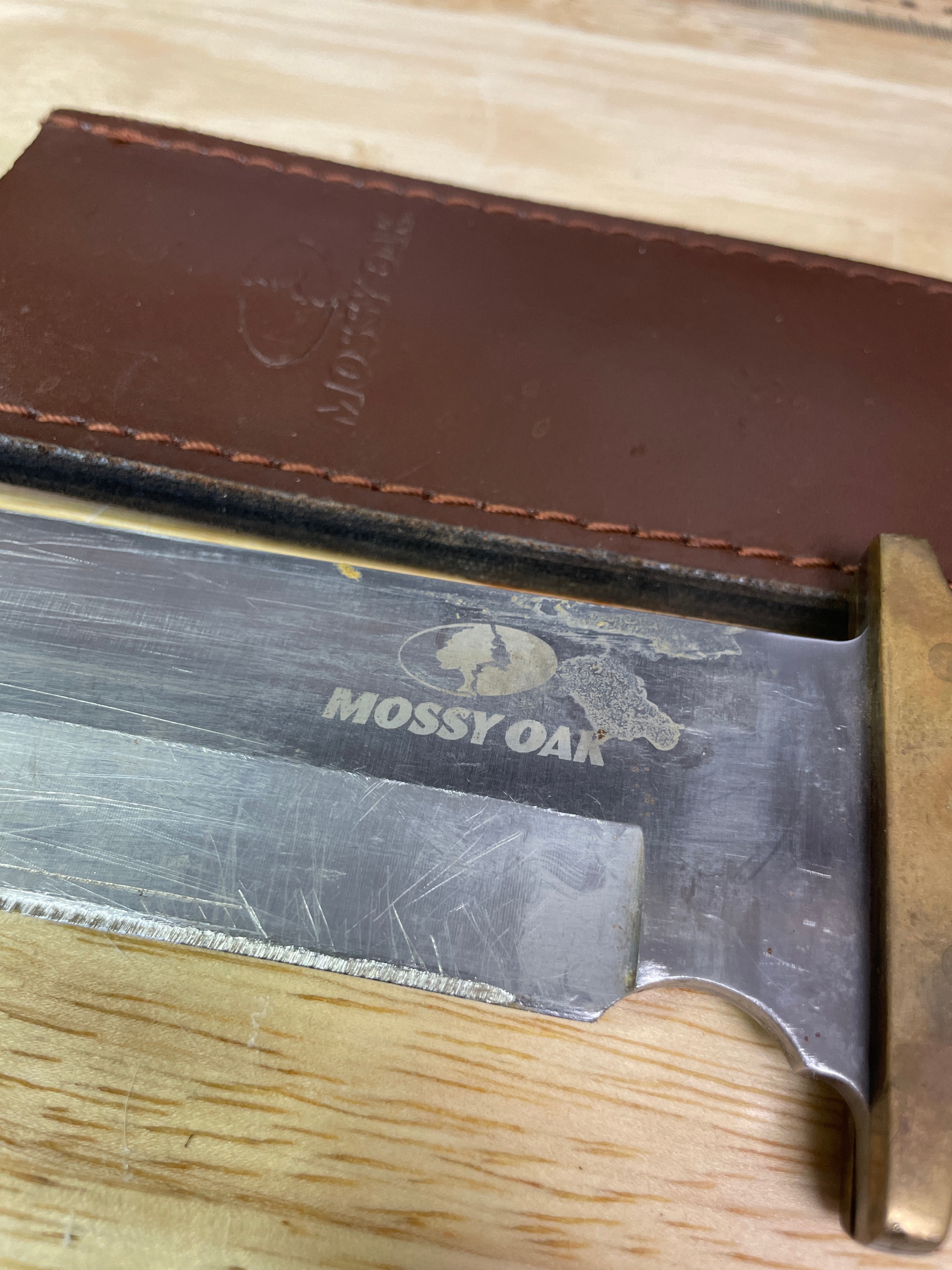 A Mossy Oak Bowie Knife, featuring a fixed-blade design. The knife has a polished metal blade, likely stainless steel, marked with the "MOSSY OAK" brand name and associated tree logo. It is fitted with a substantial brass finger guard and pommel. The handle is composed of two cream-colored scales with textured, organic-brown patterning, possibly stag antler or a synthetic imitation, secured by visible pins. The knife is accompanied by a brown leather sheath, also marked with the "MOSSY OAK" brand and tree logo, featuring intact stitching and functional metal snap closures.