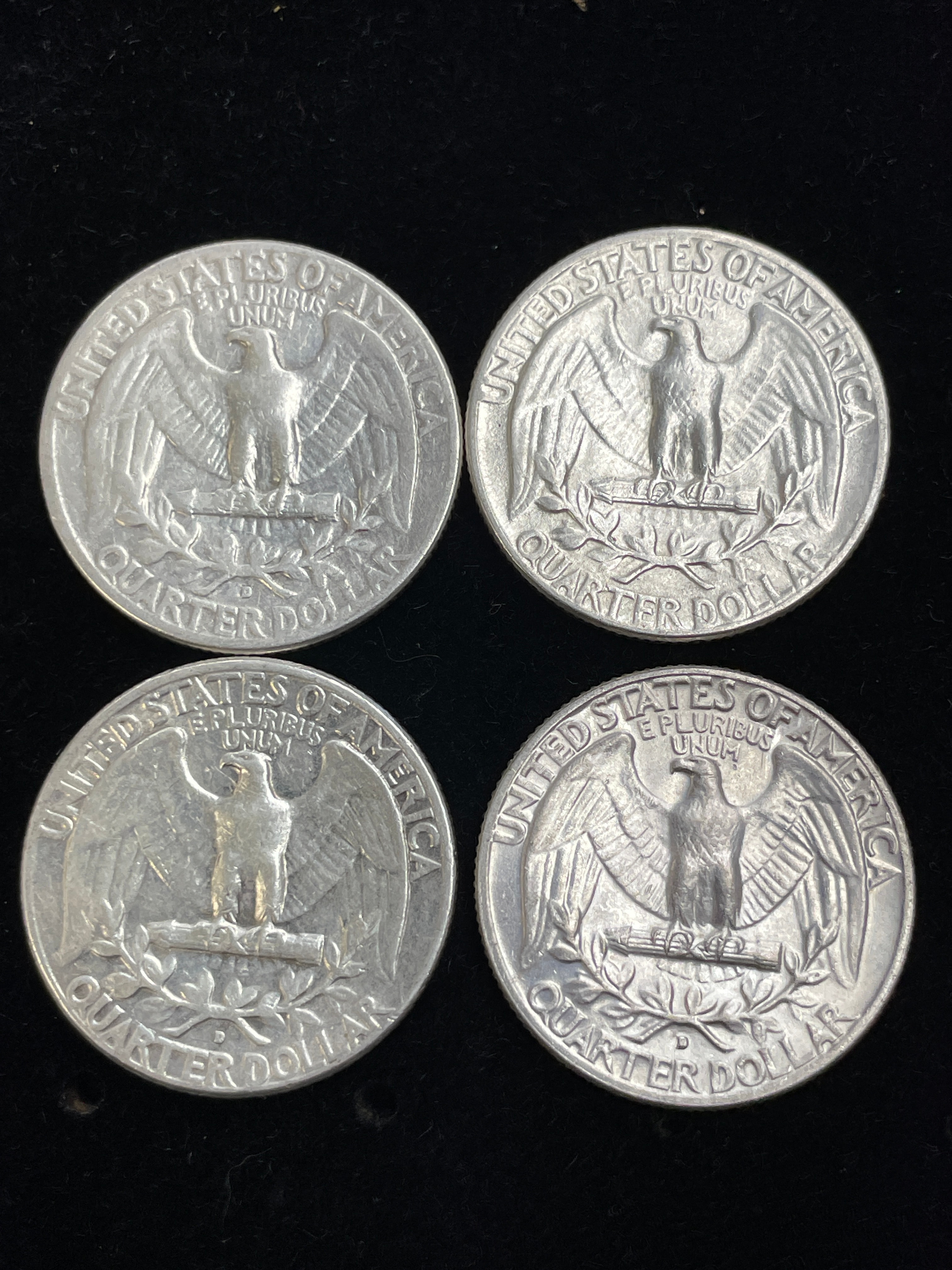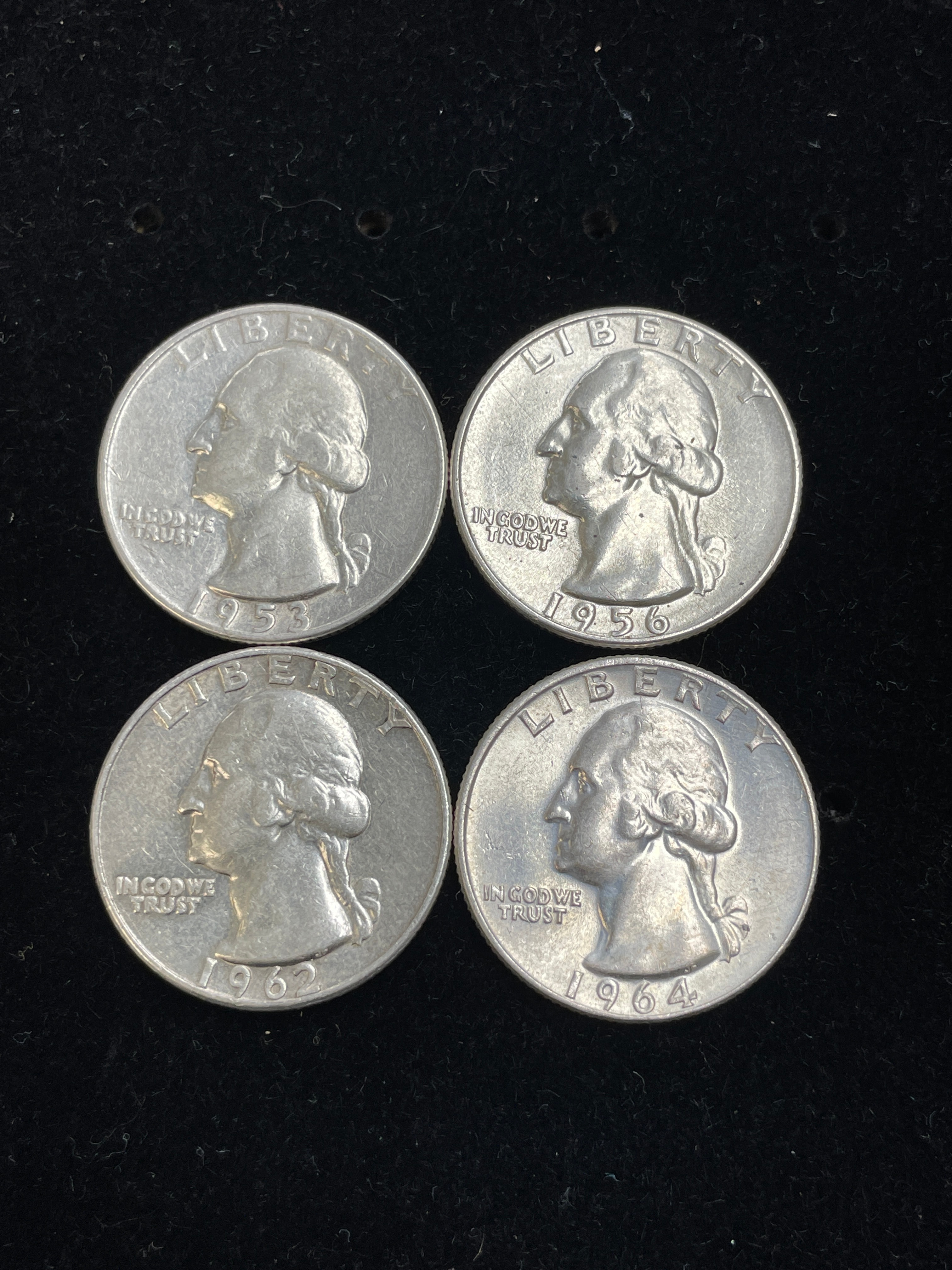 A group of four United States Washington Silver Quarters, comprising dates 1953, 1956, 1962, and 1964. Each coin features a left-facing profile bust of ‘LIBERTY’ with the inscription ‘IN GOD WE TRUST’ on the obverse. The reverse displays an eagle with outstretched wings perched on a bundle of arrows, flanked by olive branches, above the denomination ‘QUARTER DOLLAR’. Surrounding the central design are the inscriptions ‘UNITED STATES OF AMERICA’ and ‘E PLURIBUS UNUM’.