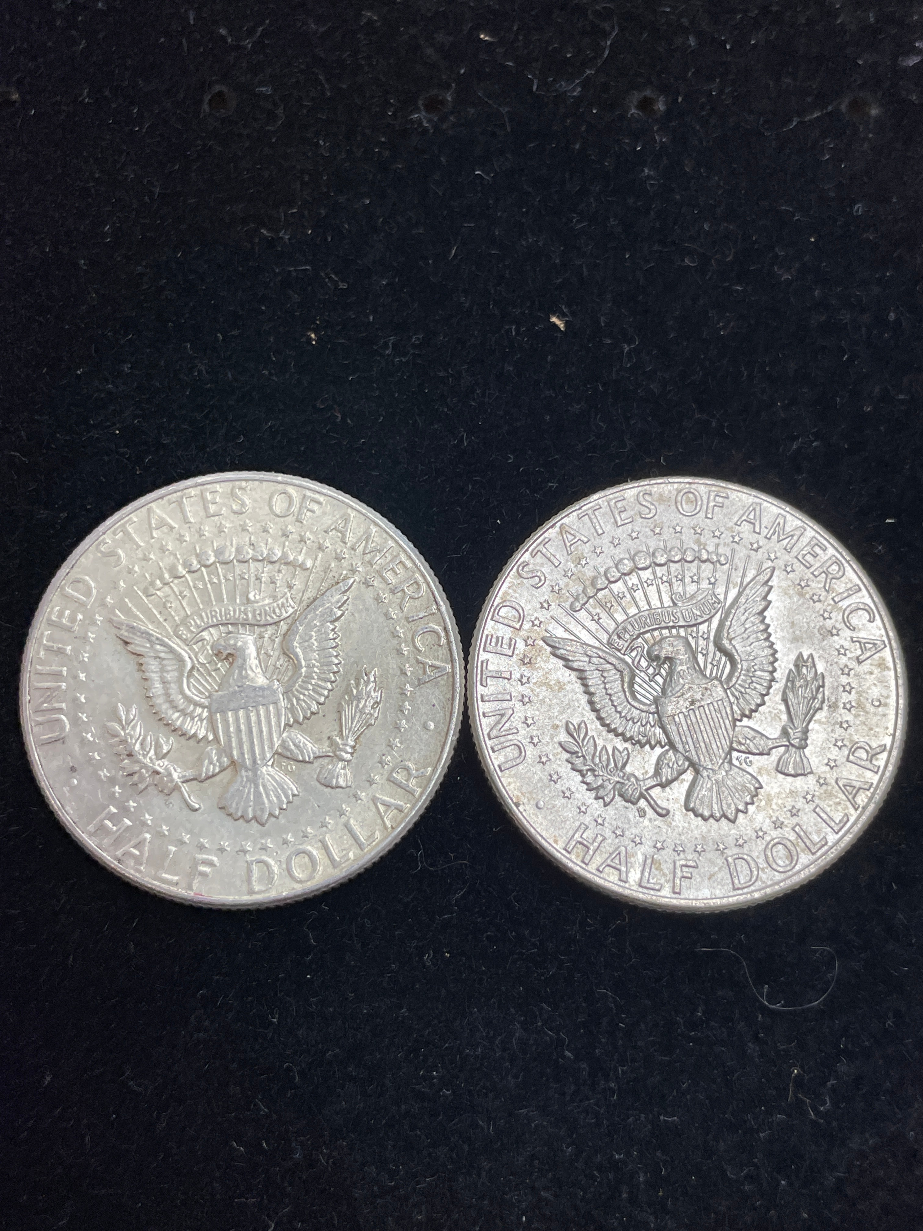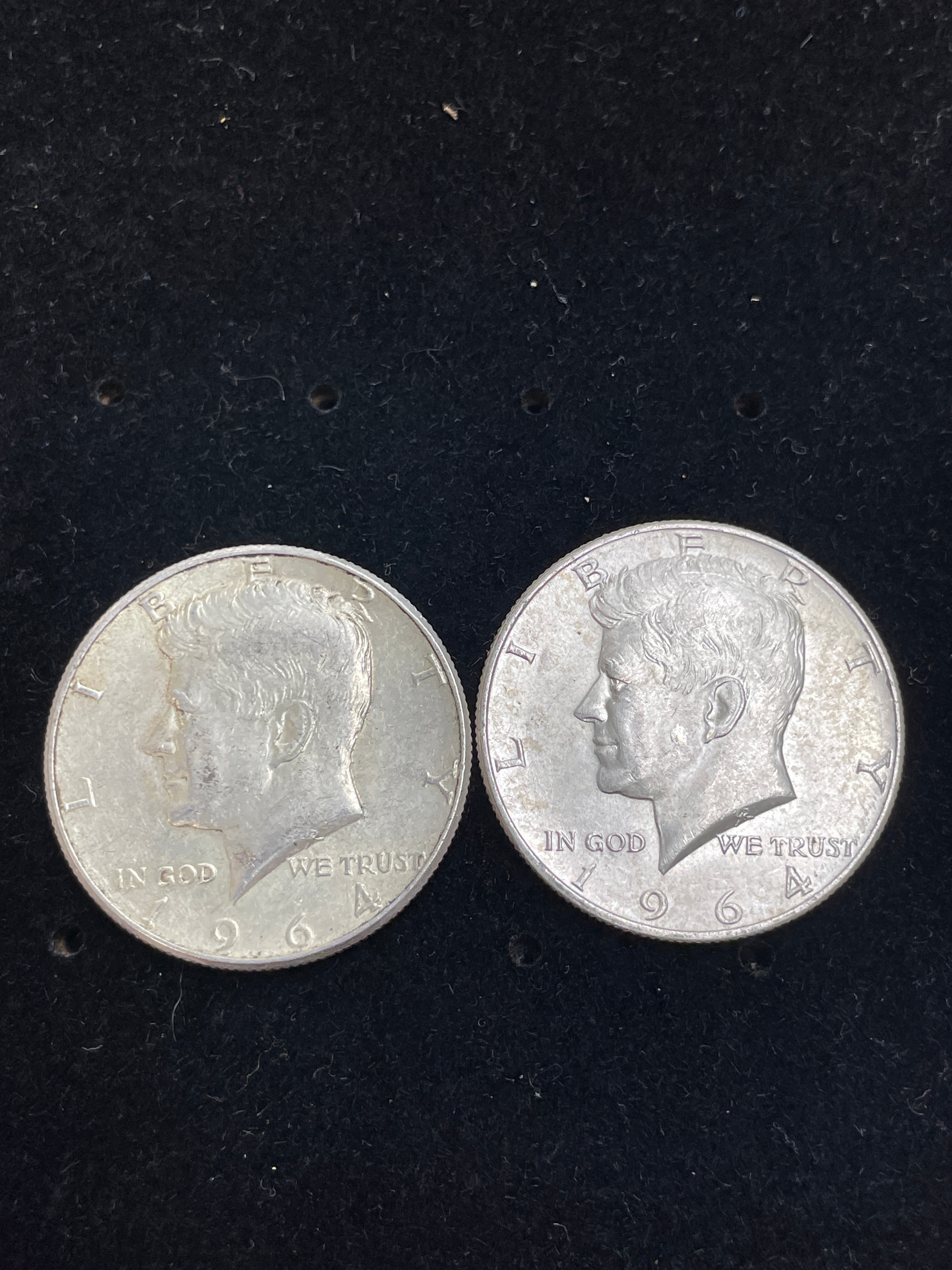 A pair of United States 1964 Kennedy Half Dollar coins, each composed of a silver-colored metal consistent with 90% silver issues from this period. The obverse of each coin features a left-facing profile bust of John F. Kennedy, inscribed with “LIBERTY” at the top, “IN GOD WE TRUST” below the bust, and the date “1964” at the bottom. The reverse of both coins displays a heraldic eagle holding an olive branch and arrows, encircled by the text “UNITED STATES OF AMERICA” at the top and “HALF DOLLAR” at the bottom.