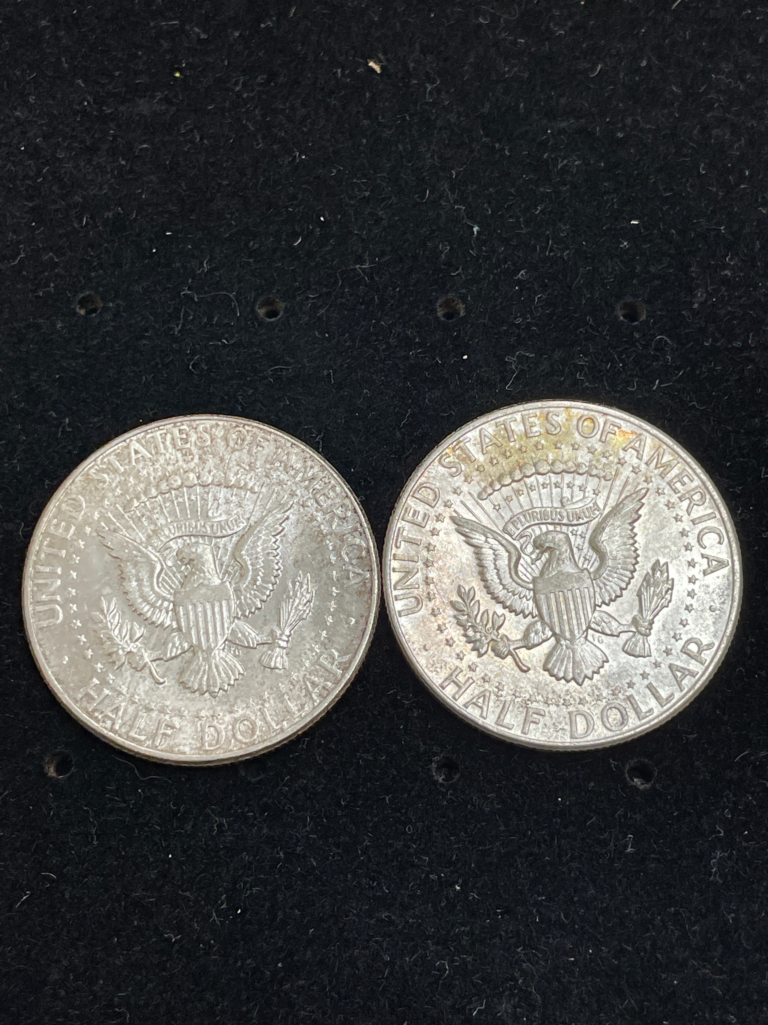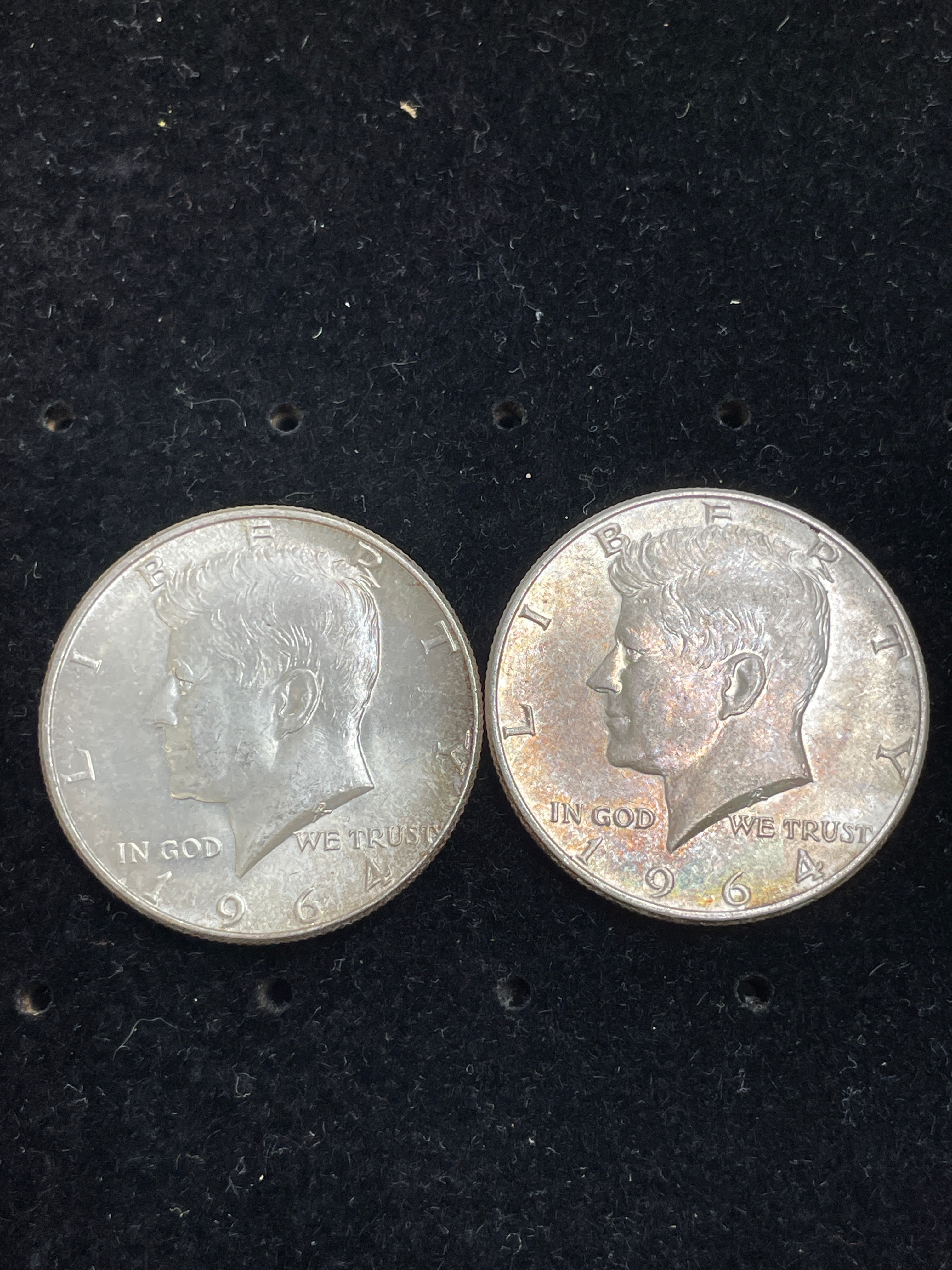 A pair of 1964 Silver United States Kennedy Half Dollars. Both coins feature the profile of John F. Kennedy on the obverse, inscribed with “LIBERTY, ” “IN GOD WE TRUST, ” and the date “1964.” The reverse of both coins depicts the Presidential Seal with an eagle, shield, olive branch, and arrows, encircled by “UNITED STATES OF AMERICA” and “HALF DOLLAR, ” with the Latin motto “E PLURIBUS UNUM” above the eagle. These coins are composed of 90% silver.