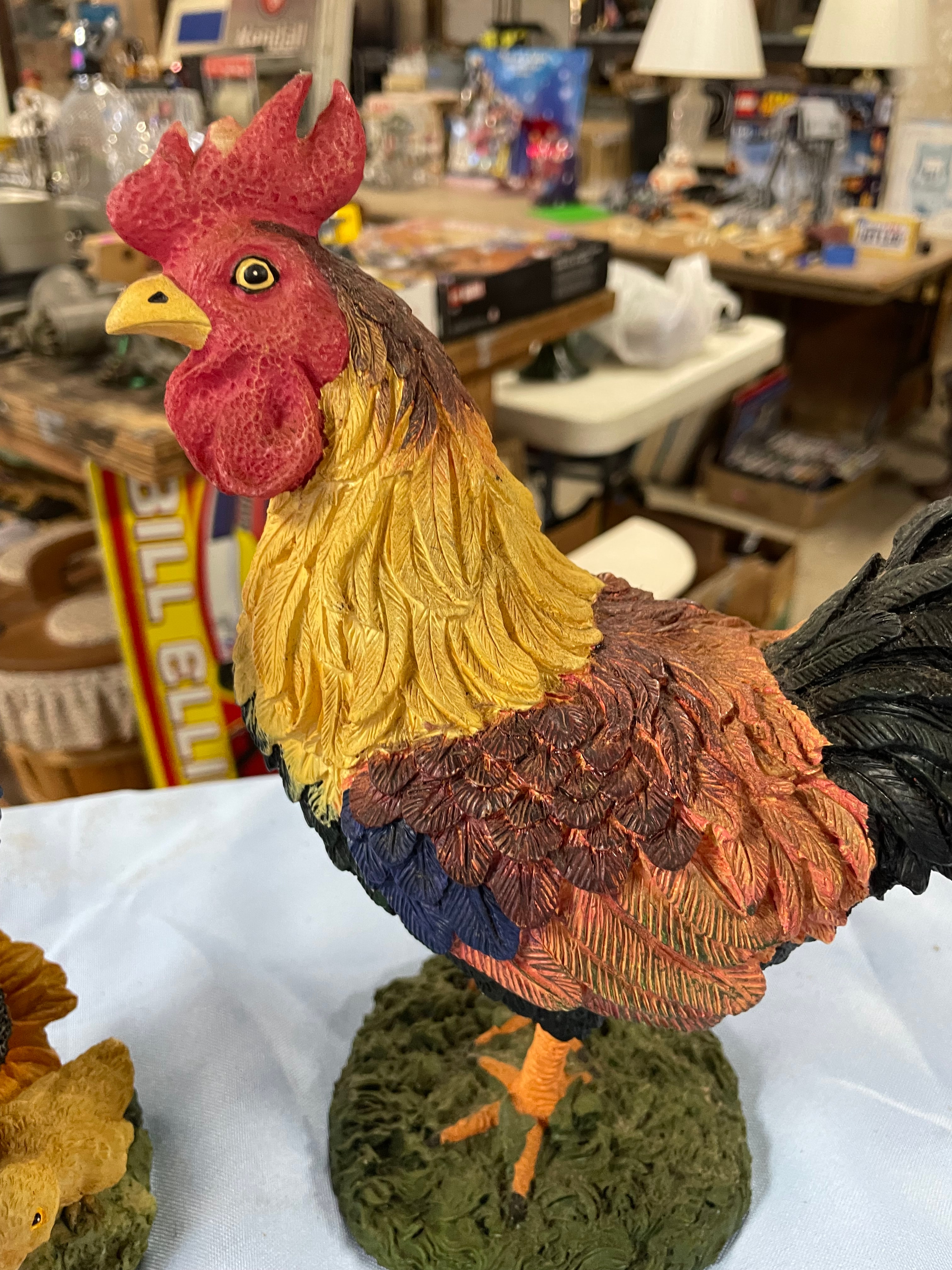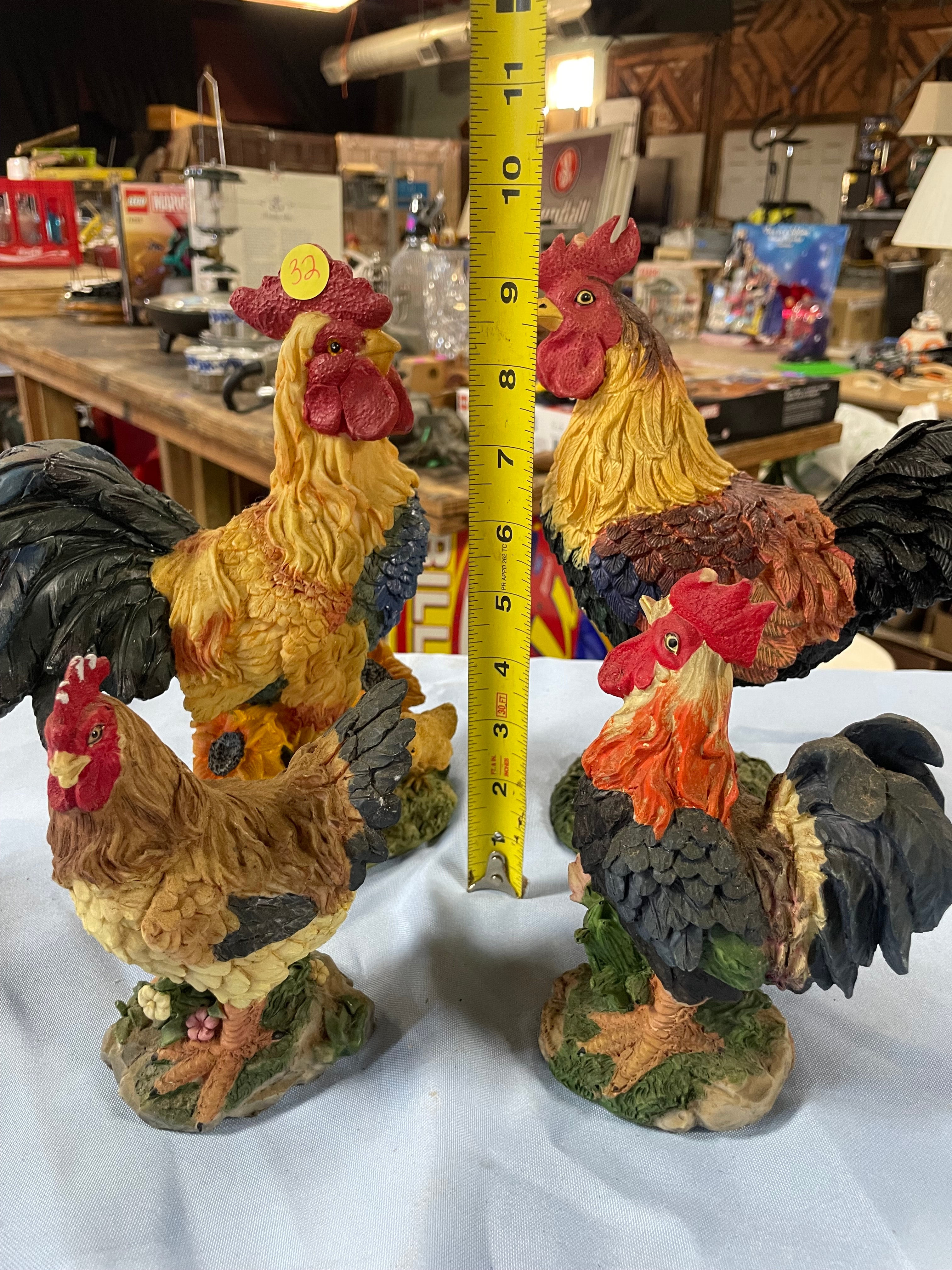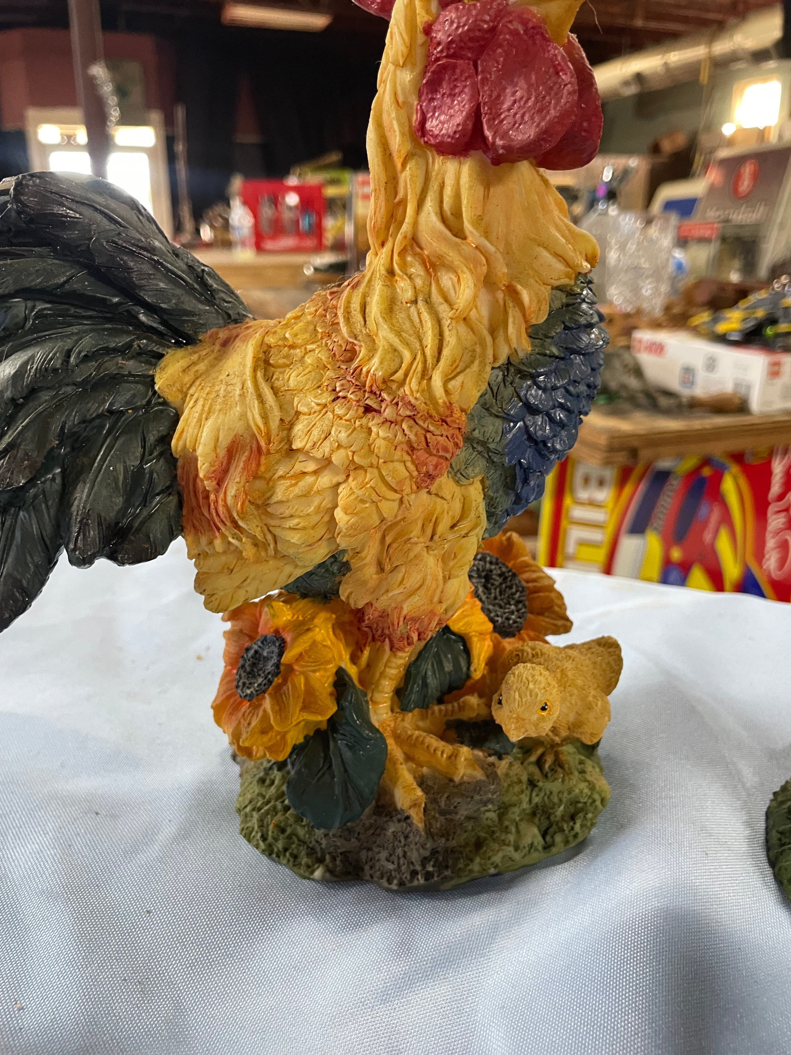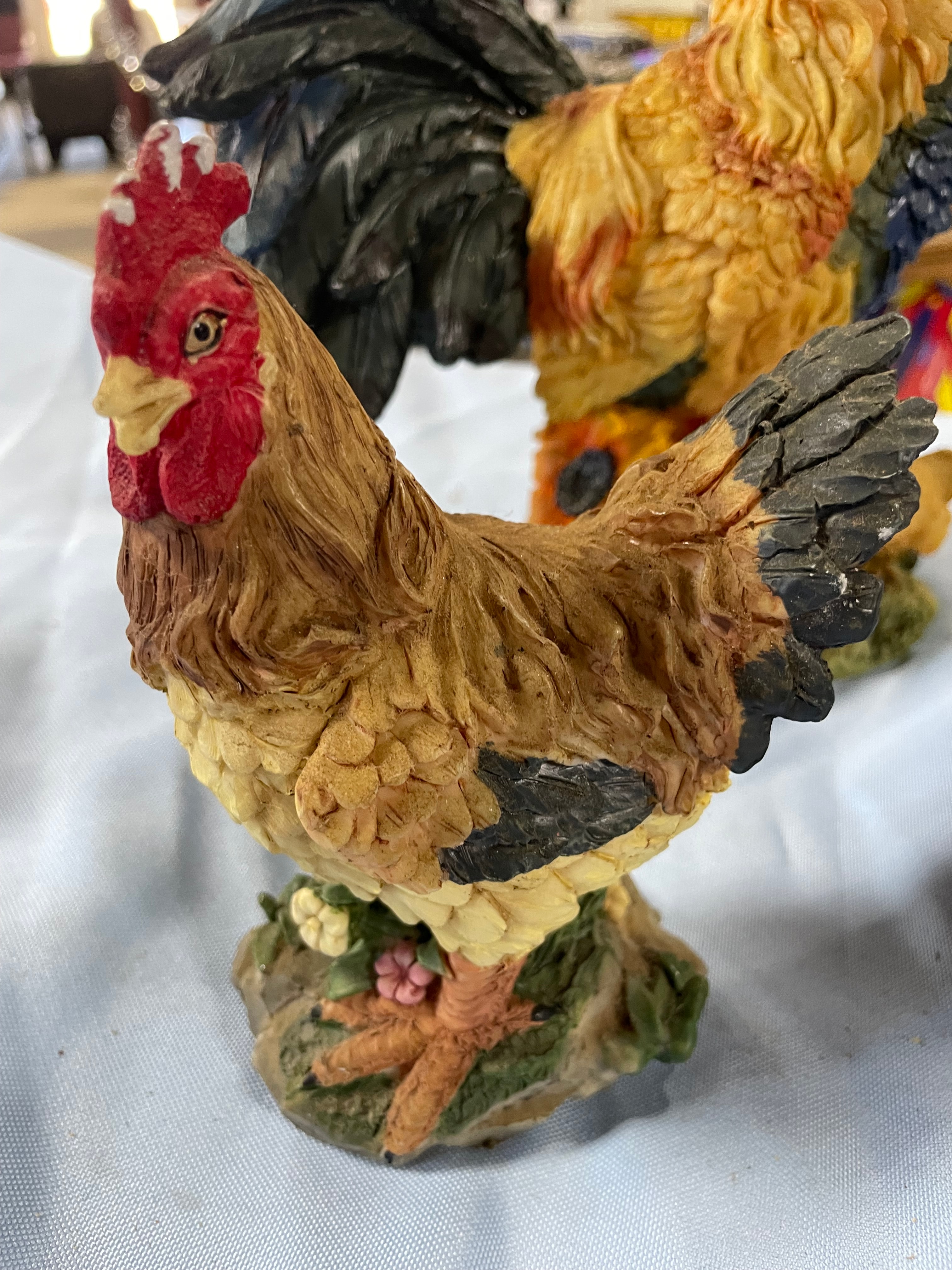 Four multi-colored rooster and hen figurines made of resin, featuring dominant shades of yellow, brown, black, and red, measuring approximately 6 to 10 inches tall.