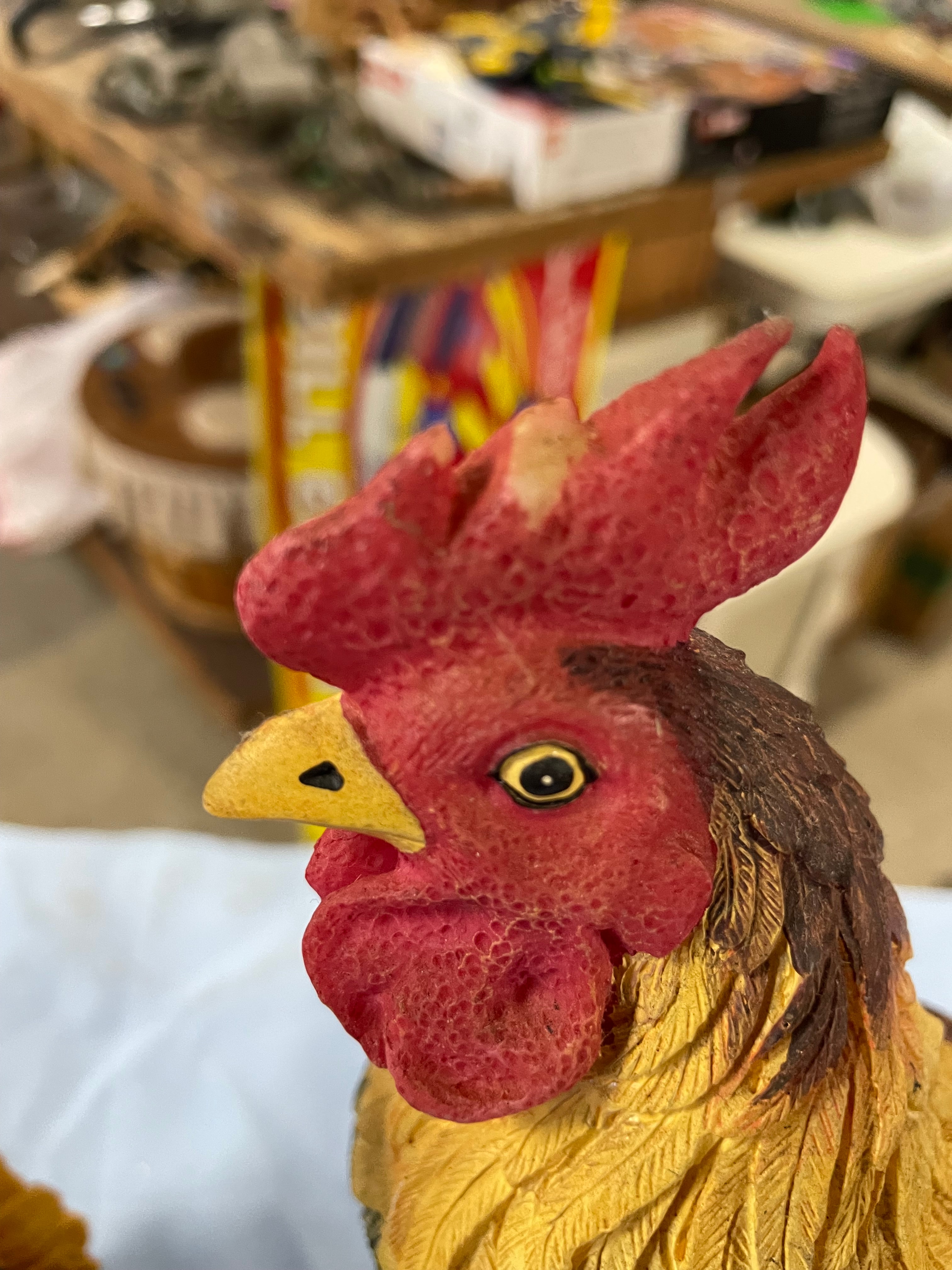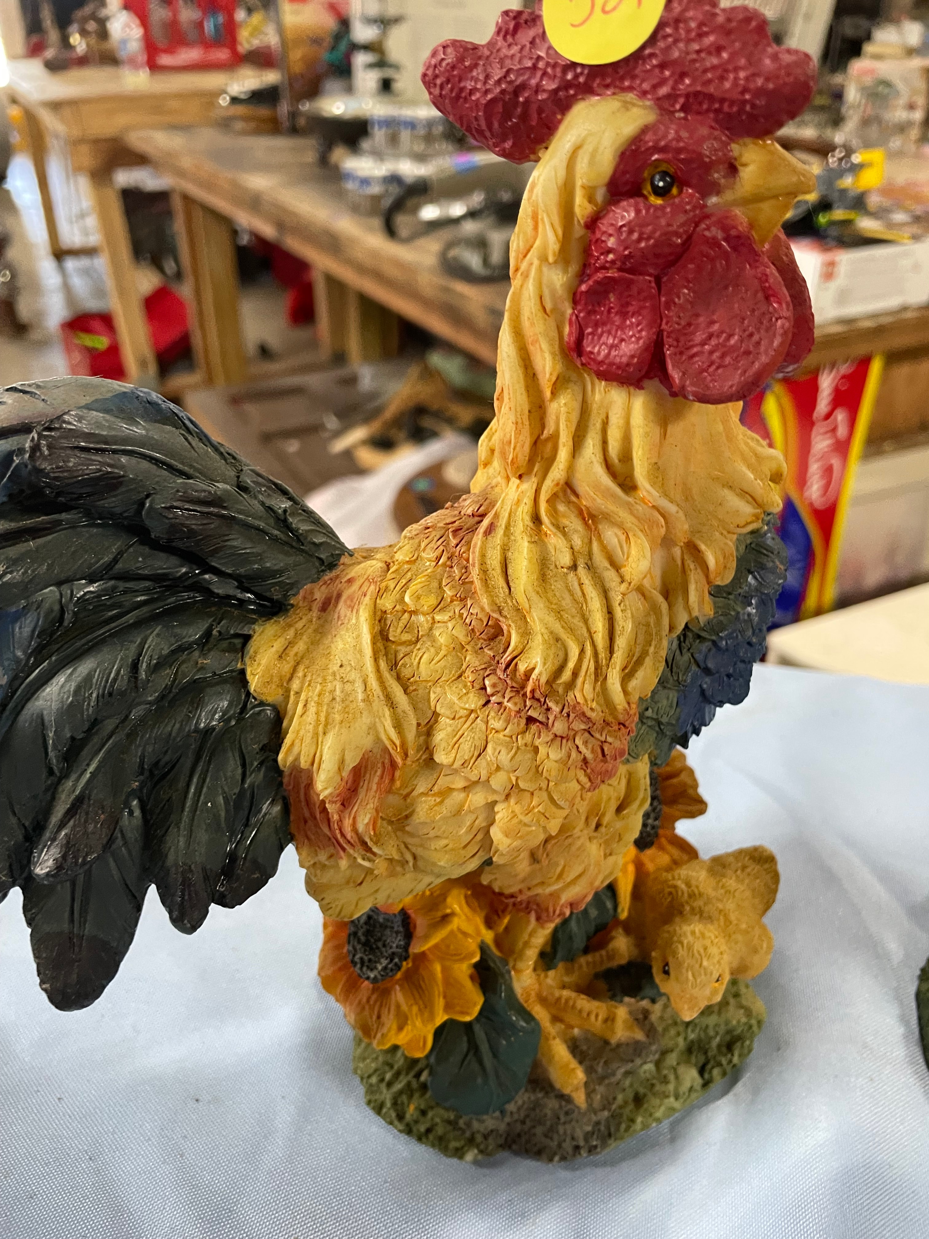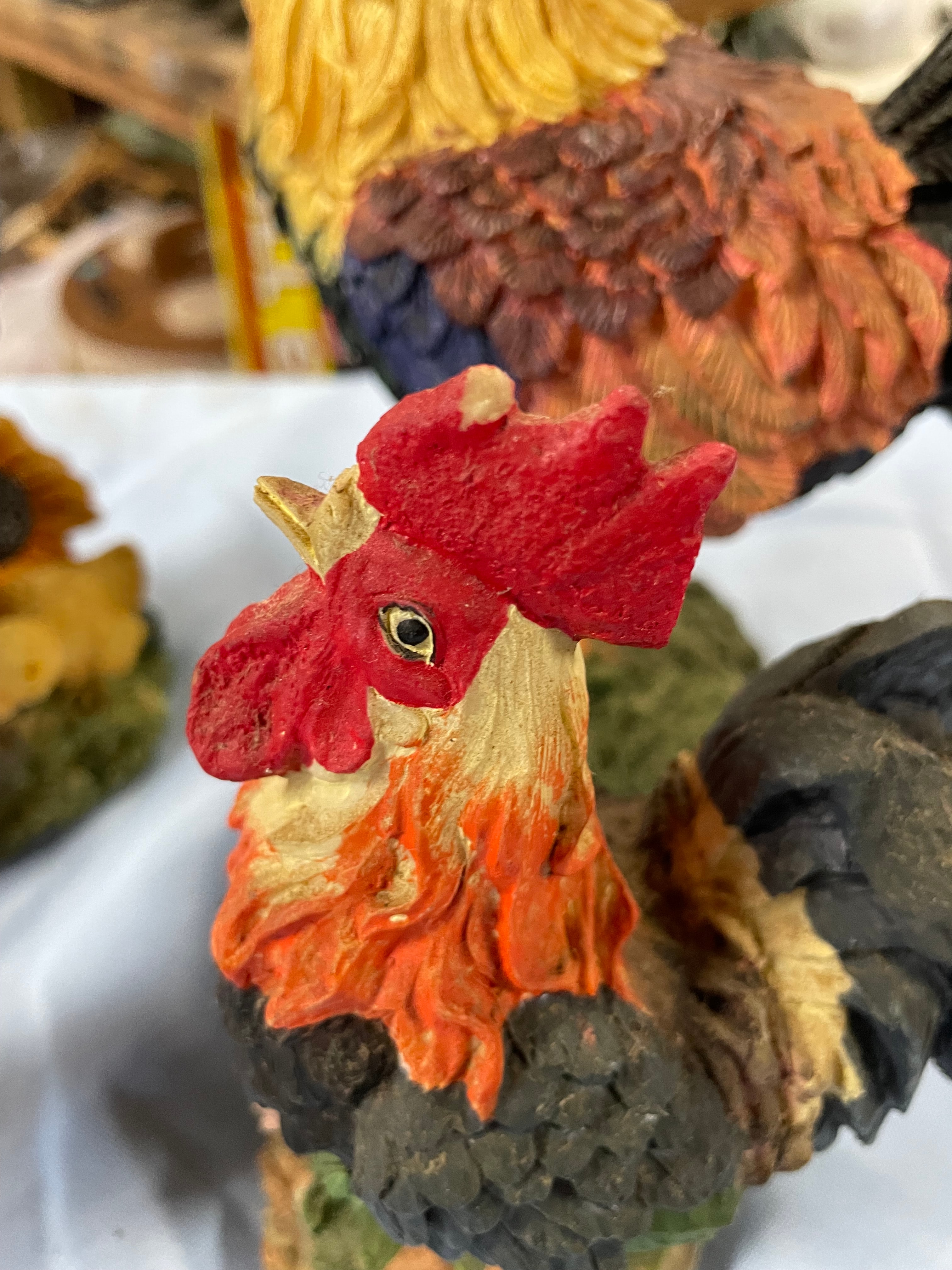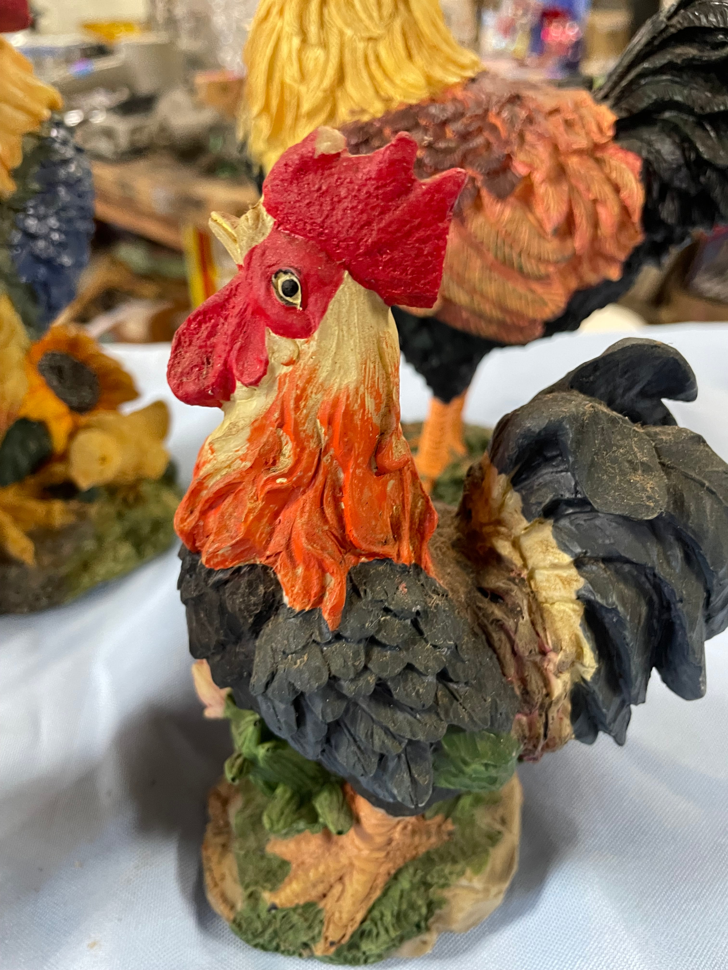 Four multi-colored rooster and hen figurines made of resin, featuring dominant shades of yellow, brown, black, and red, measuring approximately 6 to 10 inches tall.