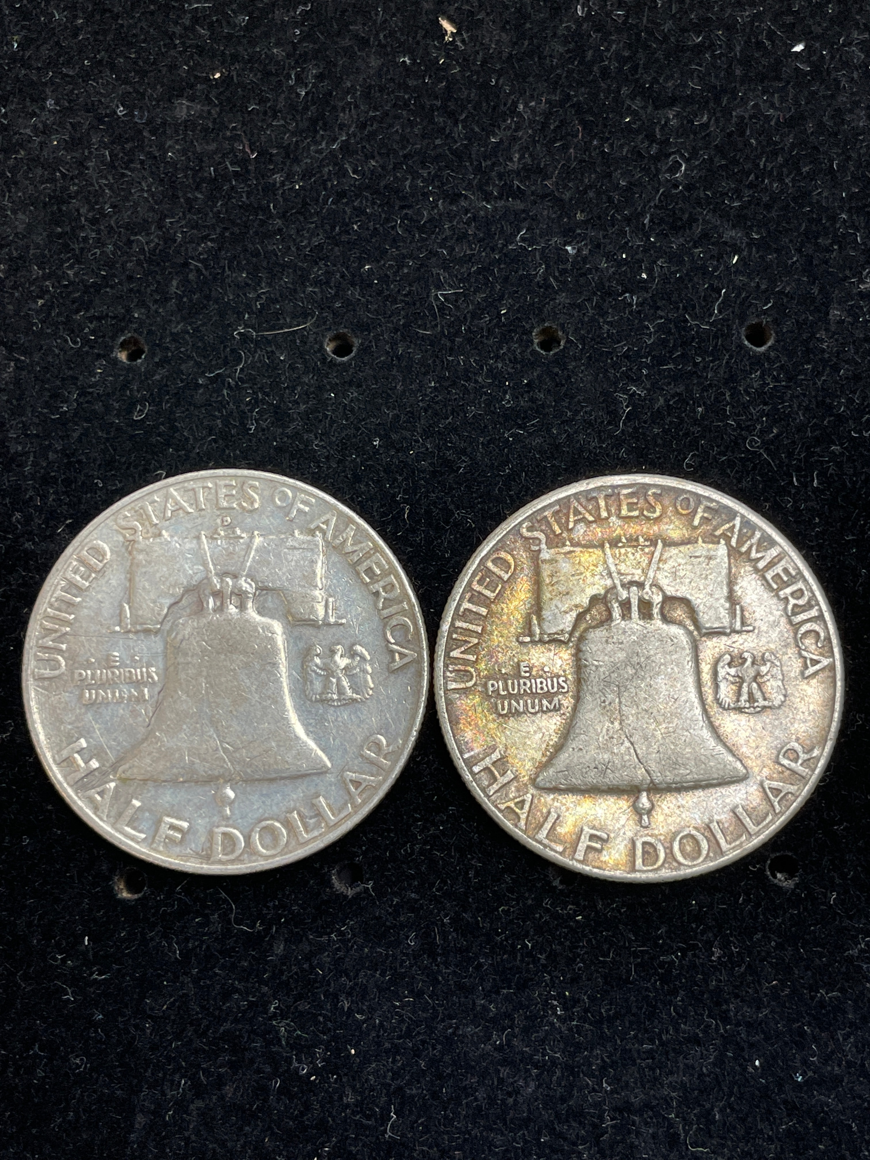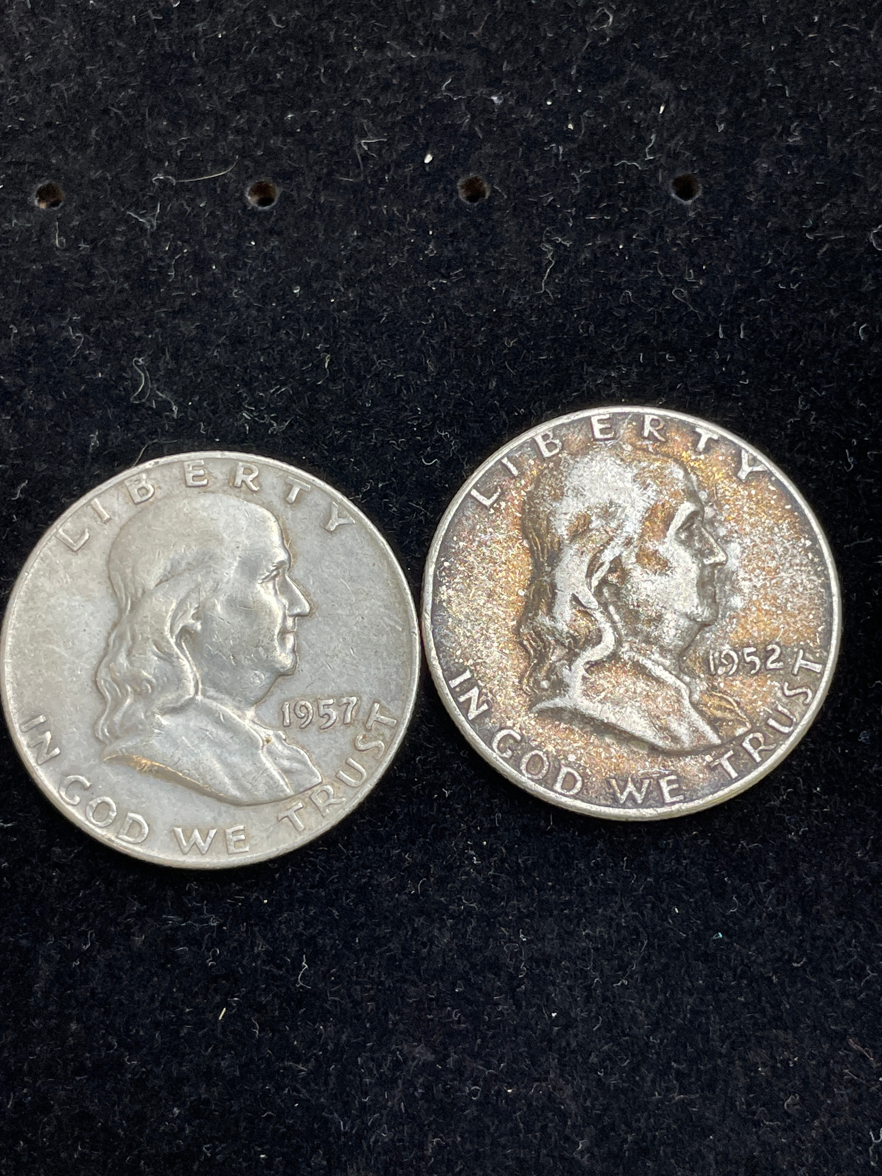 A pair of United States Franklin Silver Half Dollars, comprising a 1952 issue and a 1957 issue. Both coins feature a profile of Benjamin Franklin on the obverse, inscribed “LIBERTY” and “IN GOD WE TRUST.” The reverse of each depicts the Liberty Bell, flanked by a small eagle, with the legends “UNITED STATES OF AMERICA,” “E PLURIBUS UNUM,” and “HALF DOLLAR.” The 1952 coin is characterized by iridescent golden-brown toning covering both sides. Both coins are composed of a silver-colored metal.