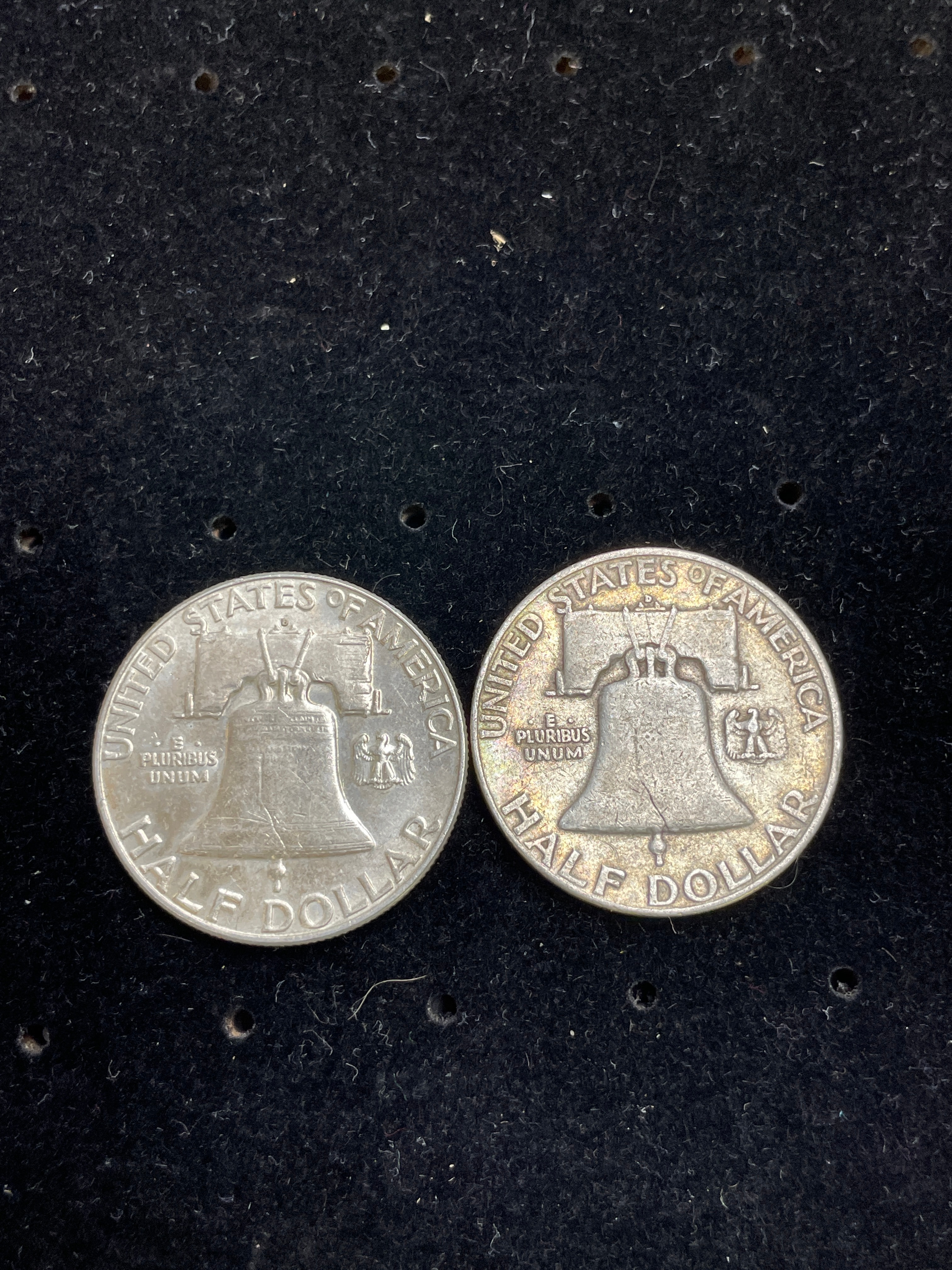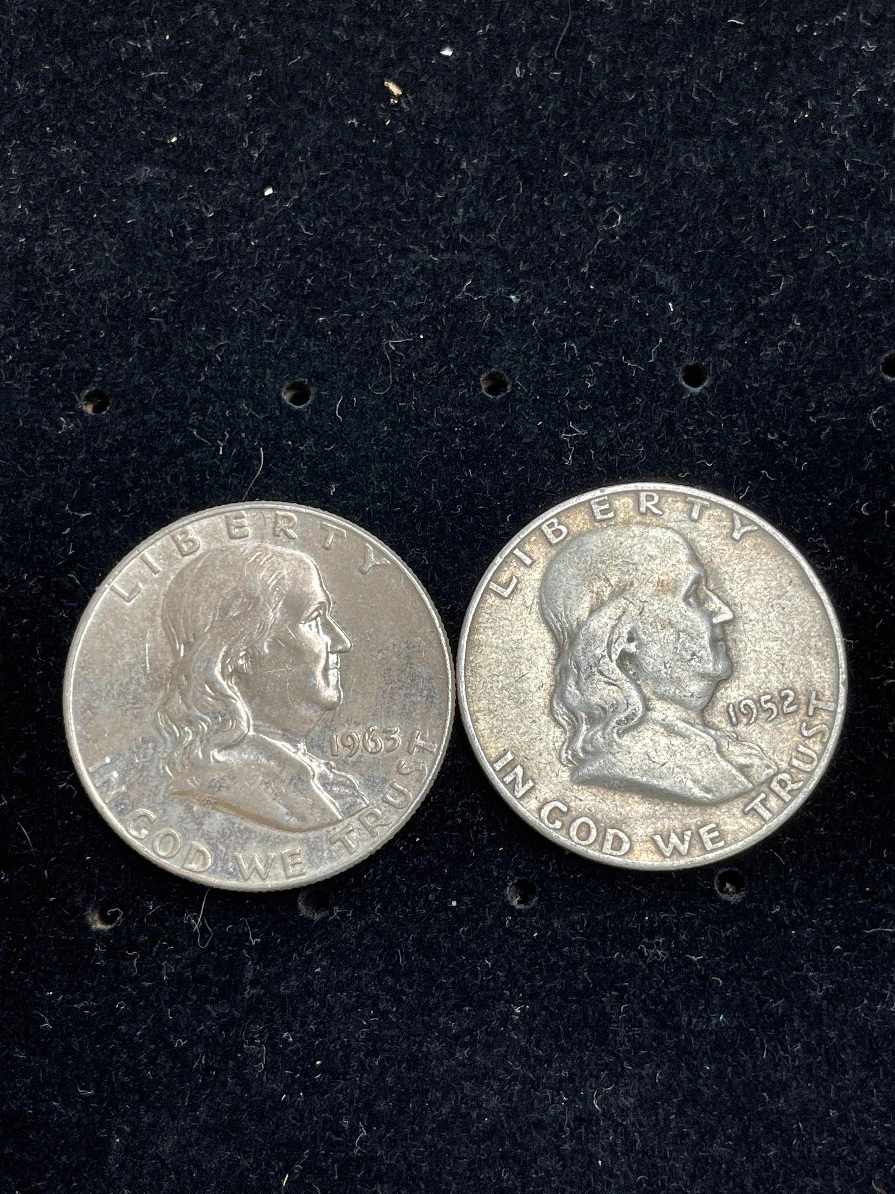 A pair of U.S. Franklin Silver Half Dollars, comprising one dated 1952 and another dated 1963. Both coins feature a profile bust of Benjamin Franklin facing right on the obverse, encircled by the text “LIBERTY” above and “IN GOD WE TRUST” below. The reverse of each coin depicts the Liberty Bell, with the text “UNITED STATES OF AMERICA” above, “E PLURIBUS UNUM” to the left of the bell, and “HALF DOLLAR” below. These coins are composed of 90% silver.