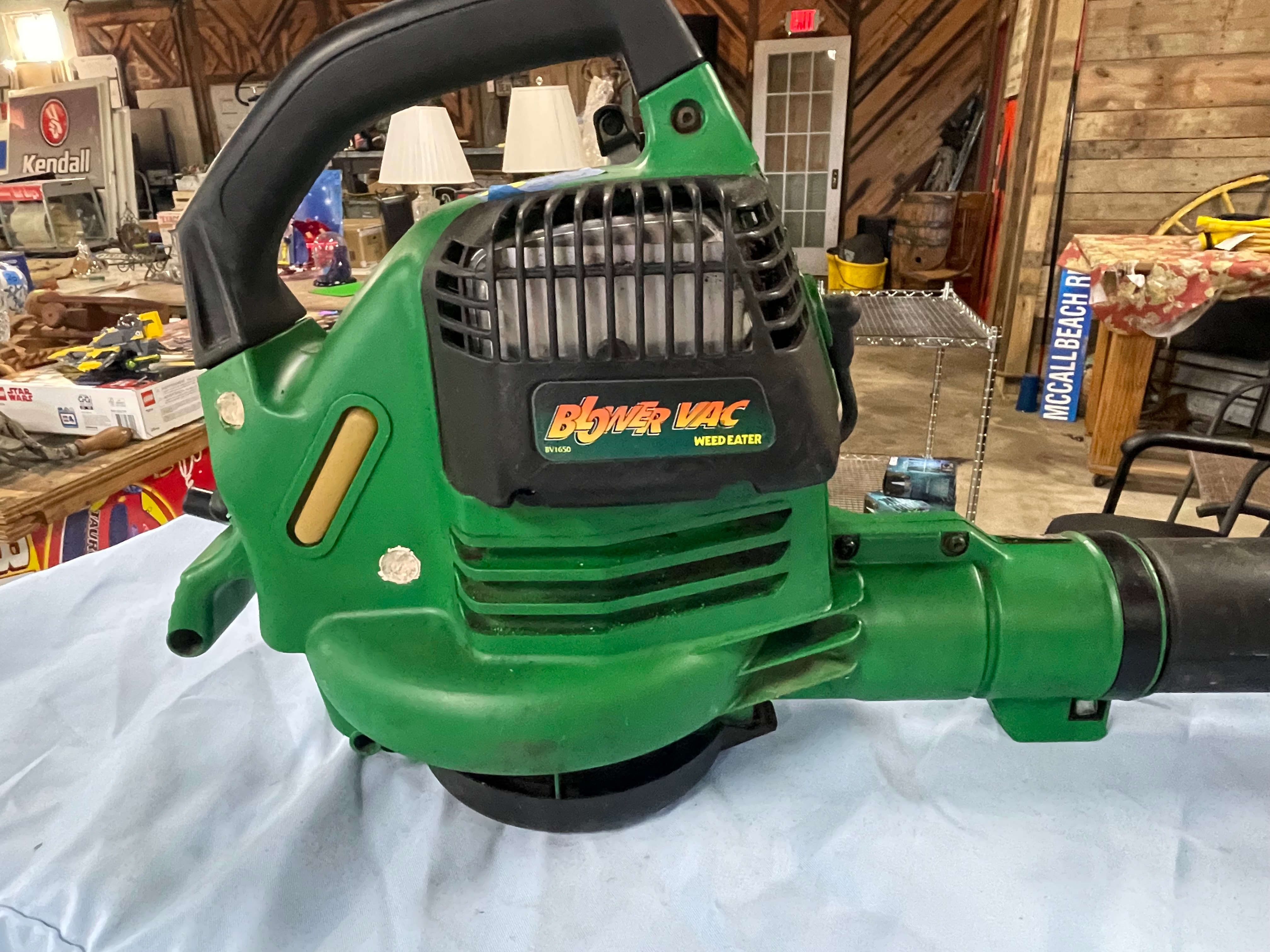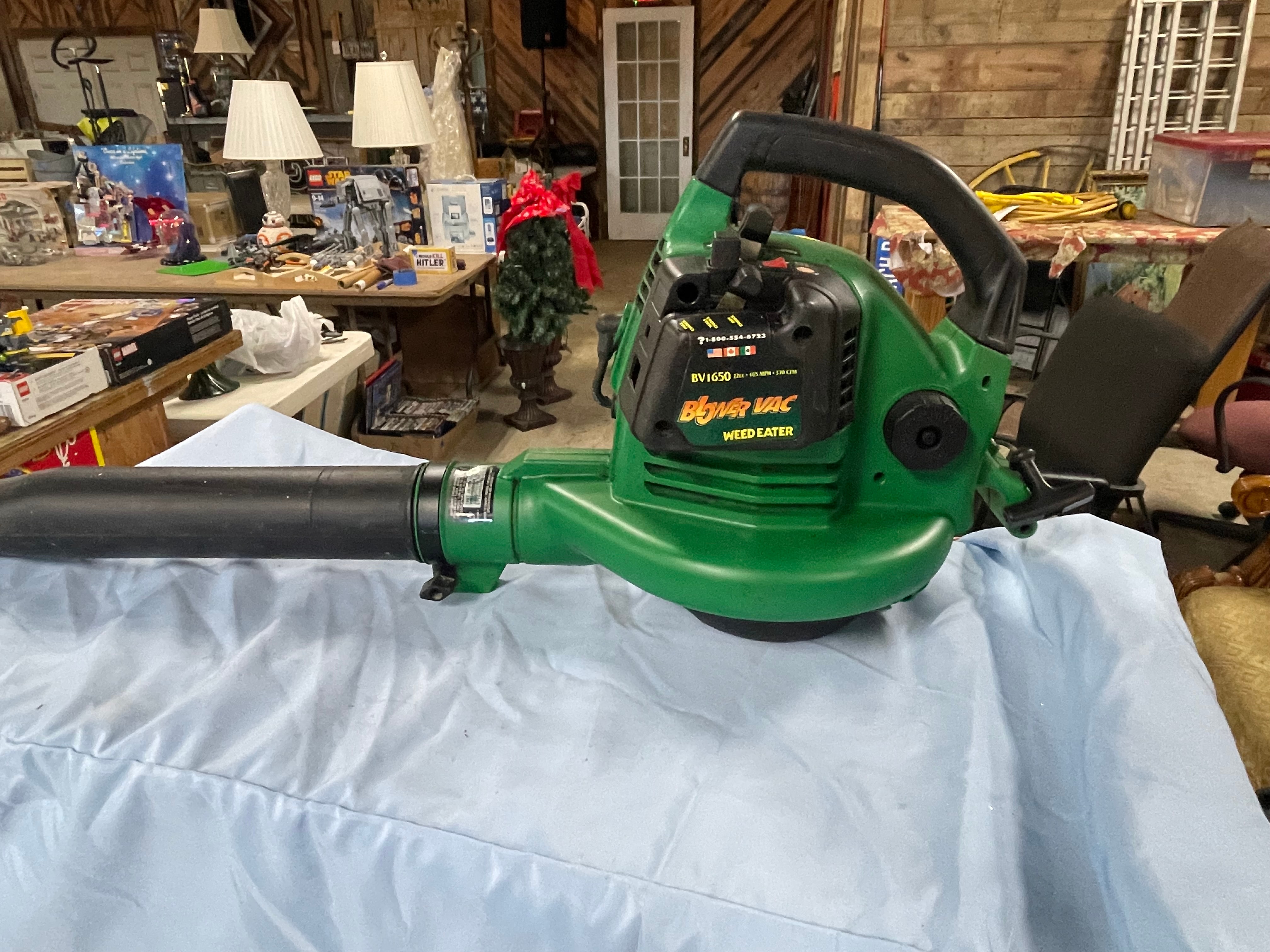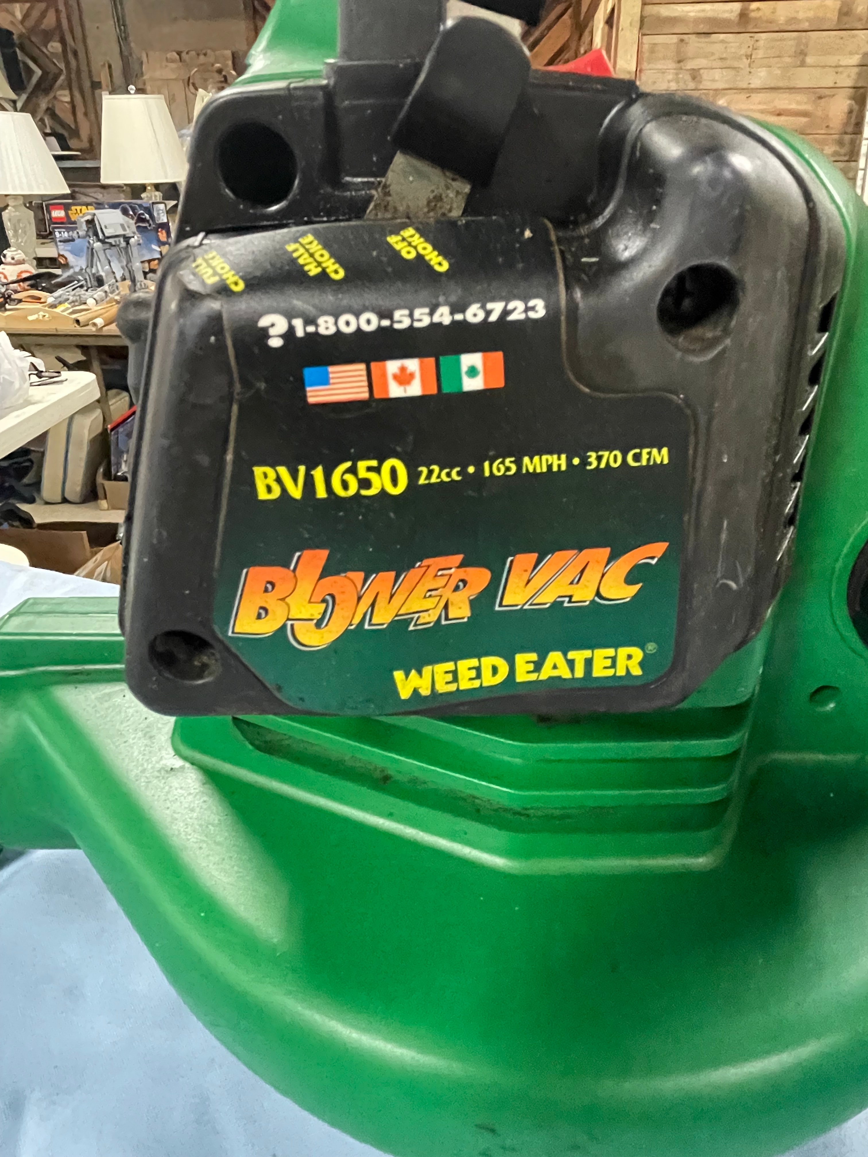 A green and black BLOWER VAC WEED EATER BV1650 leaf blower/vacuum, labeled ’22cc • 165 MPH • 370 CFM’ and ‘MODEL 2404UB2.0RB EM’.