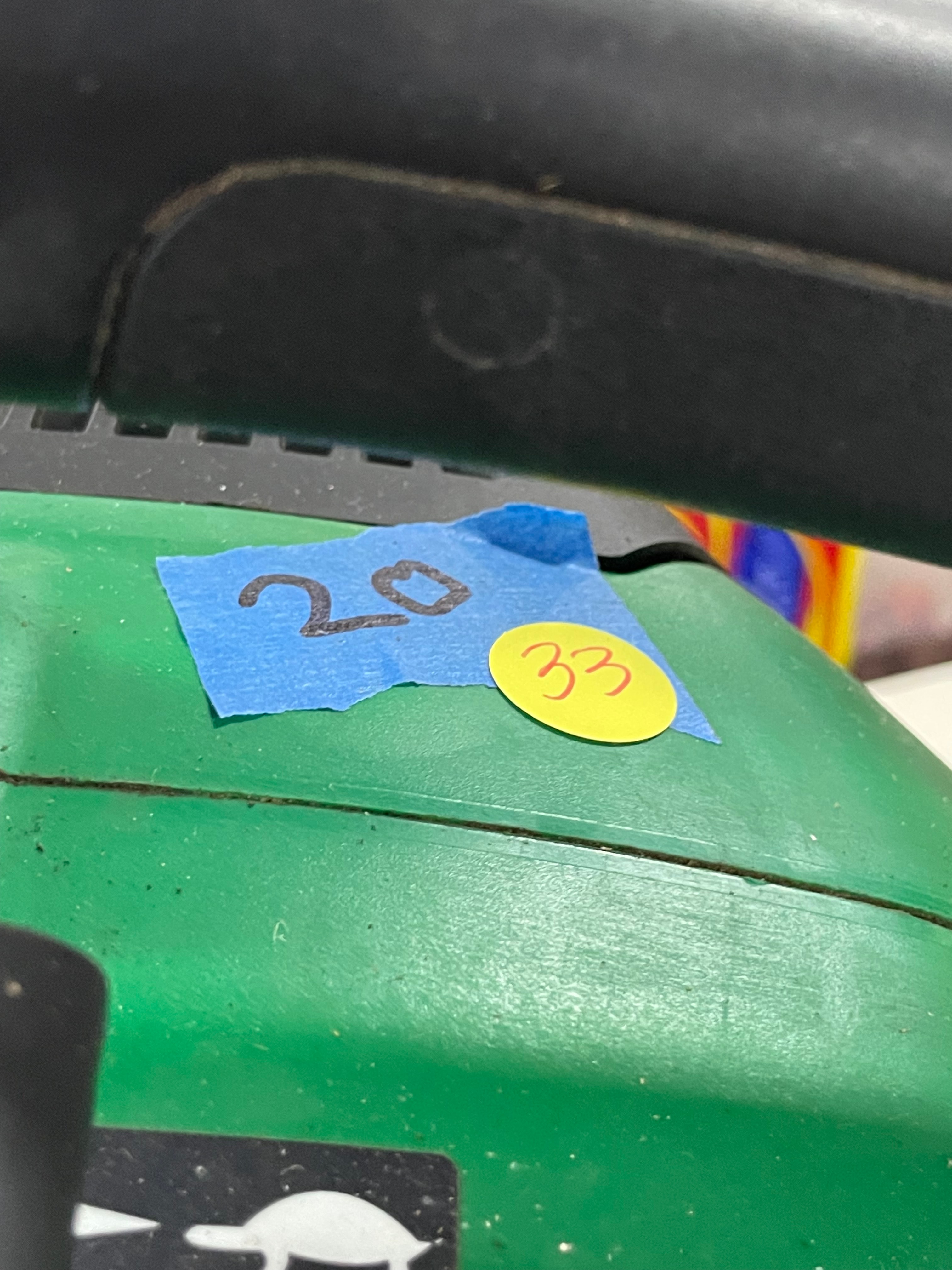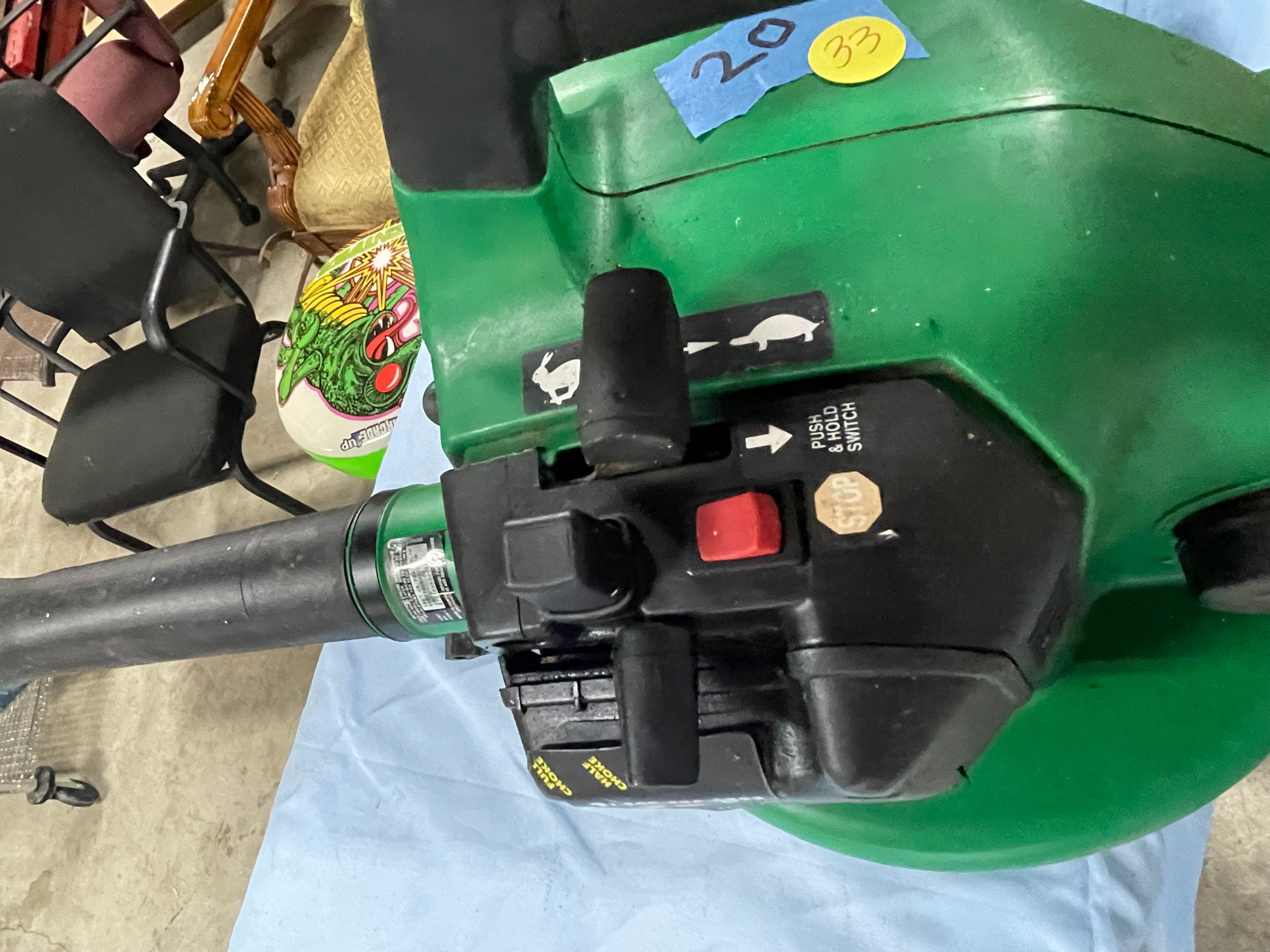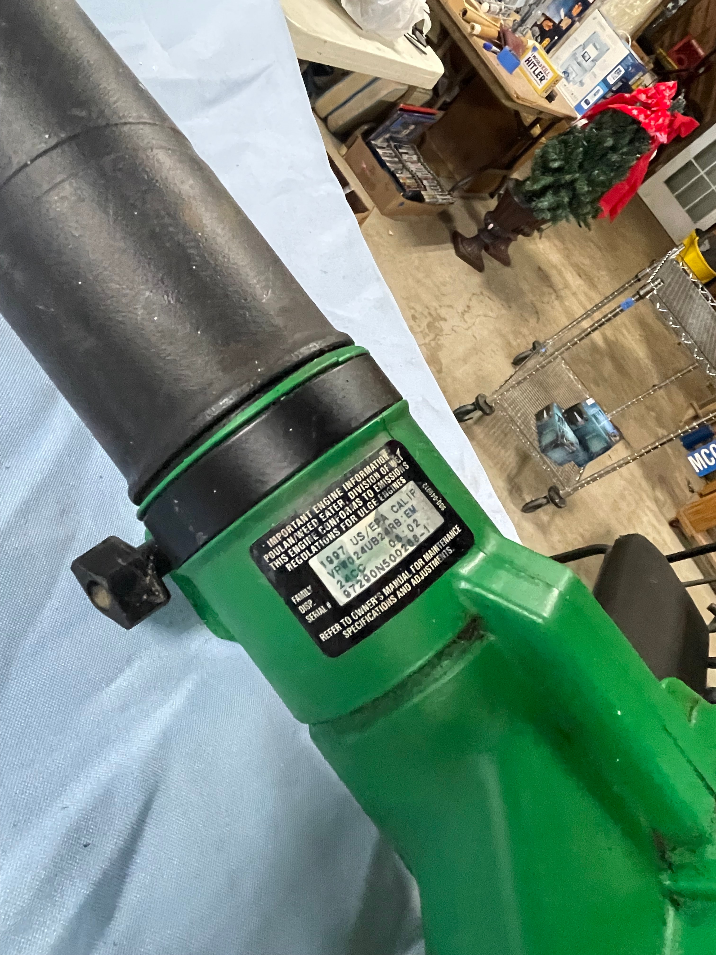 A green and black BLOWER VAC WEED EATER BV1650 leaf blower/vacuum, labeled ’22cc • 165 MPH • 370 CFM’ and ‘MODEL 2404UB2.0RB EM’.