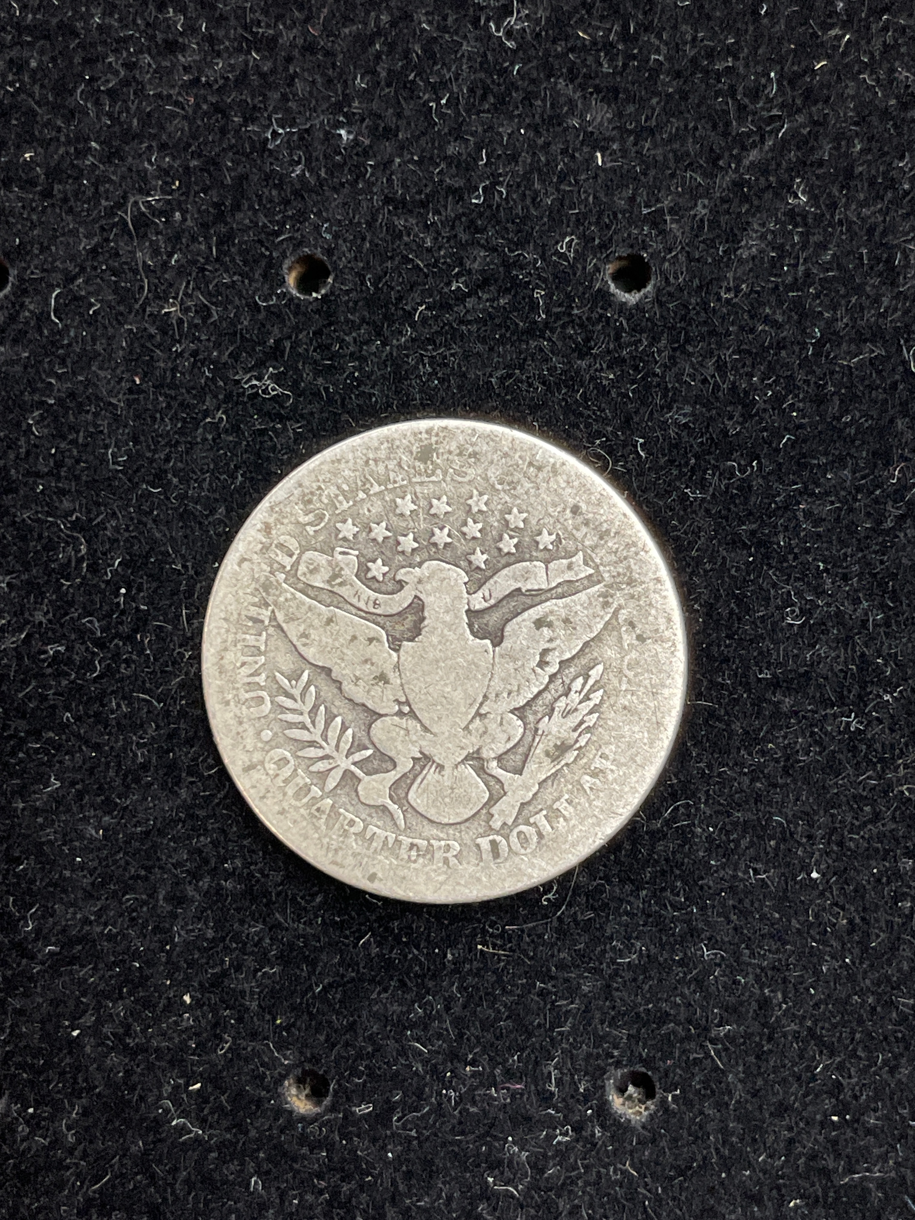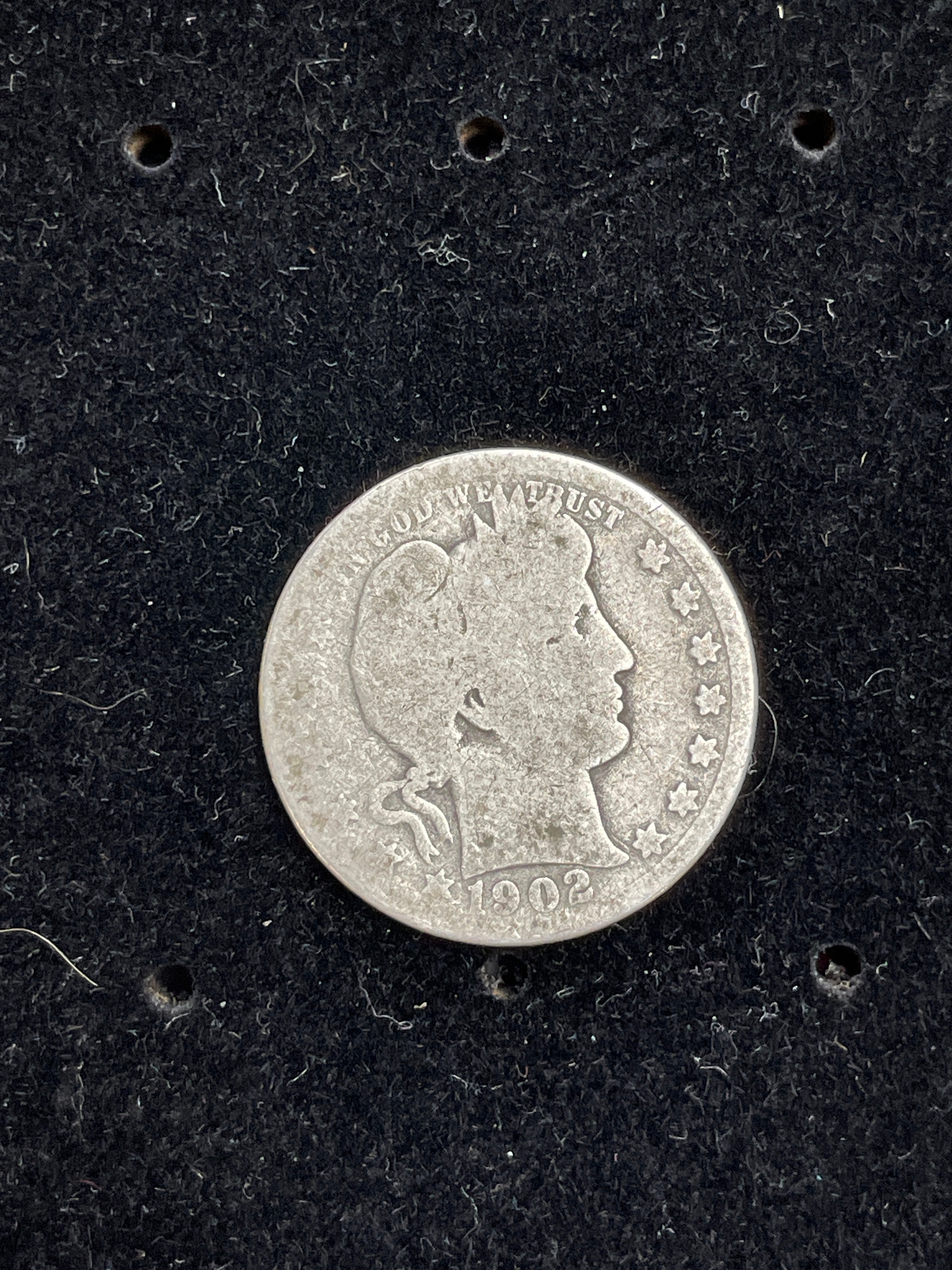 A 1902 United States Barber Quarter. This circular, silver-toned metallic coin features a right-facing profile bust of Liberty wearing a cap on the obverse, with the motto “IN GOD WE TRUST” inscribed above and the date “1902” below. The reverse displays an eagle with outstretched wings clutching arrows and an olive branch, encircled by the partial inscriptions “UNITED STATES OF AMERICA” and “QUARTER DOLLAR”, denoting its denomination.