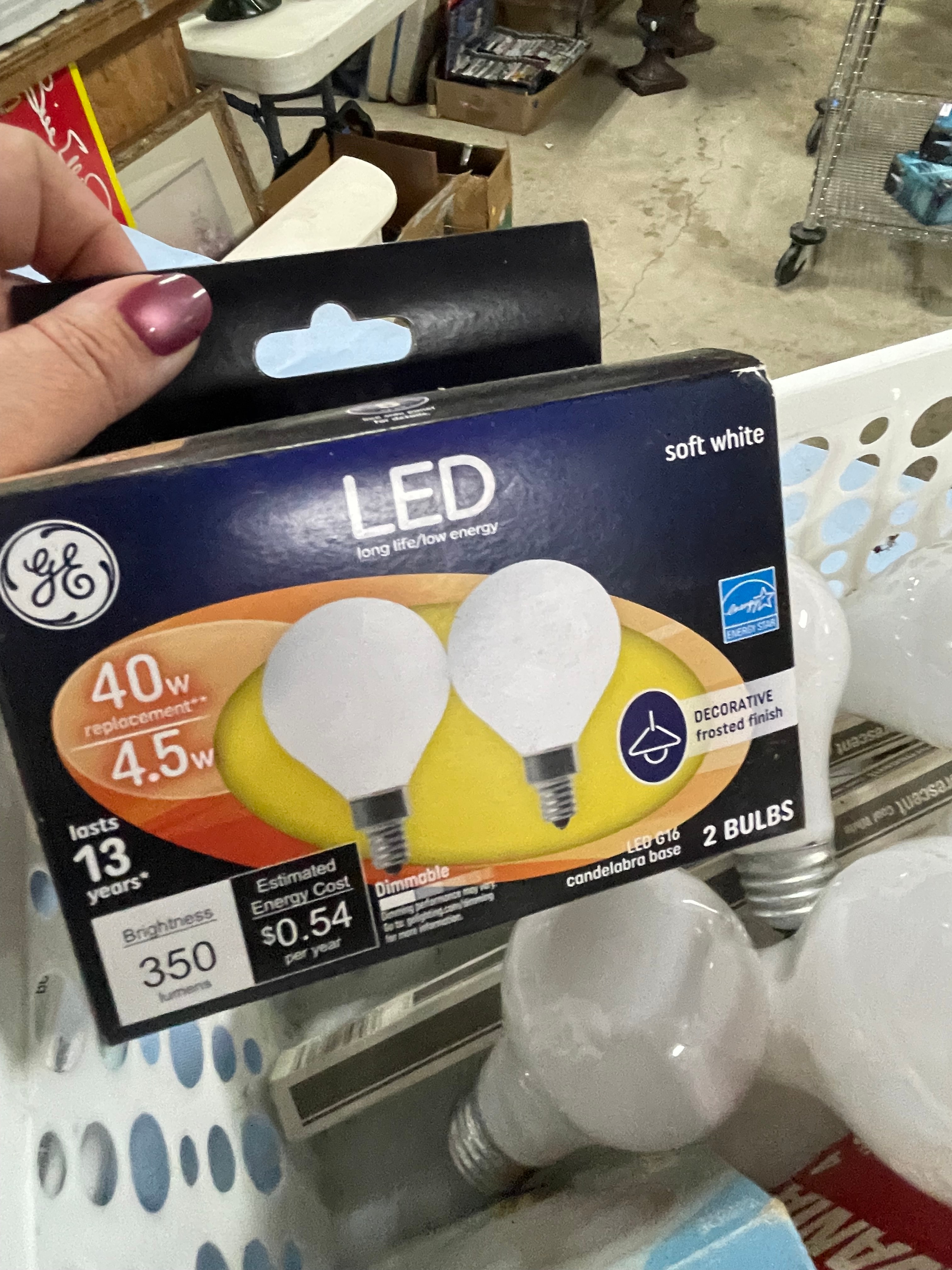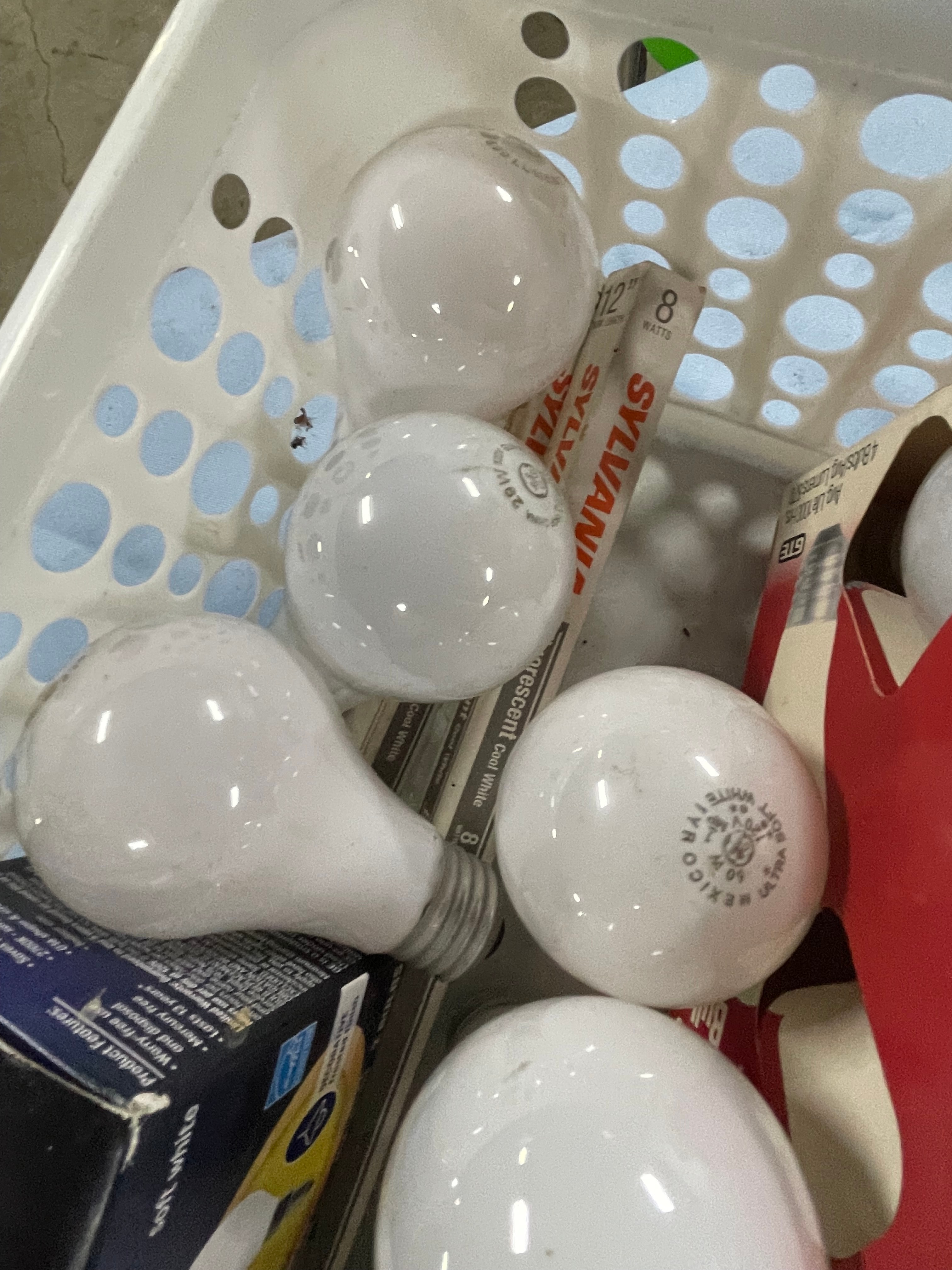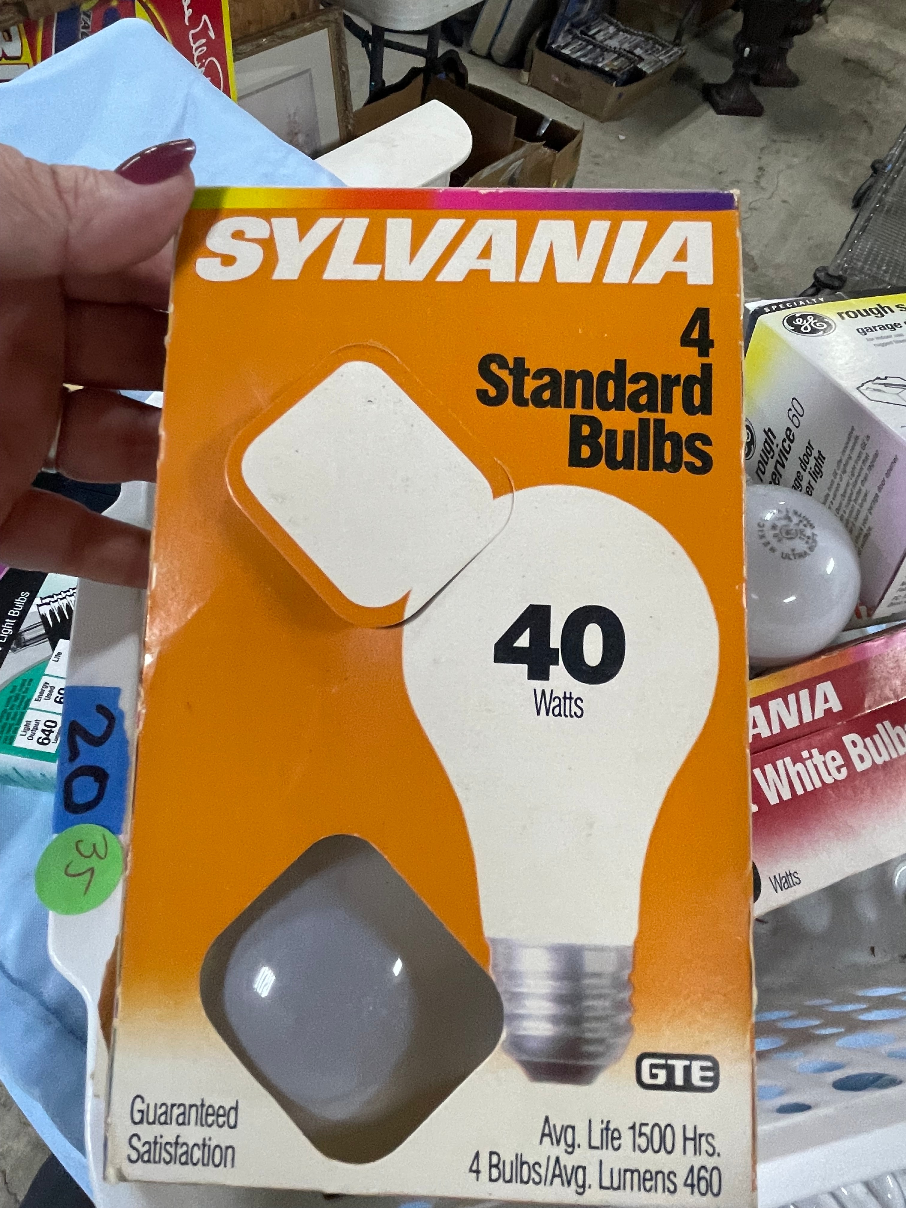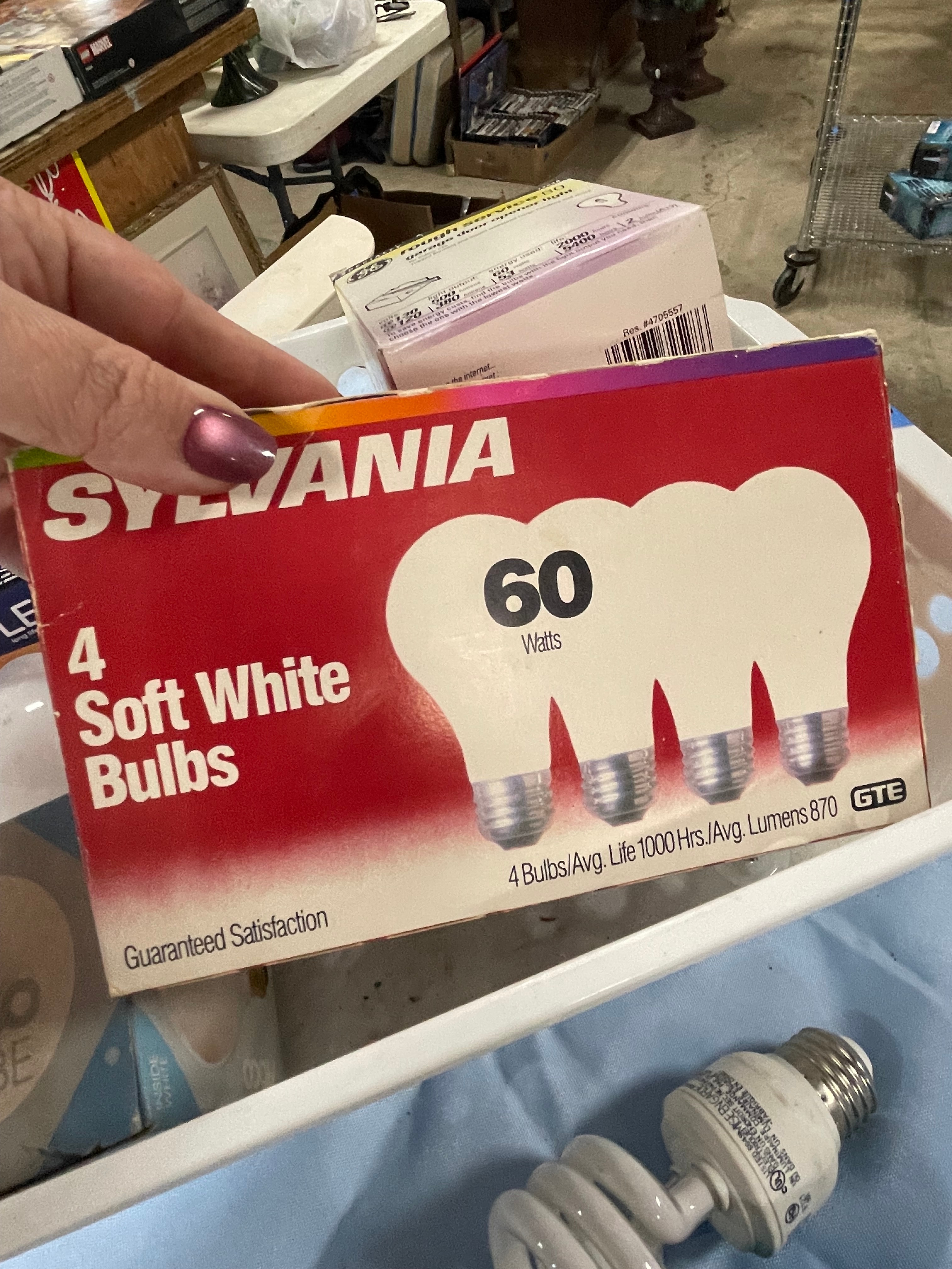 A collection of new and used GE and Sylvania light bulbs, including LED, standard, and halogen types, with various wattages and finishes.