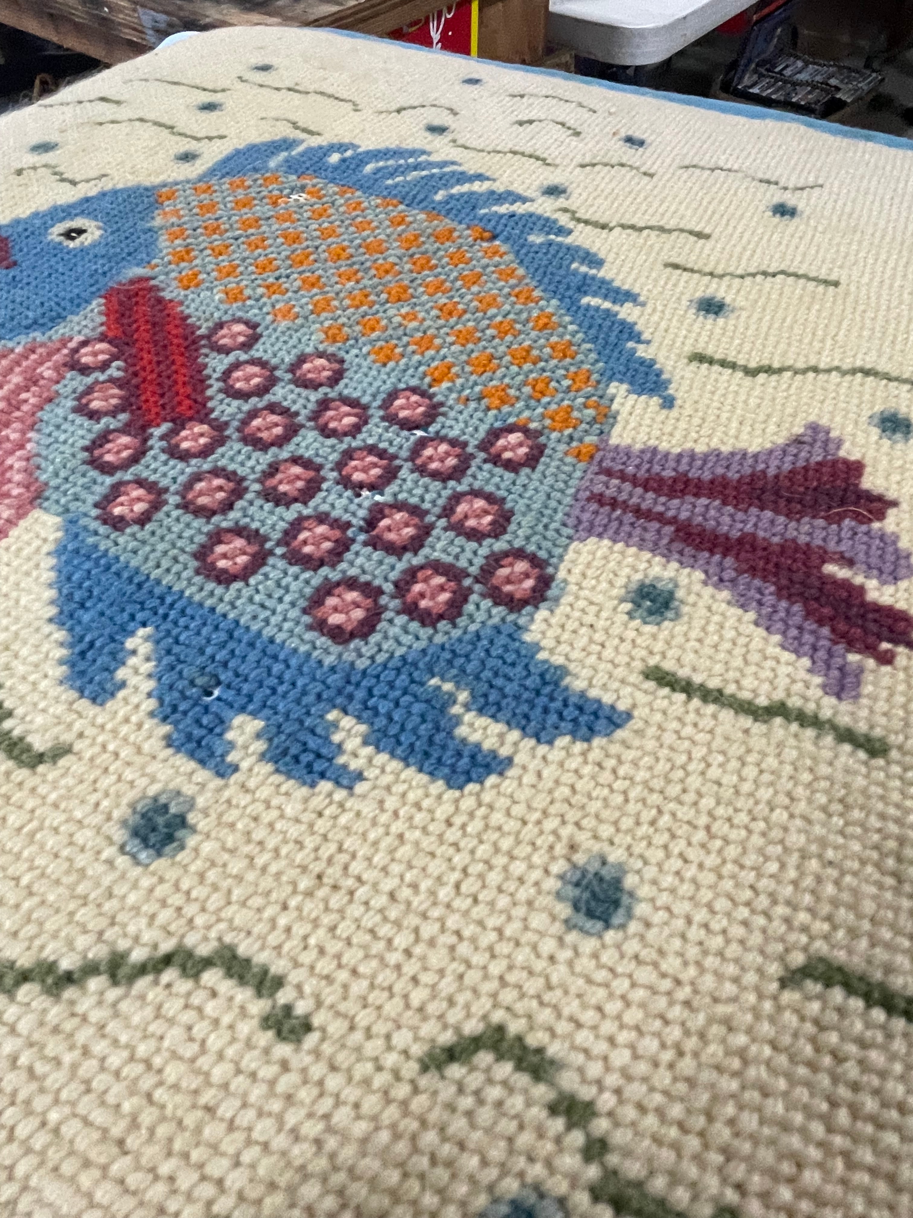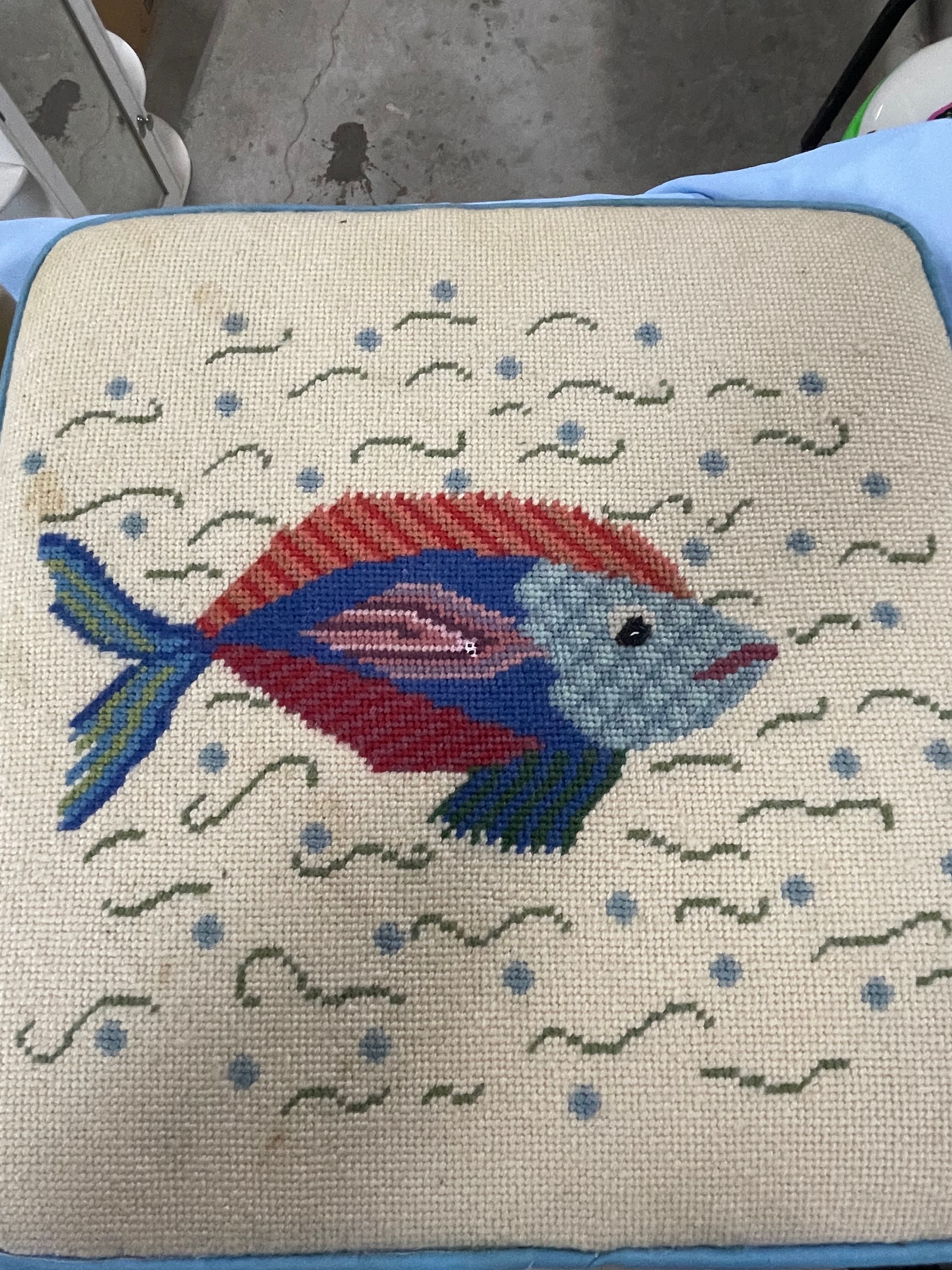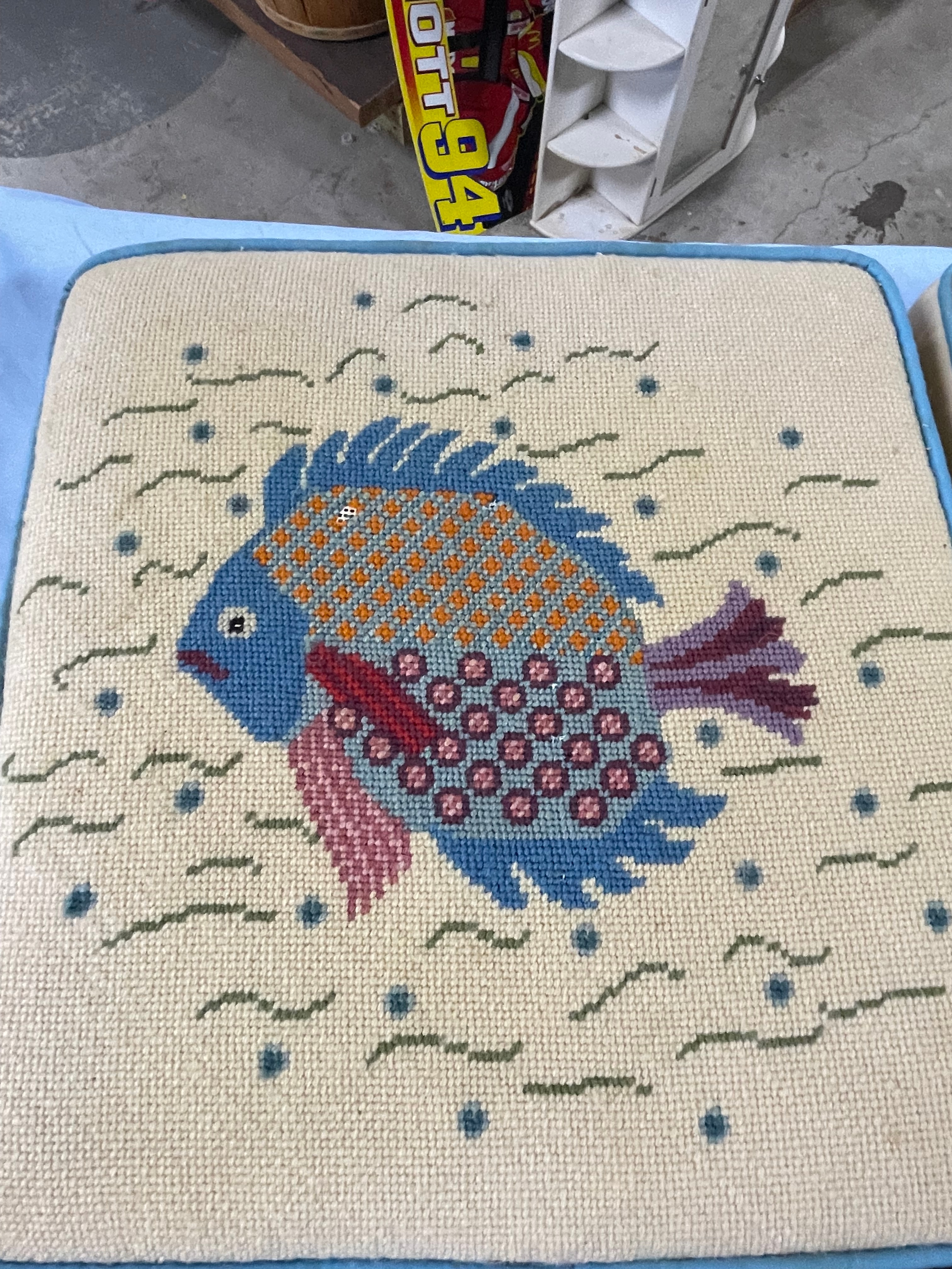 A pair of square needlepoint cushions, each approximately 14 inches wide and 4 inches high, featuring beige ground with colorful embroidered fish designs and light blue piping.