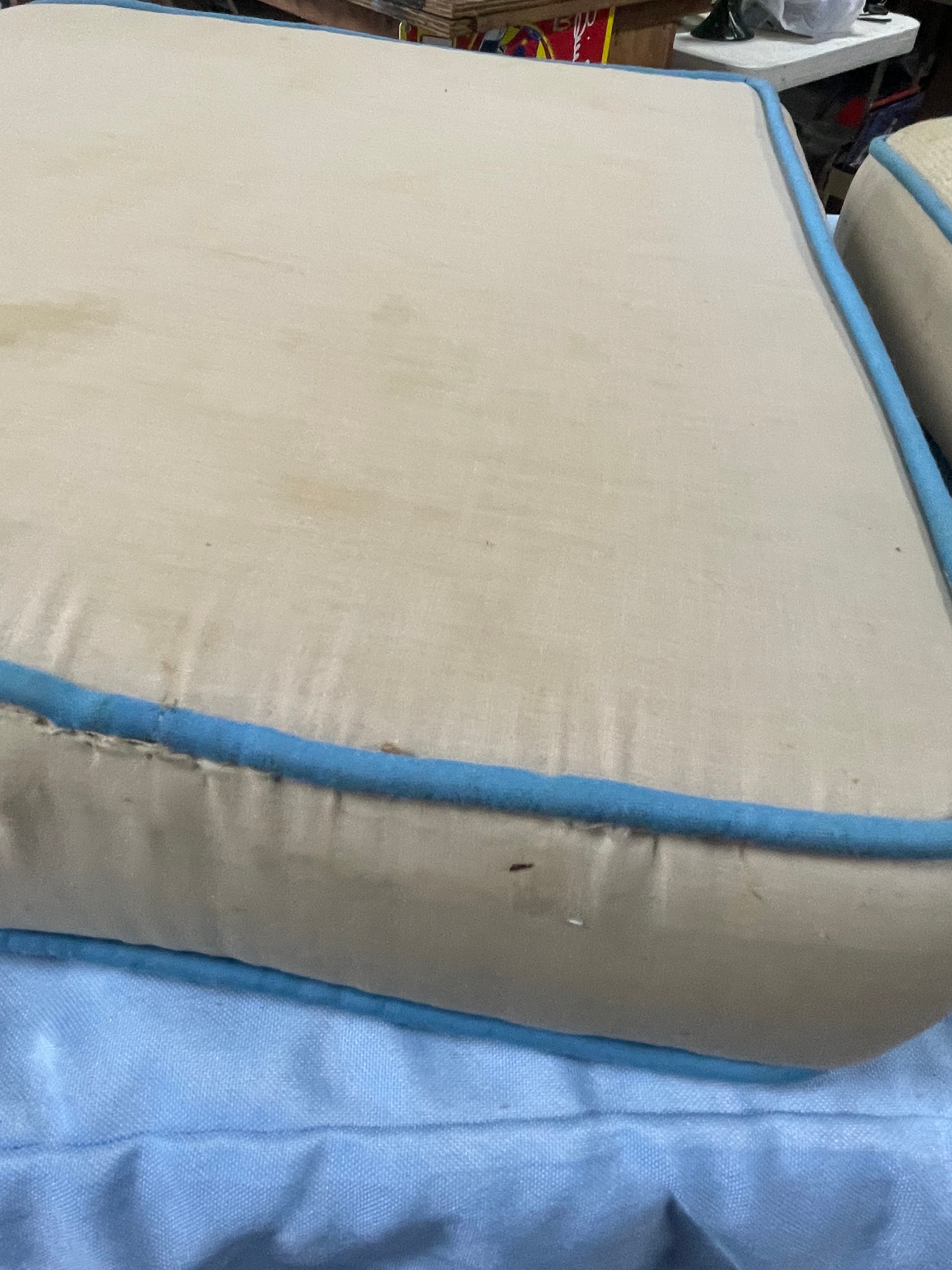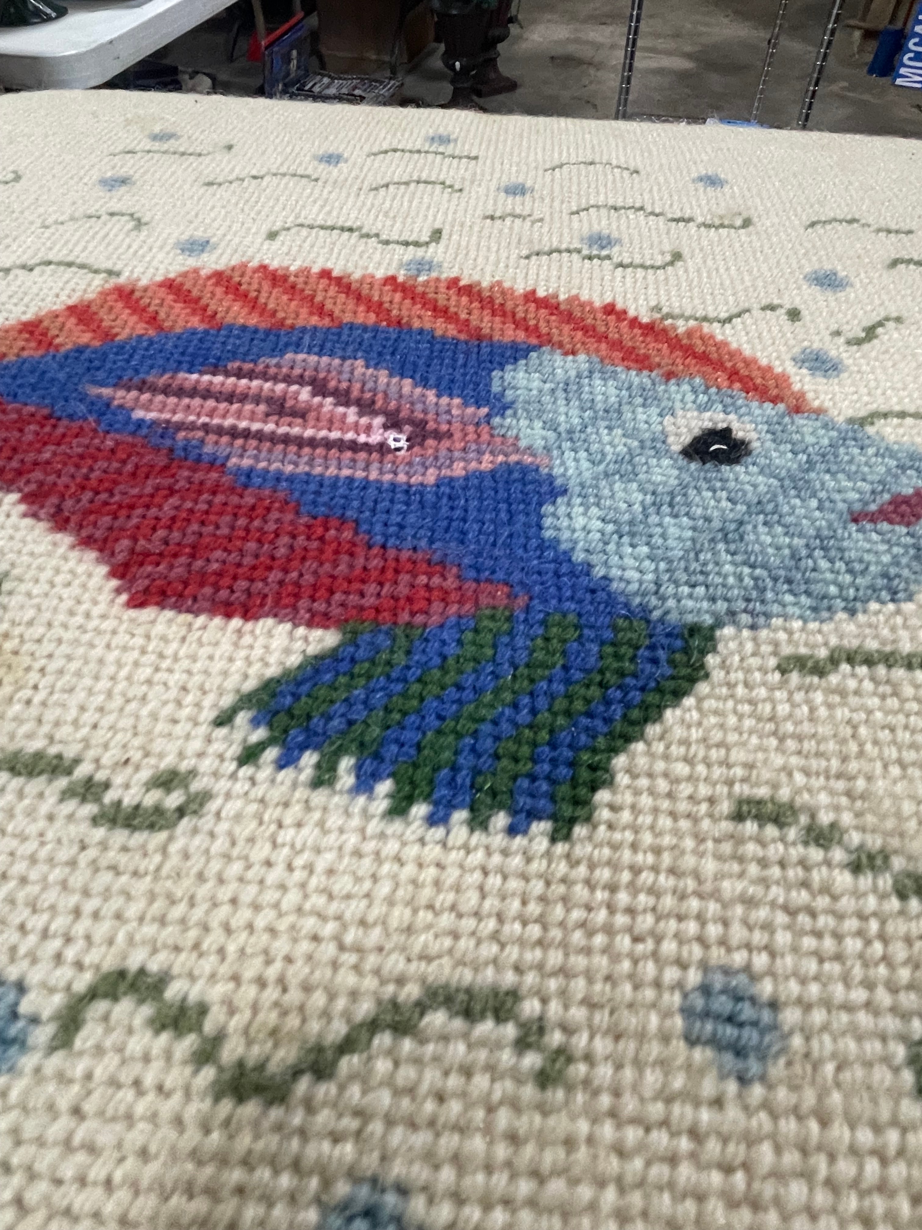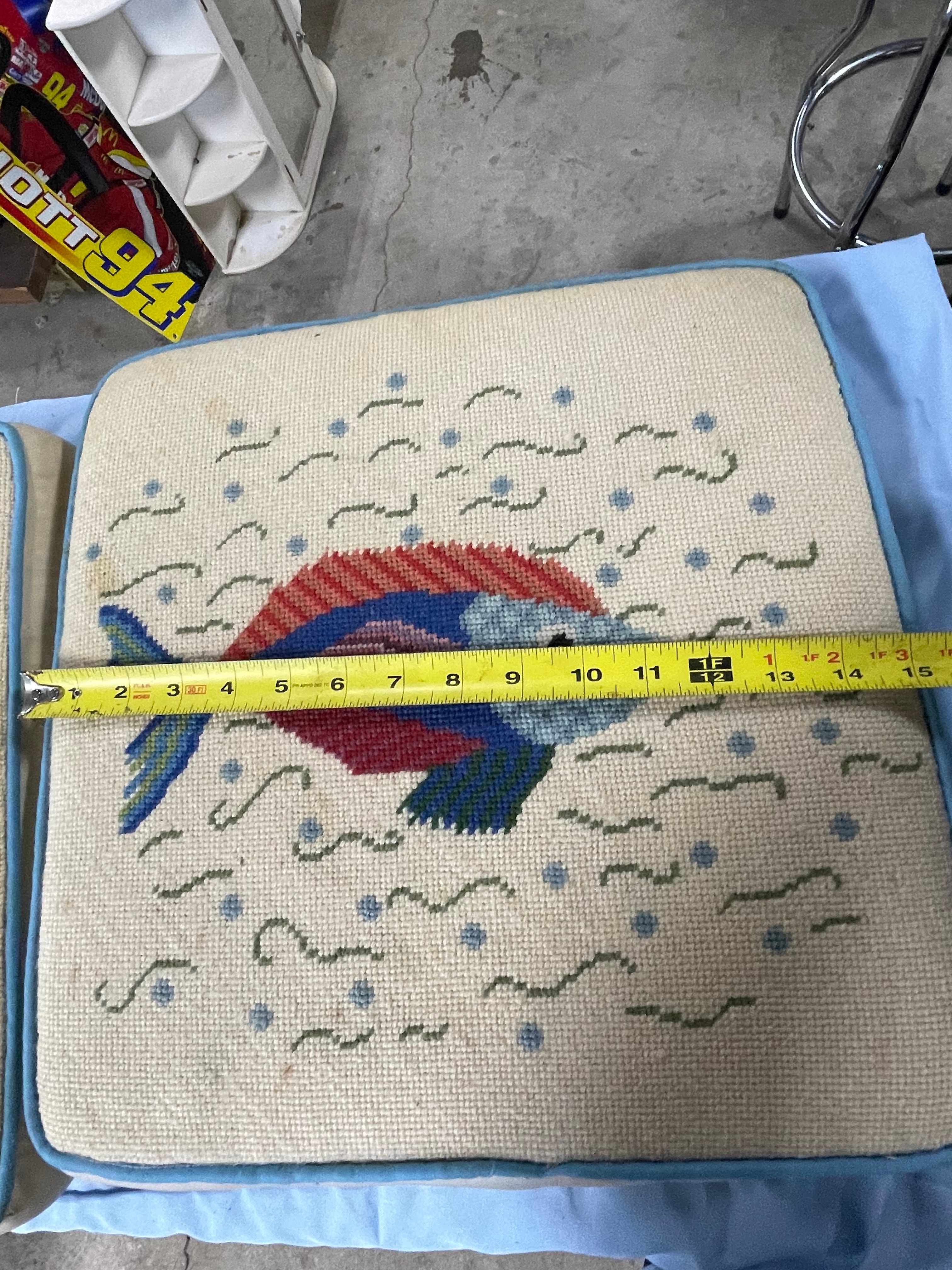 A pair of square needlepoint cushions, each approximately 14 inches wide and 4 inches high, featuring beige ground with colorful embroidered fish designs and light blue piping.