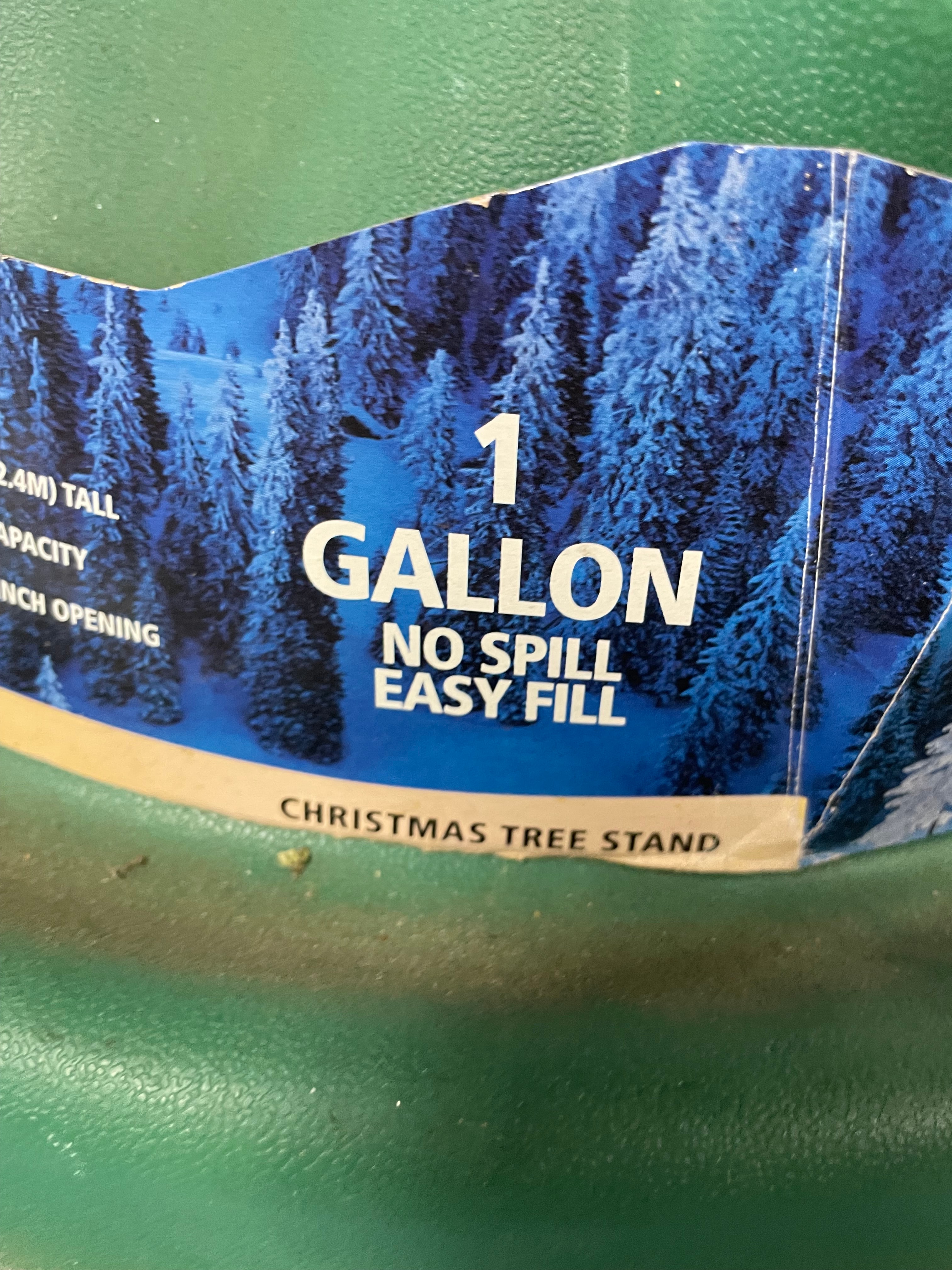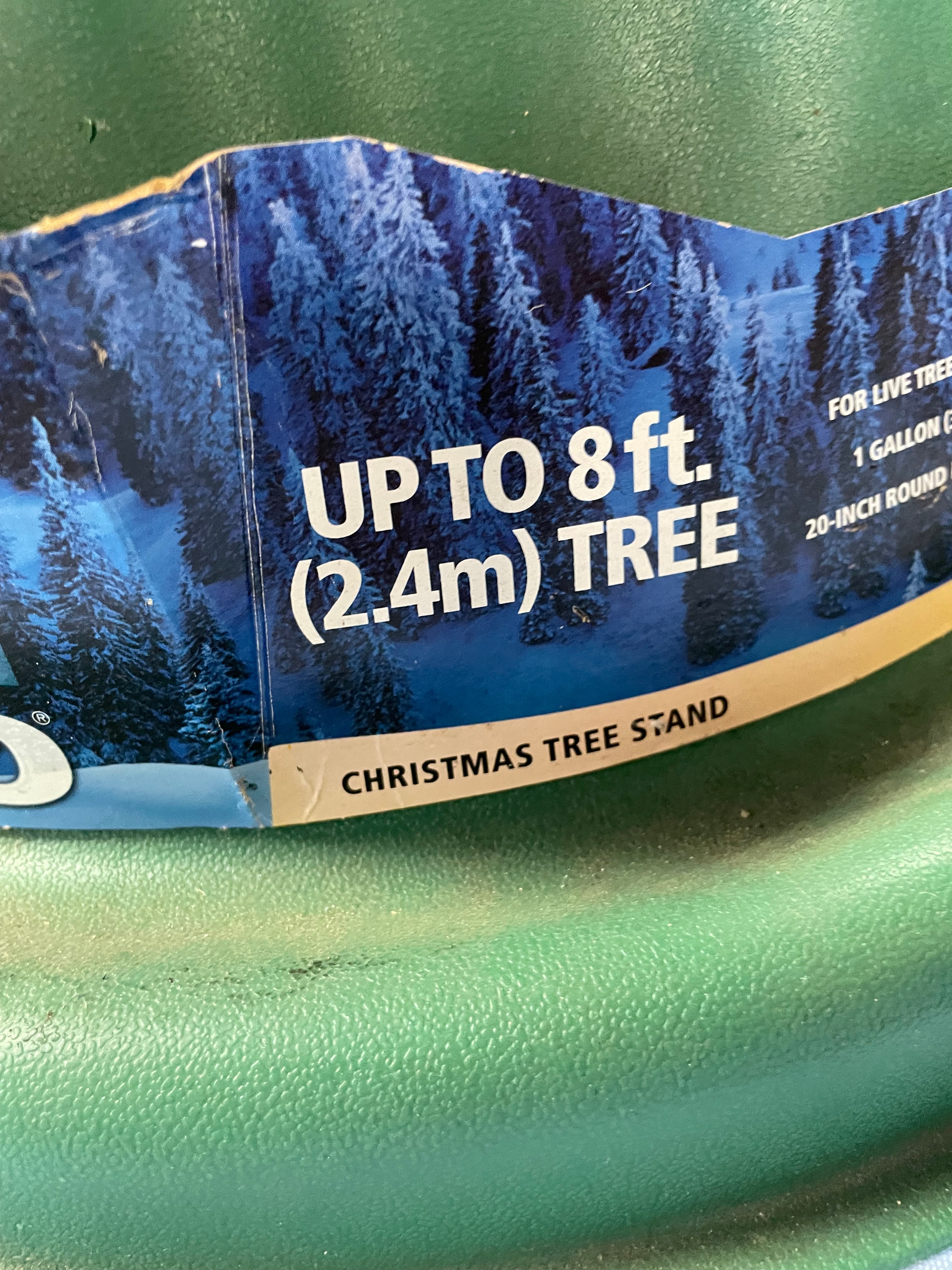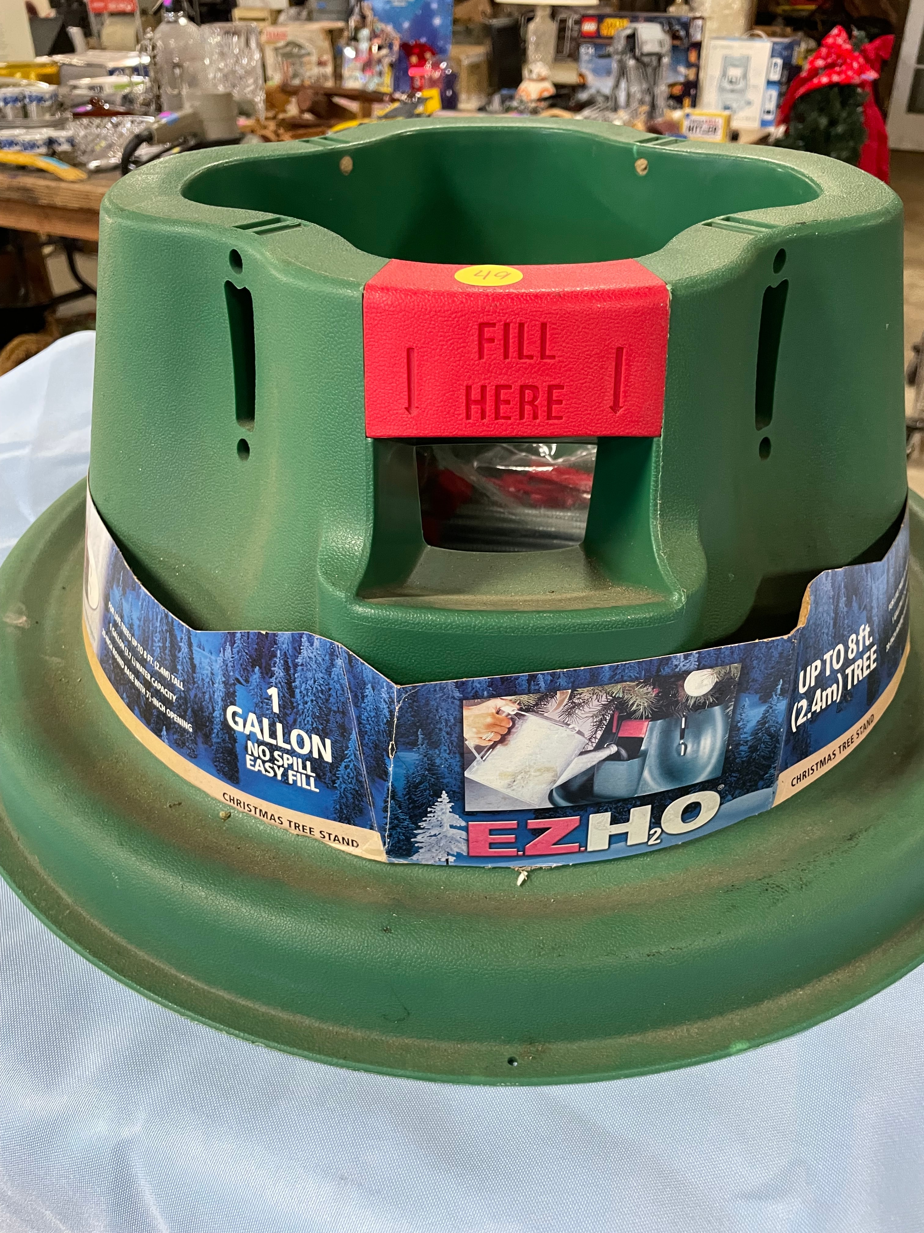 A green EZHO Christmas tree stand with red accents, designed for trees up to 8 ft. (2.4m) and featuring a 1 gallon no spill easy fill reservoir.