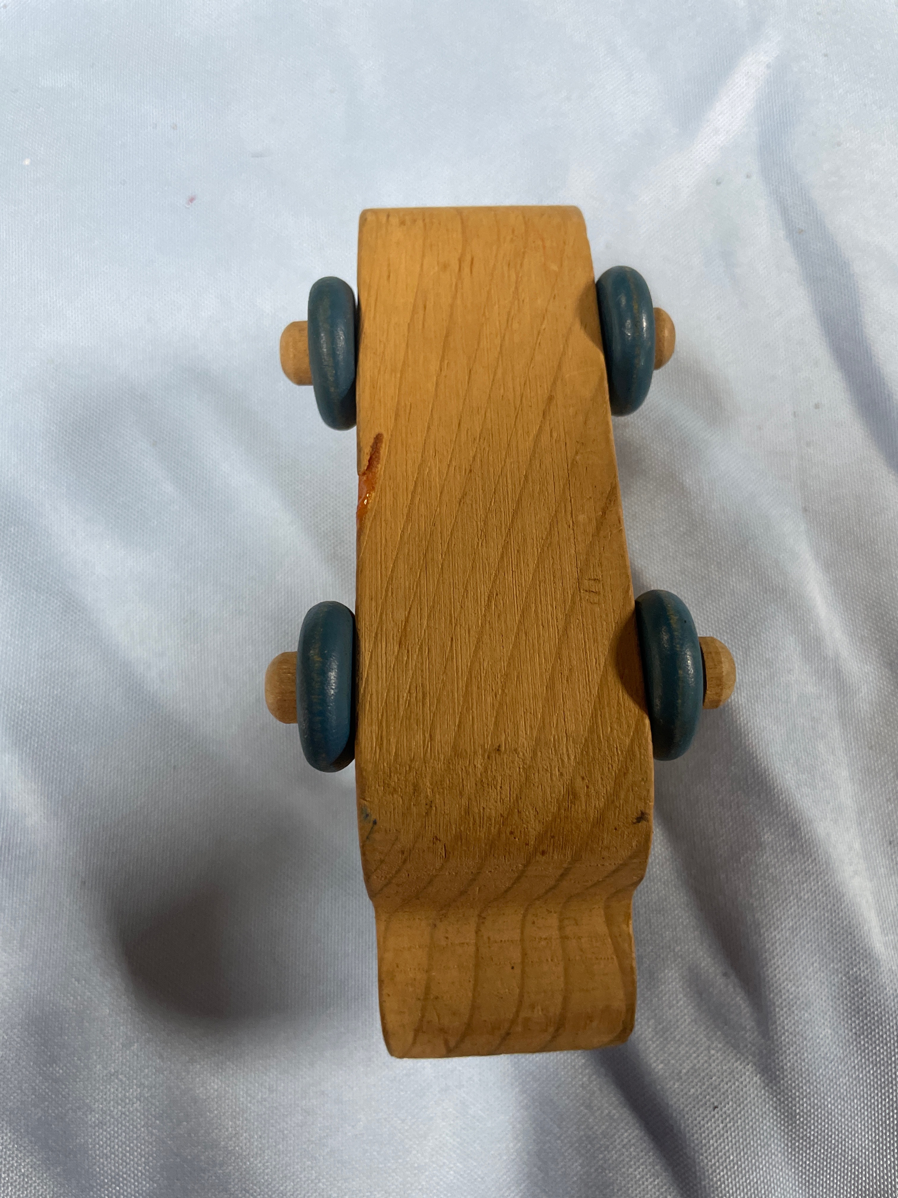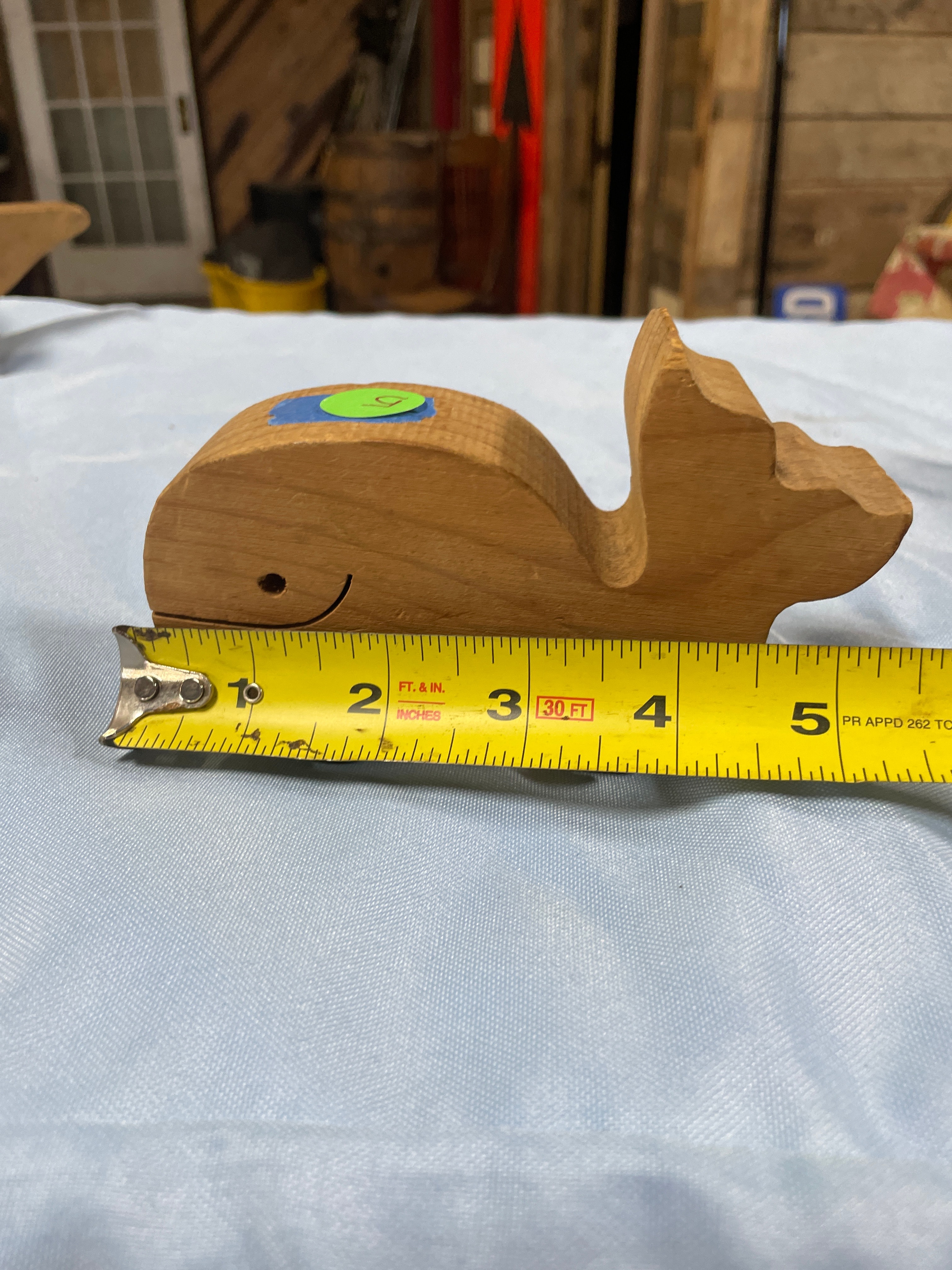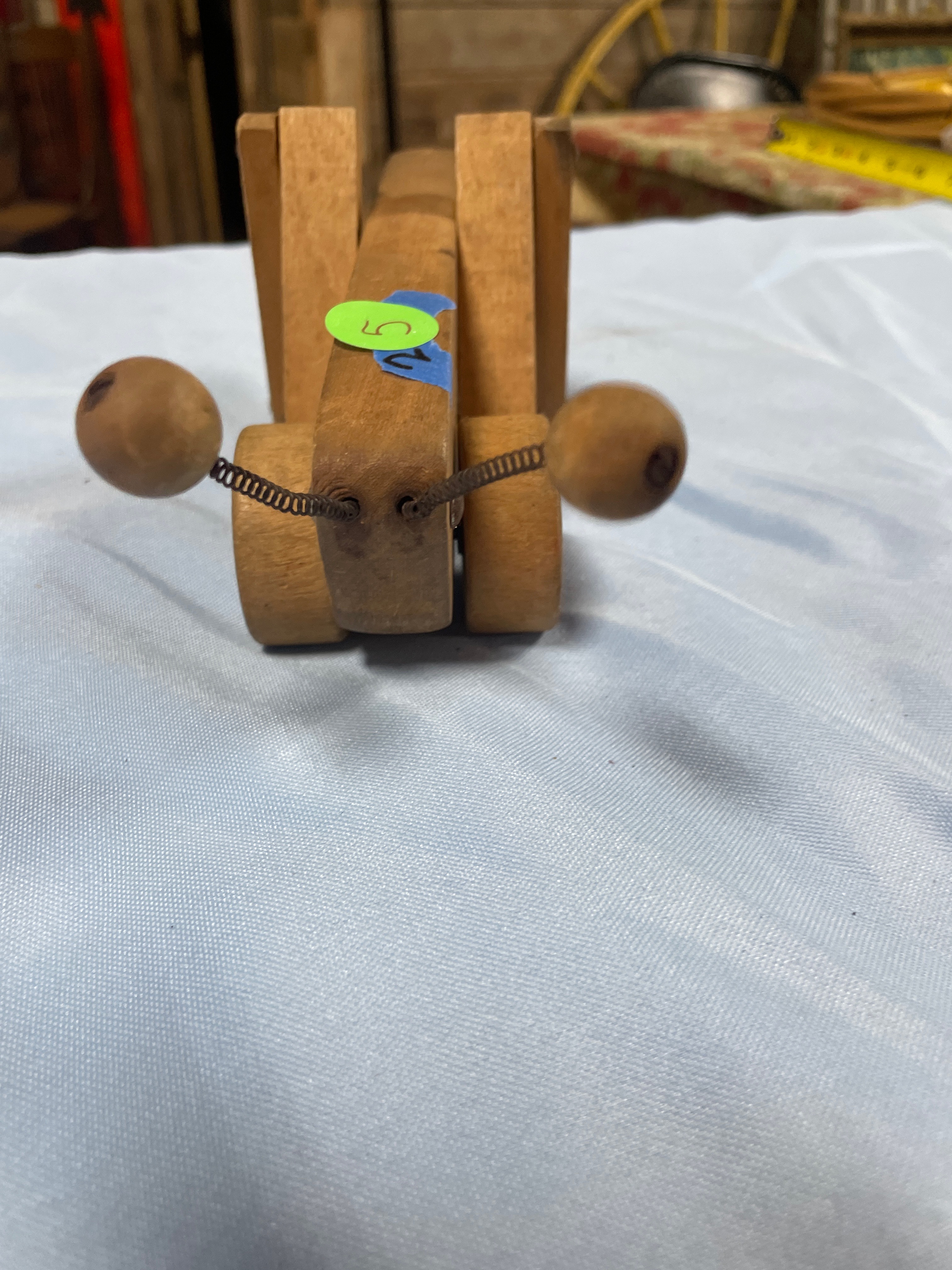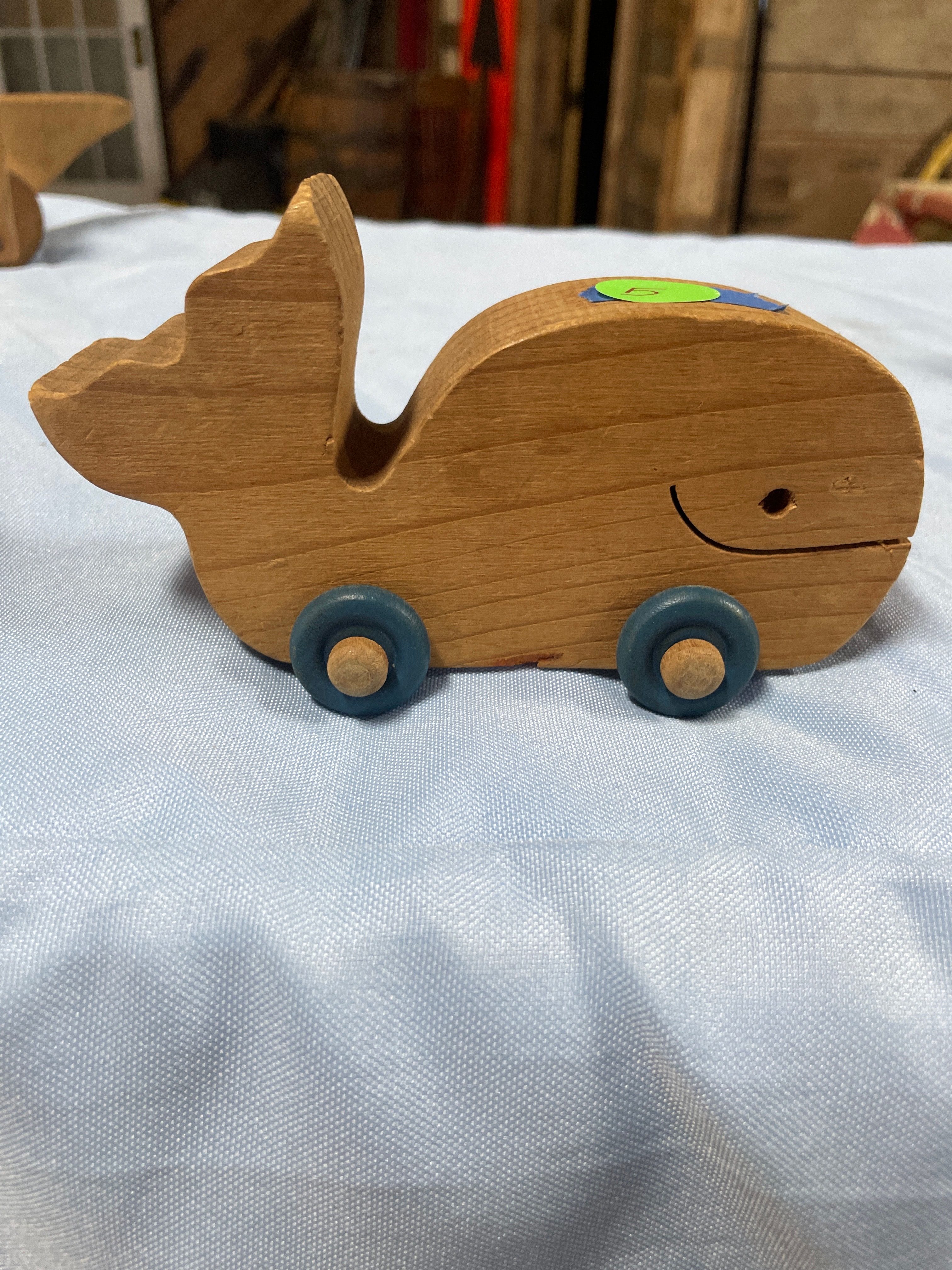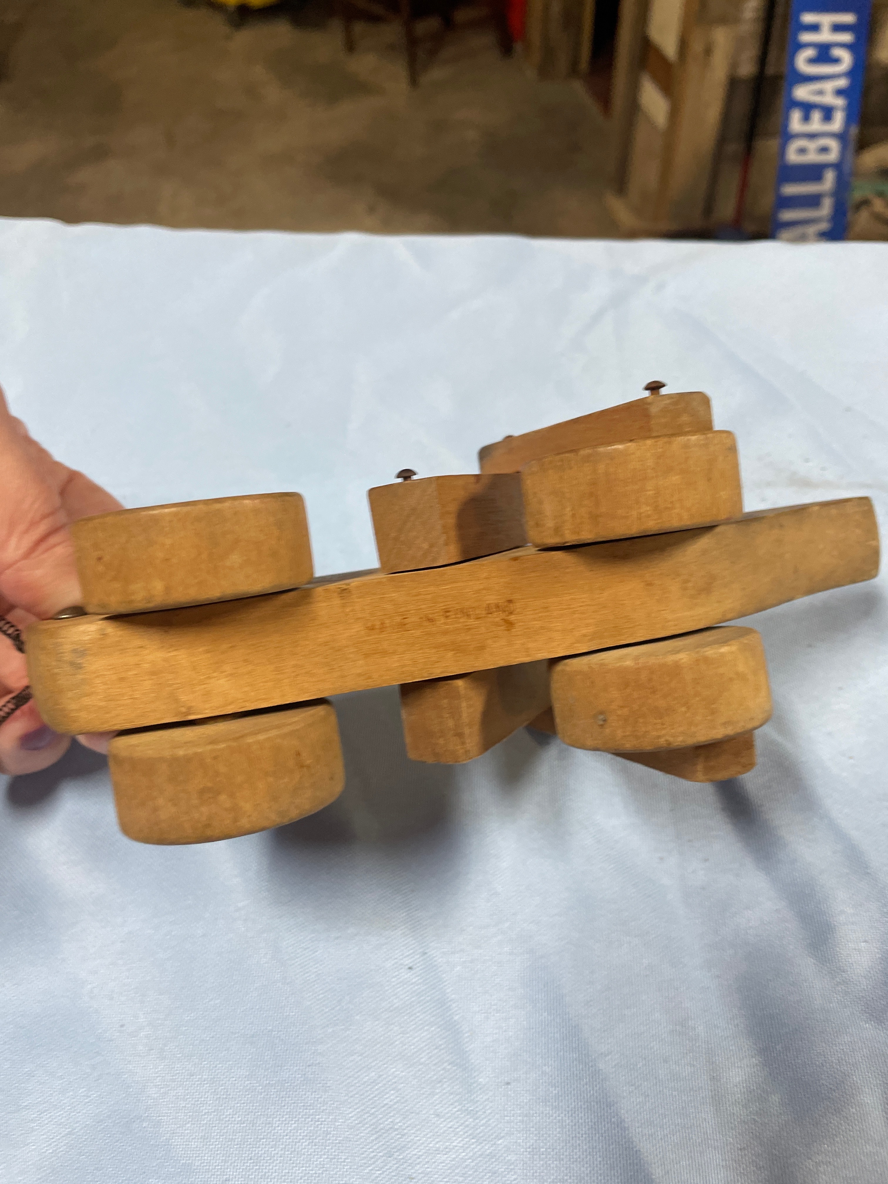 Two natural wood-colored pull-toys, including a whale with blue wheels and a grasshopper-like insect, the latter featuring ‘MADE IN ENGLAND’ impressed on its bottom; measuring approximately 4.5 to 6.5 inches long.