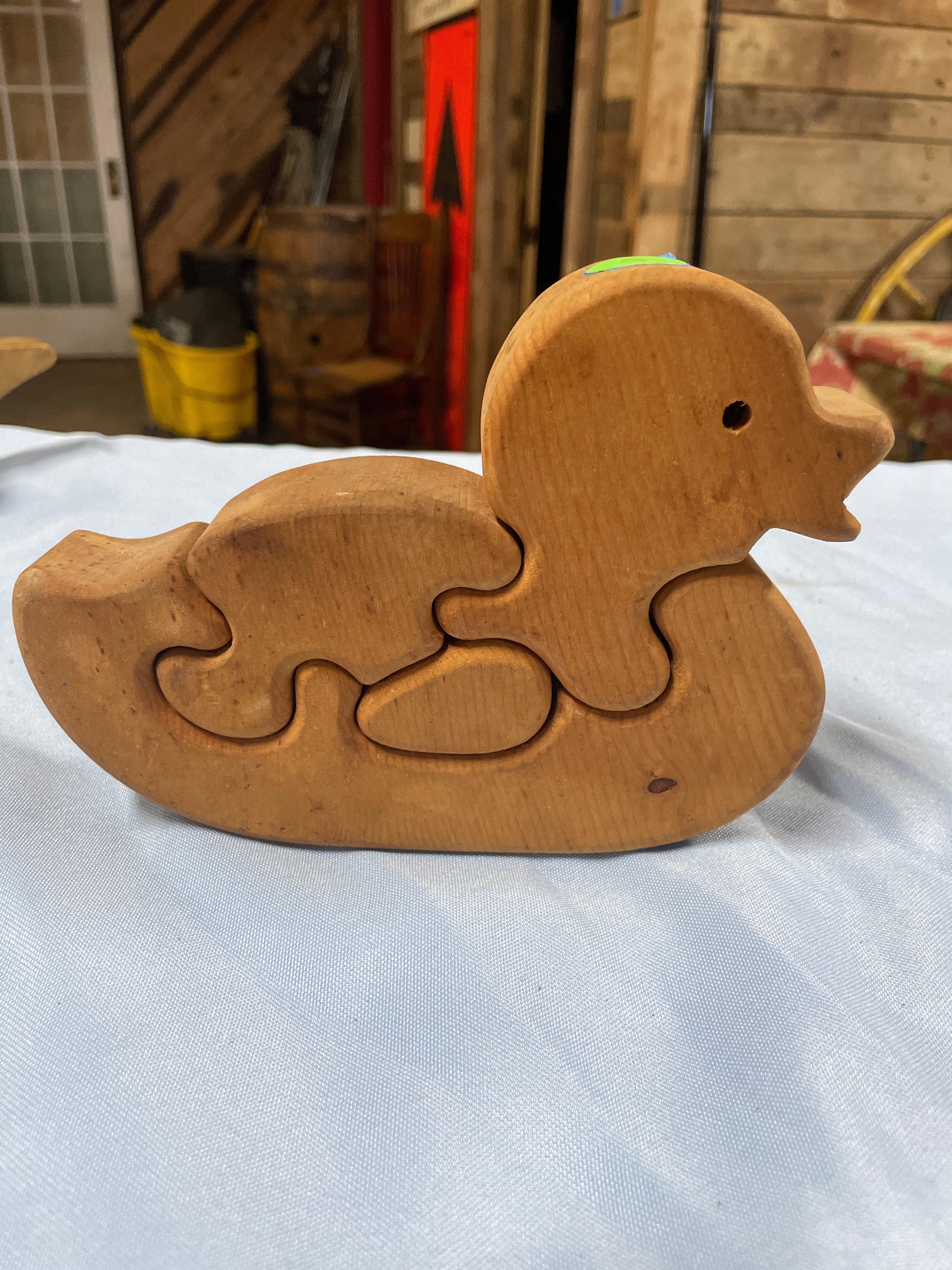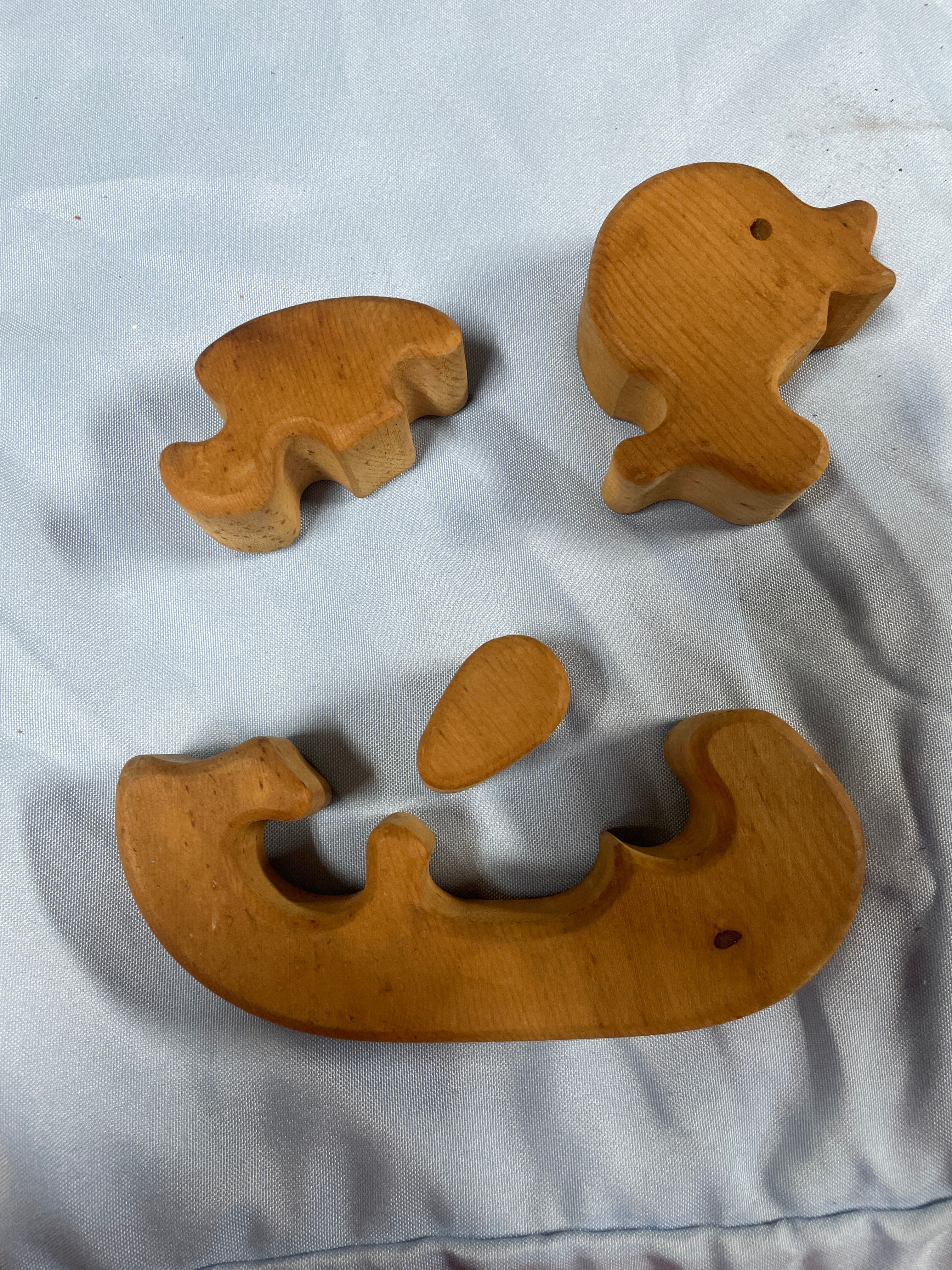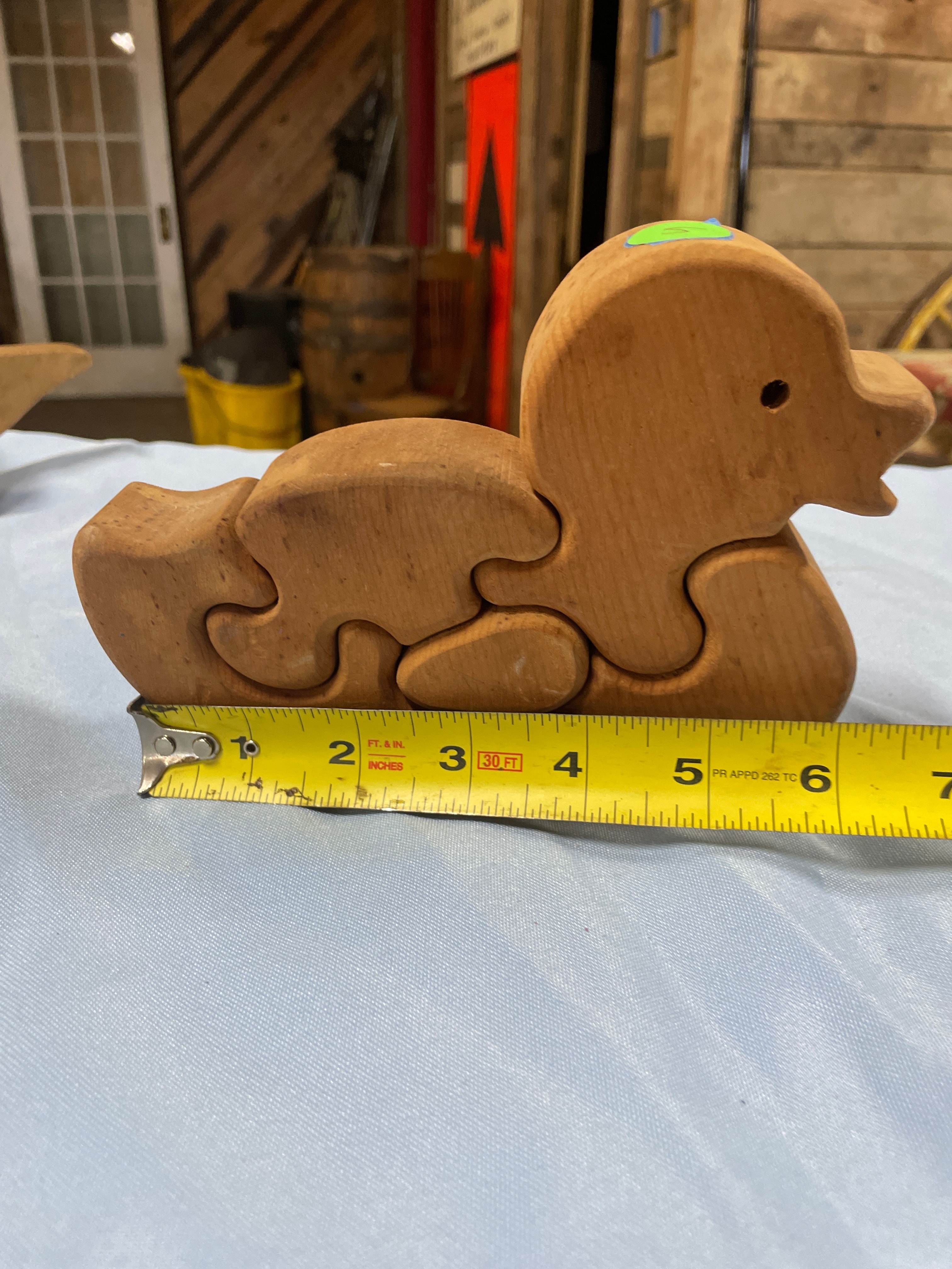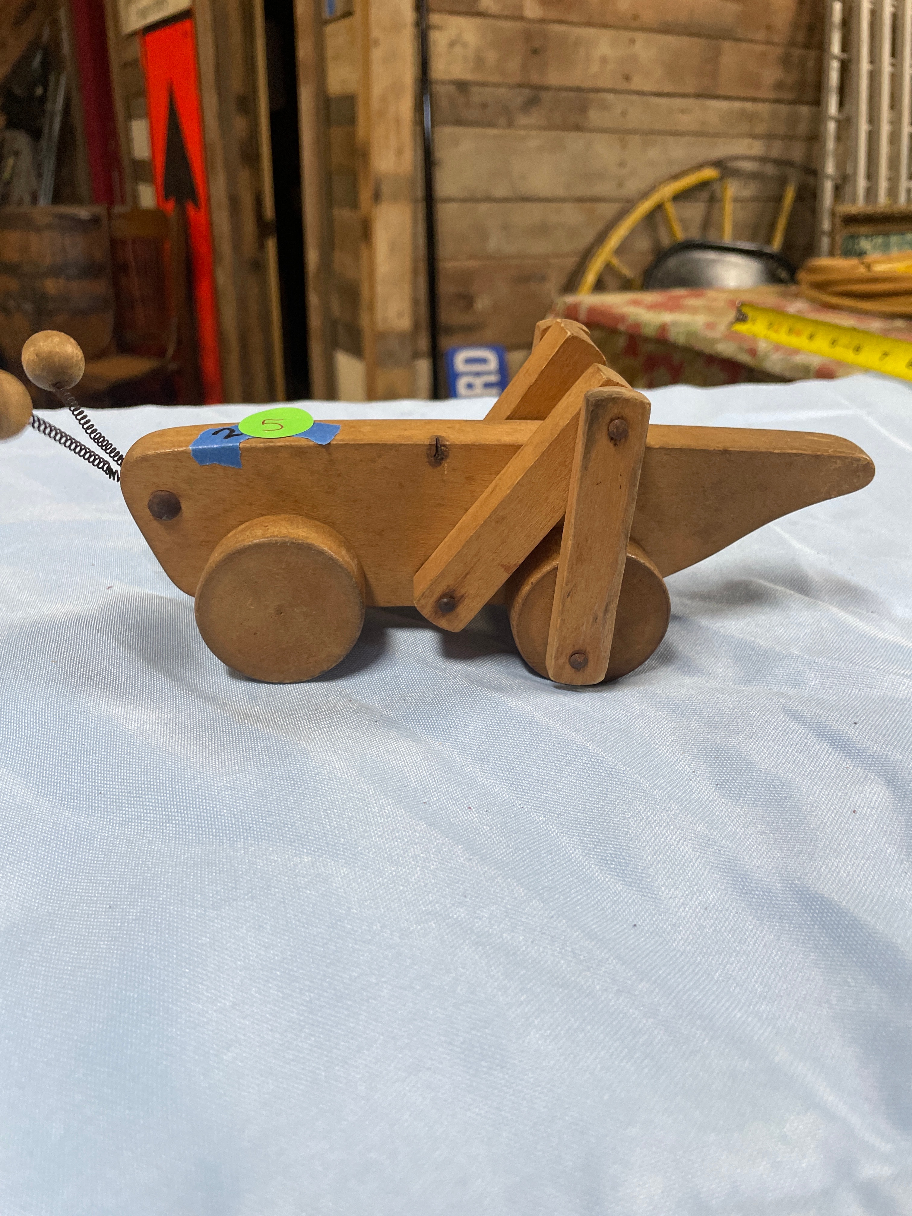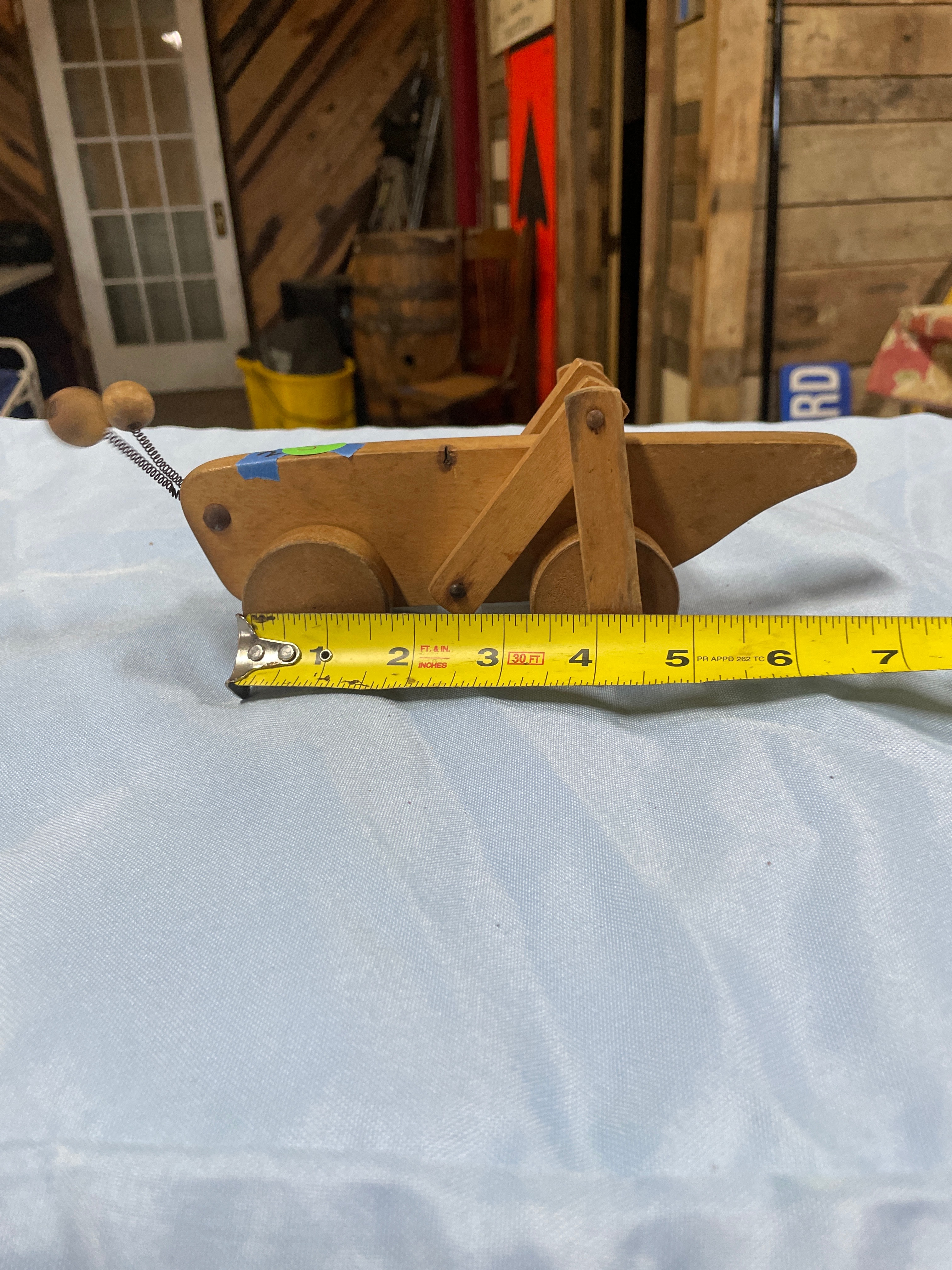 Two natural wood-colored pull-toys, including a whale with blue wheels and a grasshopper-like insect, the latter featuring ‘MADE IN ENGLAND’ impressed on its bottom; measuring approximately 4.5 to 6.5 inches long.