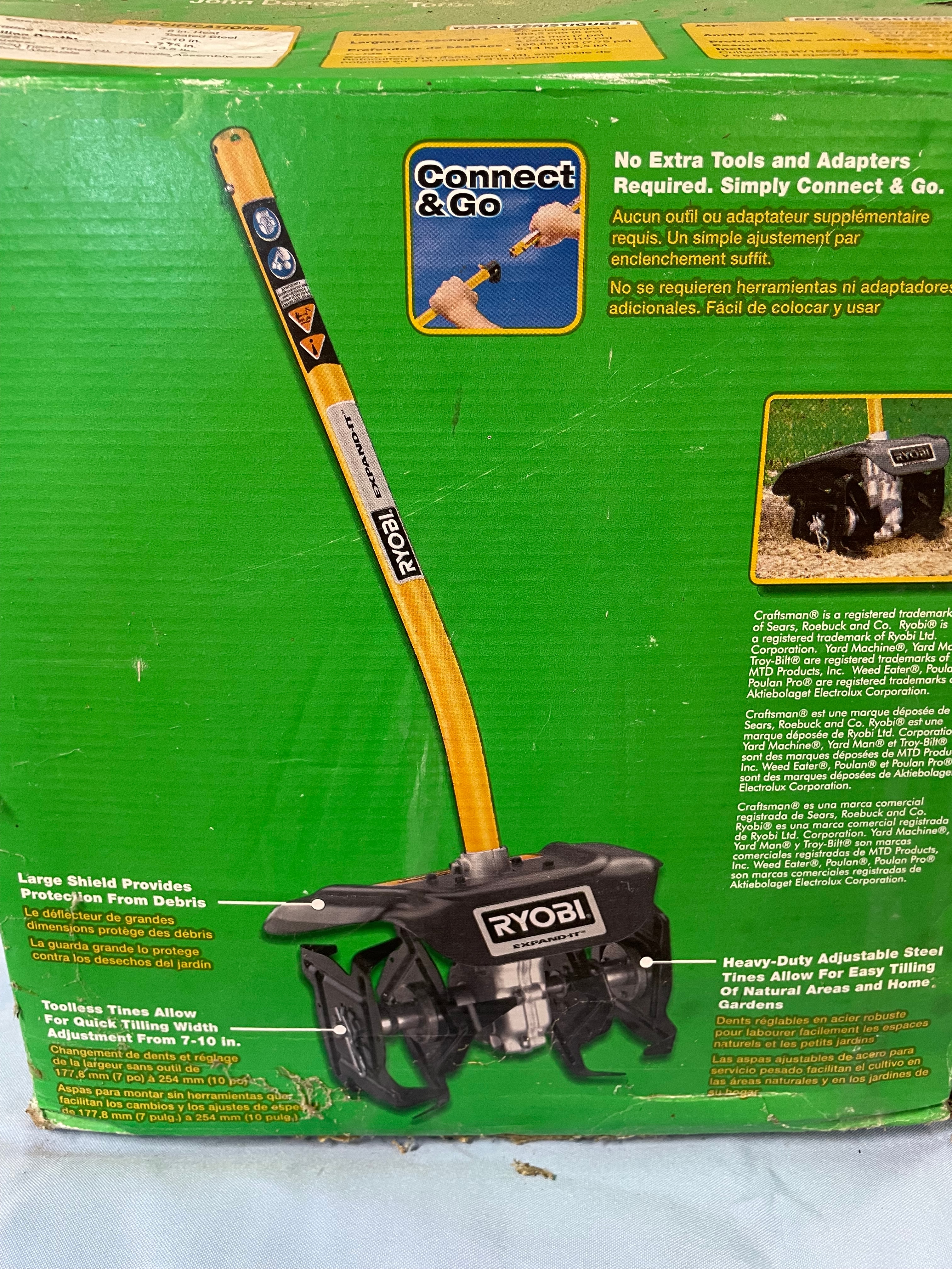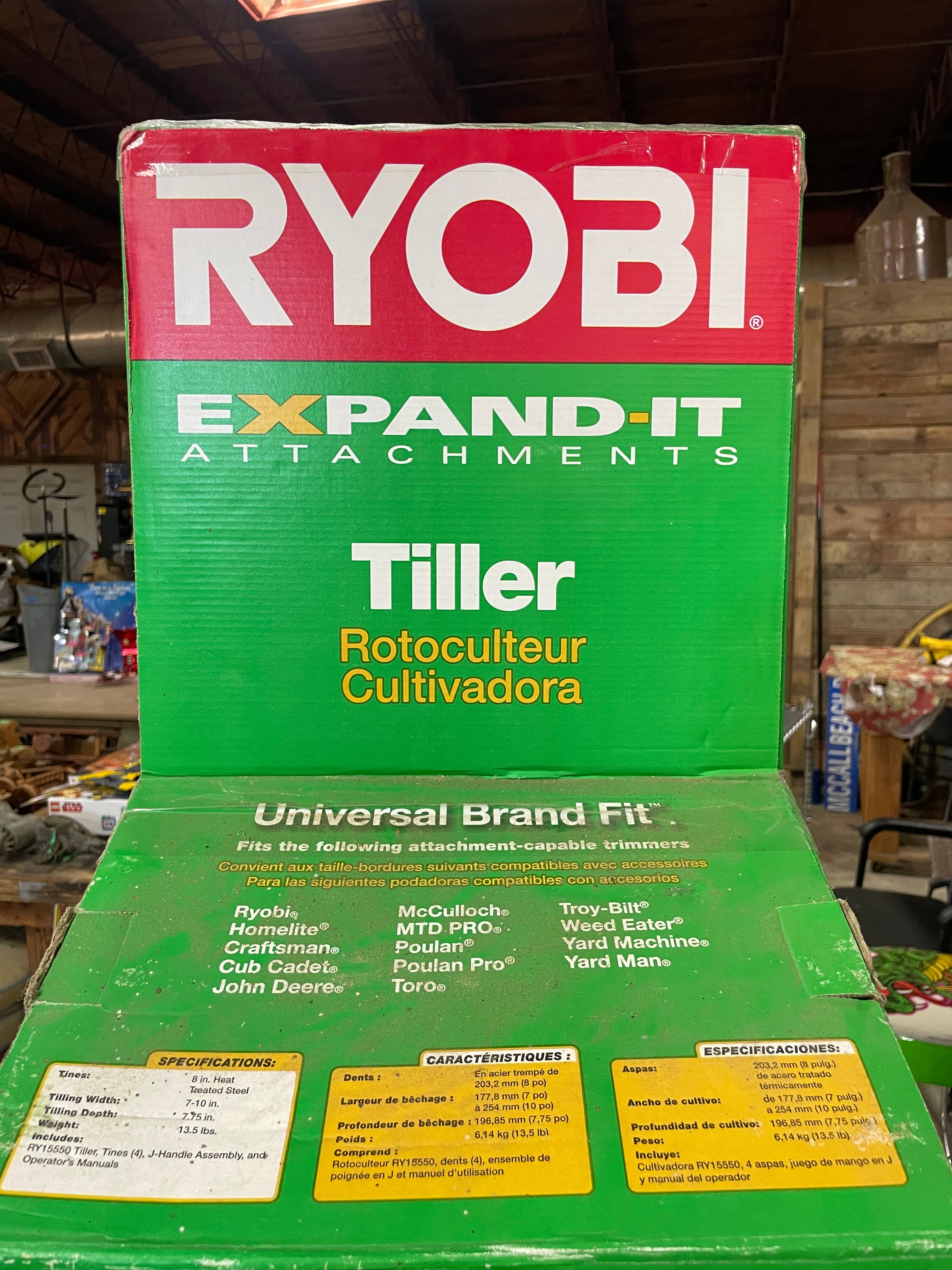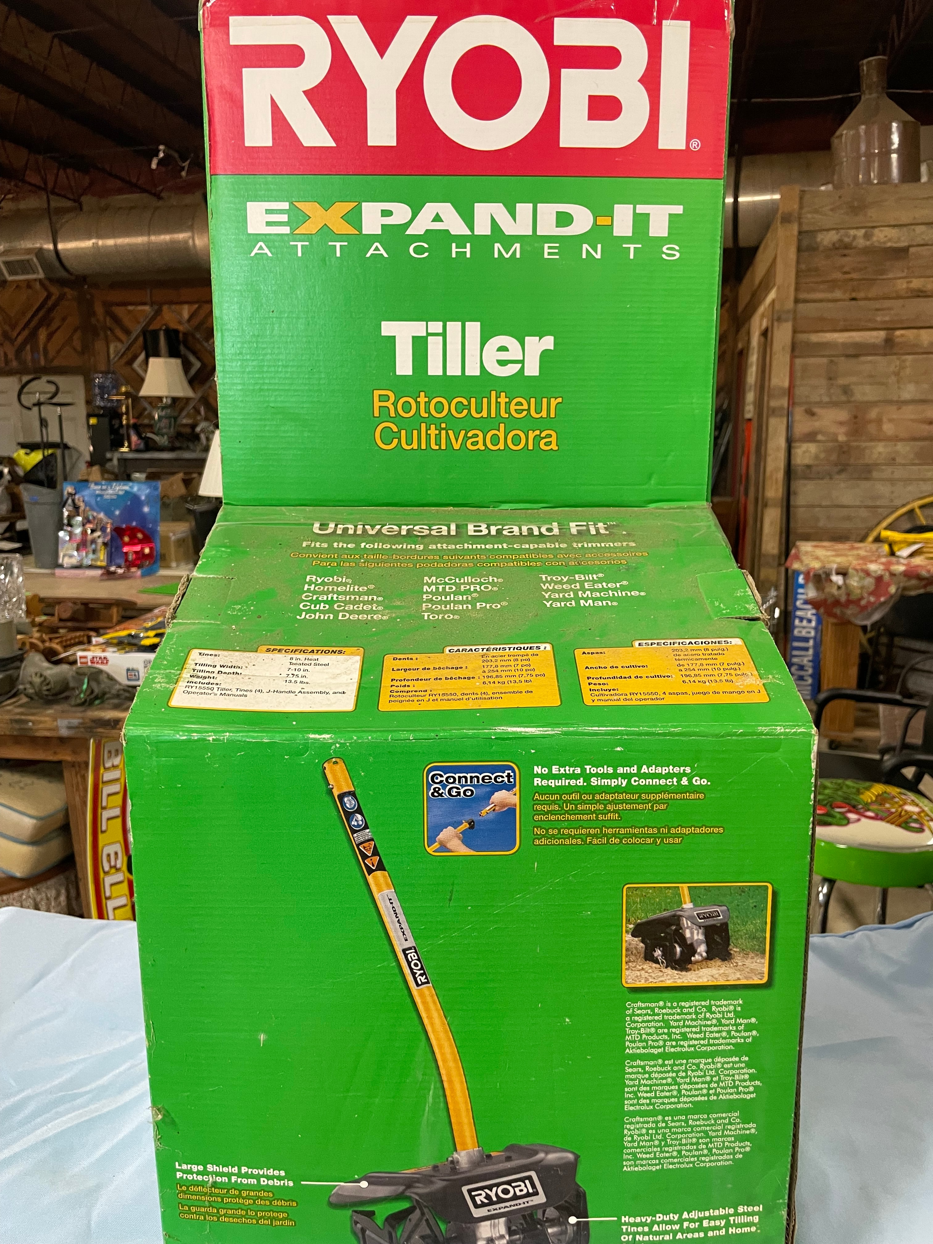 A new RYOBI EXPAND-IT Tiller attachment, still in its green and red cardboard packaging, features a yellow shaft, black tiller head, and adjustable tilling width from 7-10 inches.