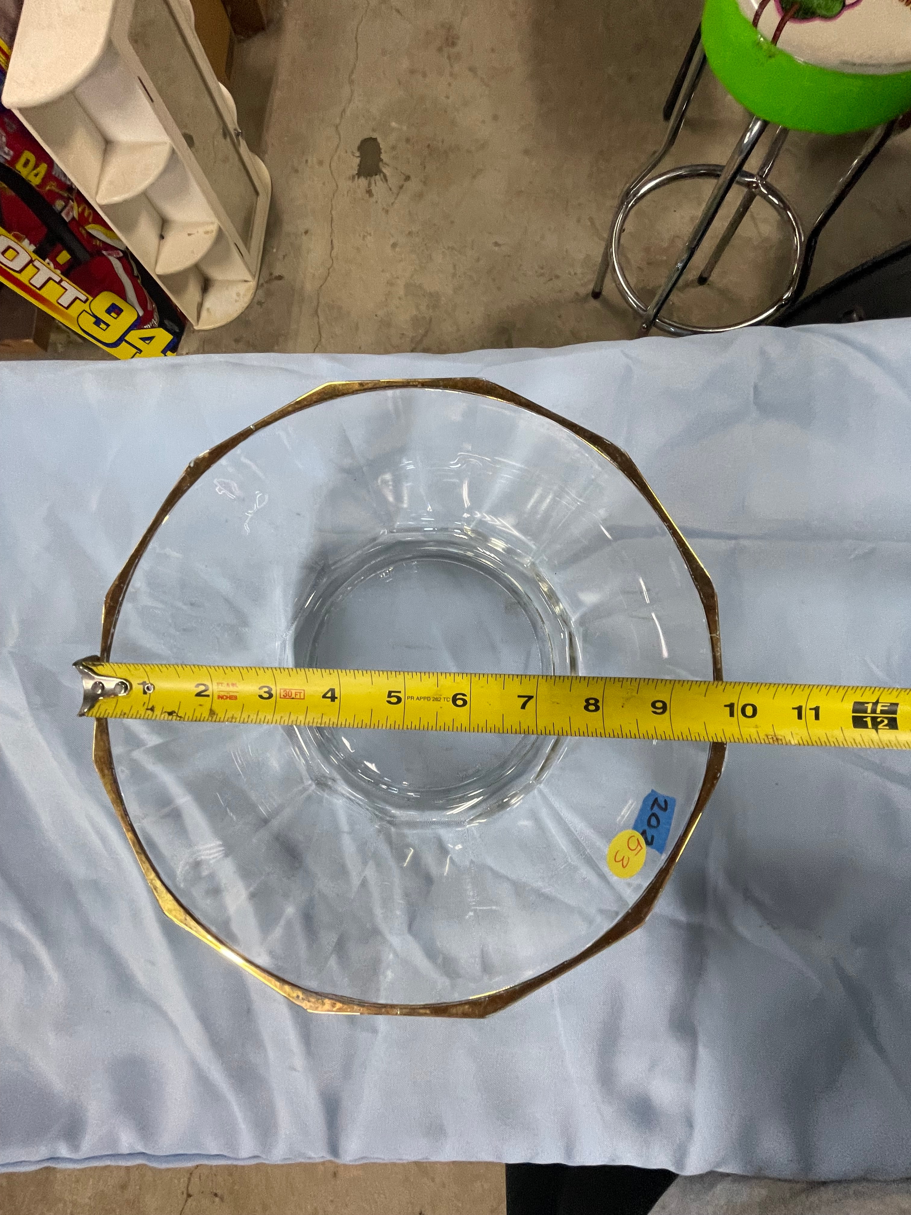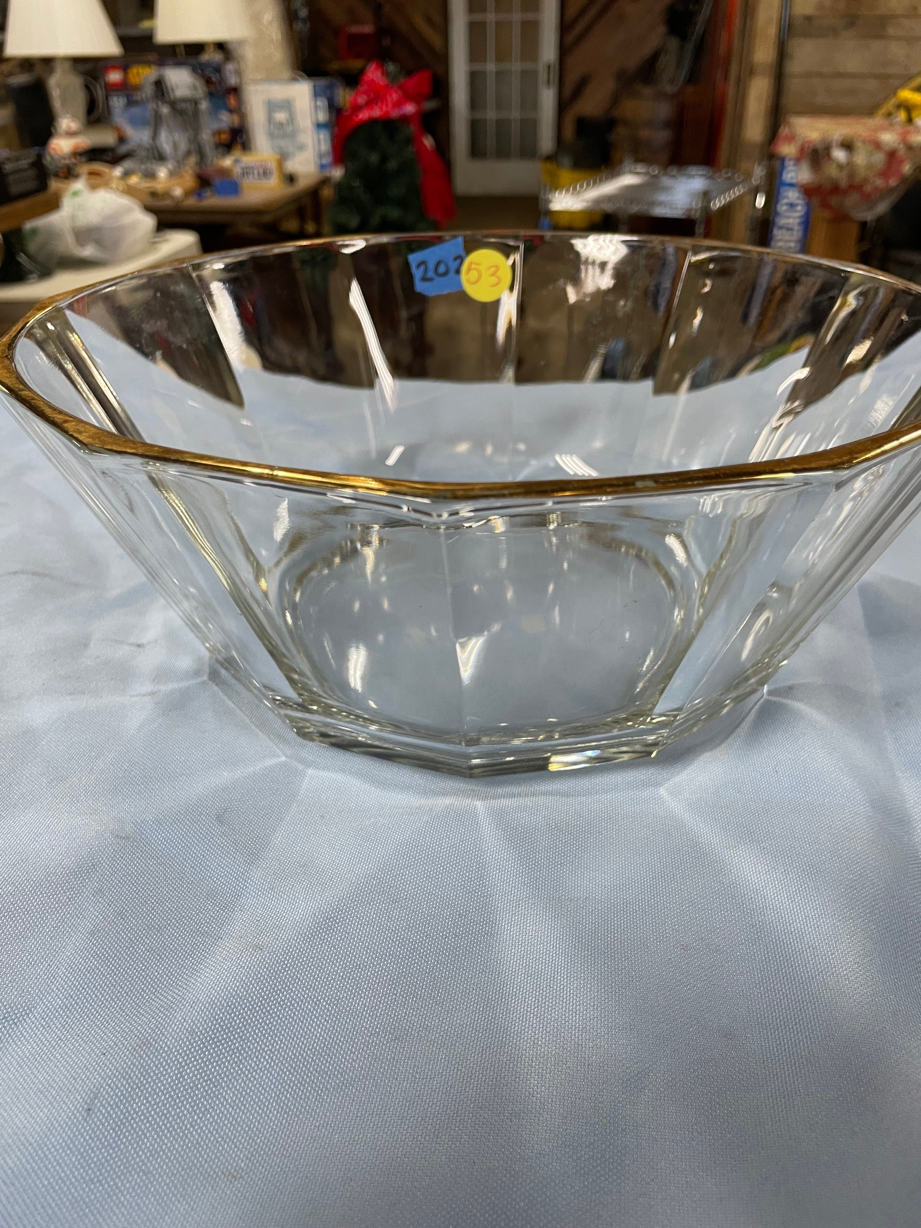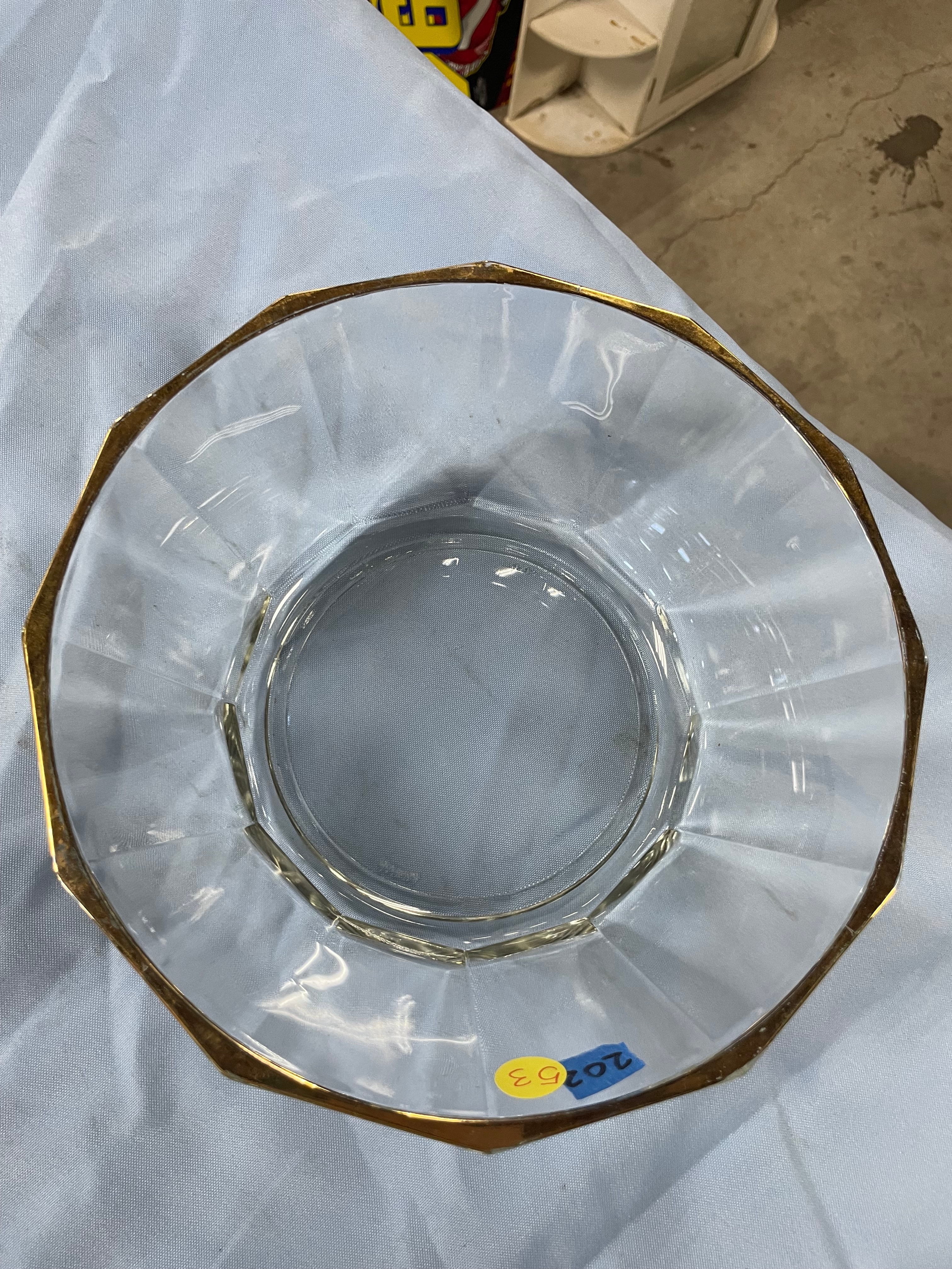 A Bormioli clear faceted glass serving bowl with a gold rim, measuring approximately 10 inches in diameter and 4.5 inches high.