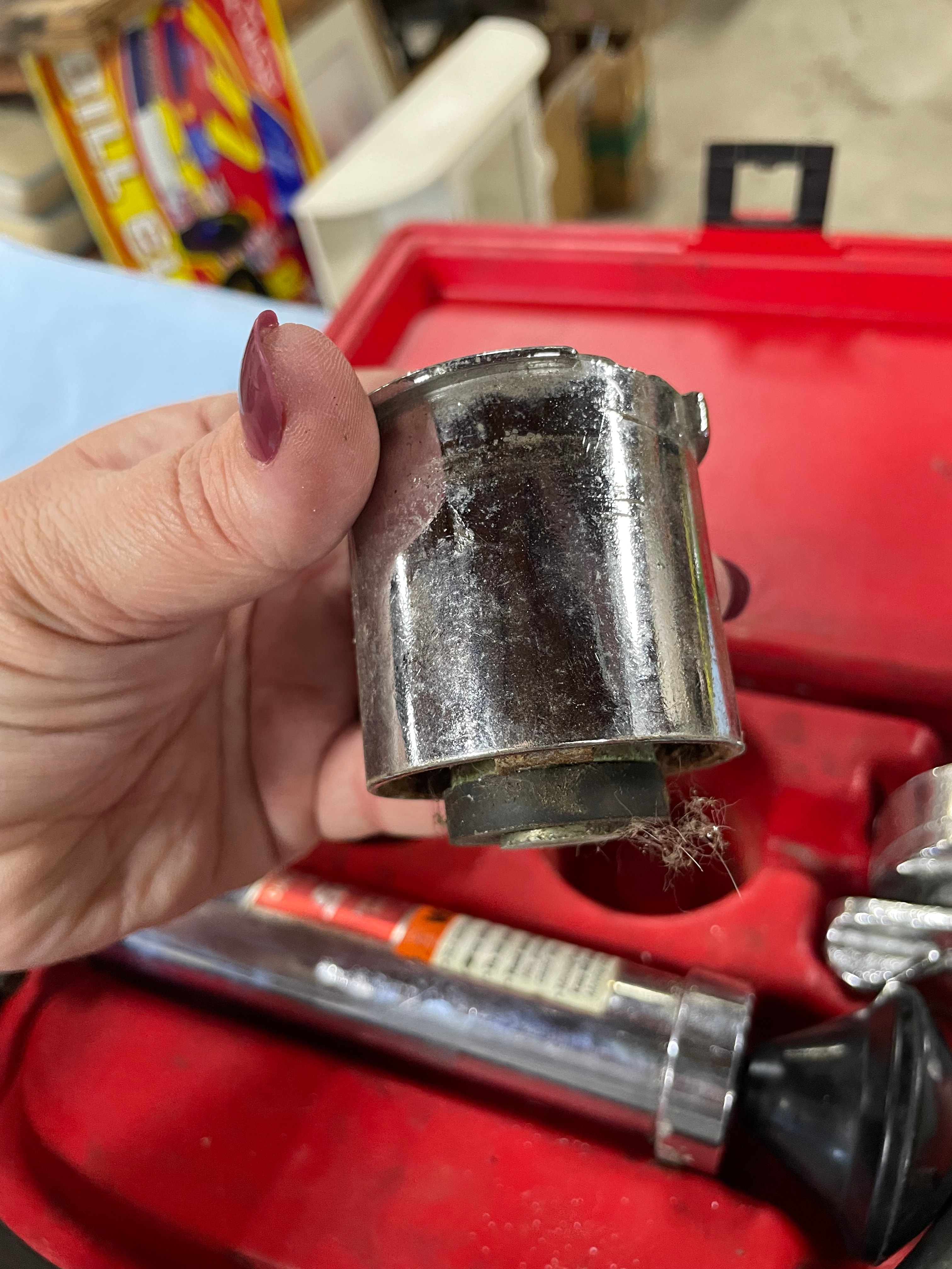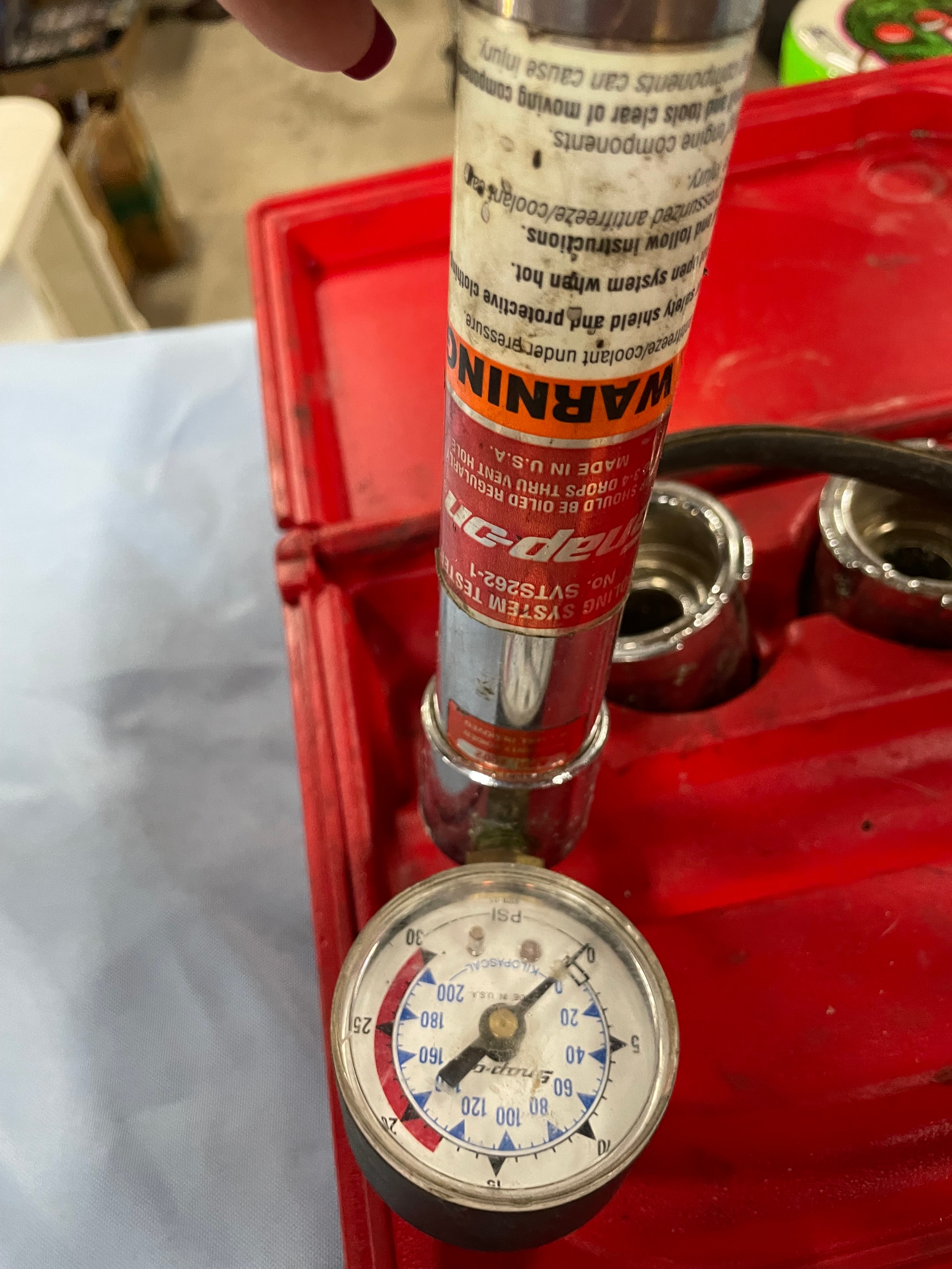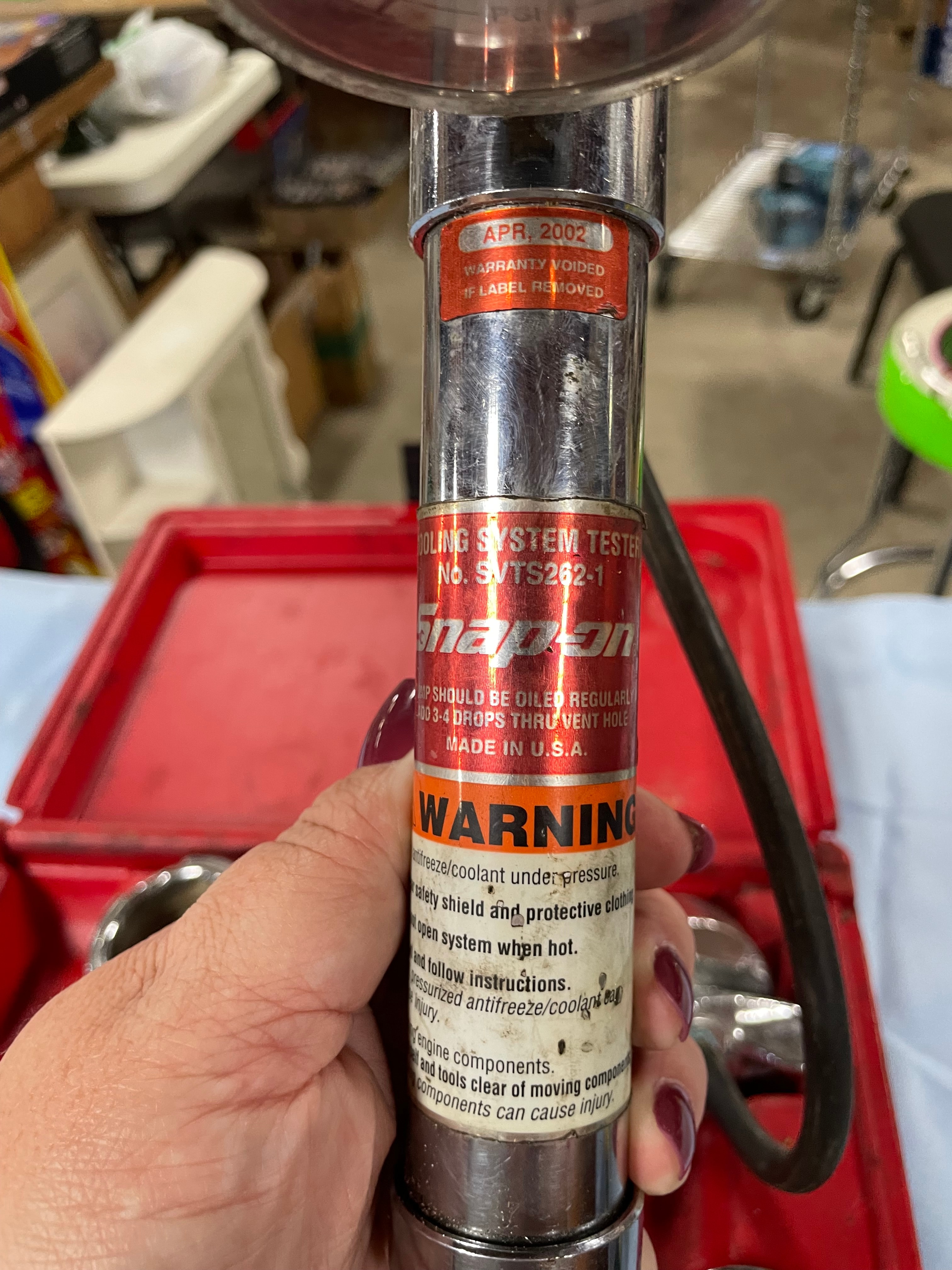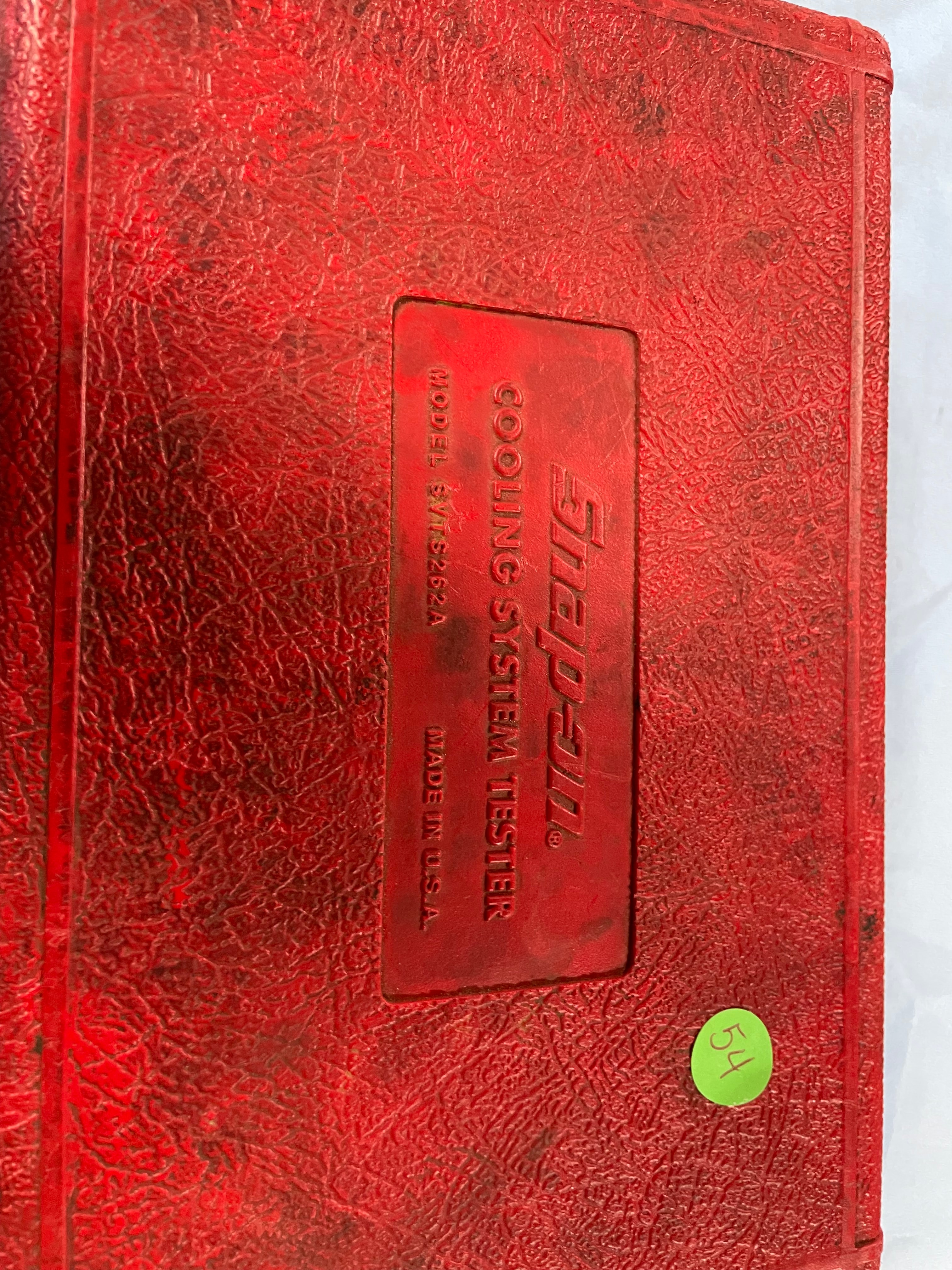 A red Snap-on cooling system tester kit, model SVTS262A, with pump, gauge, and adapters in a plastic case.