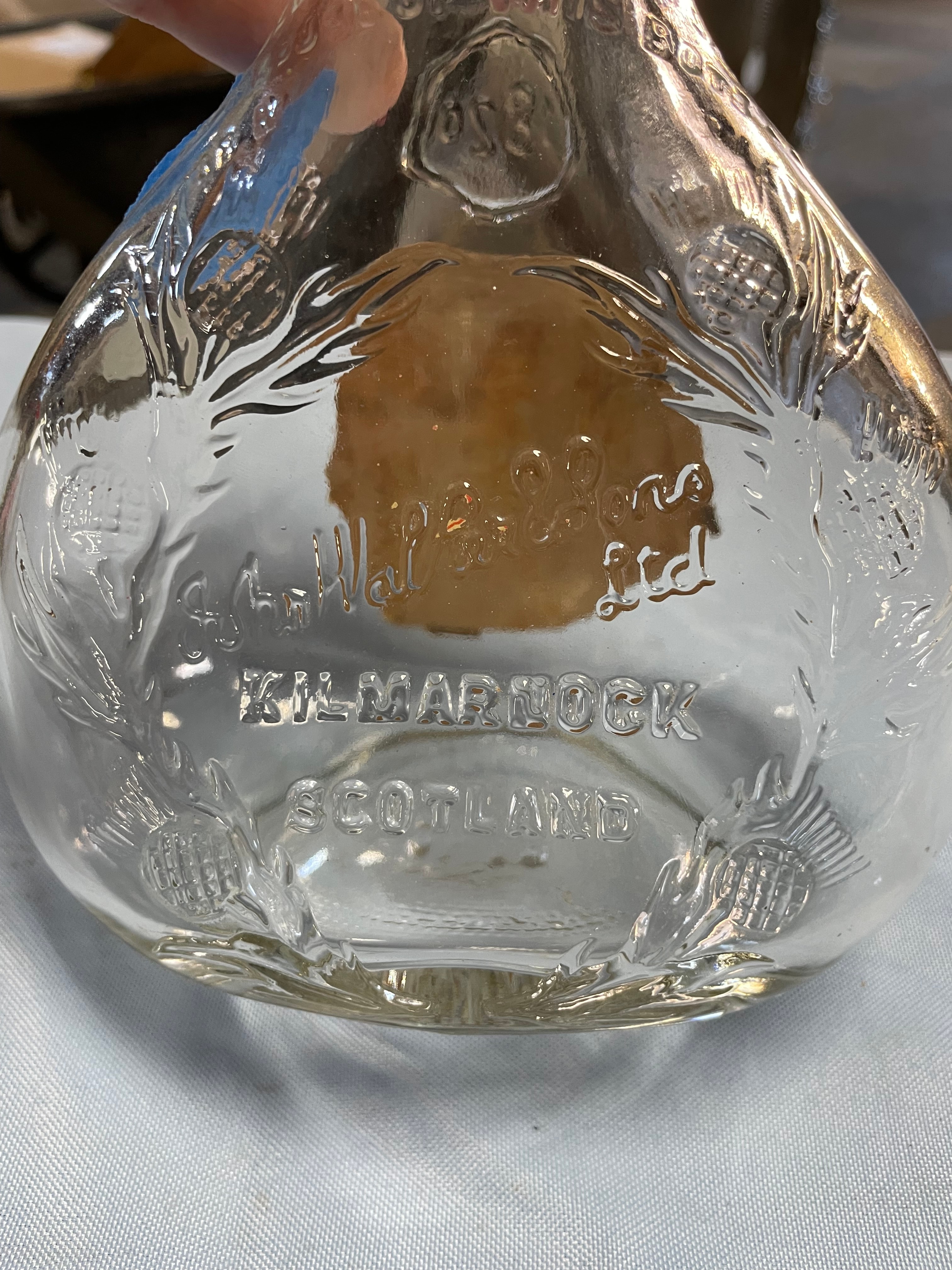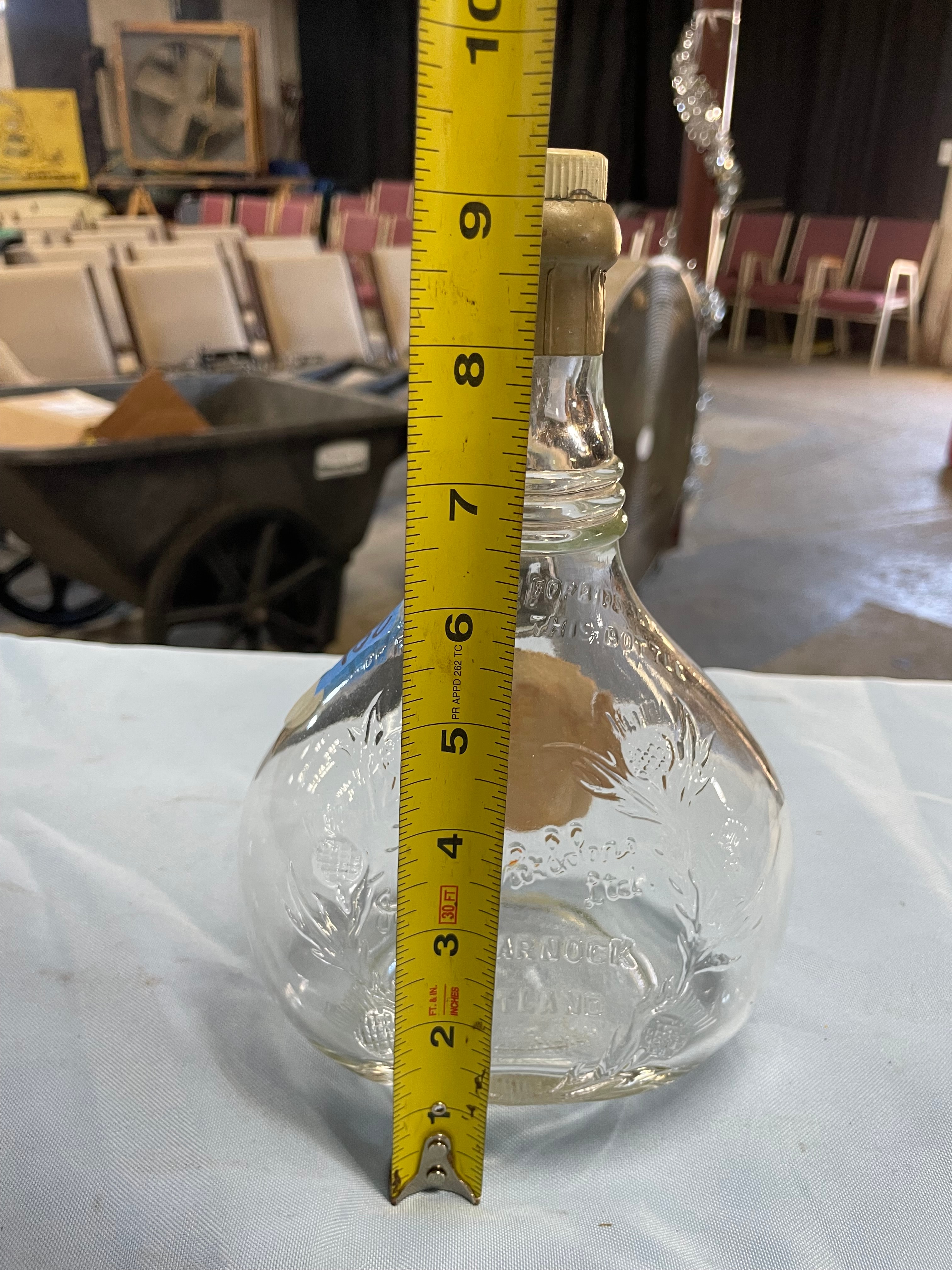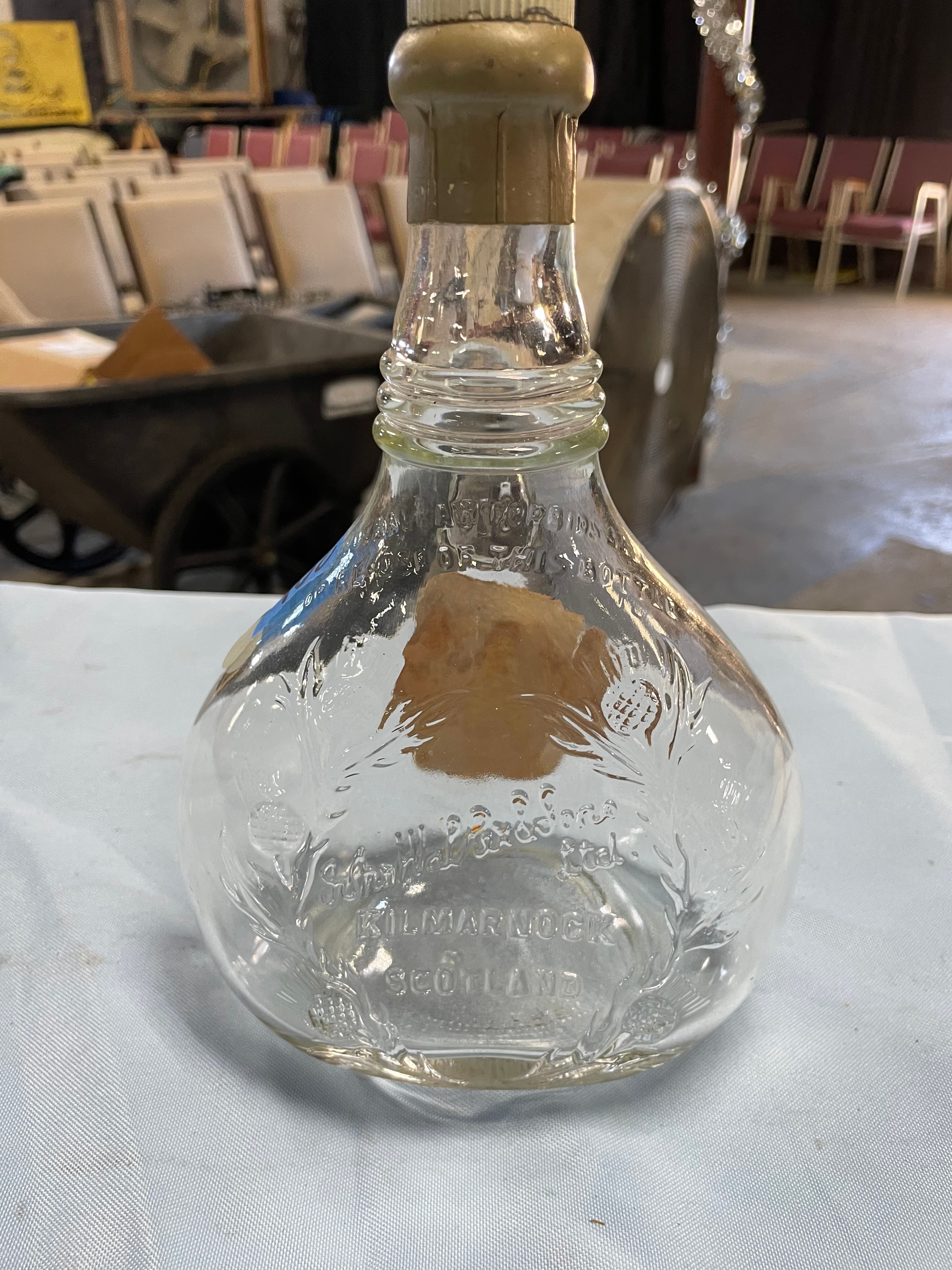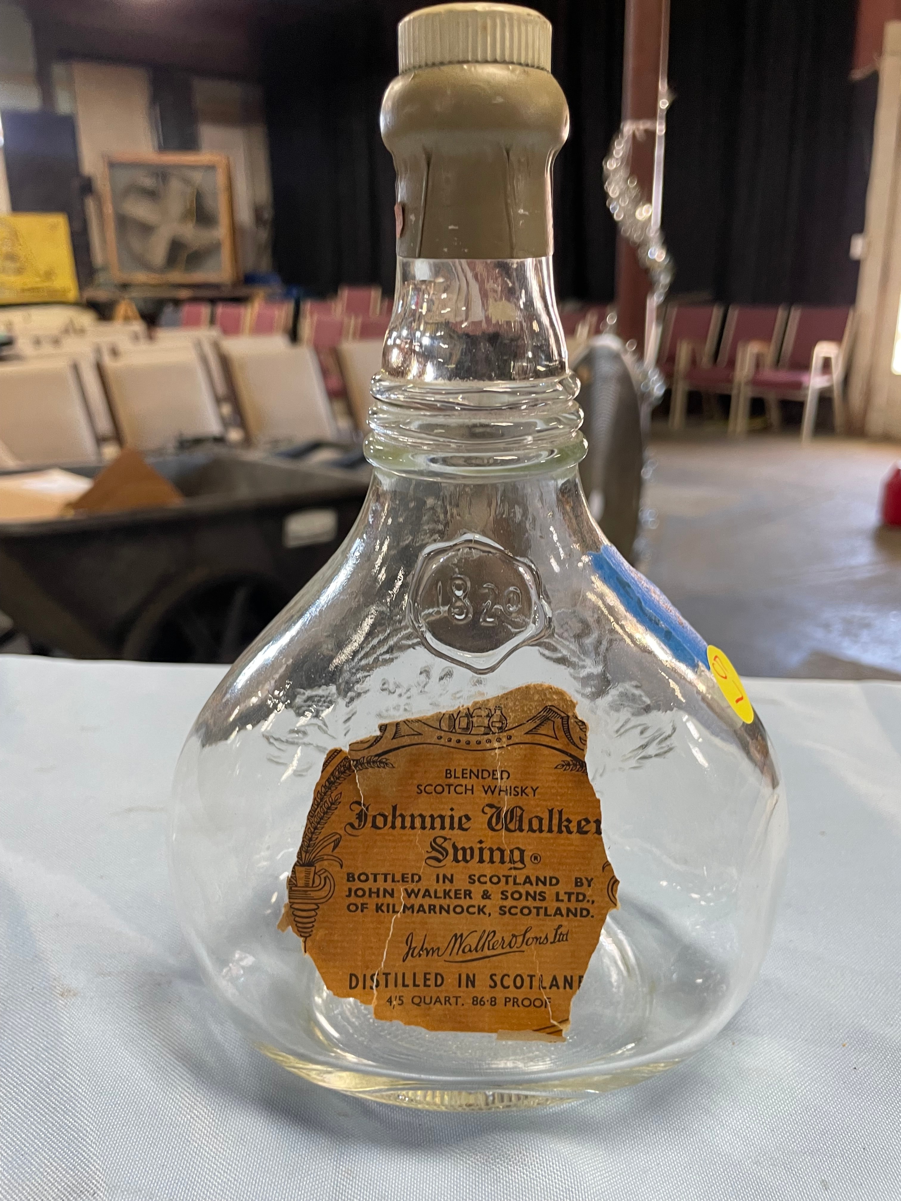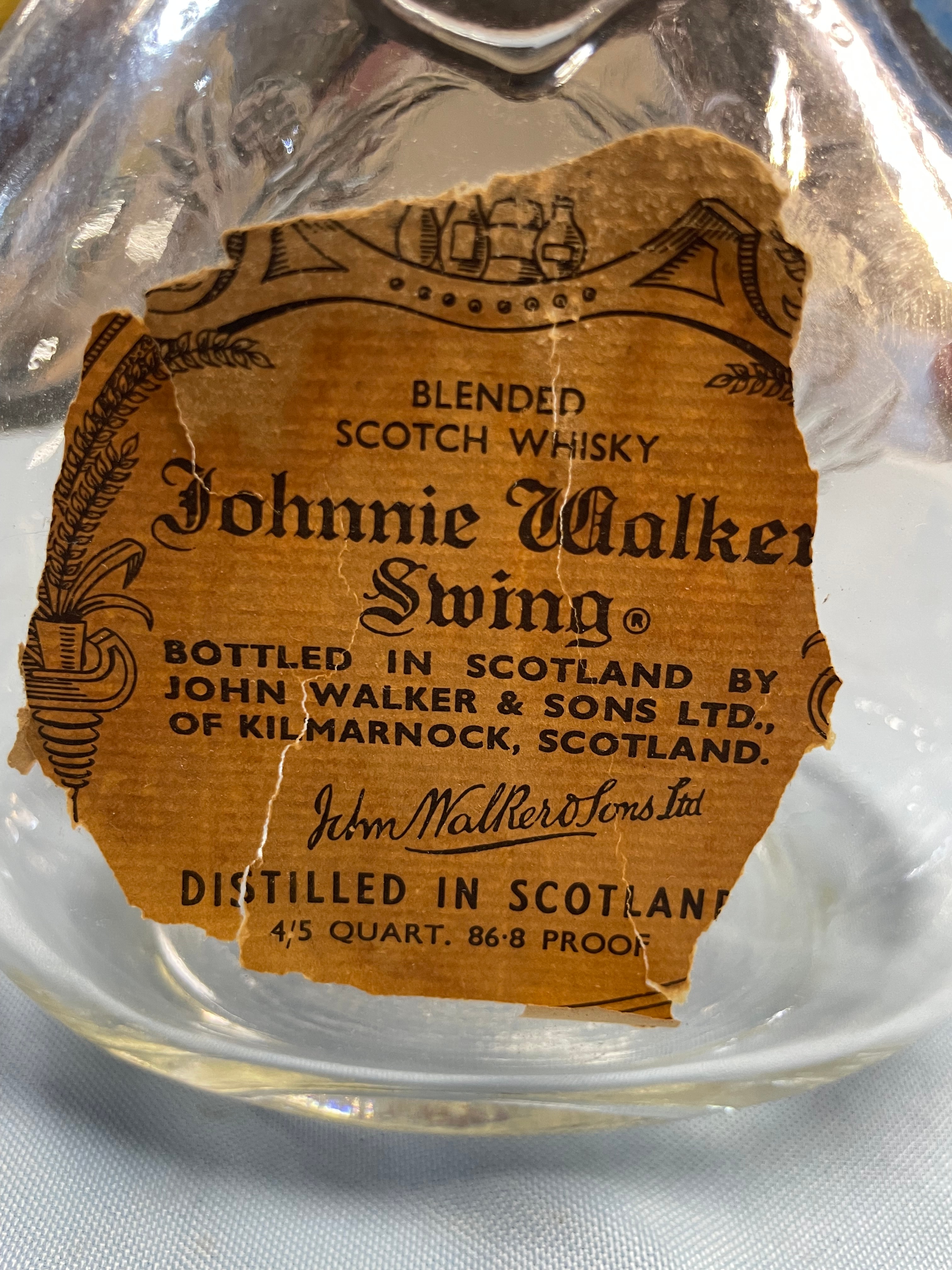 An empty clear glass Johnnie Walker Swing Blended Scotch Whisky bottle, approximately 9 inches tall, featuring a torn tan label, embossed glass text, and a gold-colored cap.