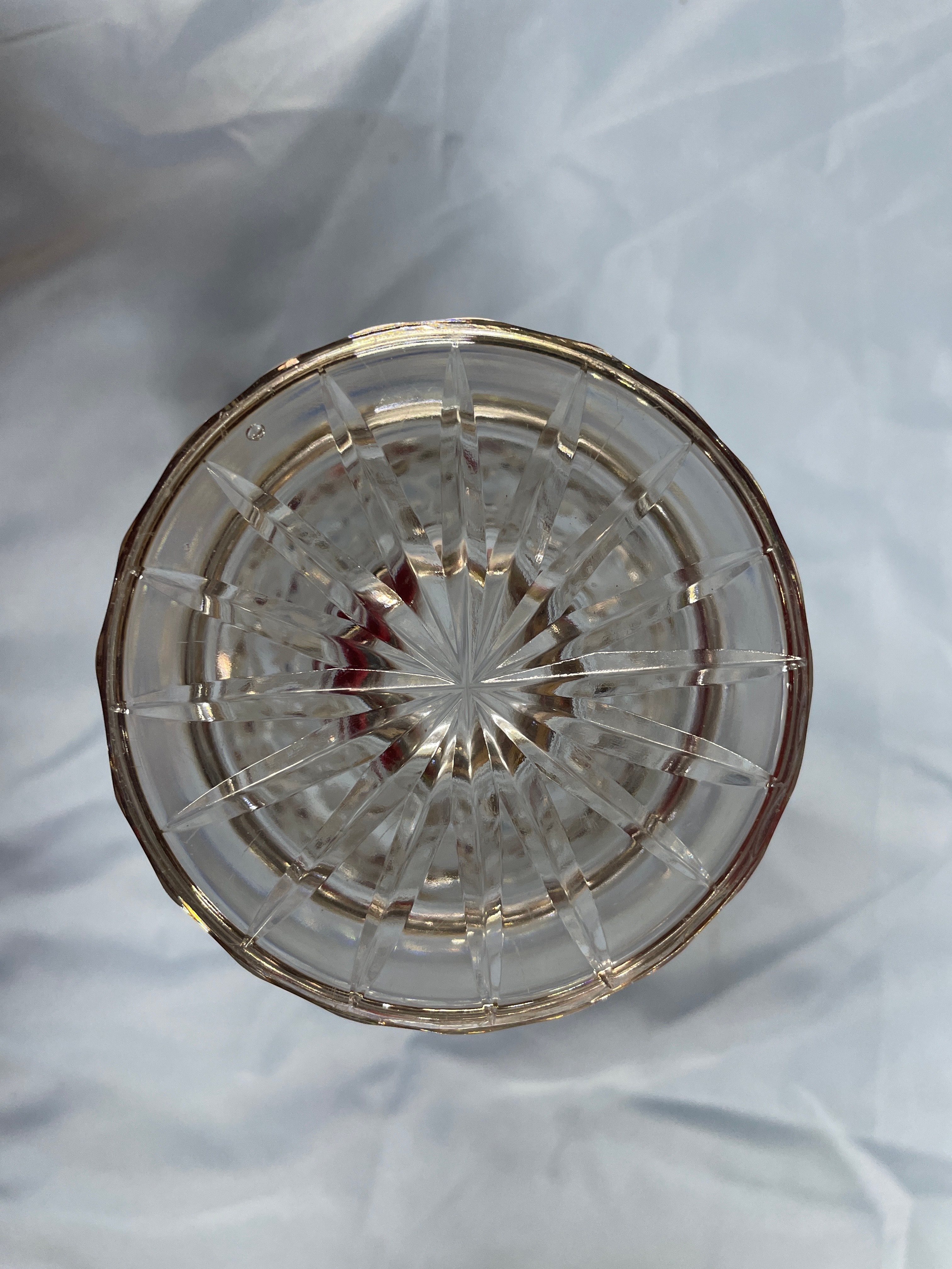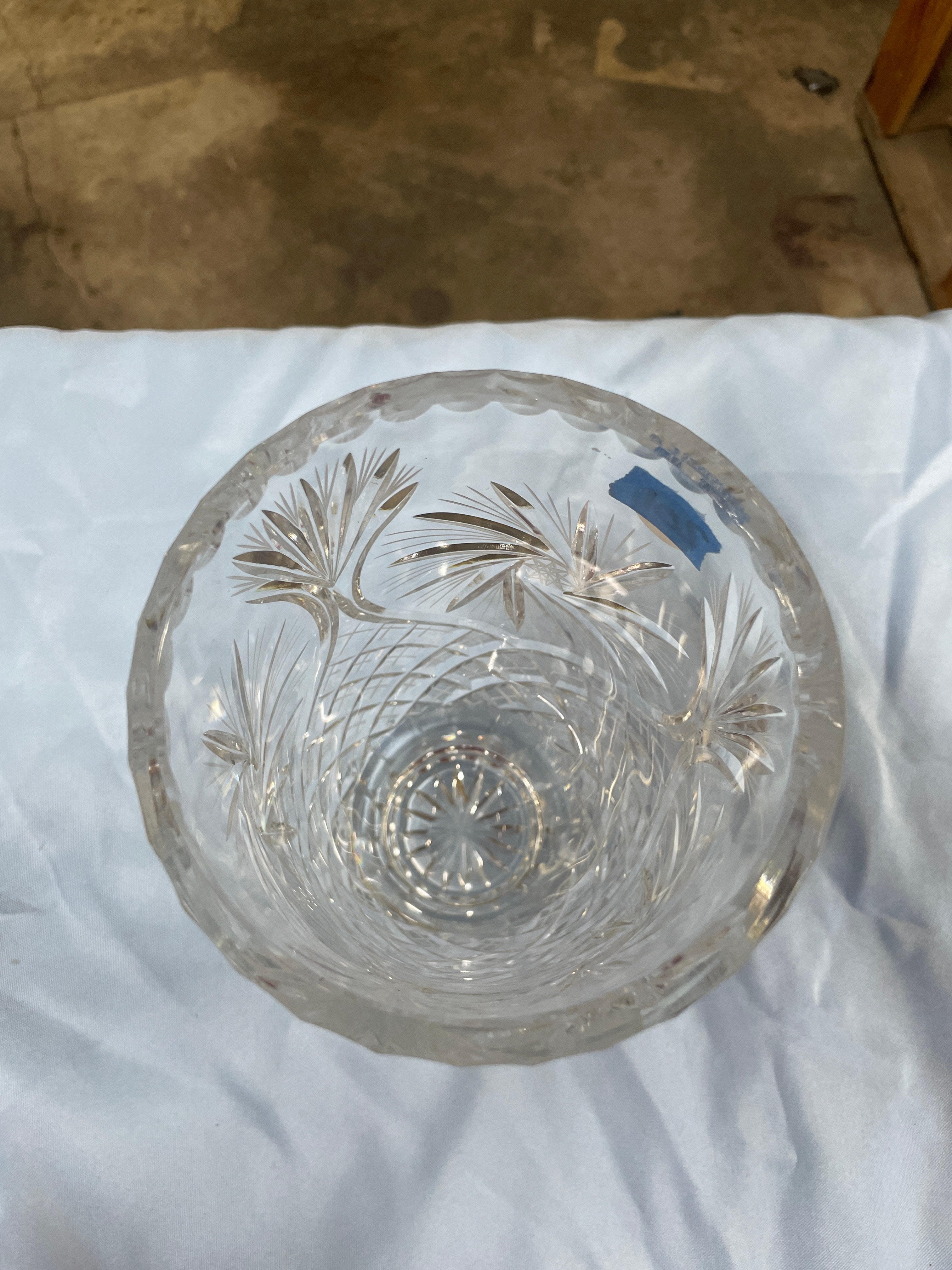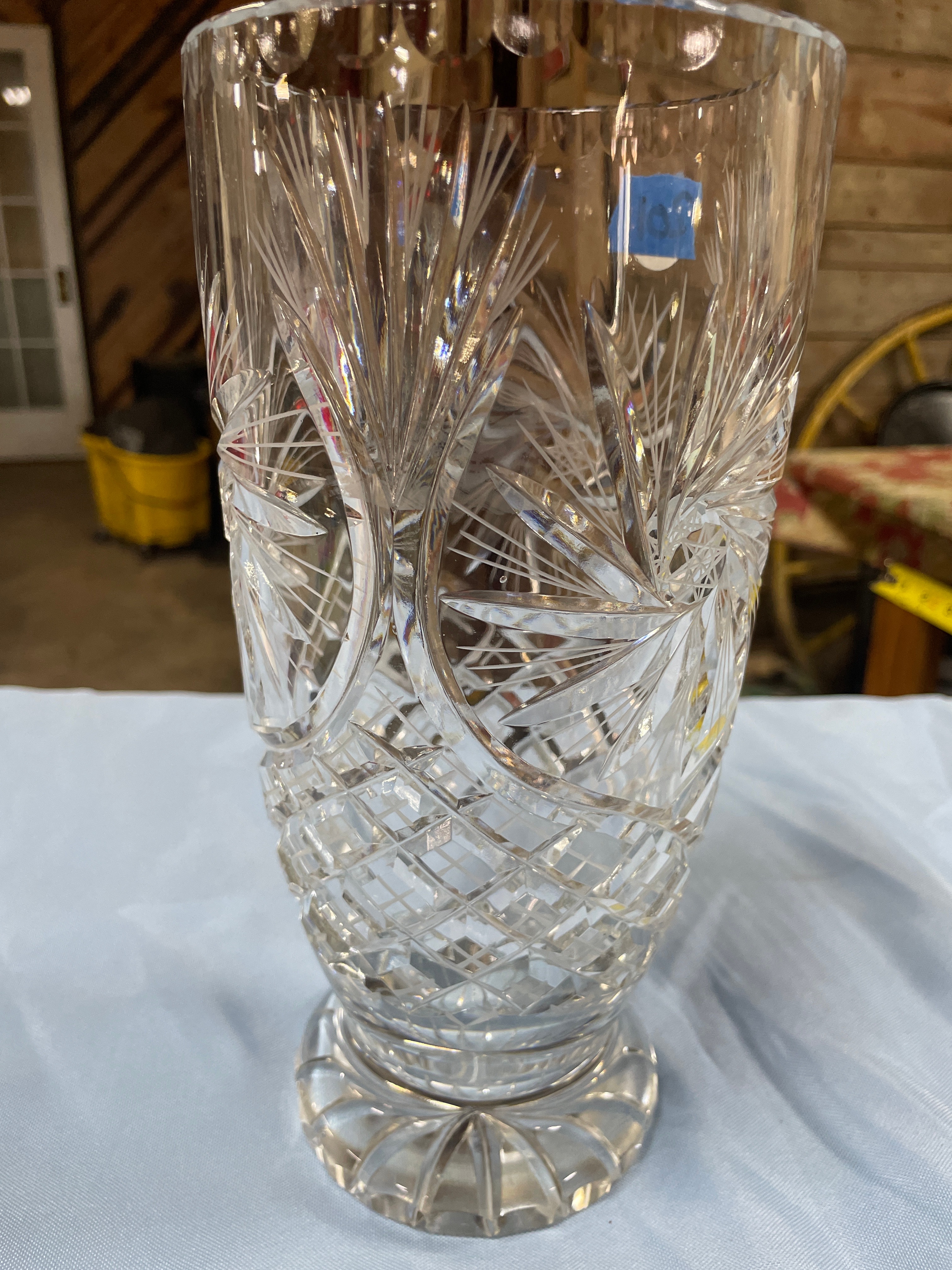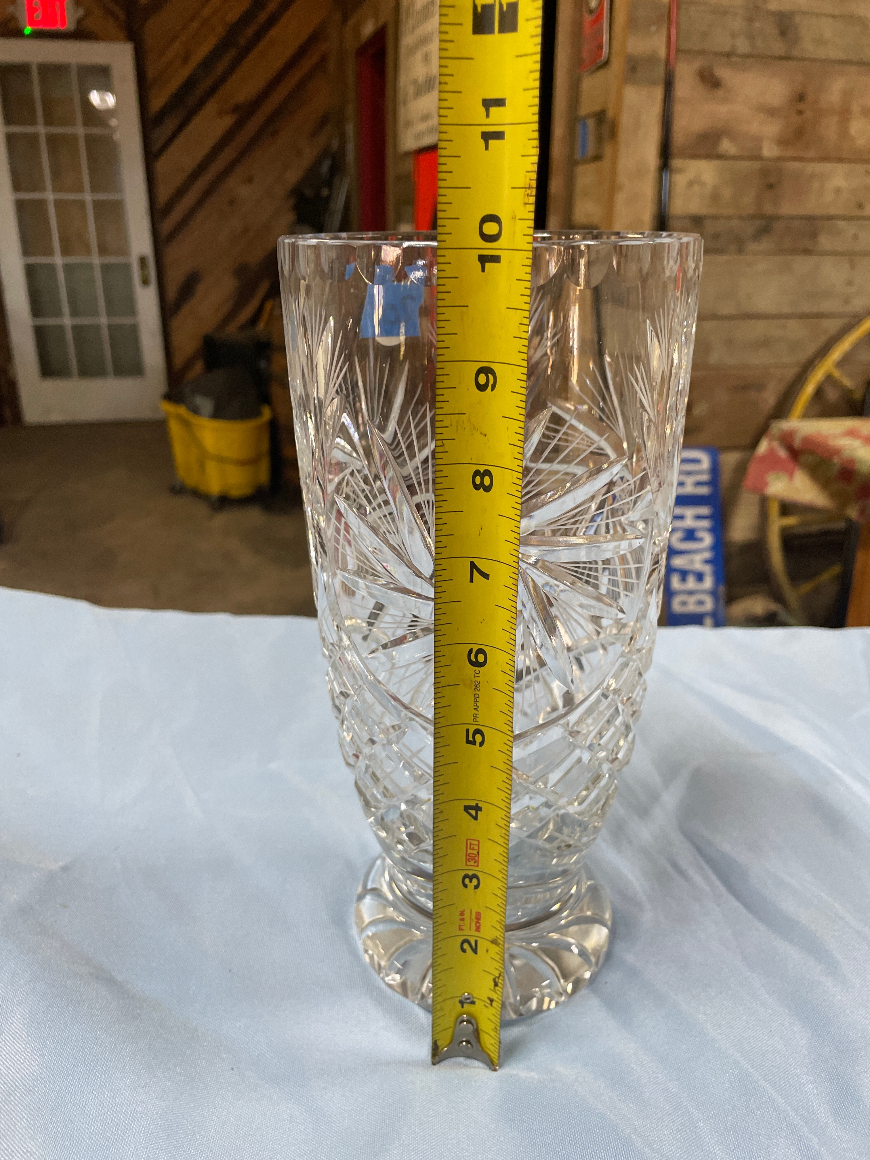 A clear crystal-cut glass vase, approximately 10 inches tall, featuring intricate pinwheel and geometric cut designs.