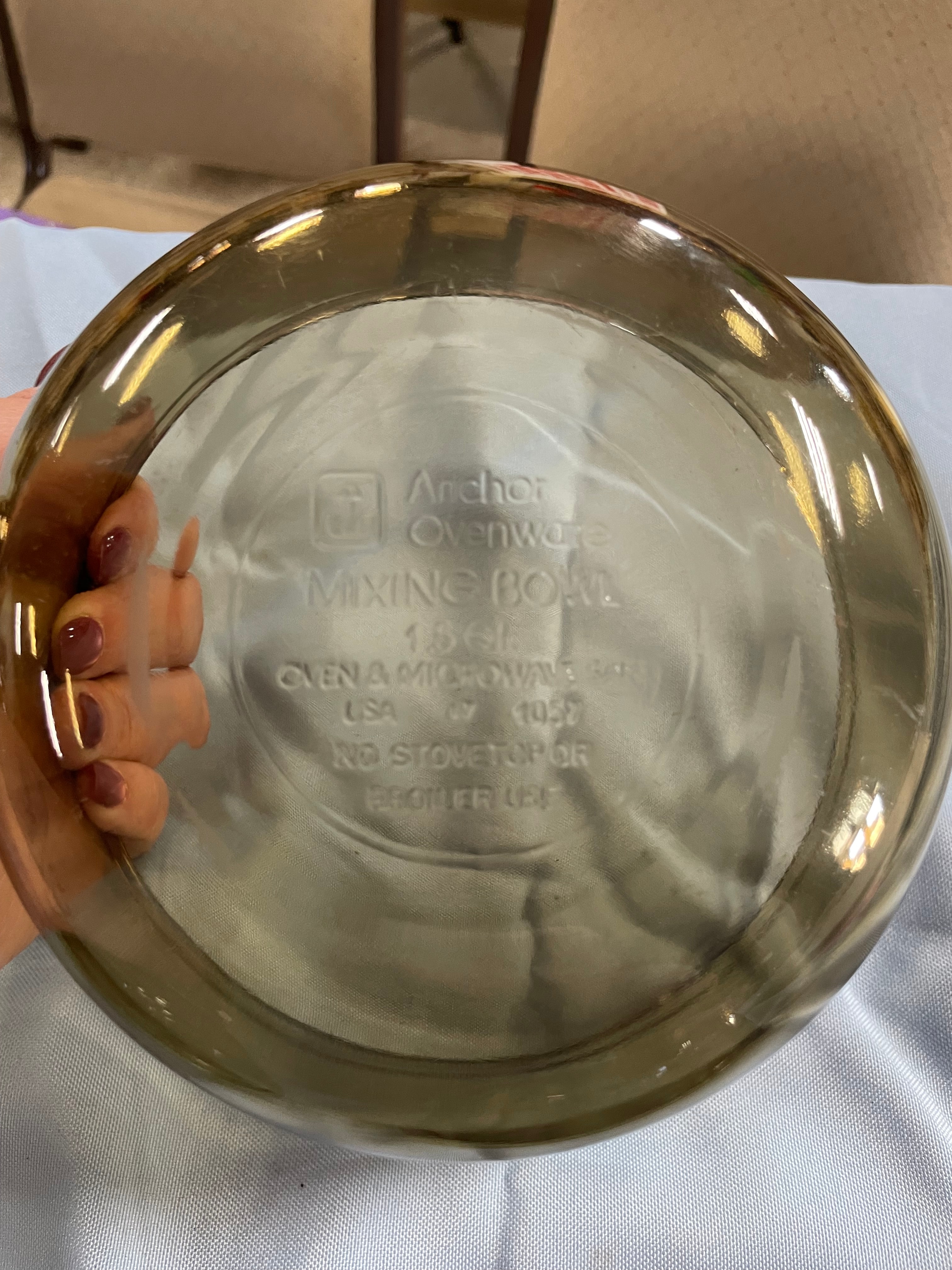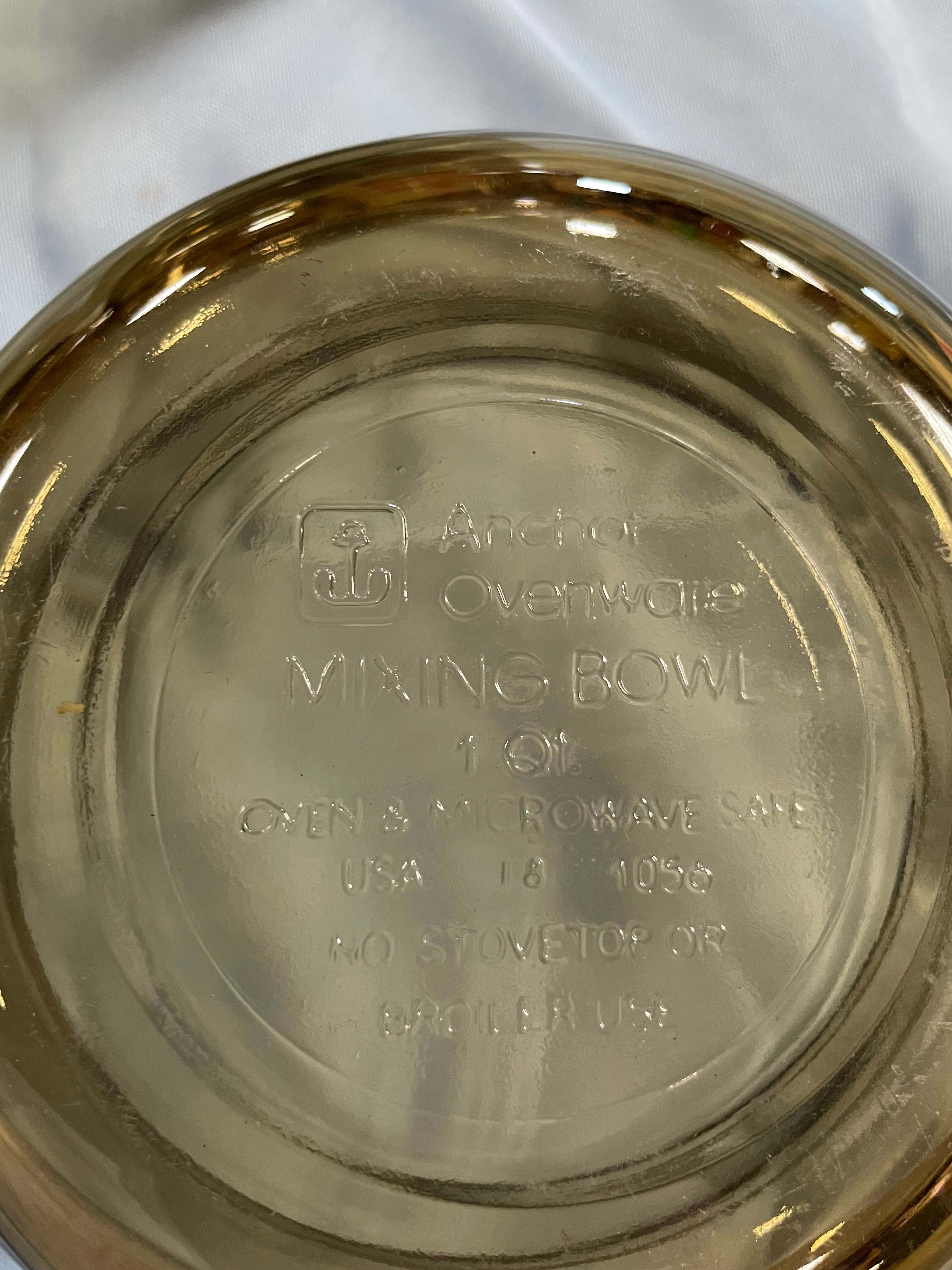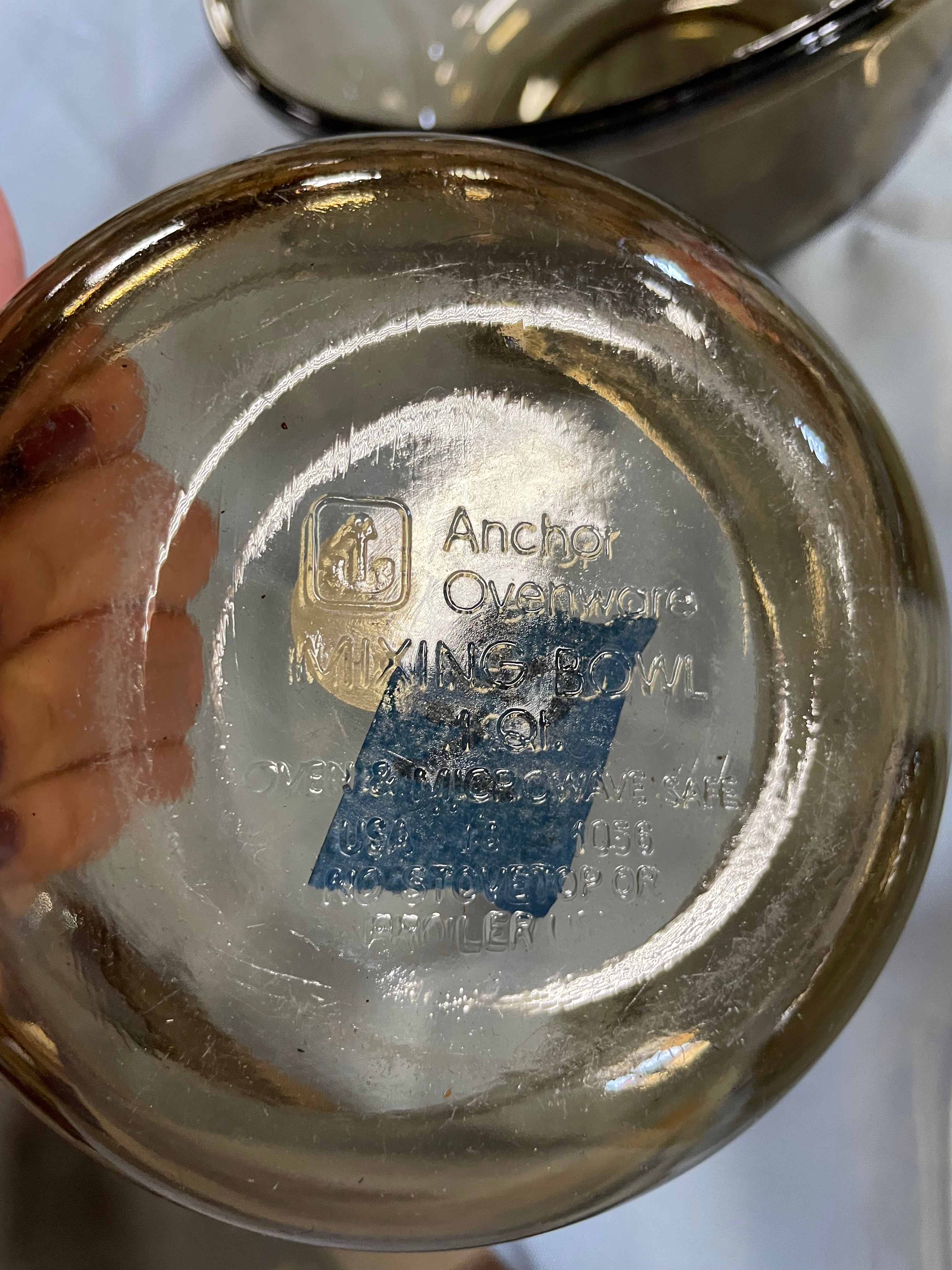 A set of four translucent smoky brown Anchor Ovenware mixing bowls, marked with the anchor logo, capacities of 1 Qt, 1.5 Qt, 2.5 Qt (one obscured), and inscriptions “MIXING BOWL”, “OVEN & MICROWAVE SAFE”, “NO STOVETOP OR BROILER USE”, “USA 1058”.