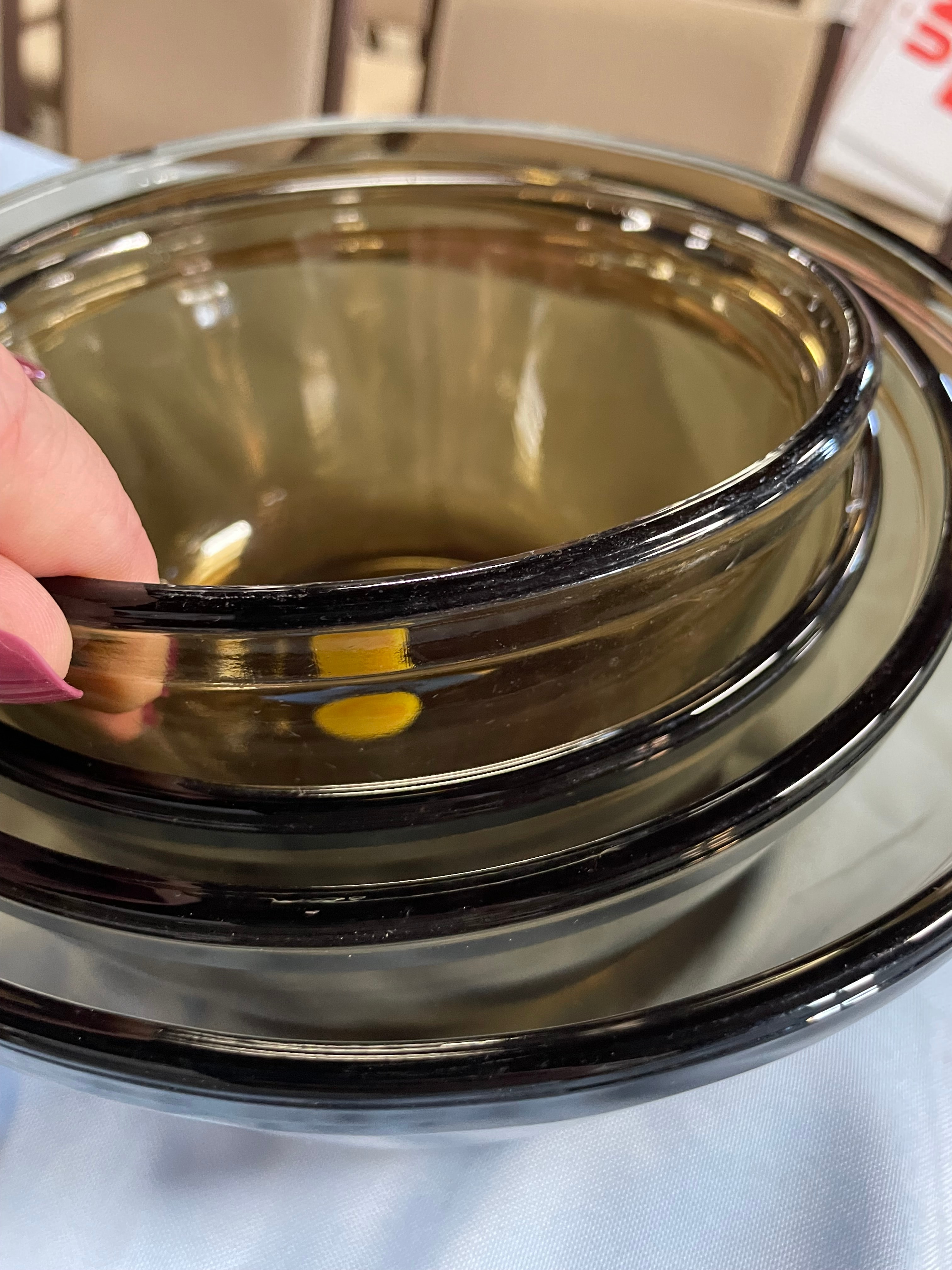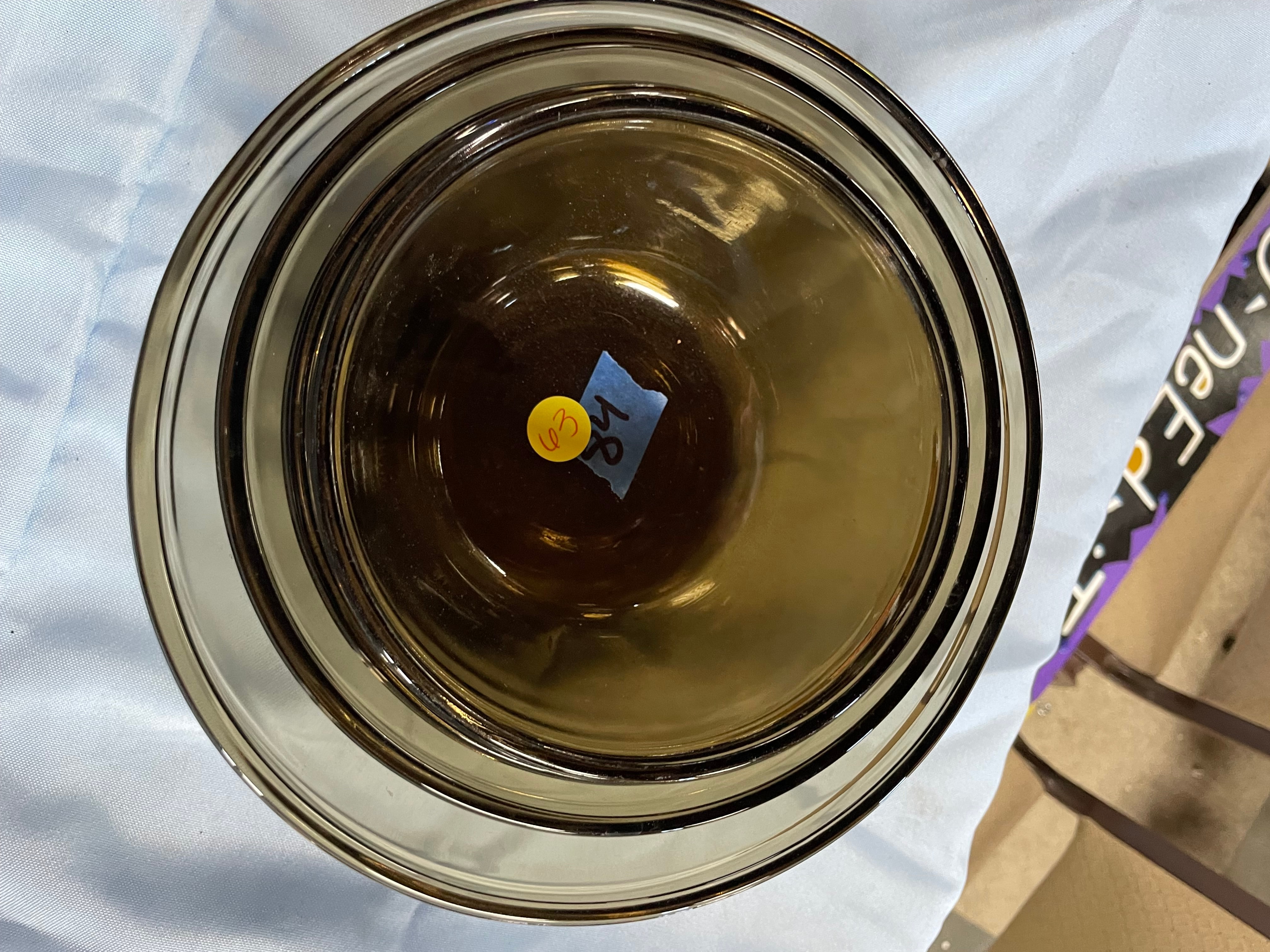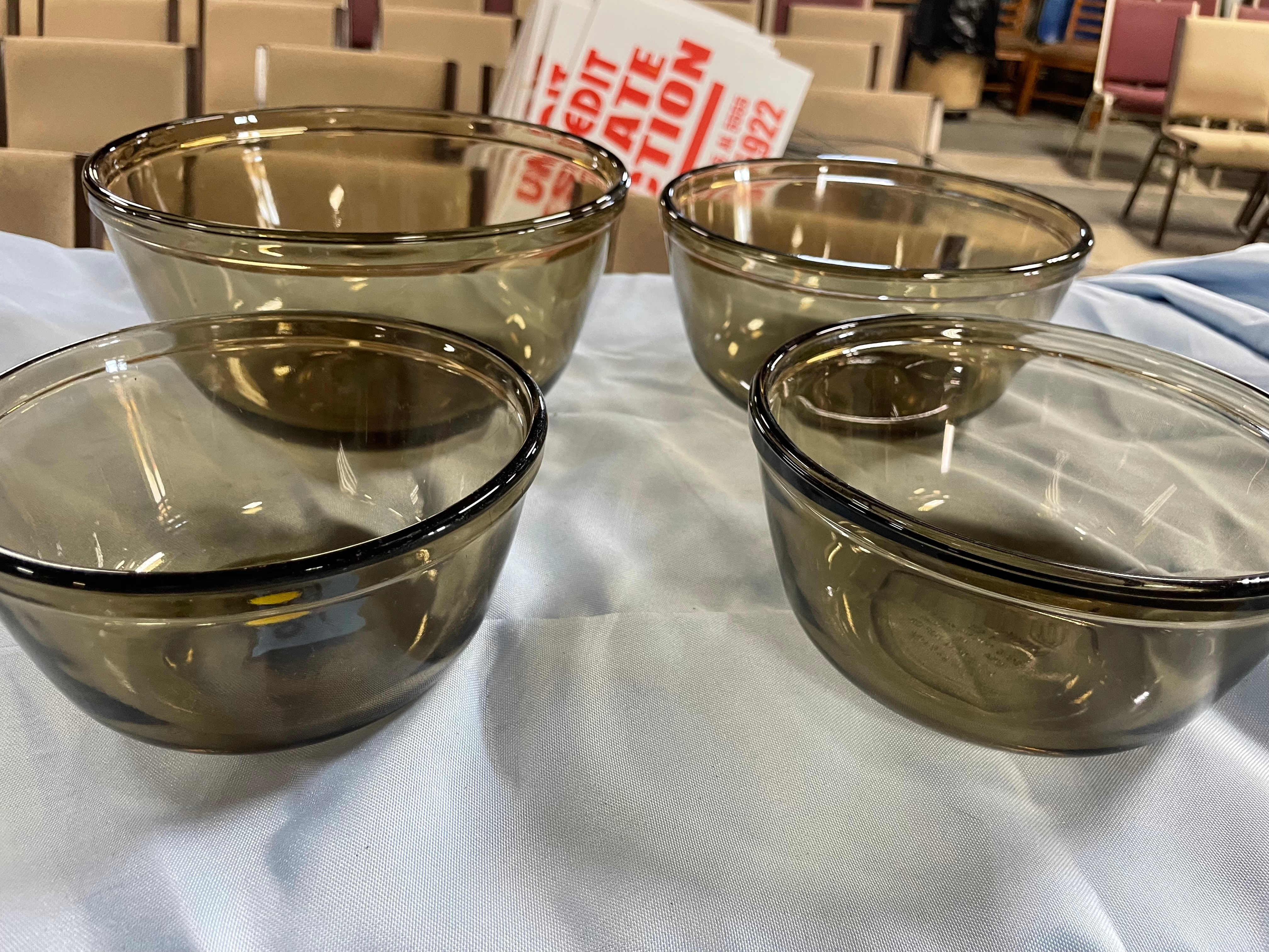 A set of four translucent smoky brown Anchor Ovenware mixing bowls, marked with the anchor logo, capacities of 1 Qt, 1.5 Qt, 2.5 Qt (one obscured), and inscriptions “MIXING BOWL”, “OVEN & MICROWAVE SAFE”, “NO STOVETOP OR BROILER USE”, “USA 1058”.