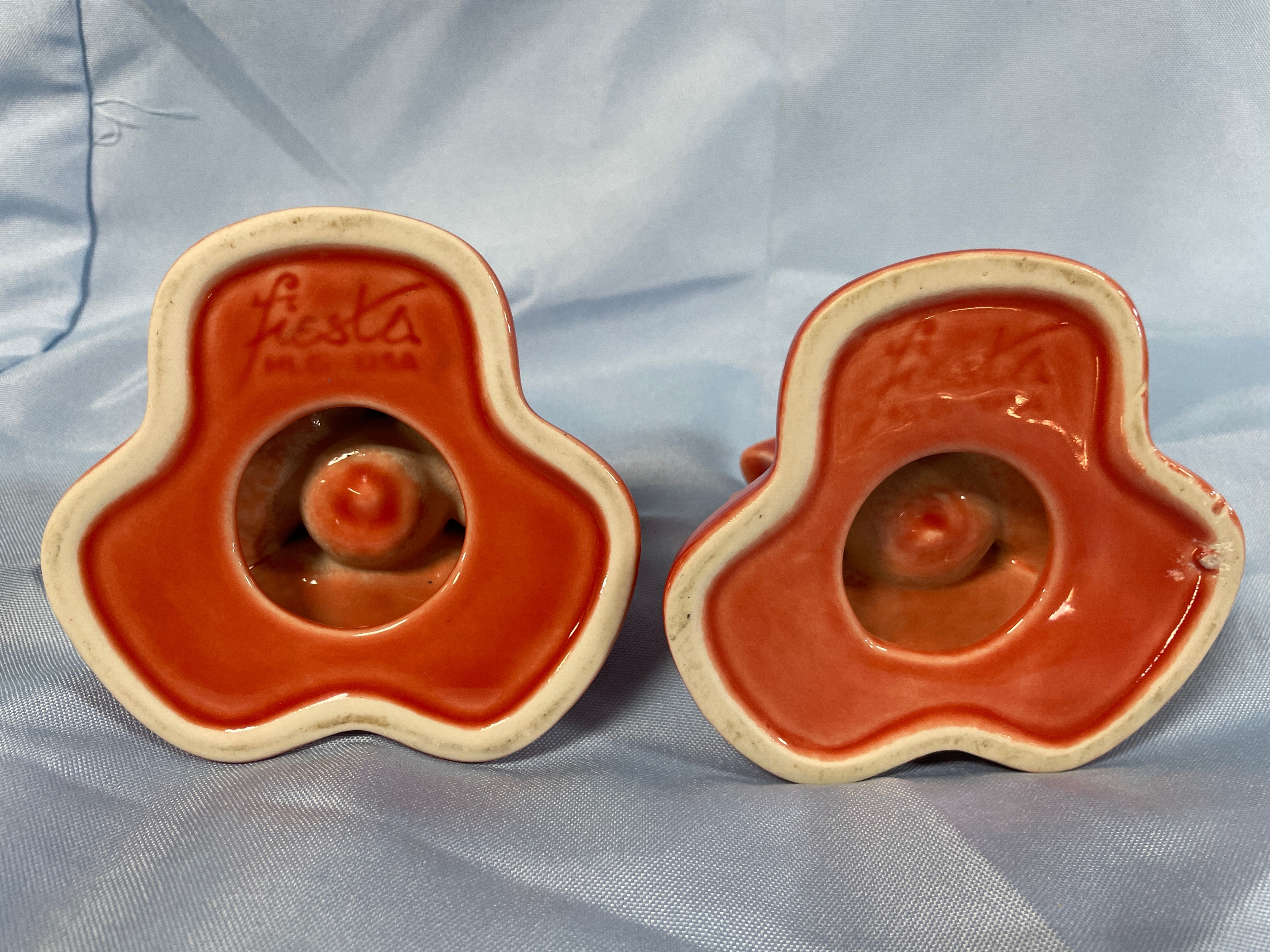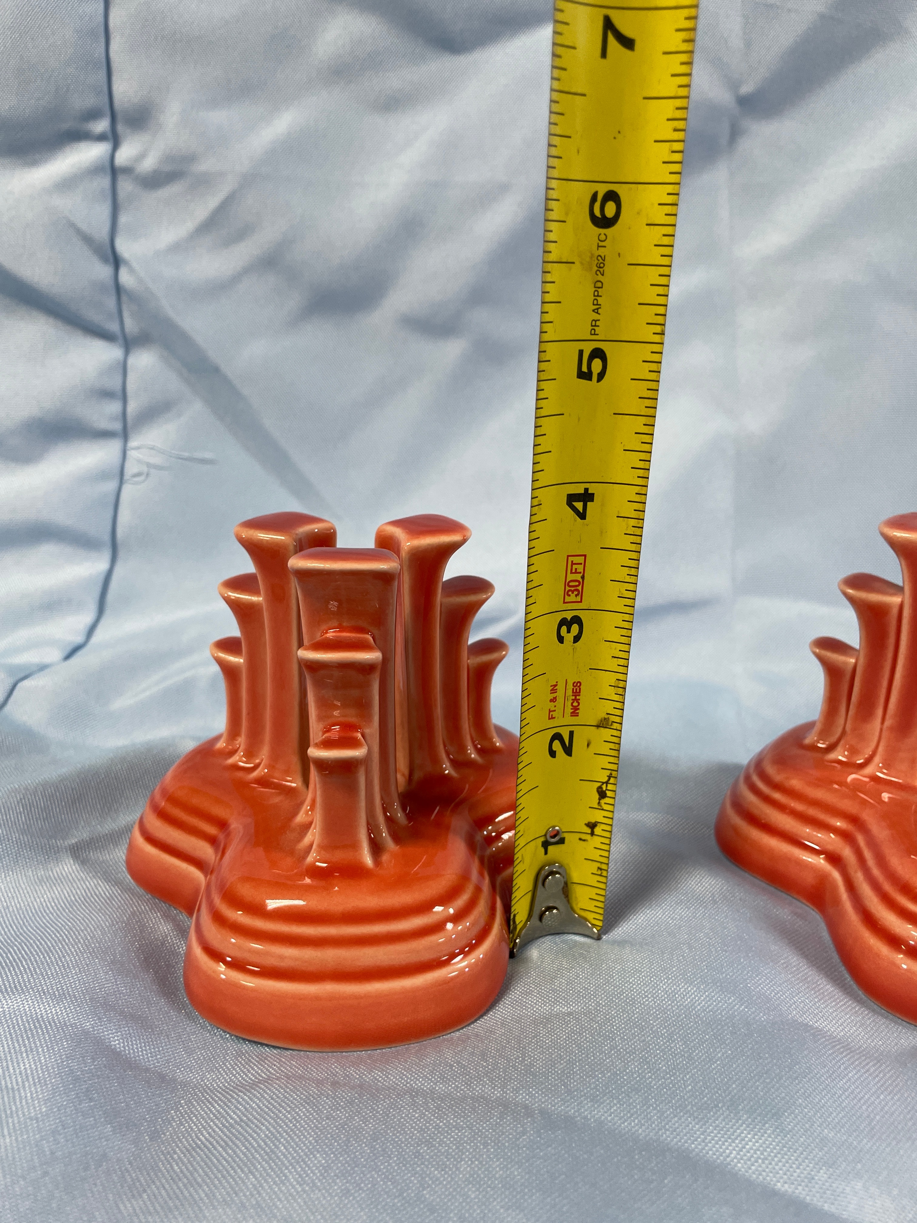 A pair of glossy coral-orange ceramic multi-stem candle holders, identified as Fiesta Persimmon Pyramid Tripod style, each marked ‘Fiesta MADE IN USA’ and measuring approximately 4 inches tall.