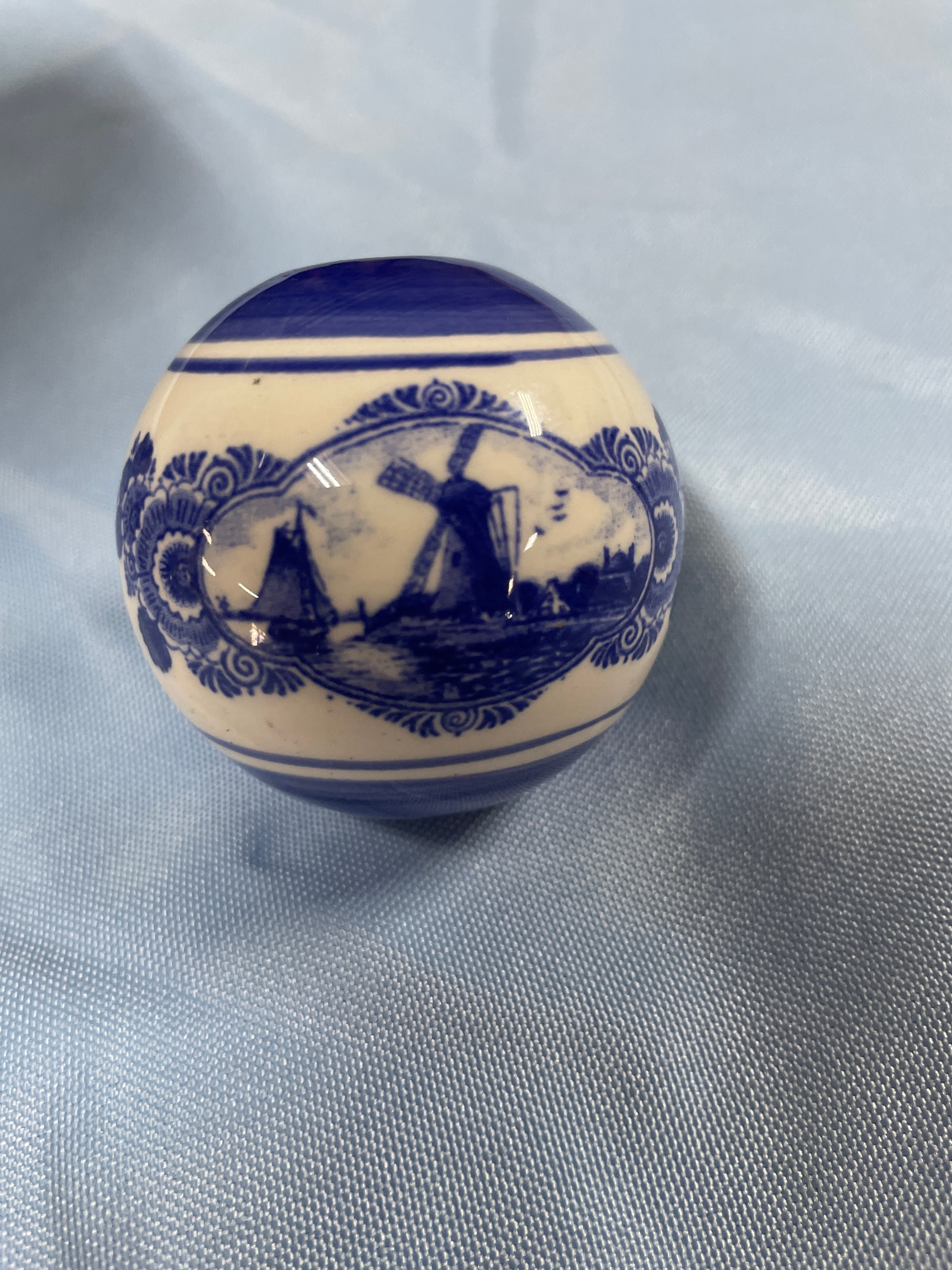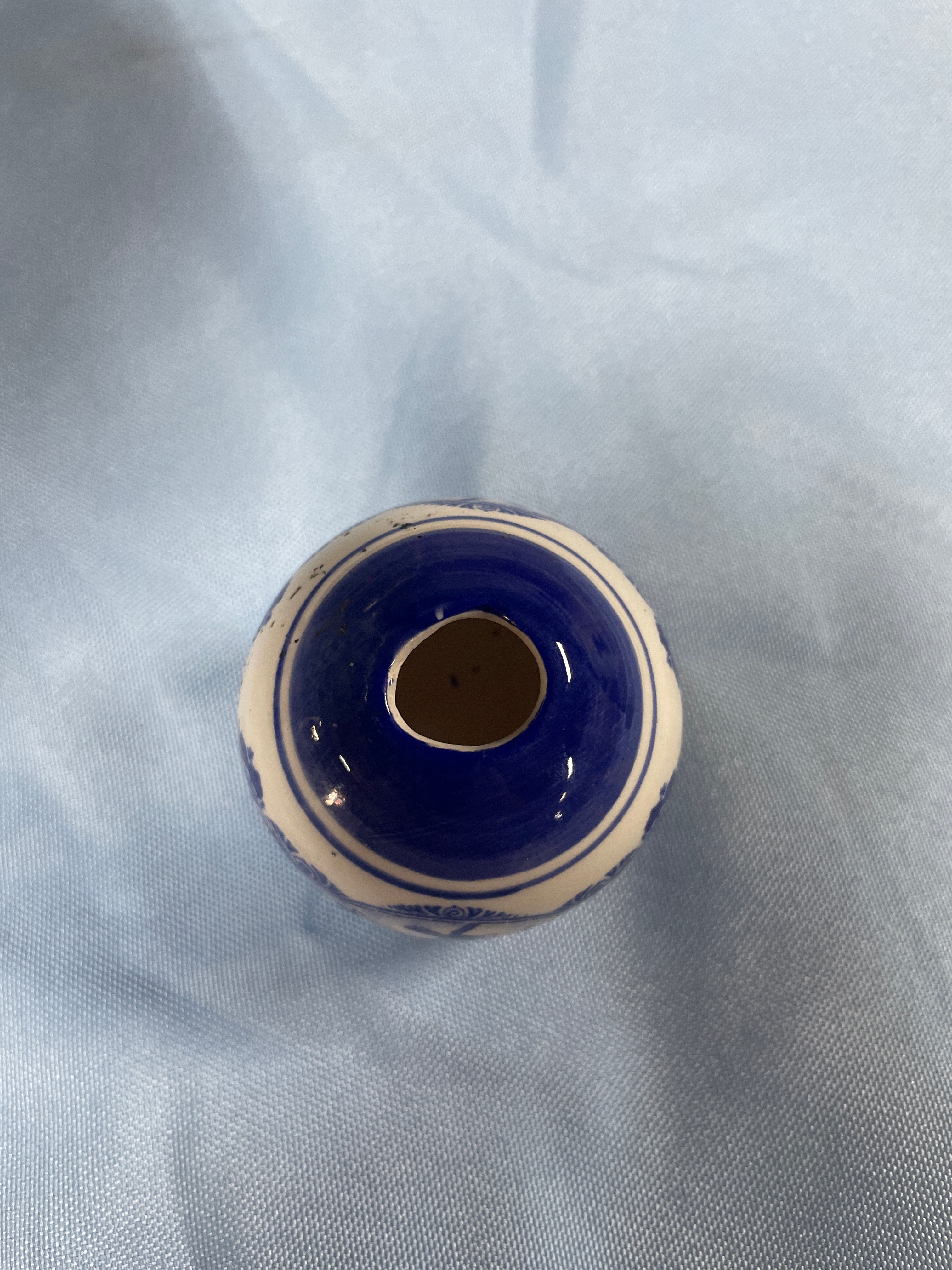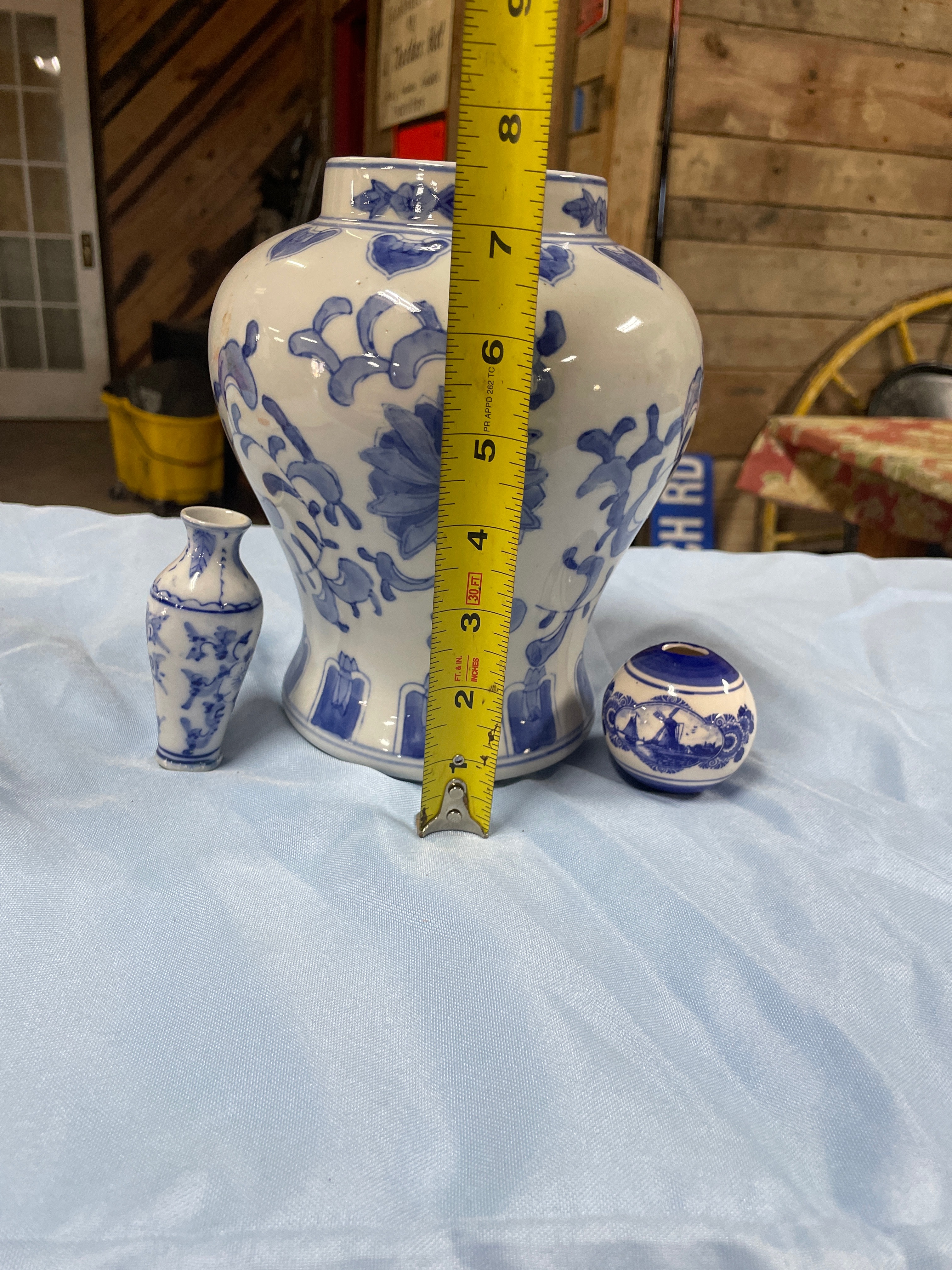 A large white and blue patterned vase measuring approximately 7.5 inches tall, a small white and blue patterned miniature vase, and a small white and blue spherical decorative item with a landscape scene.