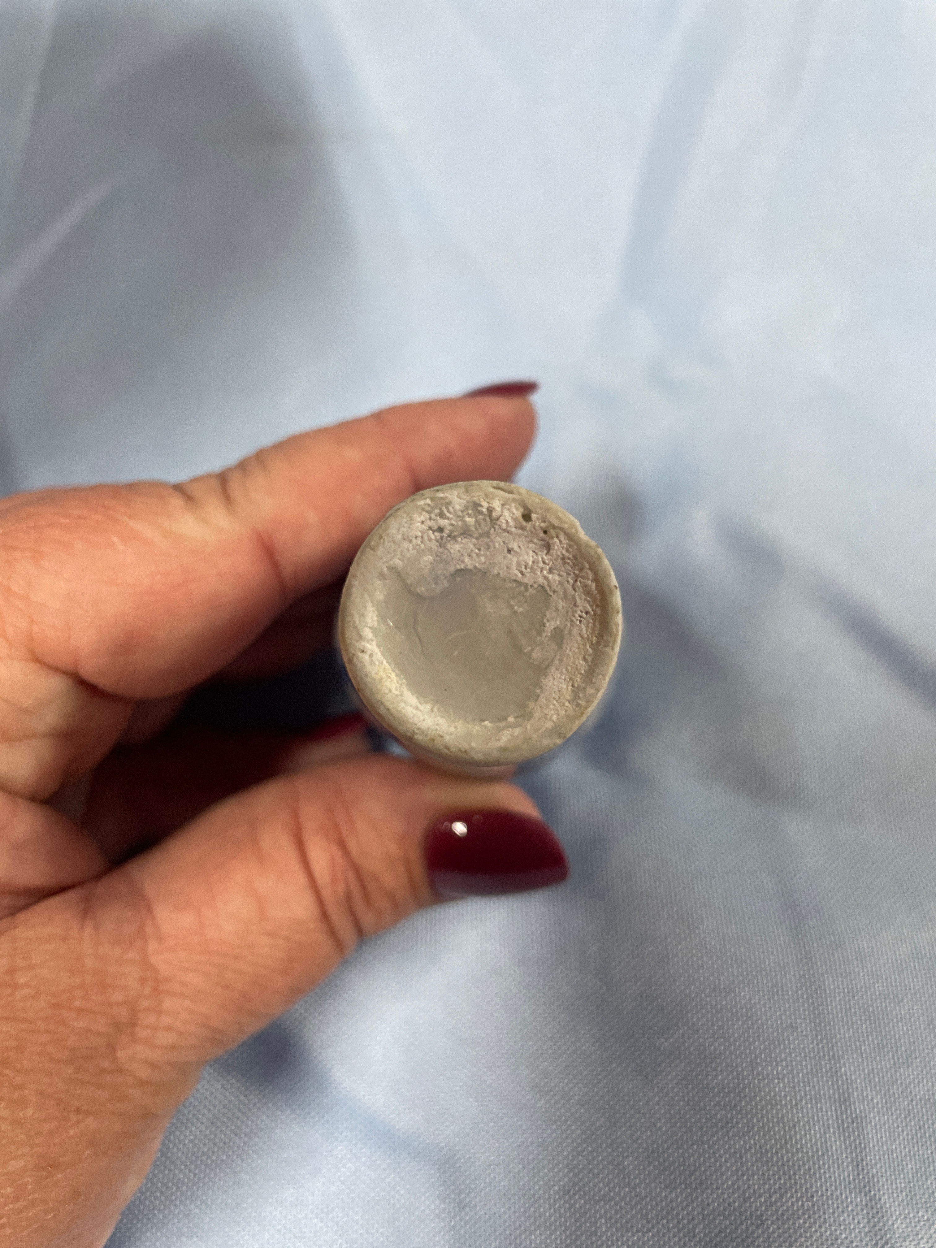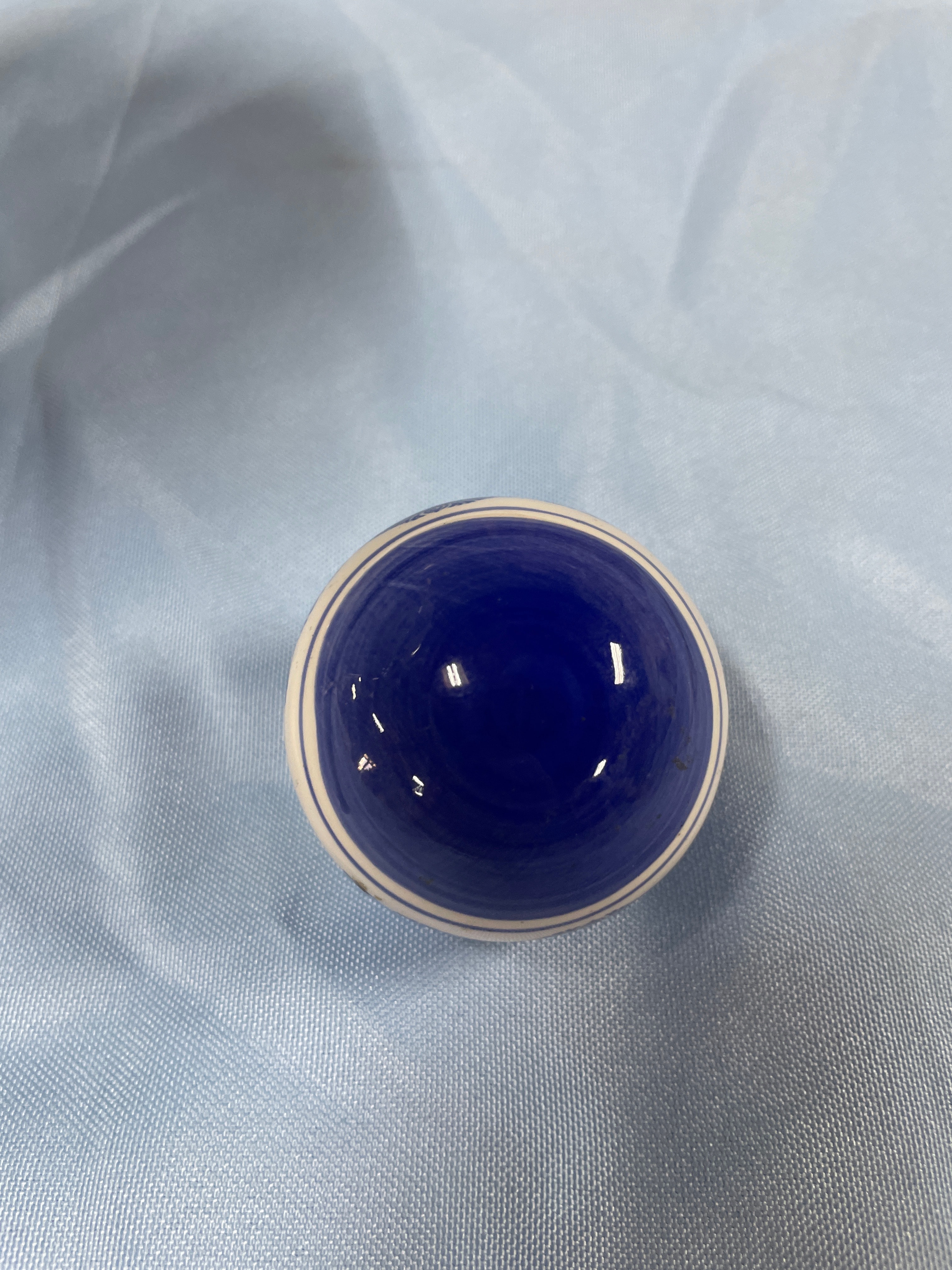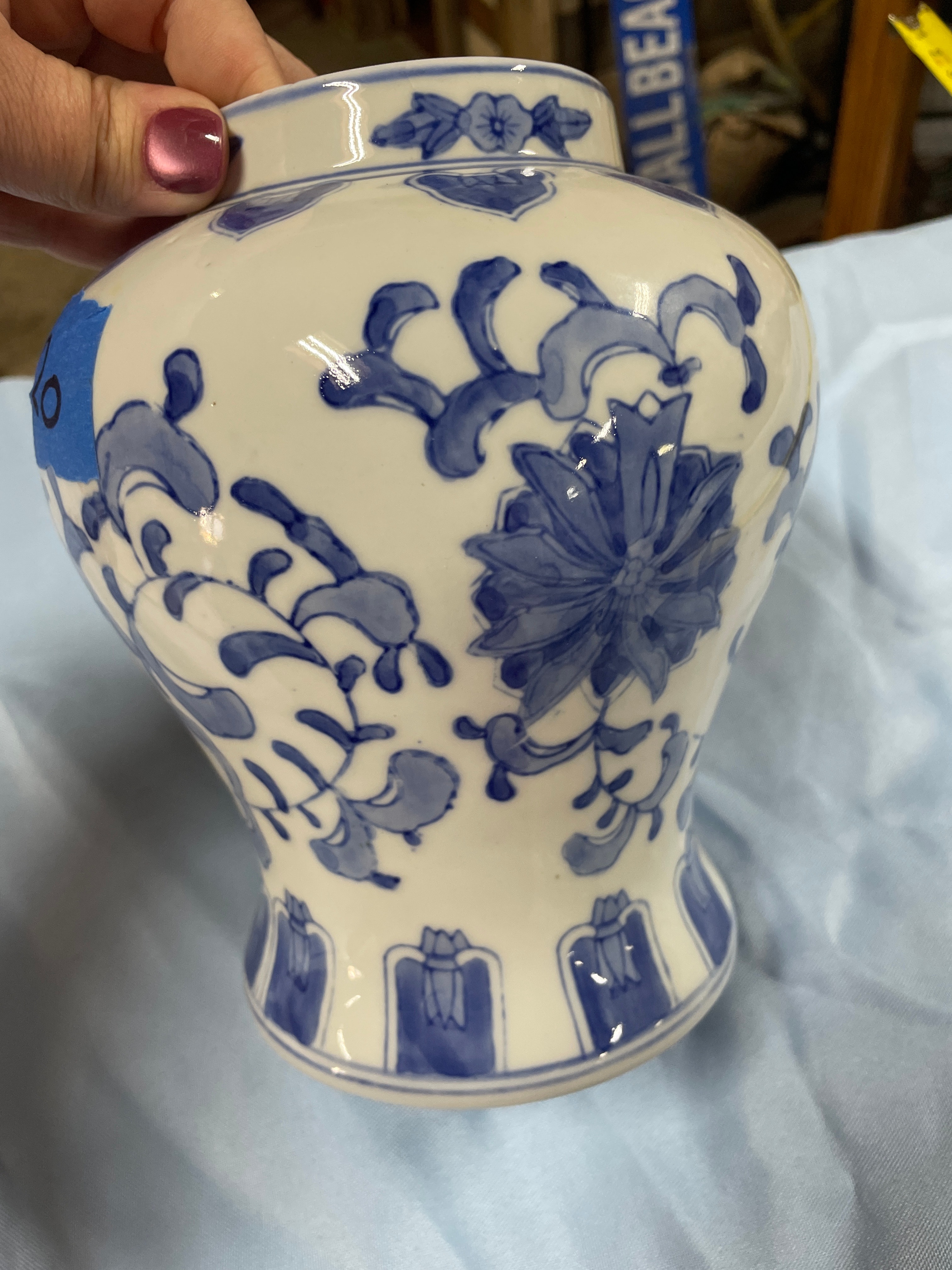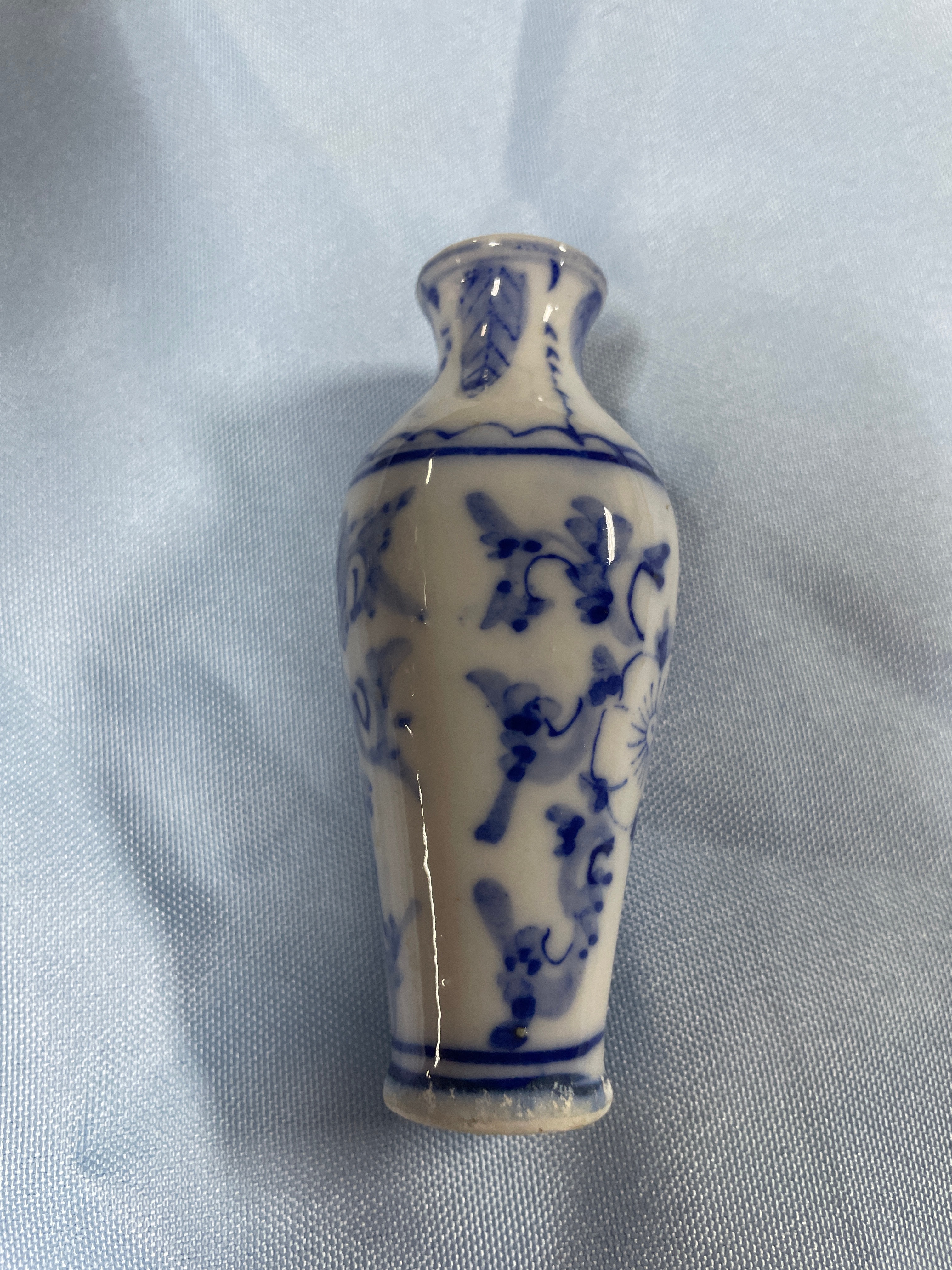 A large white and blue patterned vase measuring approximately 7.5 inches tall, a small white and blue patterned miniature vase, and a small white and blue spherical decorative item with a landscape scene.