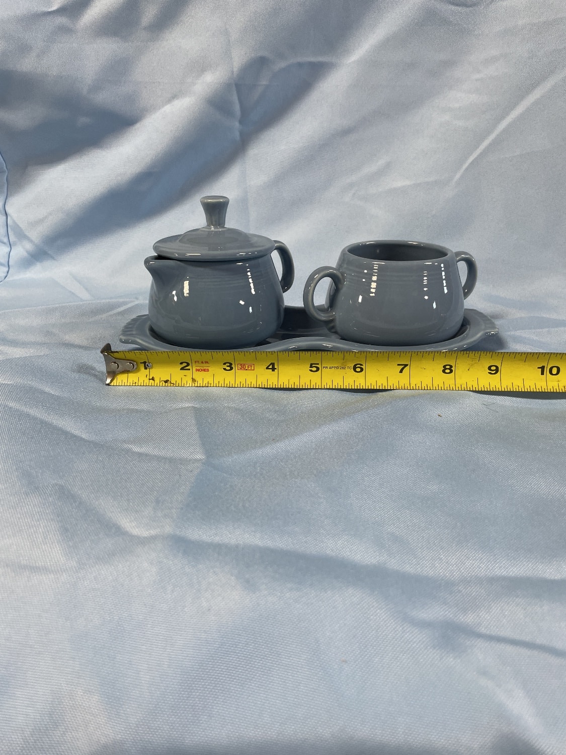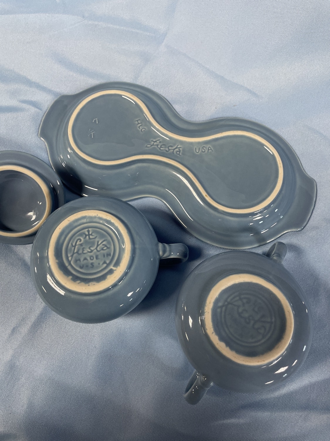 A 3-piece Periwinkle Blue ceramic creamer, lidded sugar bowl, and serving tray, measuring approximately 9 inches long, marked “HLC Fiesta USA” and “HLC Fiesta MADE IN U.S.A.”.