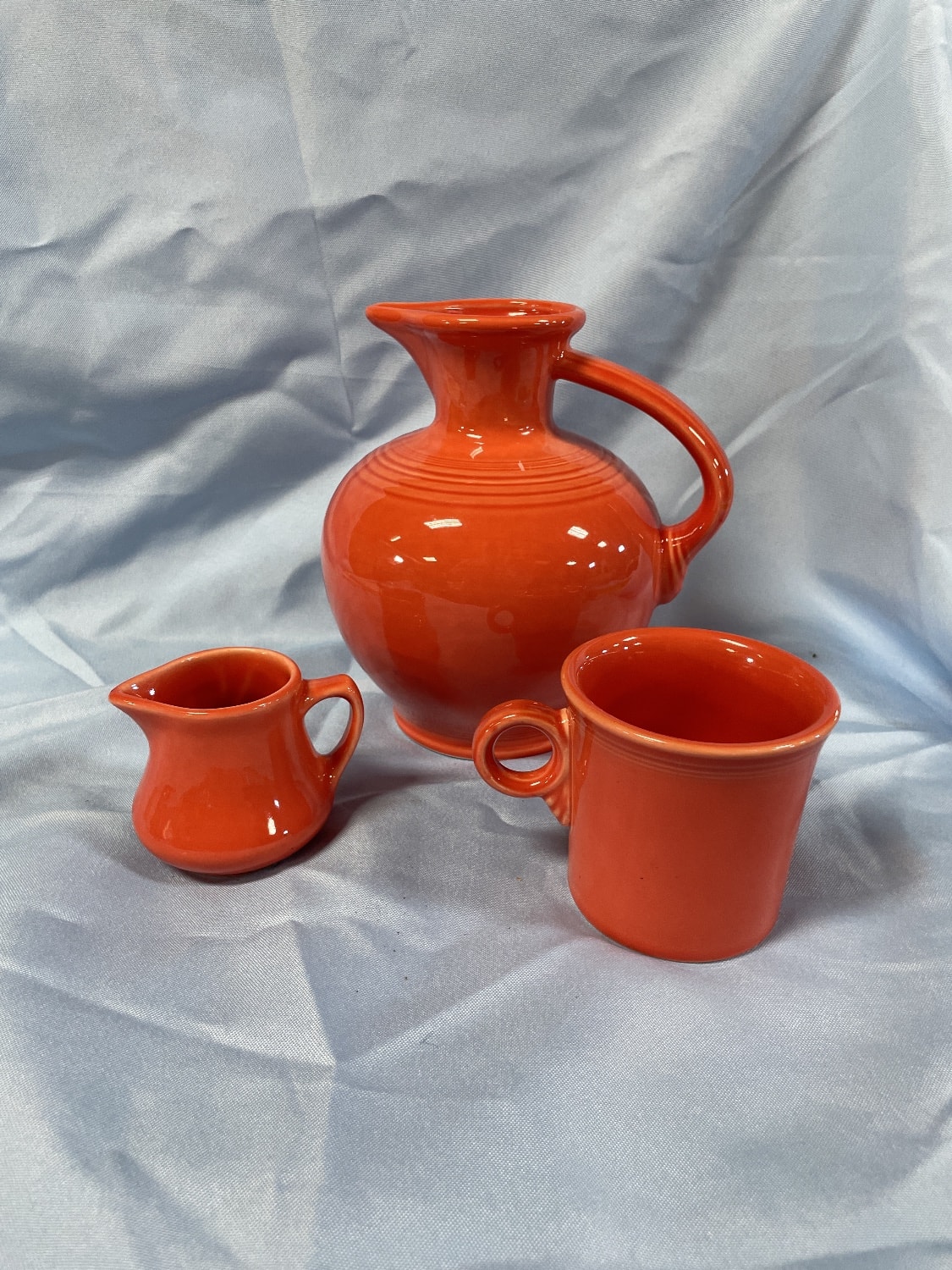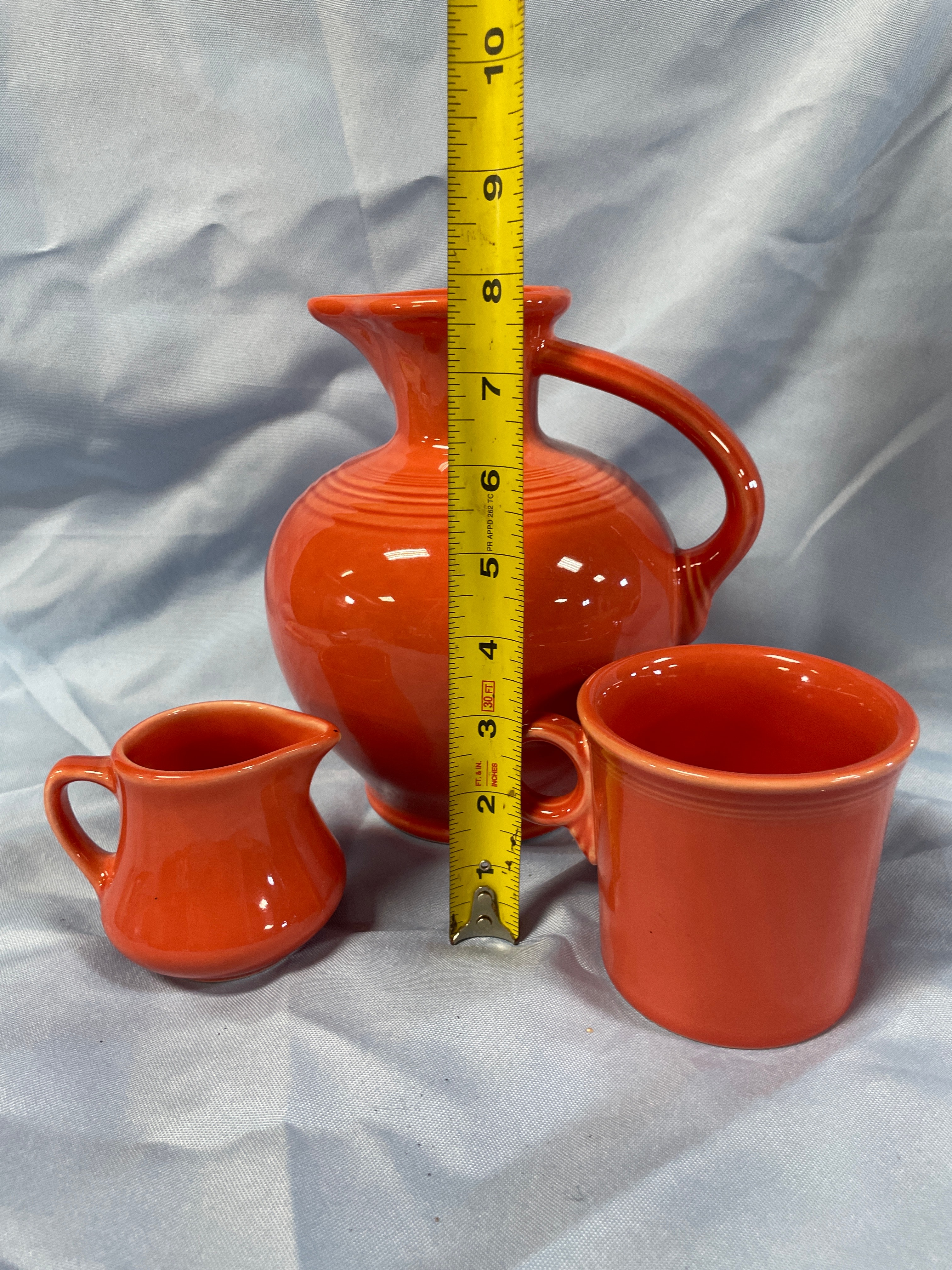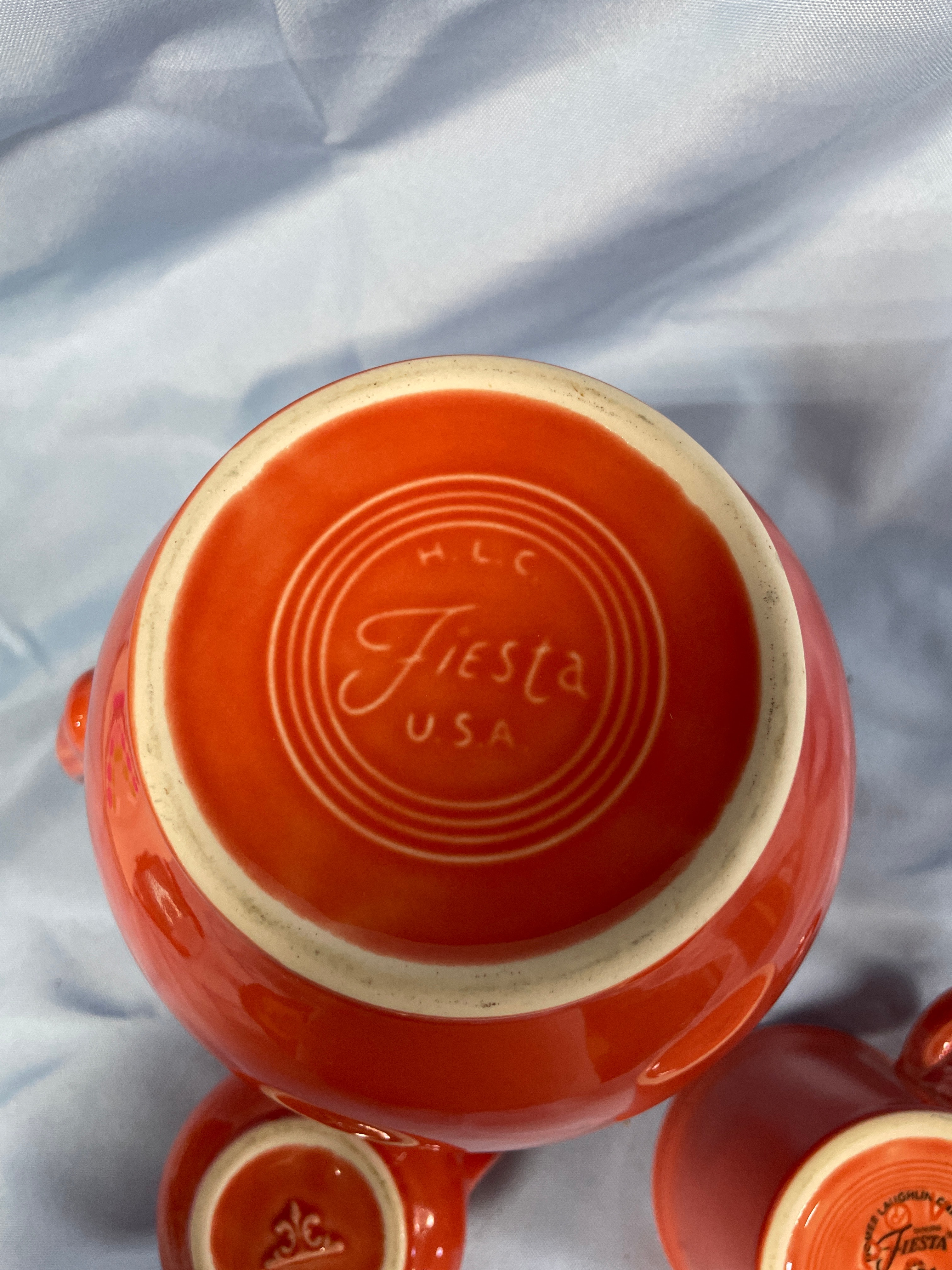 A set of three orange ceramic items, including one pitcher, one small creamer, and one mug, all marked “HOMER LAUGHLIN CHINA CO”, “GENUINE FIESTA®”, “HLC”, “LEAD FREE”, and “USA”, with the pitcher measuring approximately 7.5 inches tall.