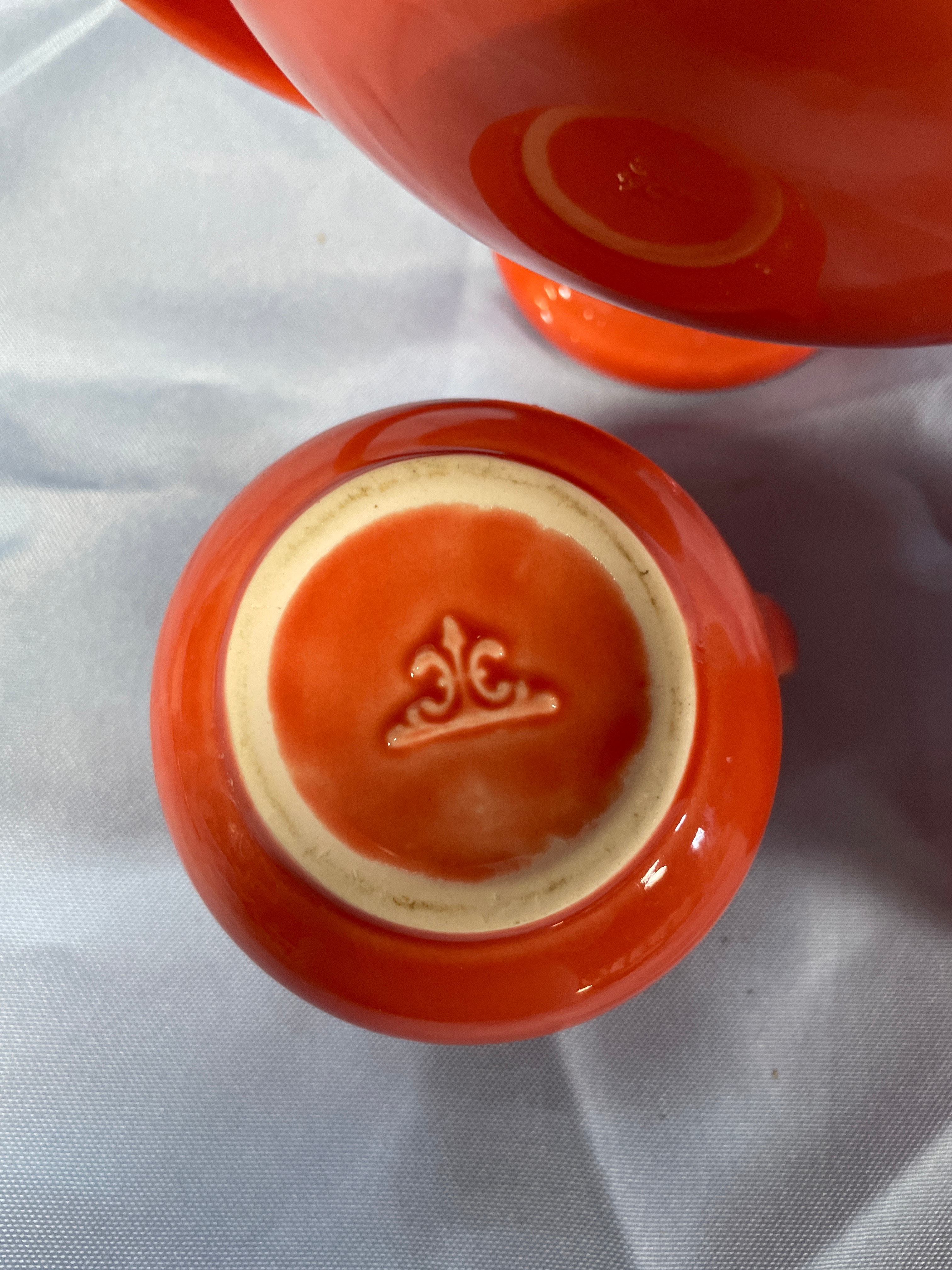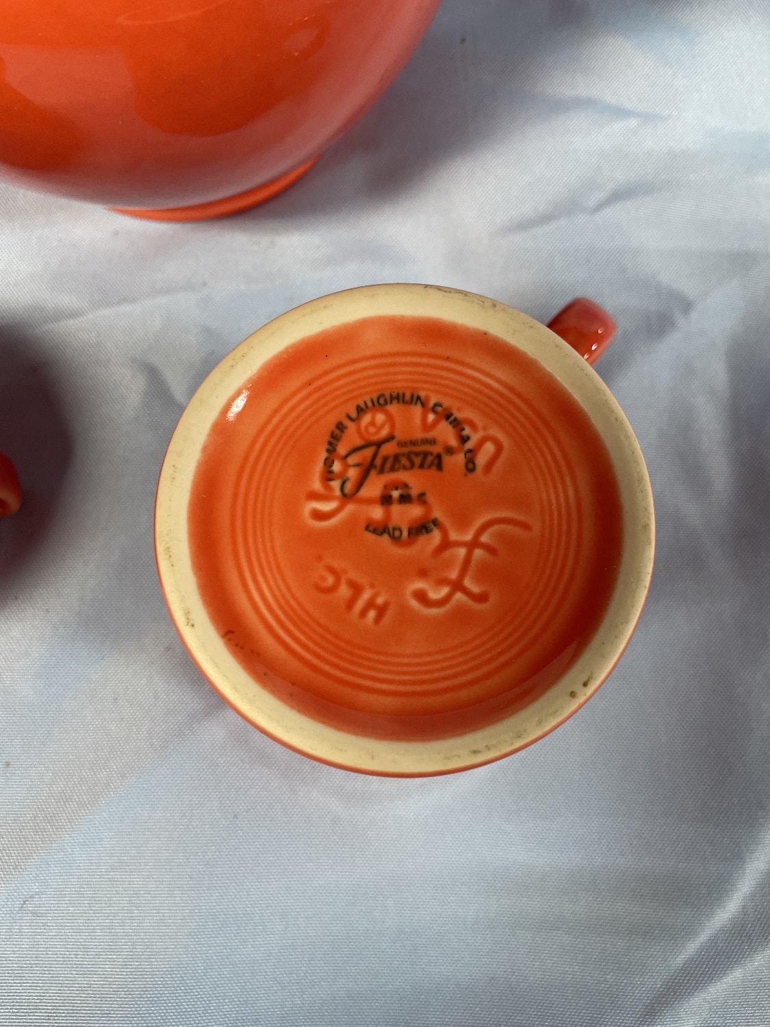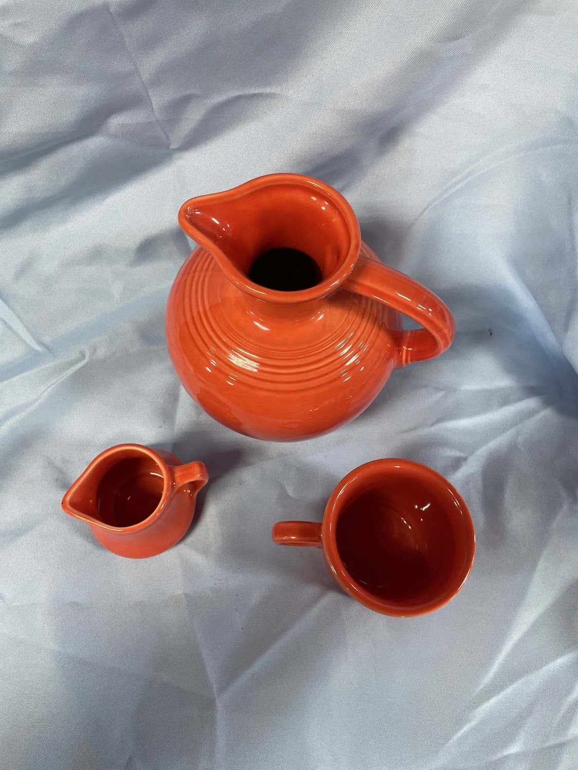 A set of three orange ceramic items, including one pitcher, one small creamer, and one mug, all marked “HOMER LAUGHLIN CHINA CO”, “GENUINE FIESTA®”, “HLC”, “LEAD FREE”, and “USA”, with the pitcher measuring approximately 7.5 inches tall.