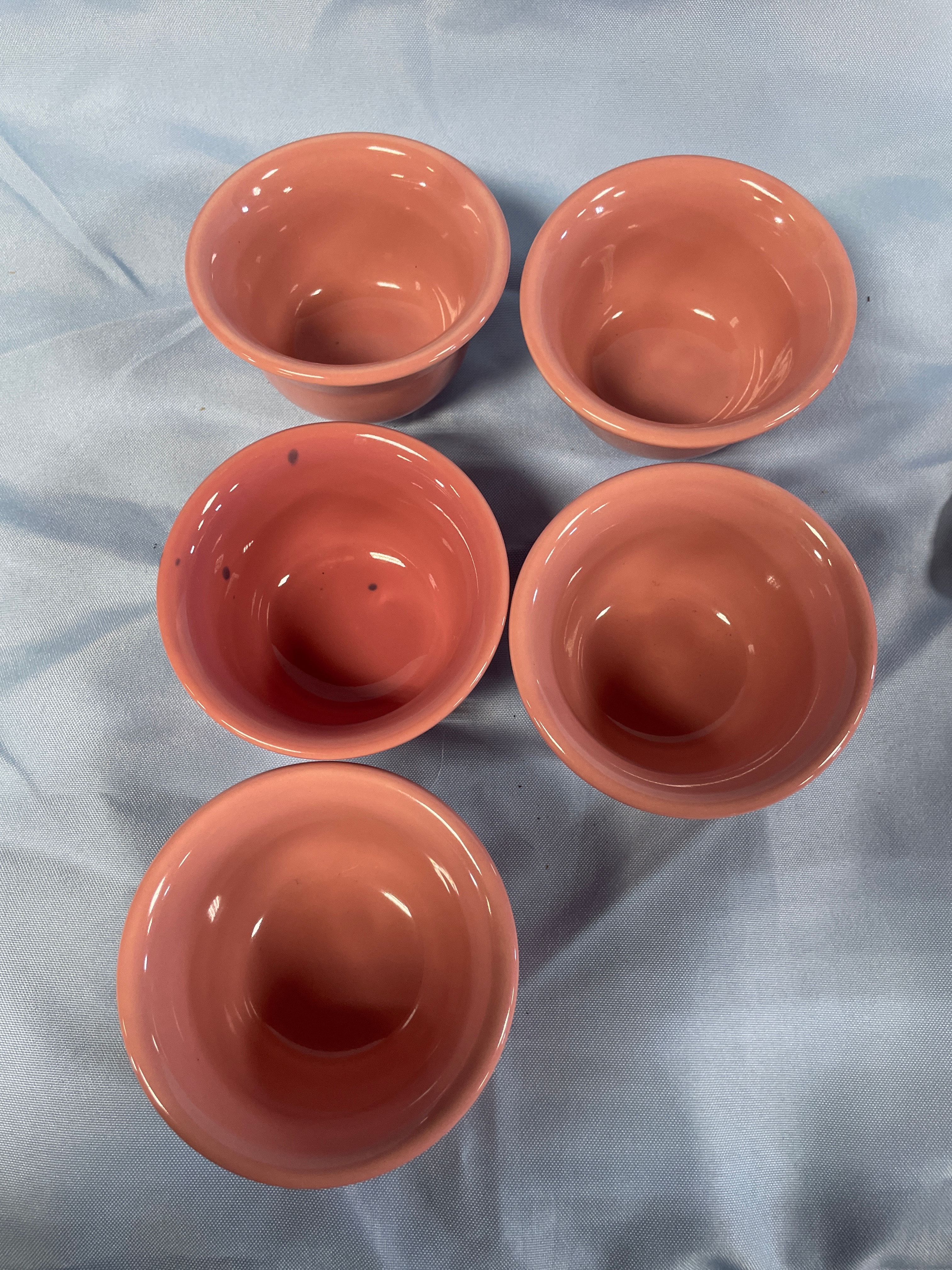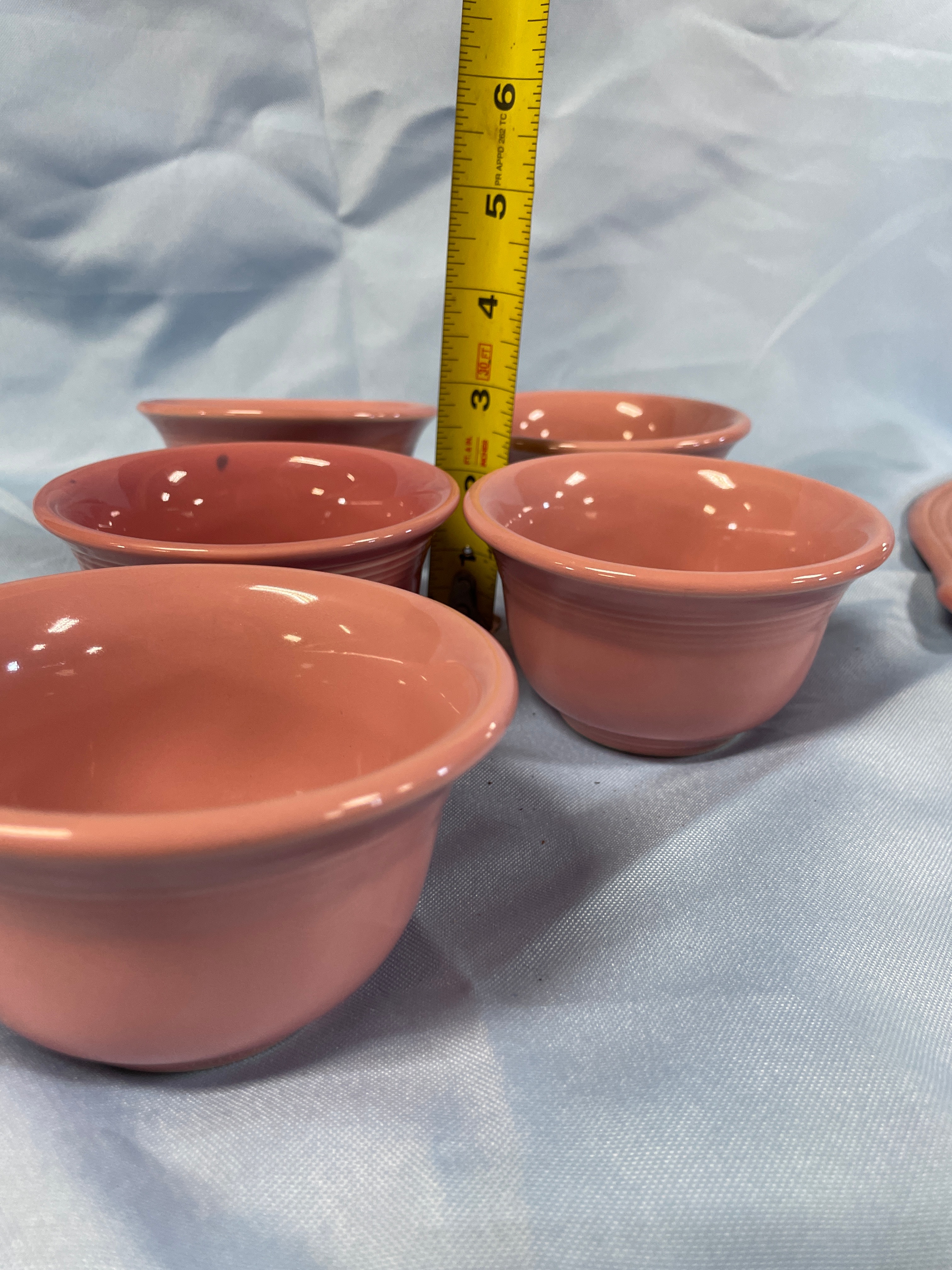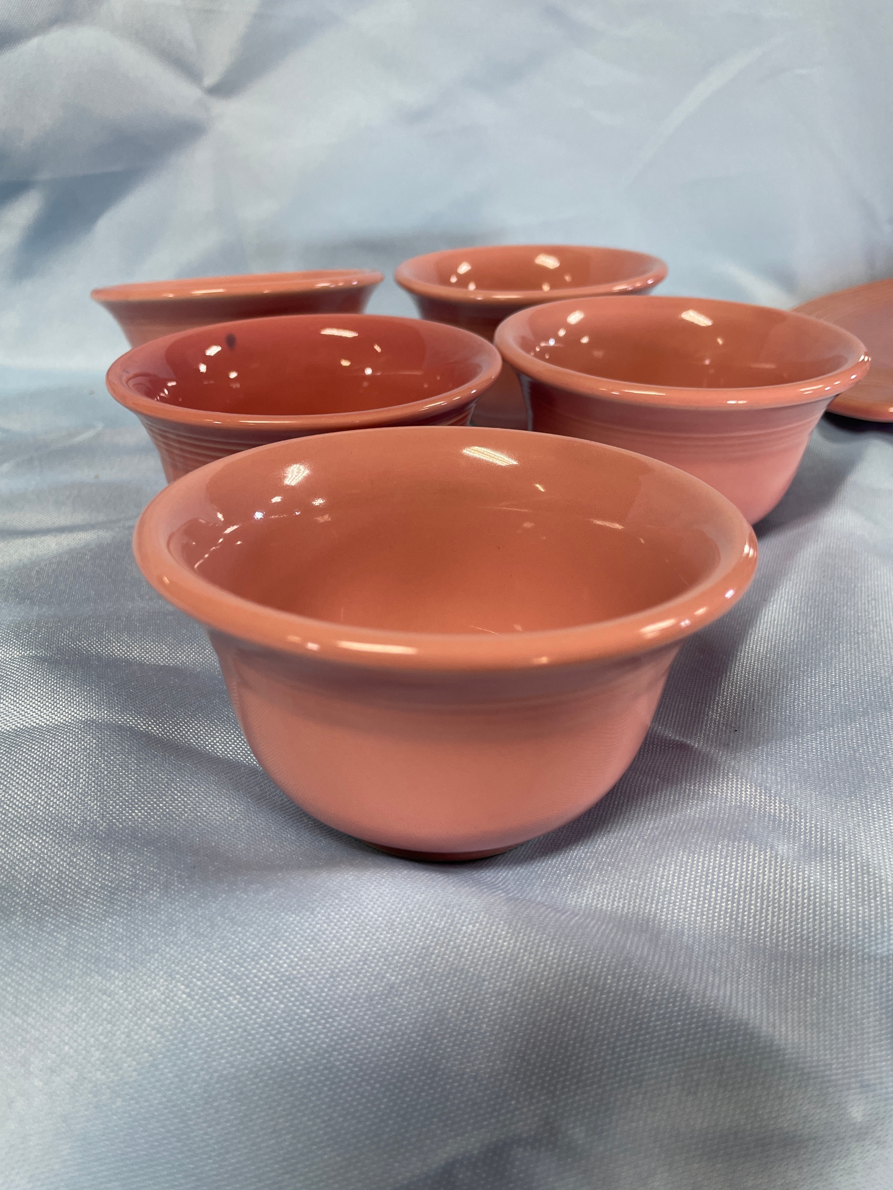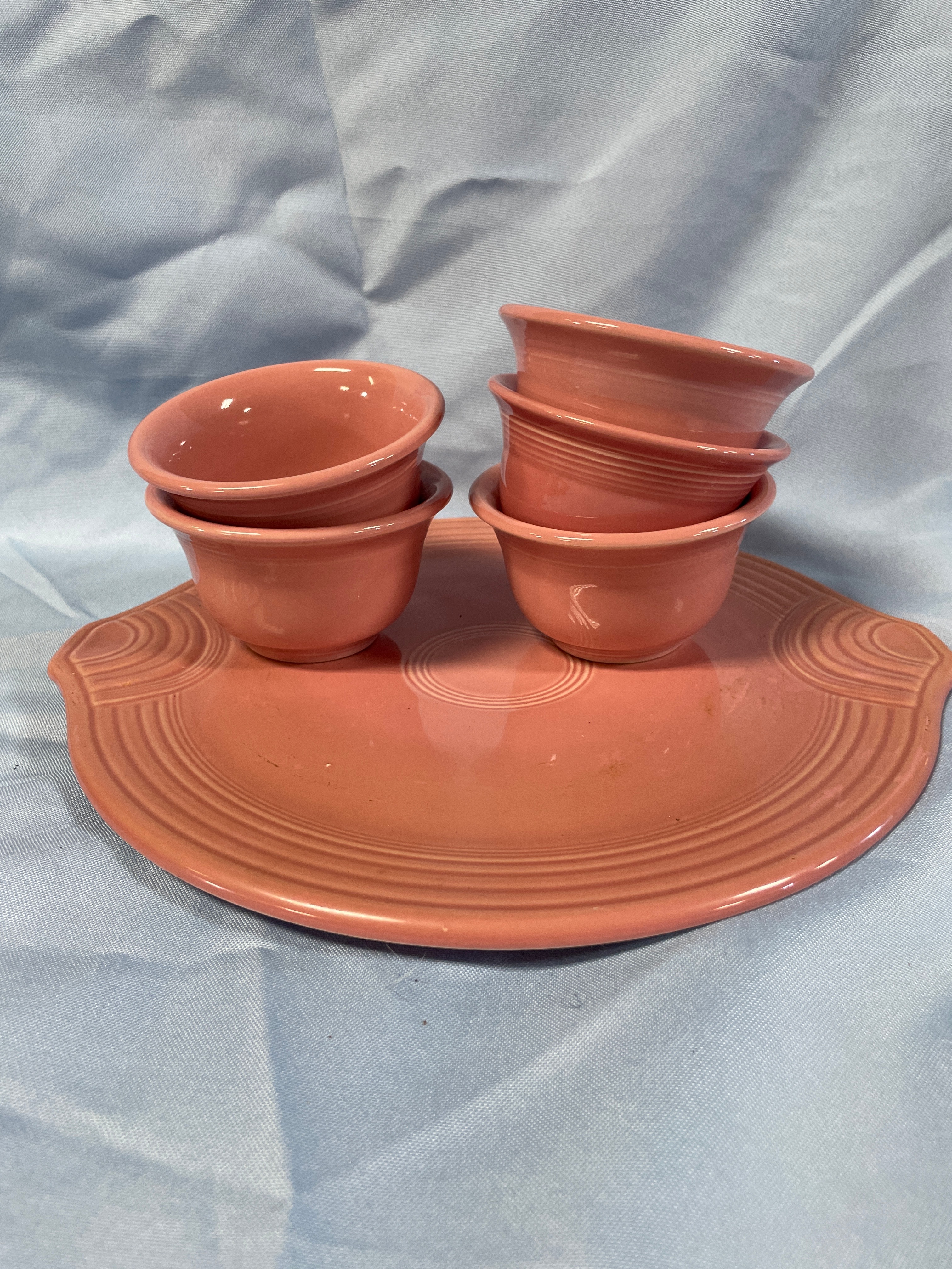 A coral pink oval serving platter measuring approximately 11.5 inches long, with five matching small bowls, one marked ‘HOMER LAUGHLIN CO. FIESTA MADE IN U.S.A.’, each bowl approximately 3.5 inches in diameter and 2 inches high.