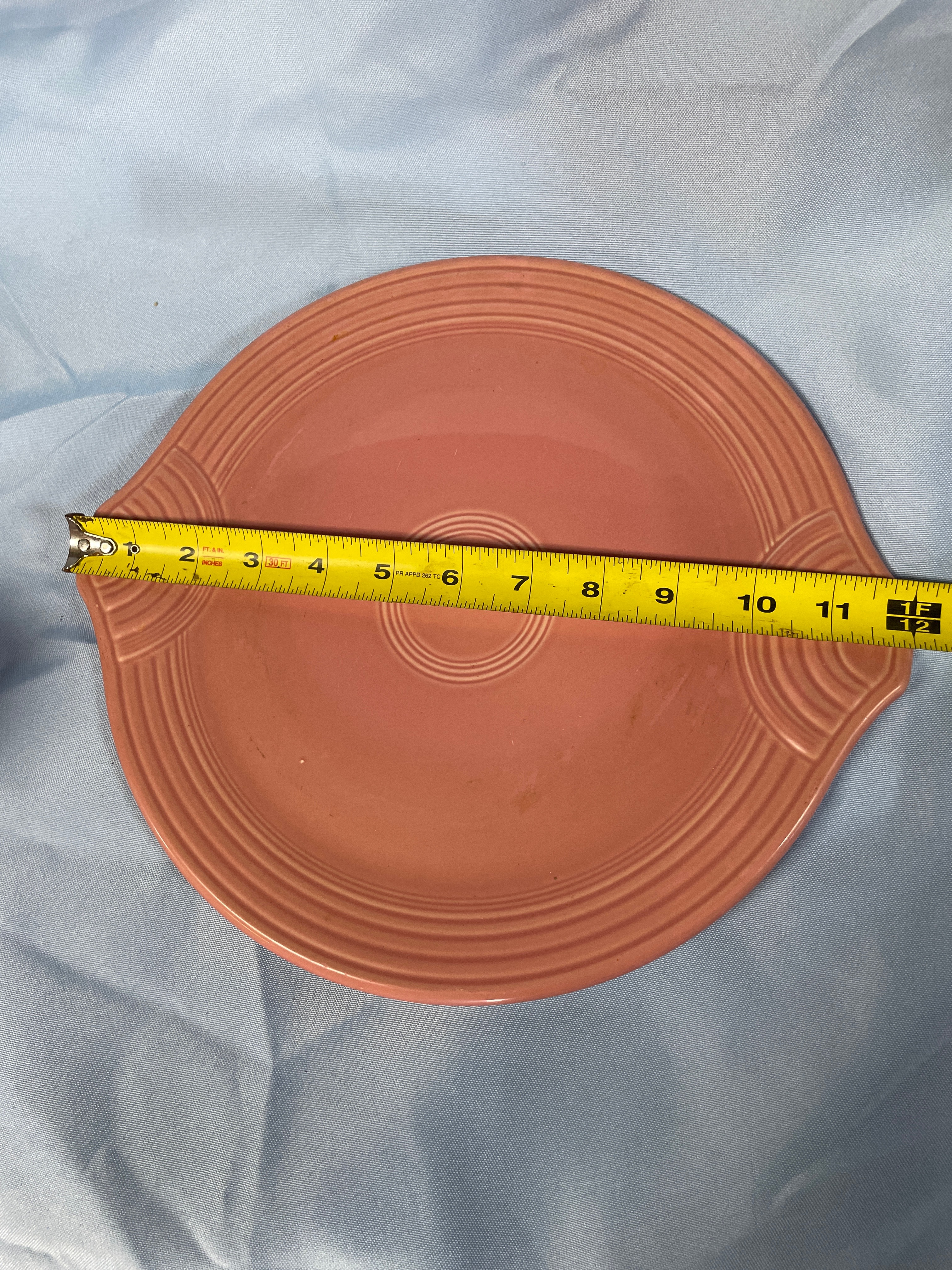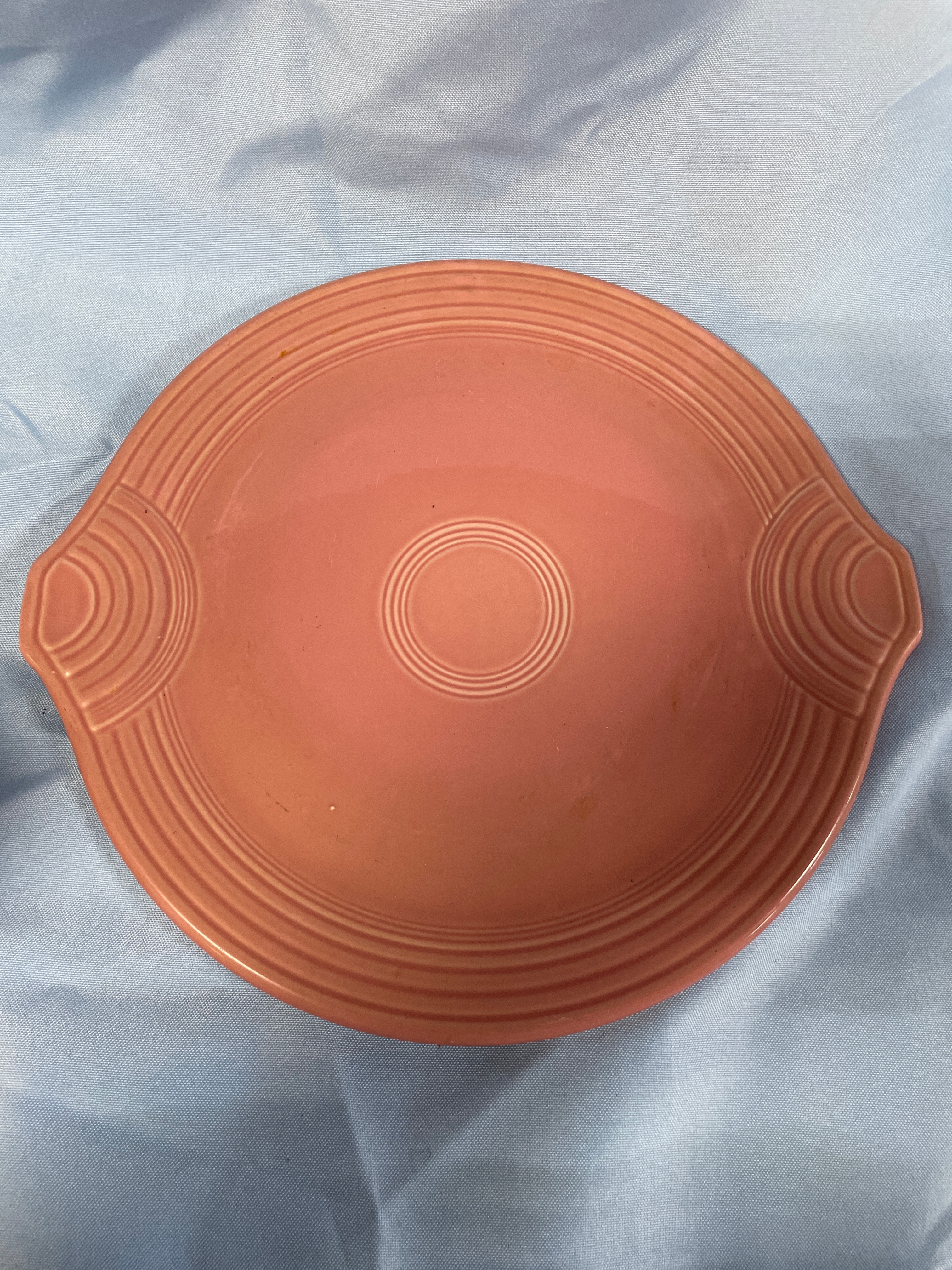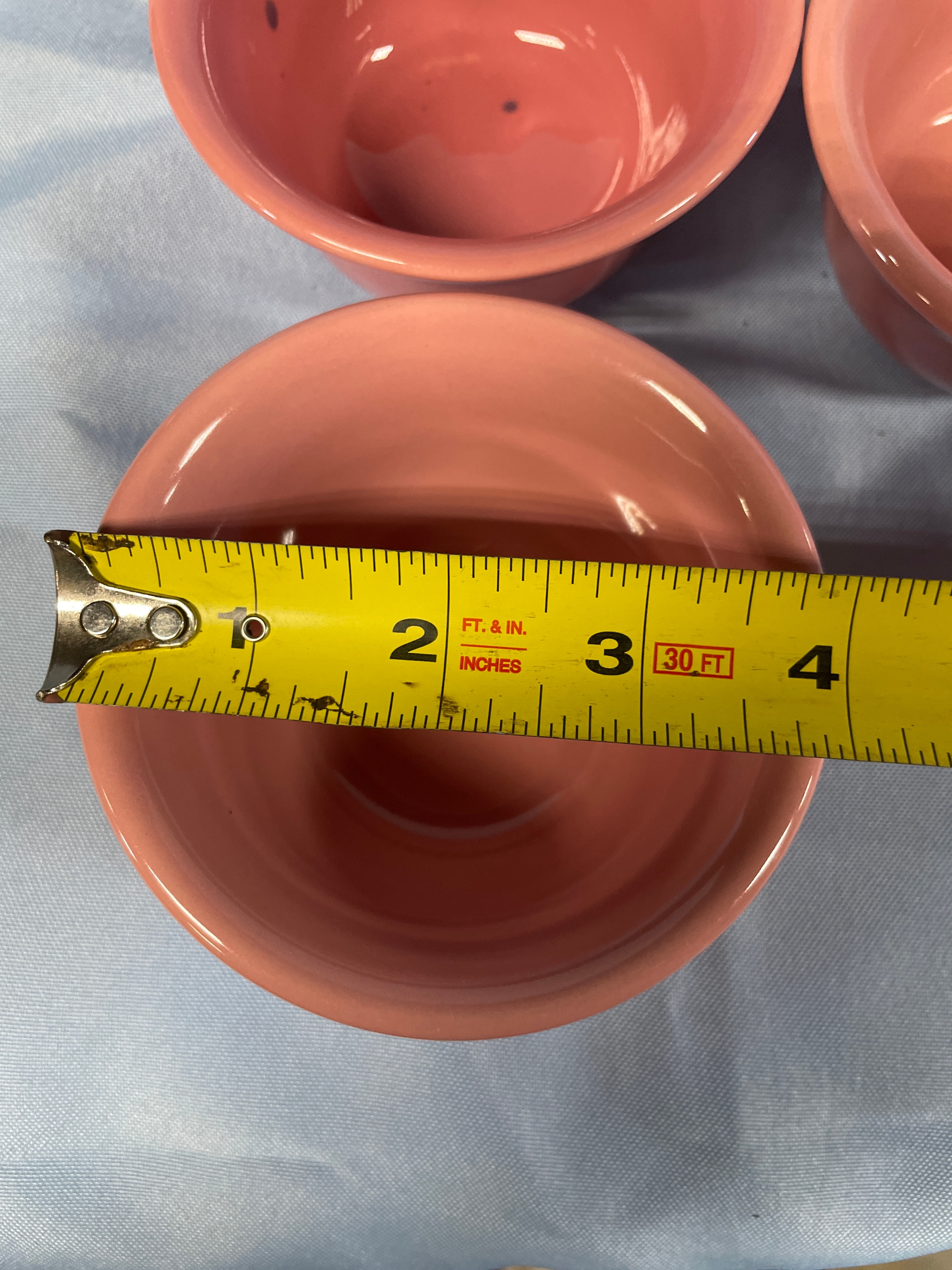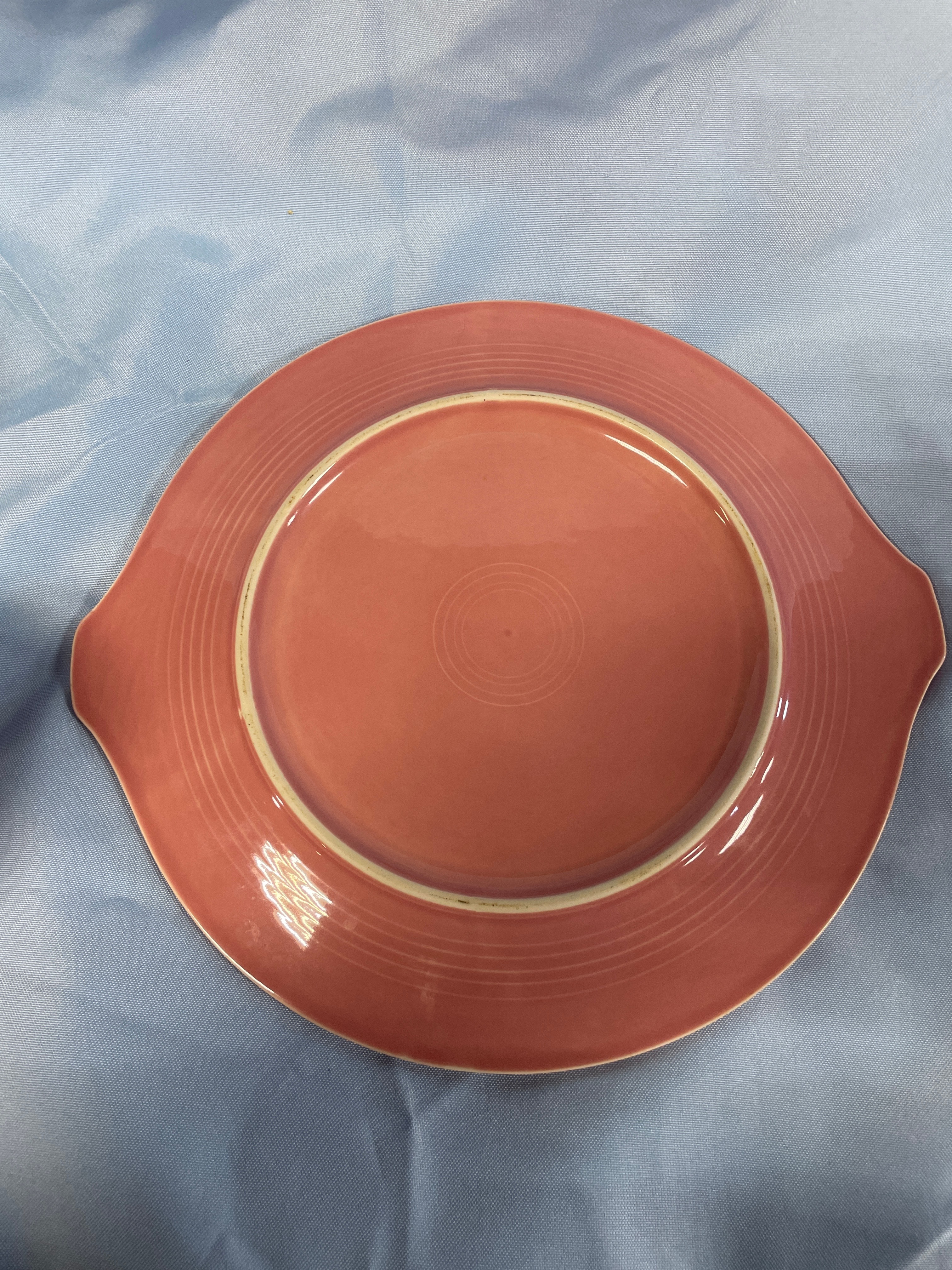 A coral pink oval serving platter measuring approximately 11.5 inches long, with five matching small bowls, one marked ‘HOMER LAUGHLIN CO. FIESTA MADE IN U.S.A.’, each bowl approximately 3.5 inches in diameter and 2 inches high.