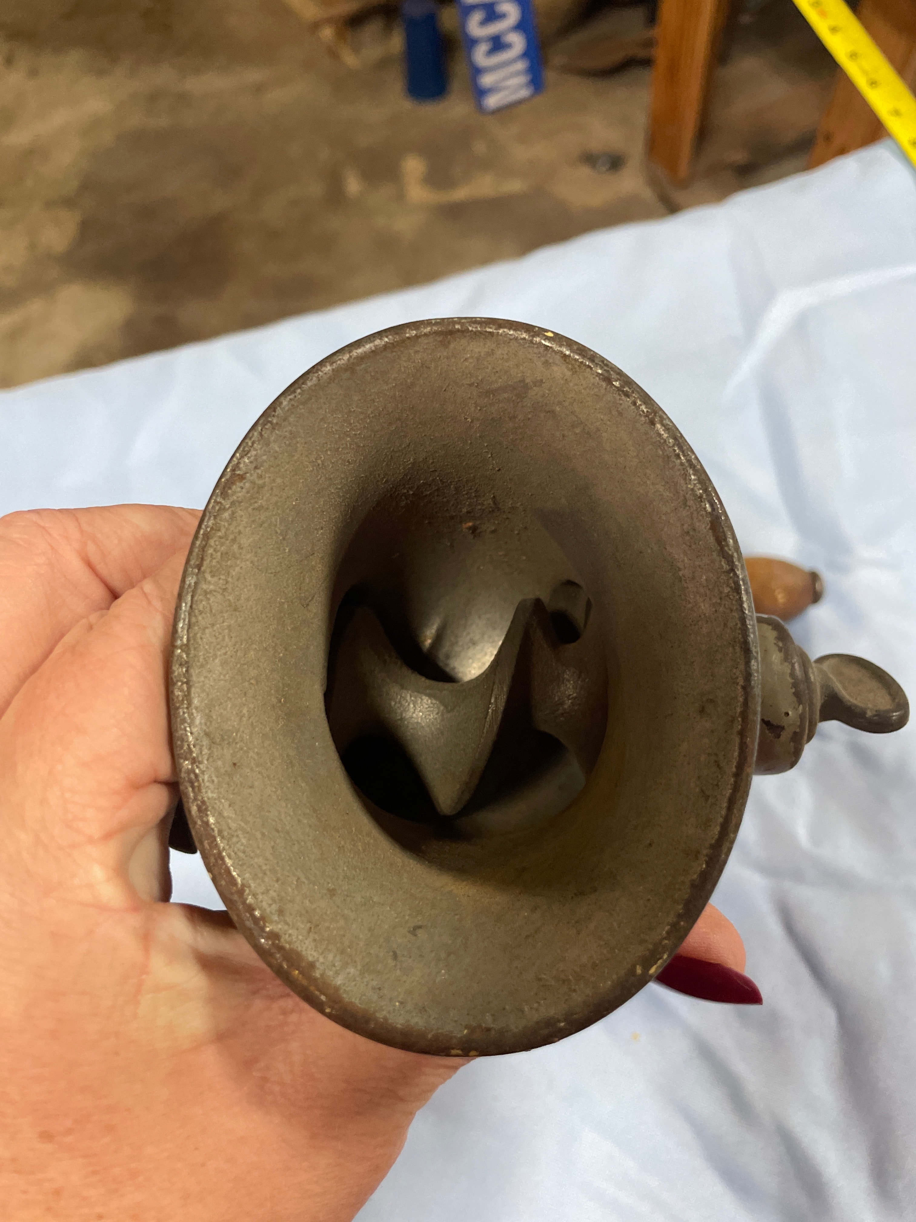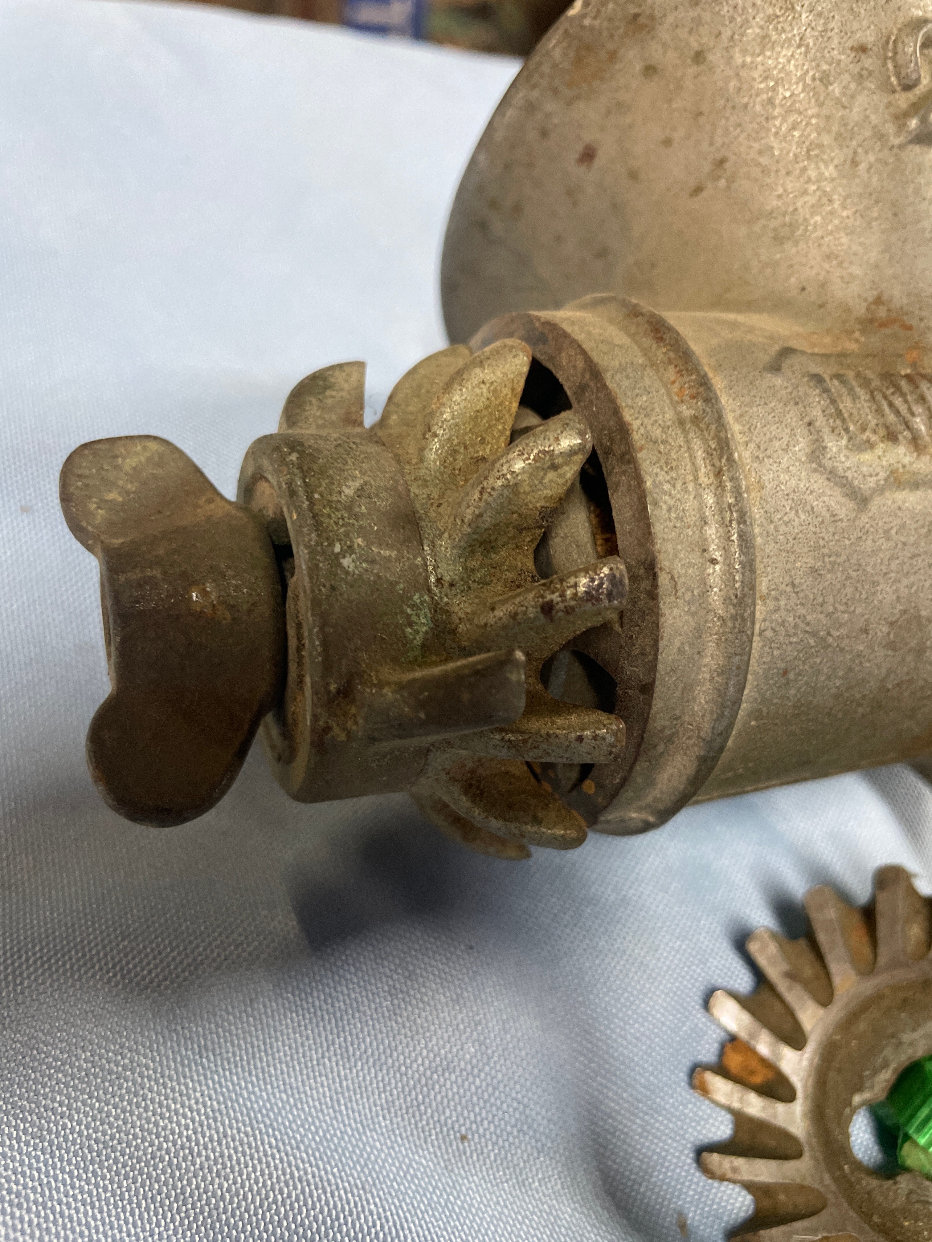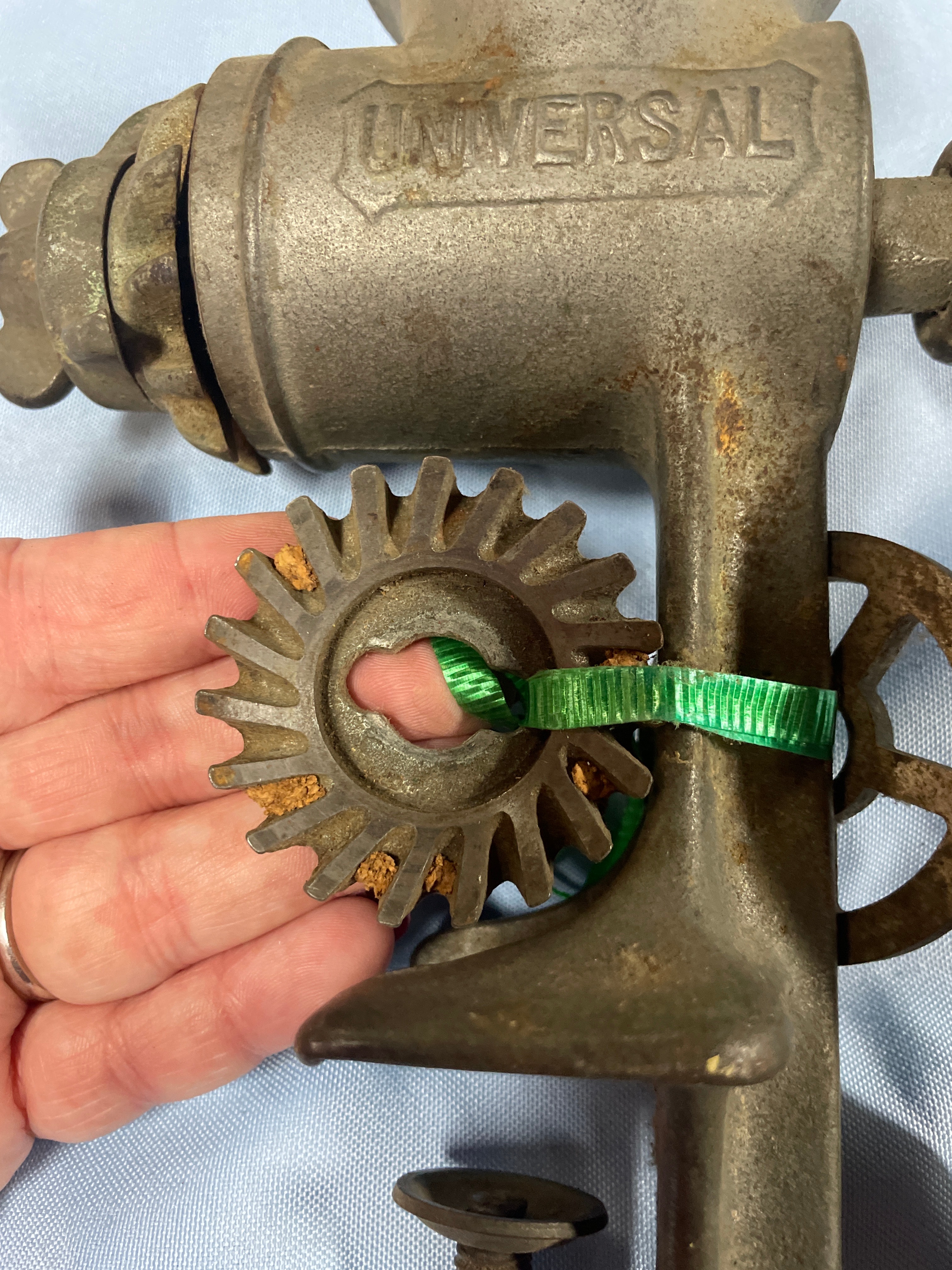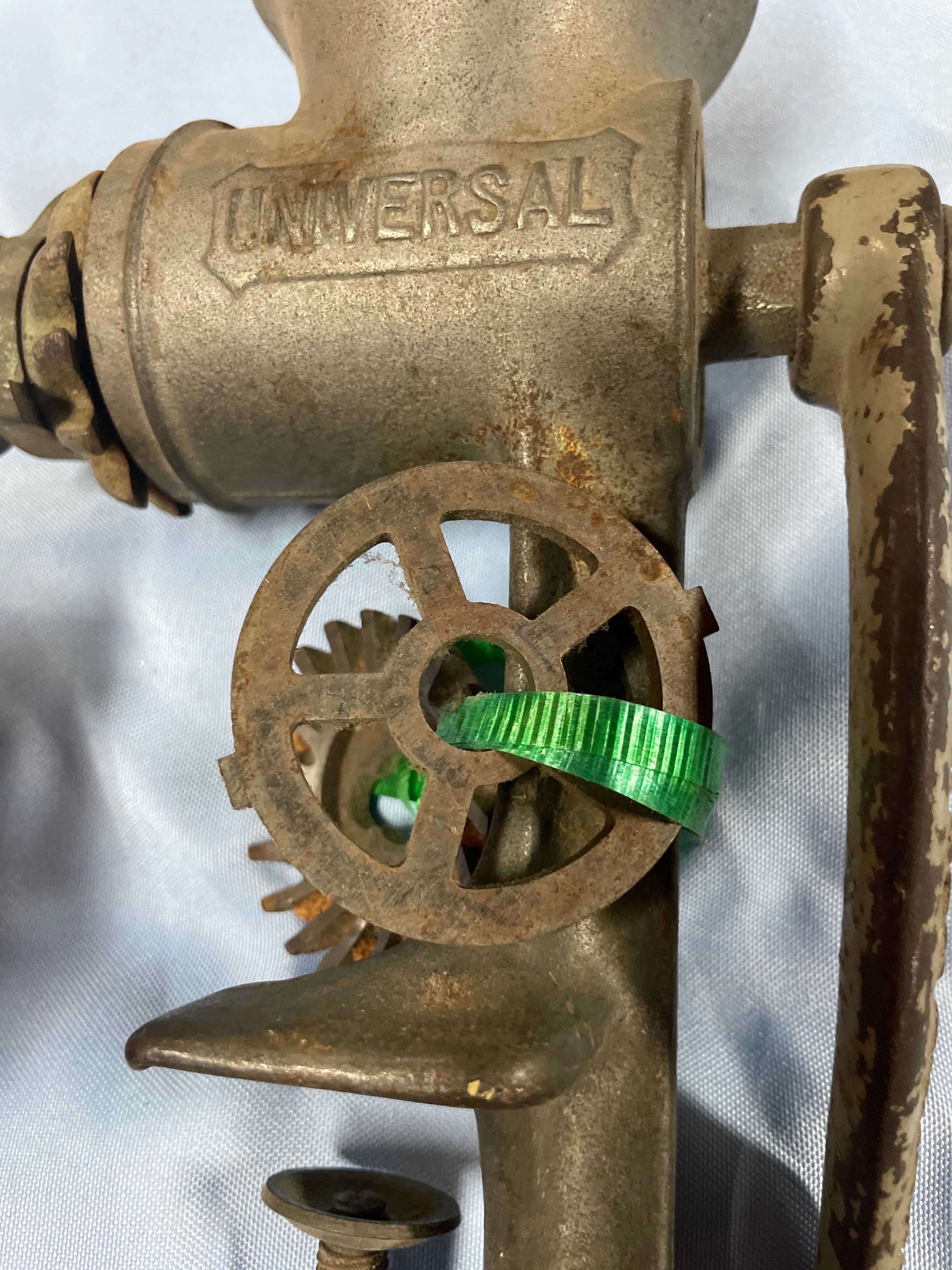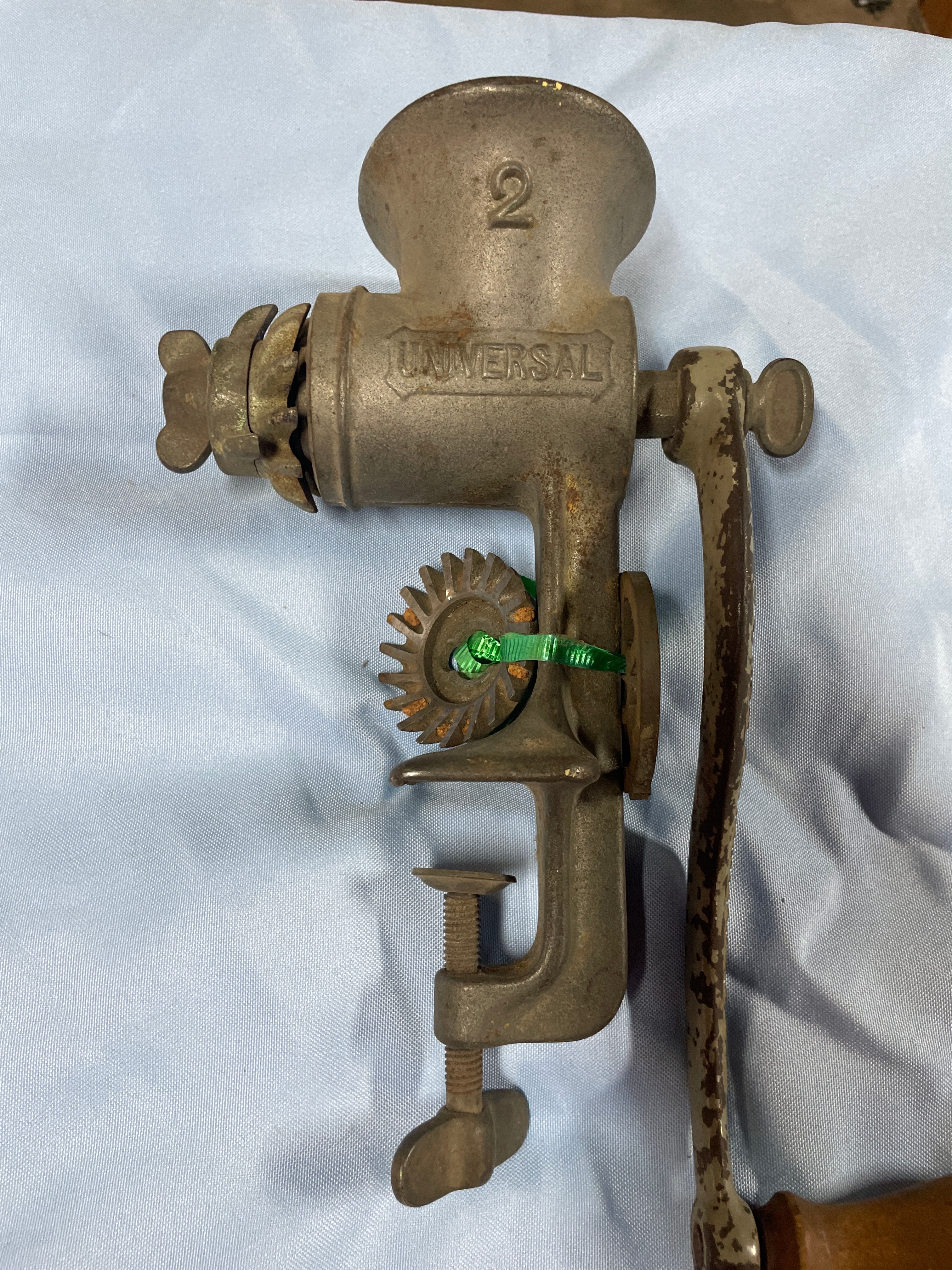** A single, dull metallic grey/silver (with some rust) cast iron meat grinder, featuring a wooden handle, with “UNIVERSAL” embossed on its side and the number “2” above it.